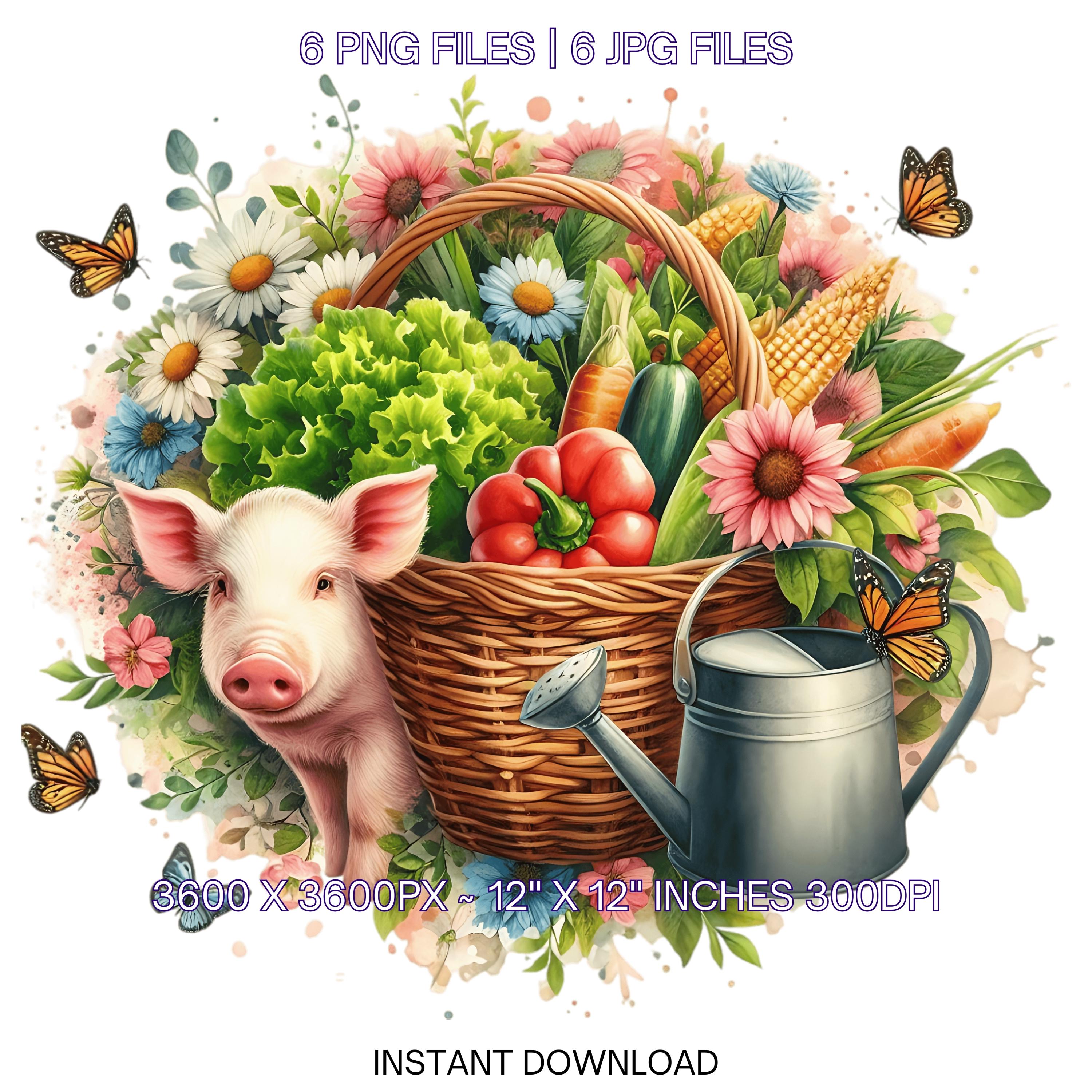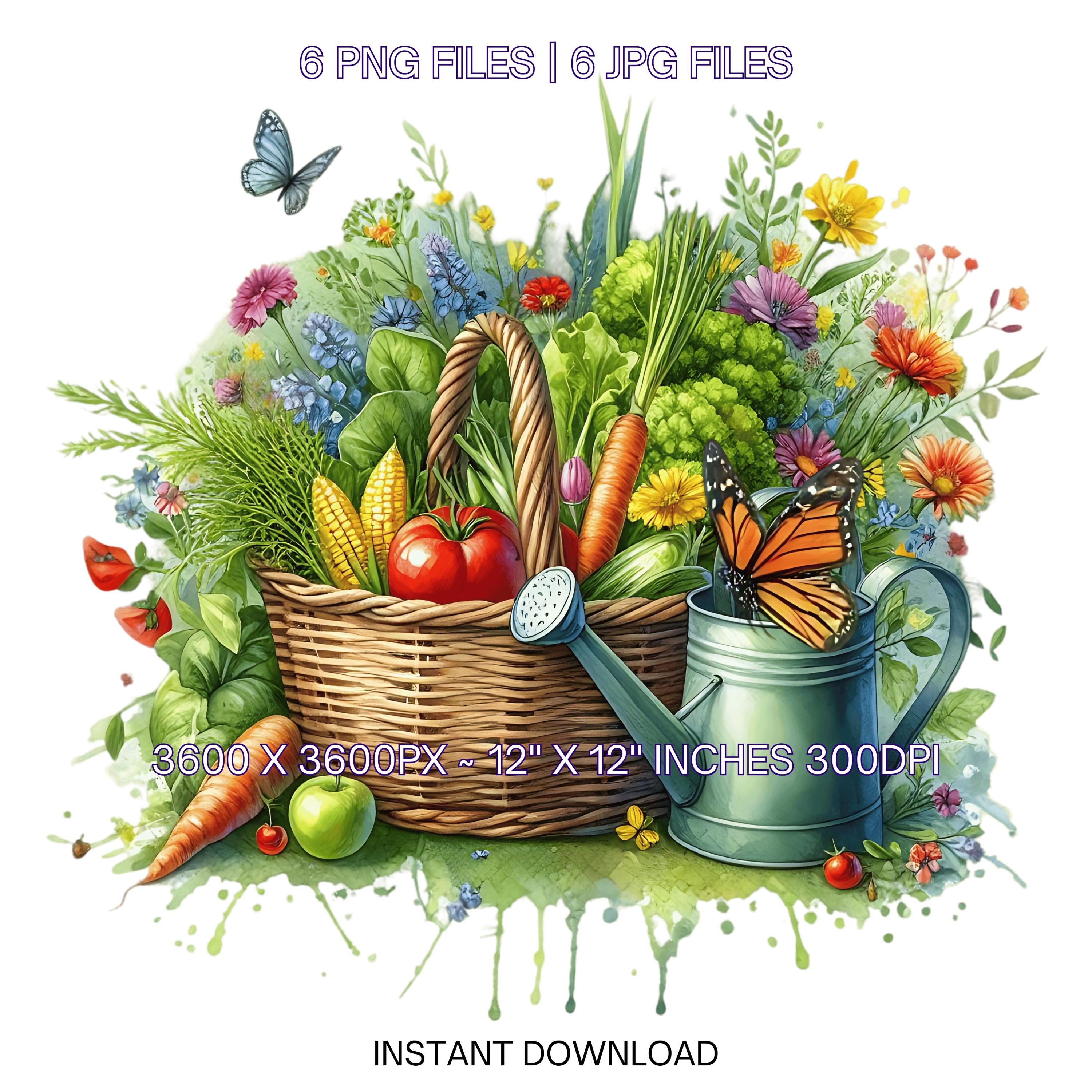 Spring Farm Clipart with Fresh Vegetables Woven Basket Near Watering Can, Bees Buzzing & Wildflowers | Farmyard | 6 PNG-JPG Commercial Use – Instant Digital Download - TumblersGalaxy