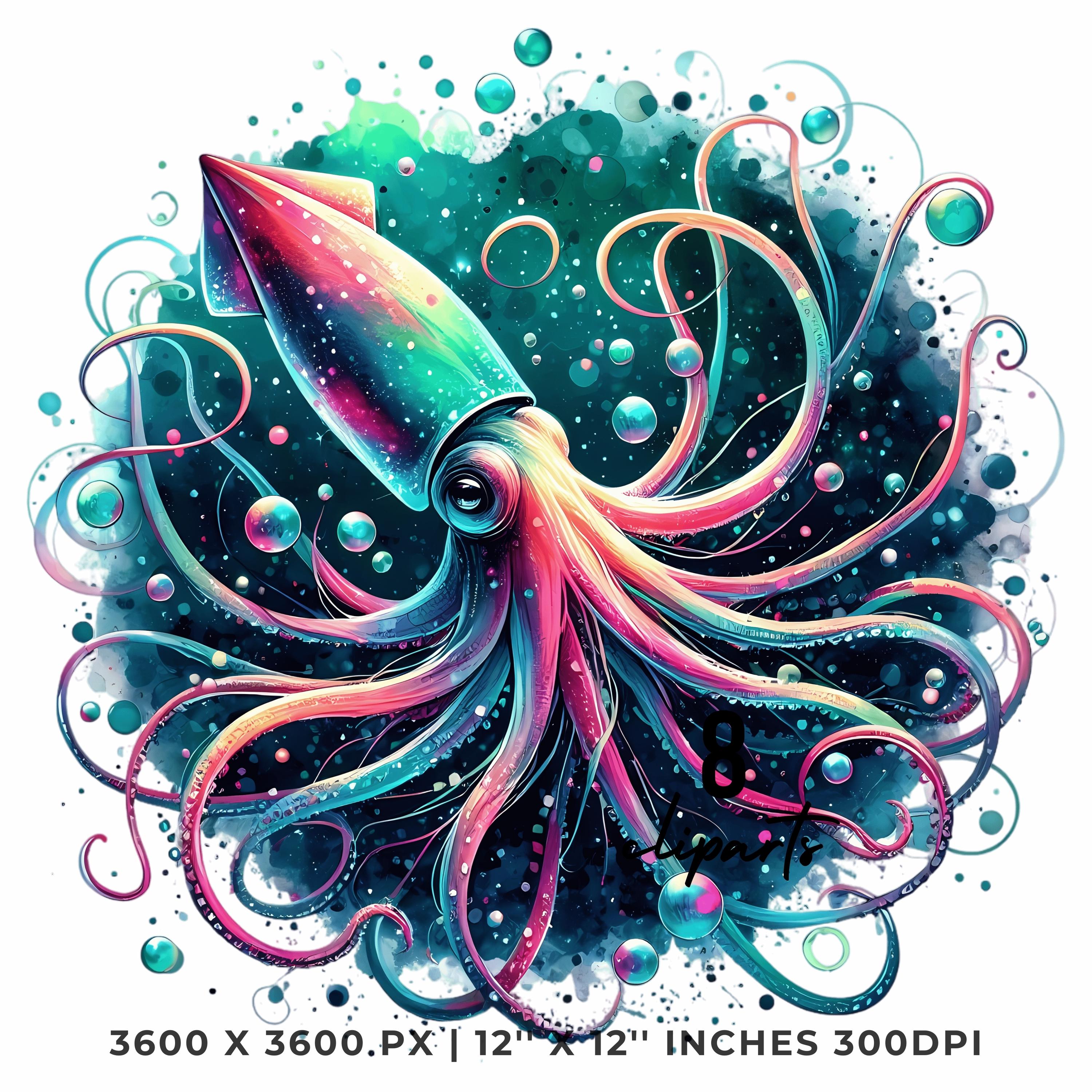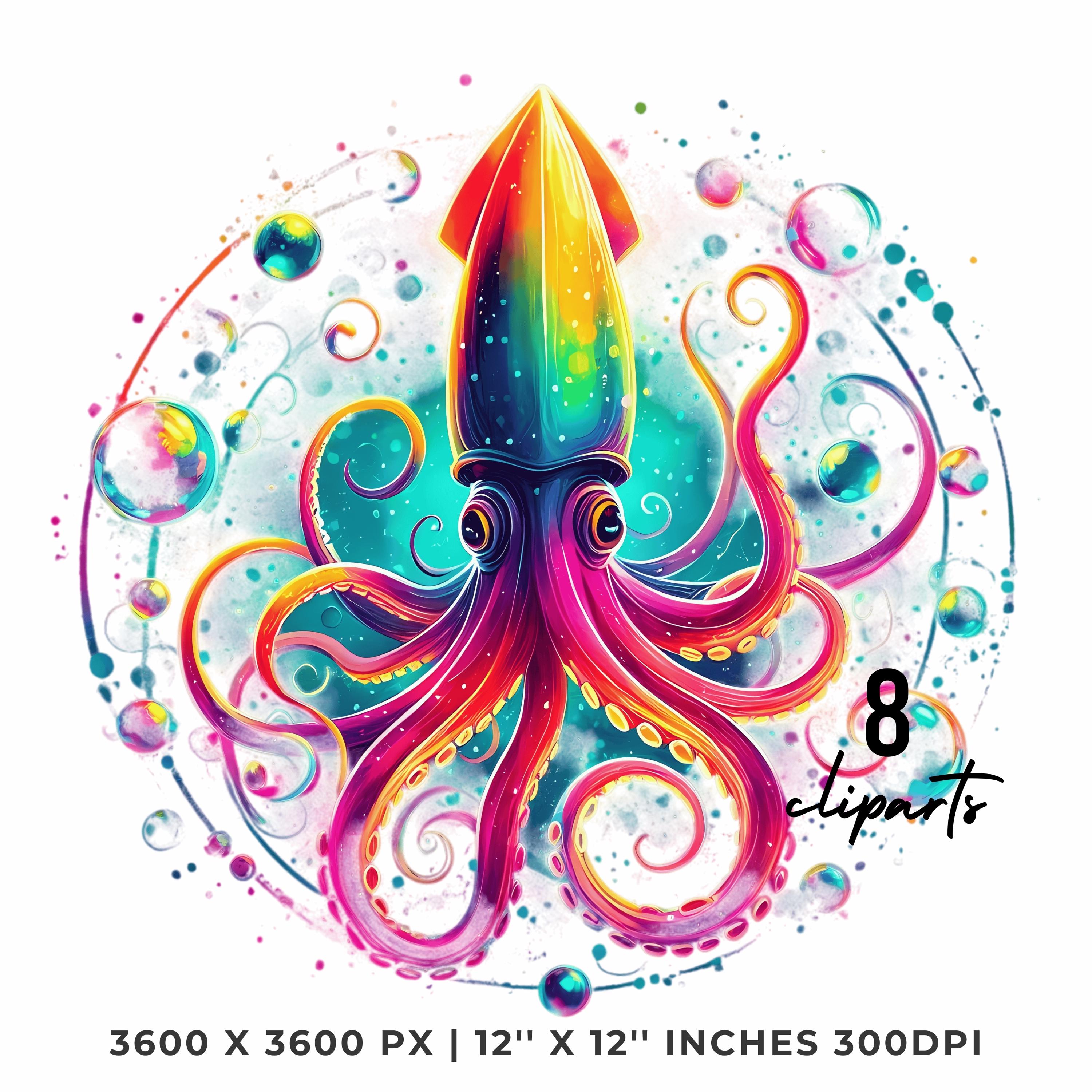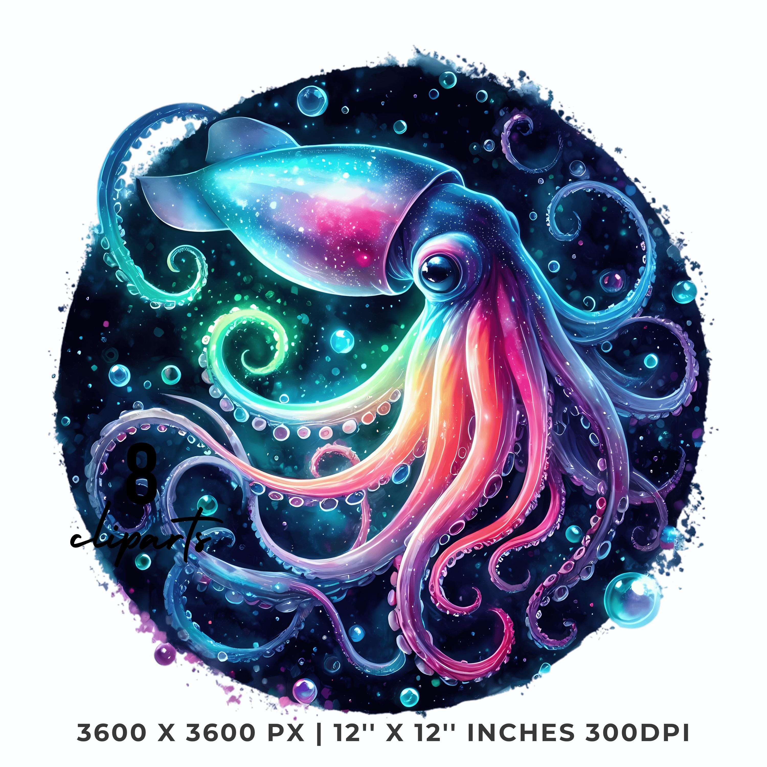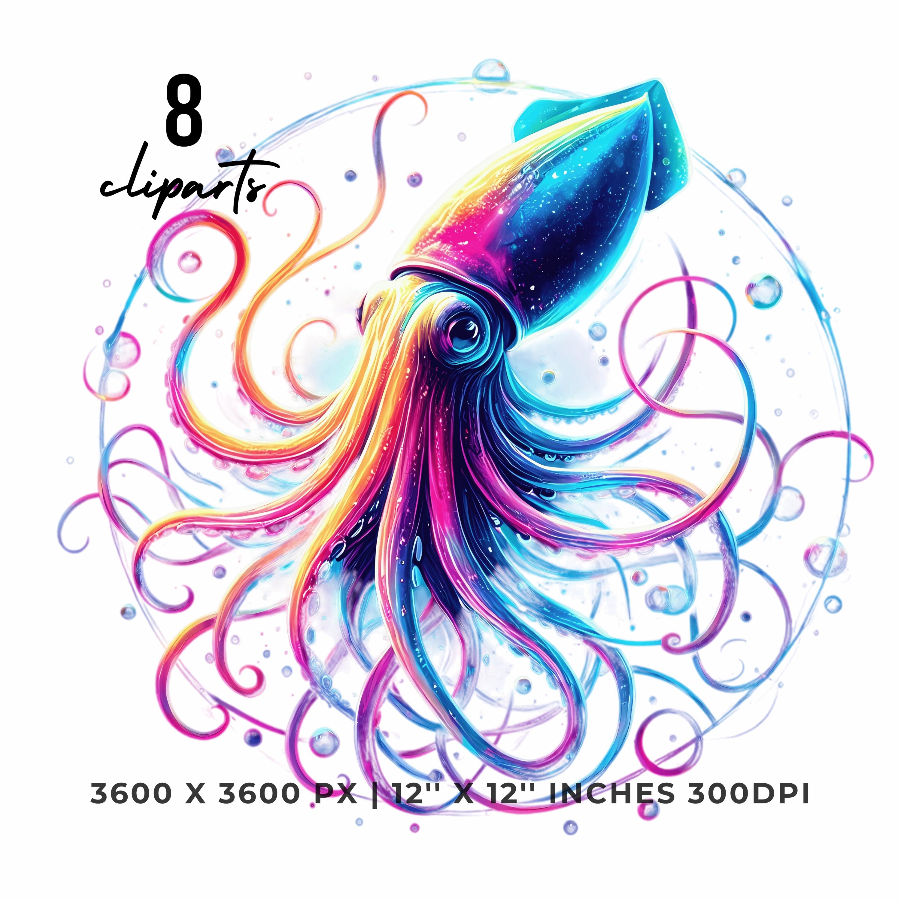 Squid Clipart PNG | 8 Watercolor Glowing Deep-sea squid, long tentacles spiraling in neon hues & bubbles | Sublimation Commercial Use is an eye-catching, high-resolution digital asset designed for creators, crafters, teachers, and small business owners looking to elevate their visuals.