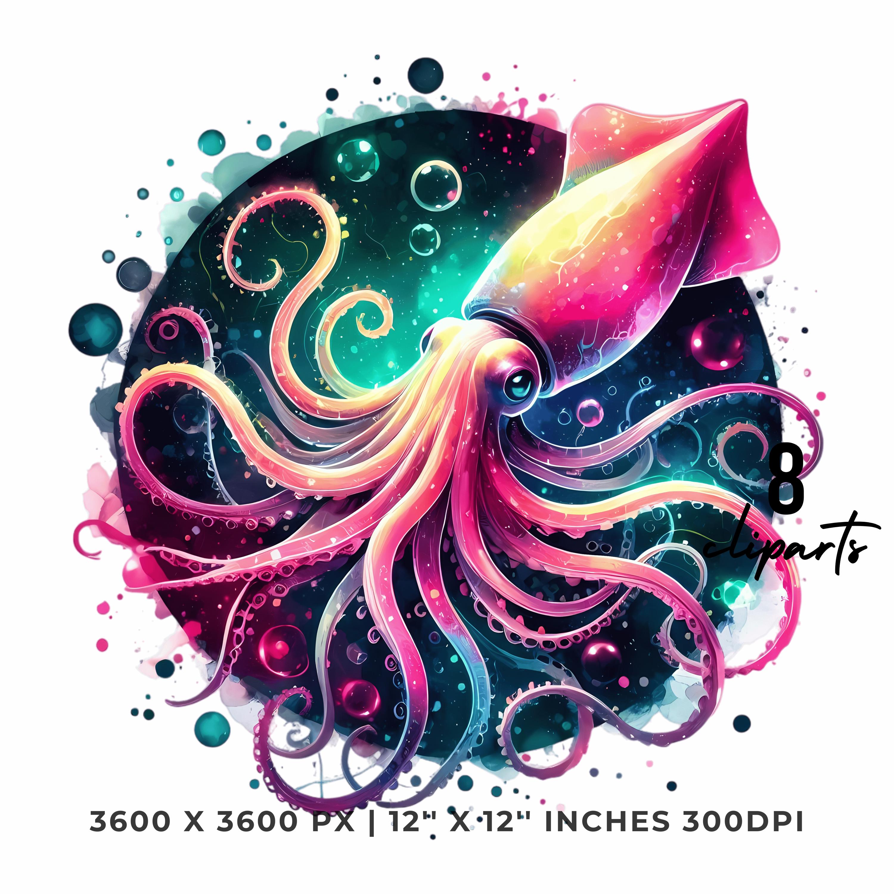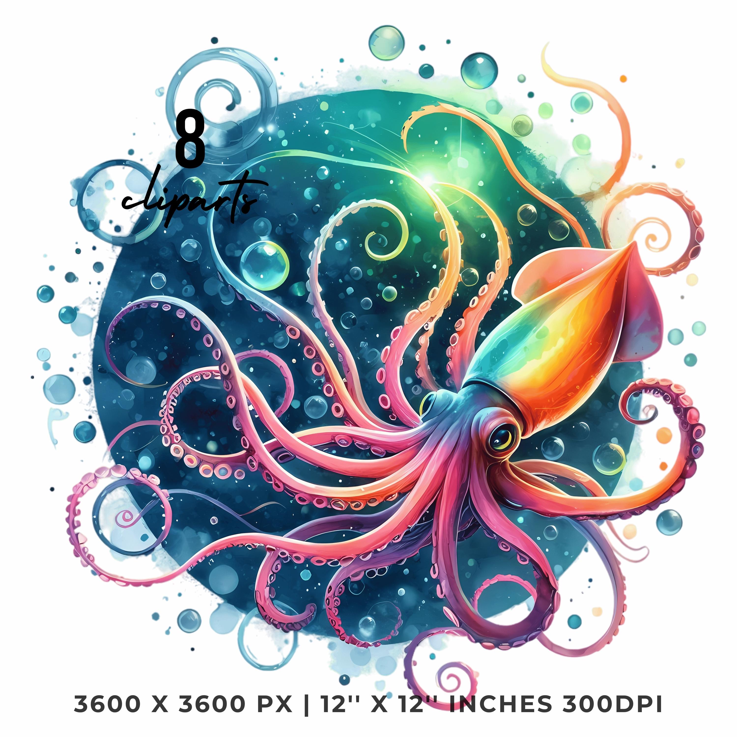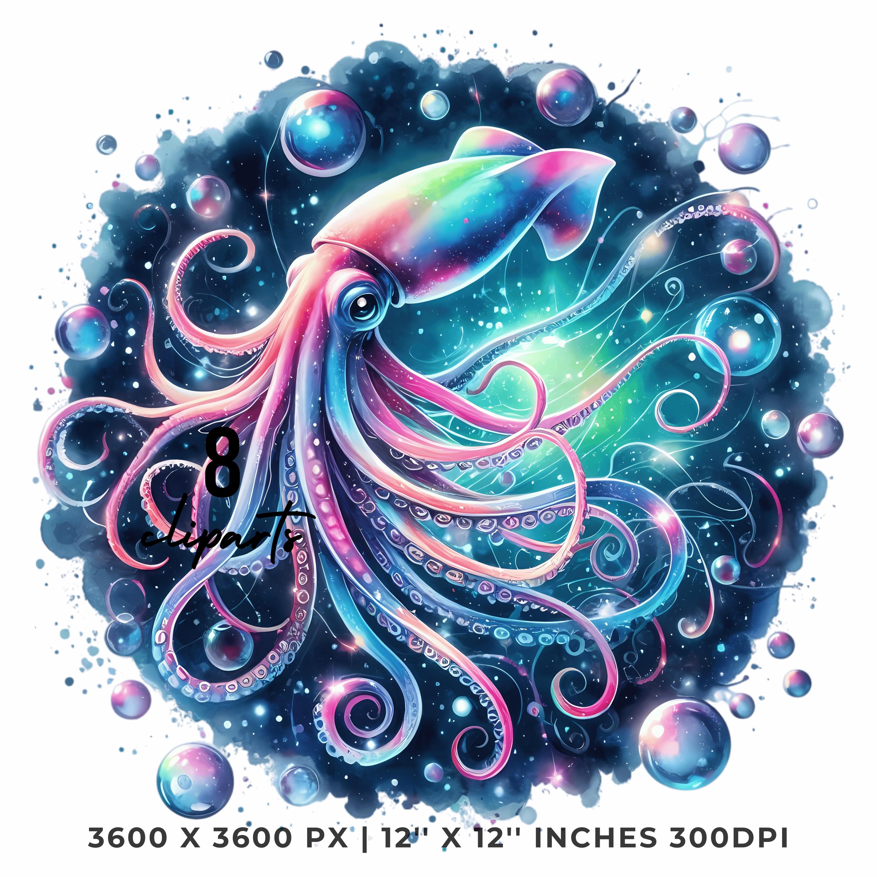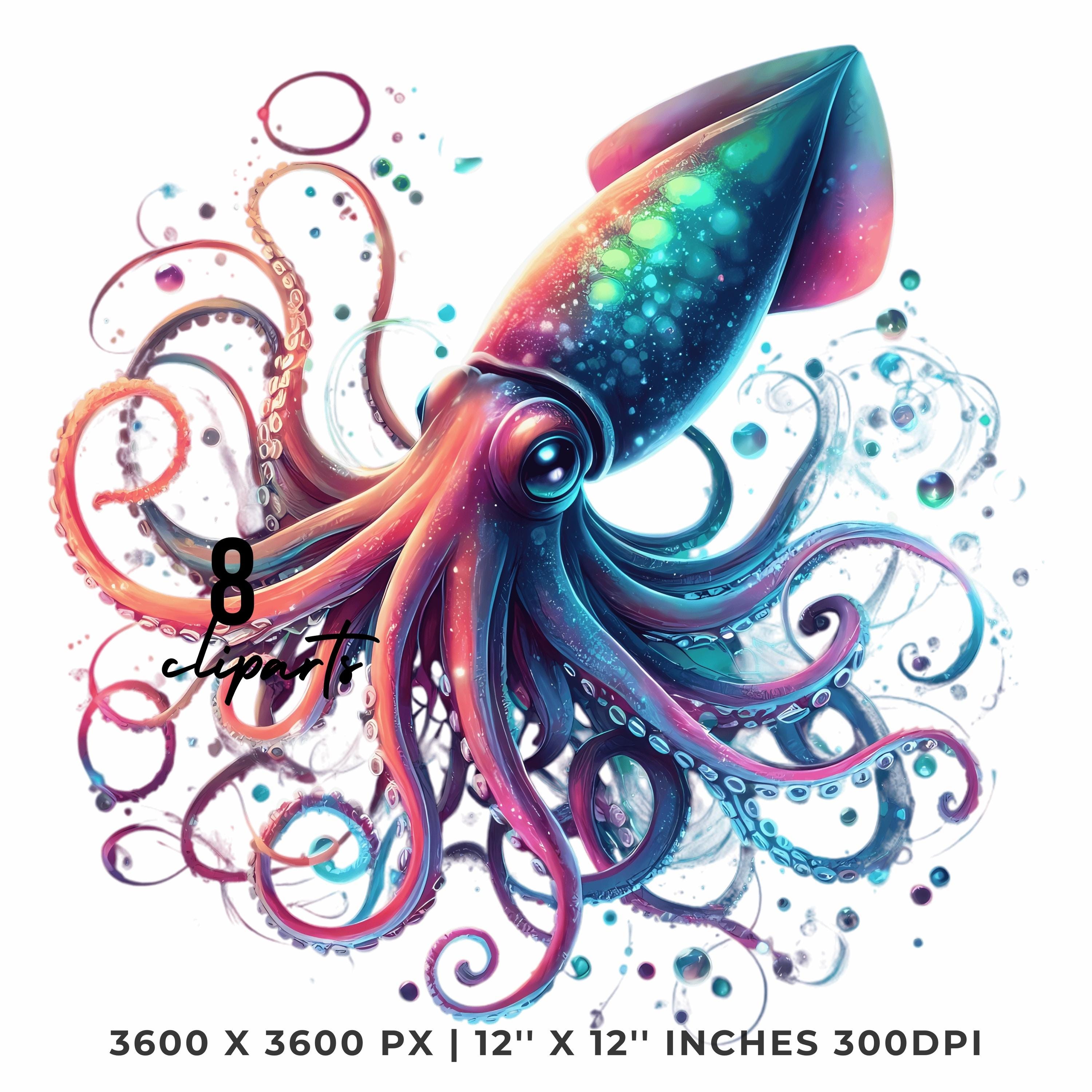 Squid Clipart PNG | 8 Watercolor Glowing Deep-sea squid, long tentacles spiraling in neon hues & bubbles | Sublimation Commercial Use is an eye-catching, high-resolution digital asset designed for creators, crafters, teachers, and small business owners looking to elevate their visuals.