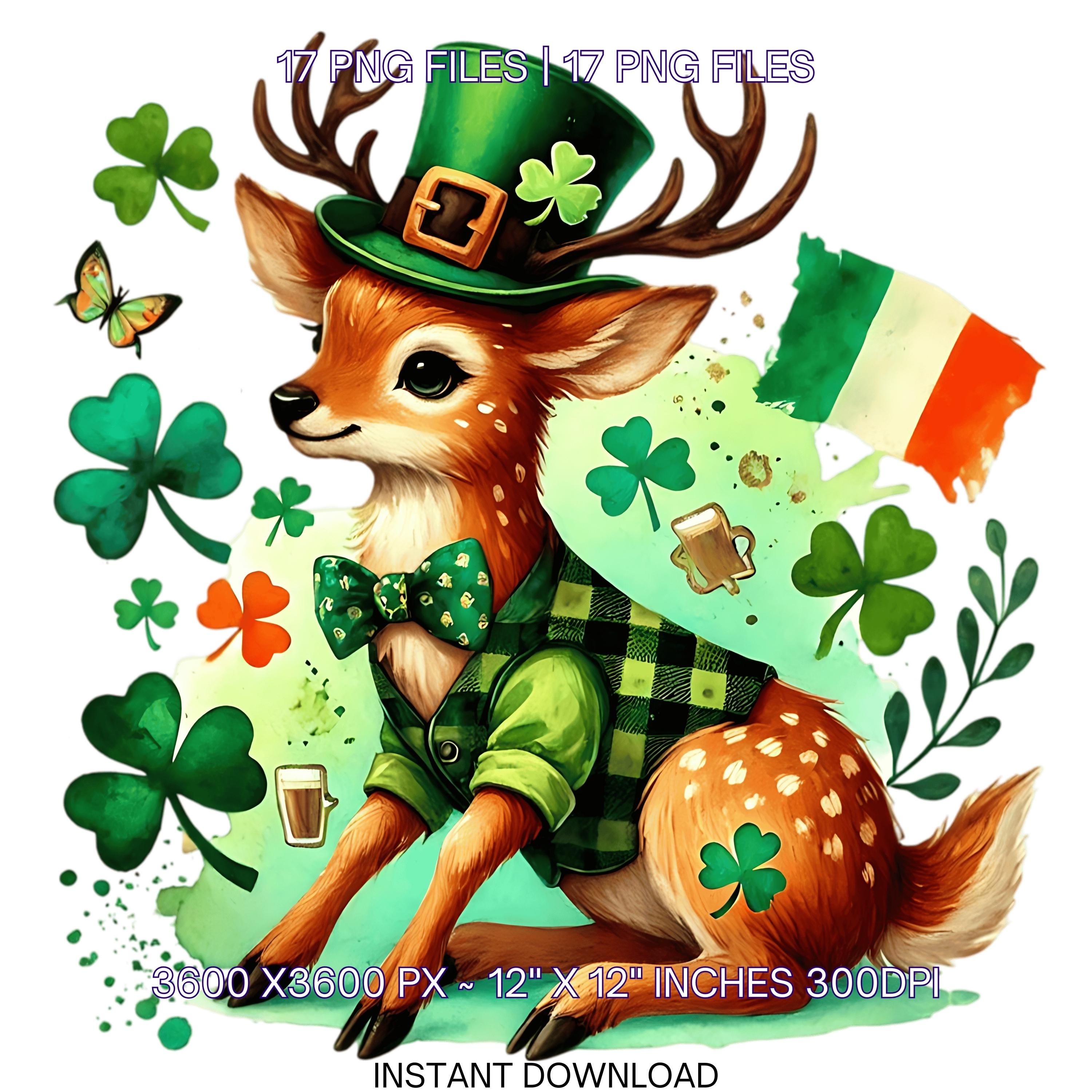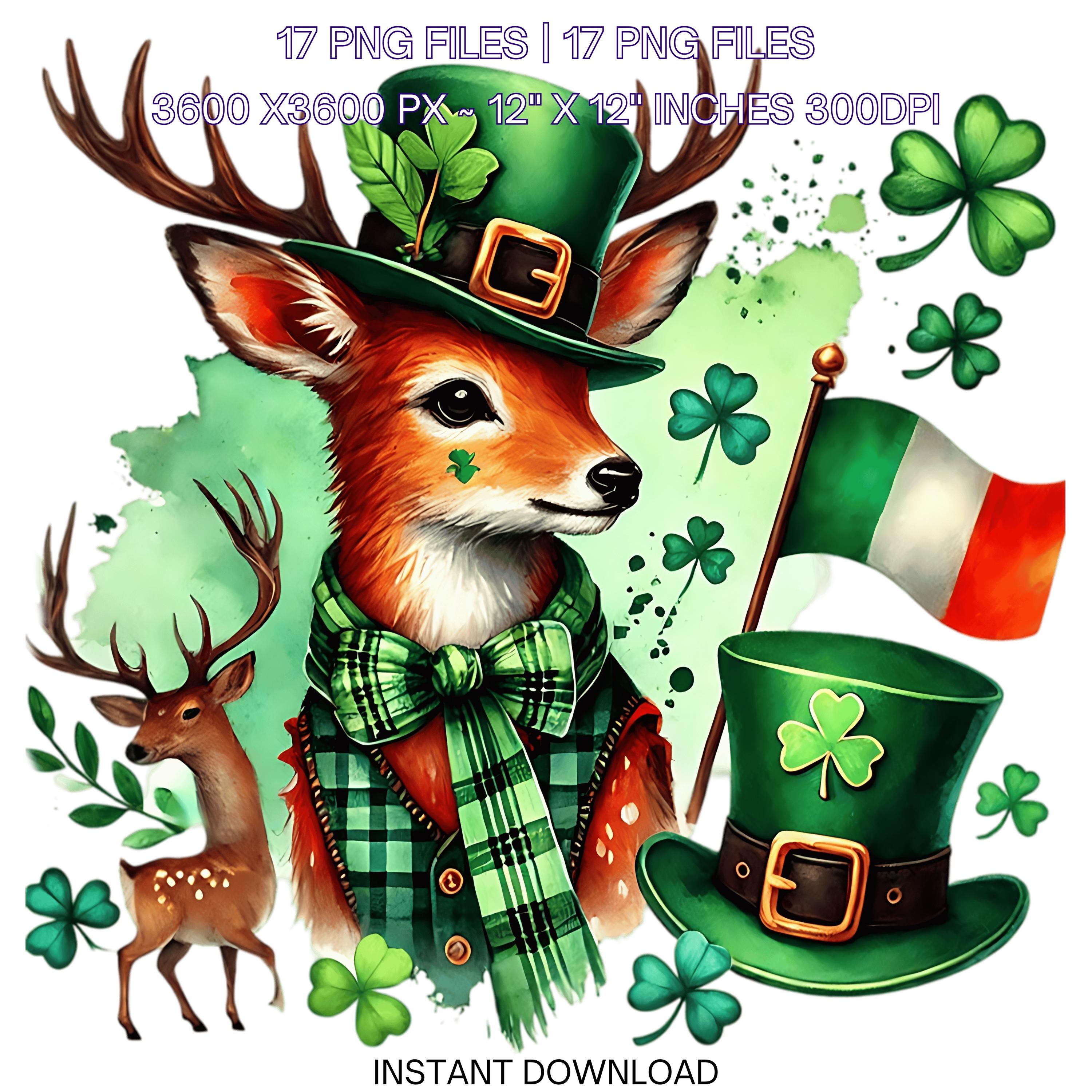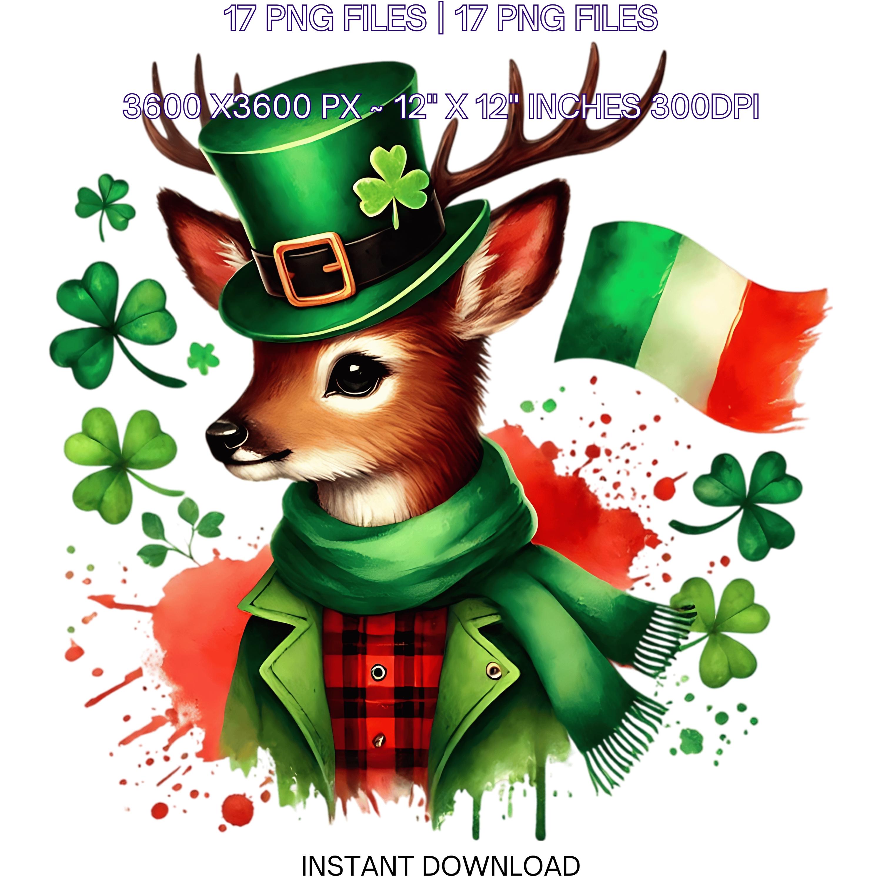 St. Patrick Irish Deer & Irish Flag PNG | 16 Woodland Red Deer for St. Patrick Day Party Clipart Transparent Clipart Sublimation Commercial Use