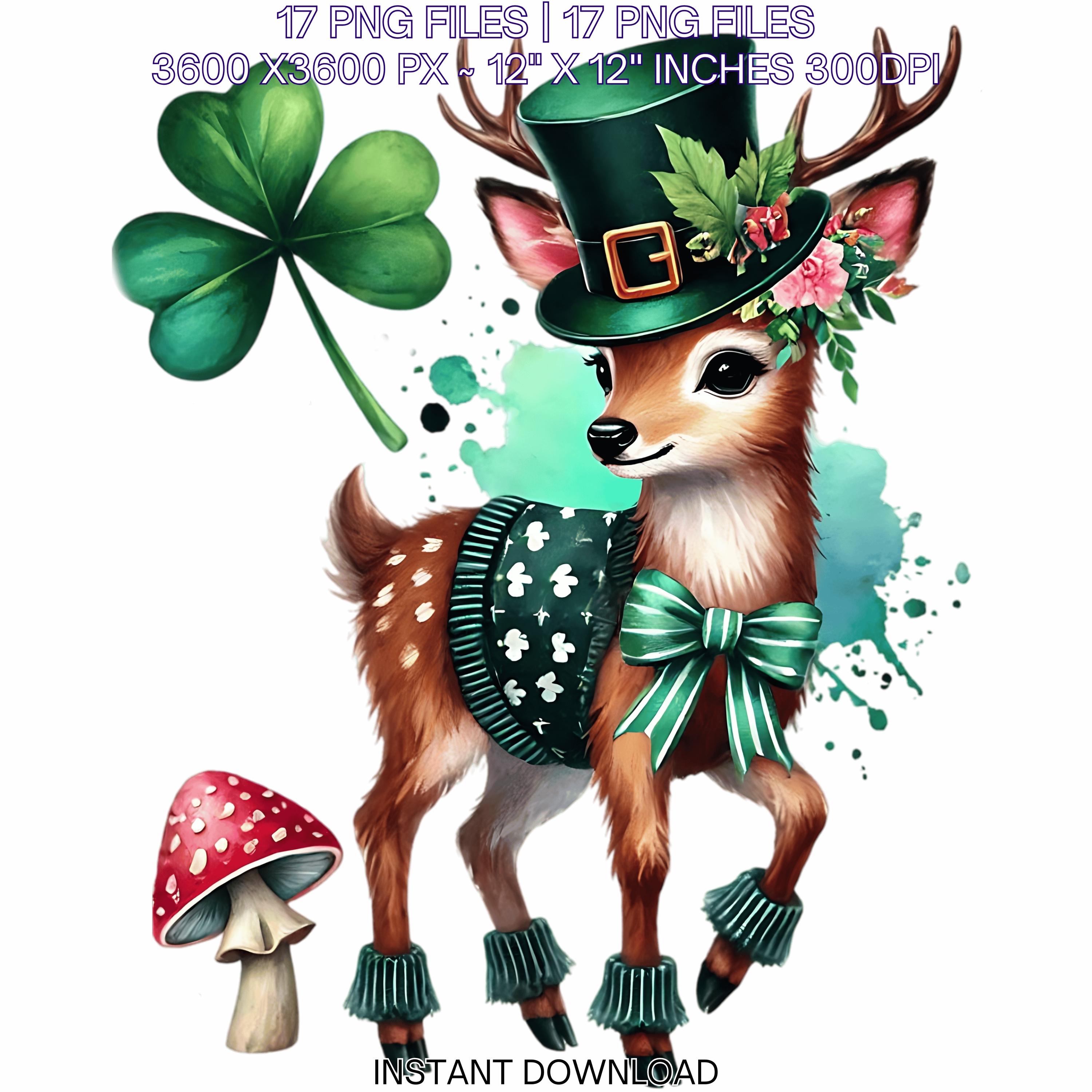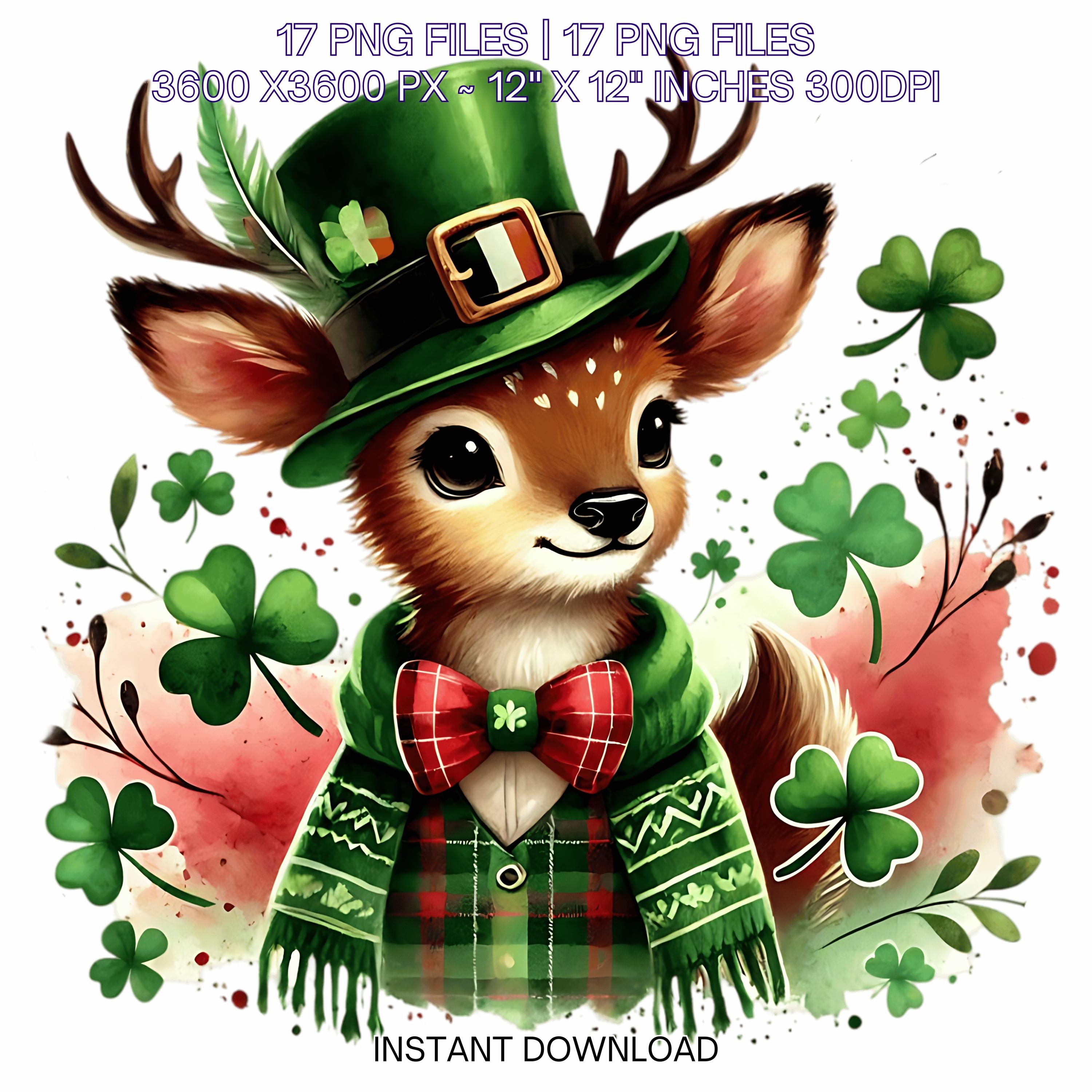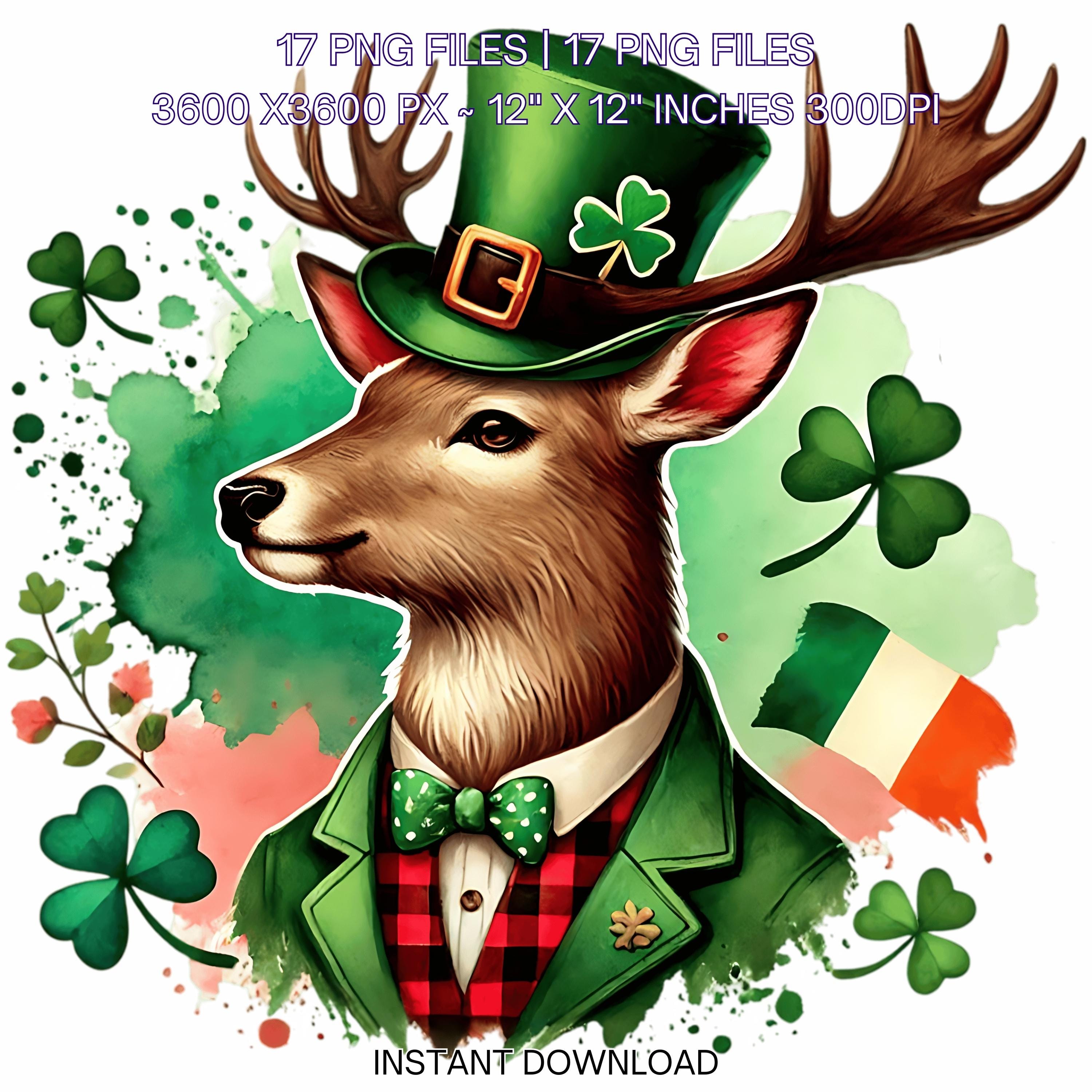 St. Patrick Irish Deer & Irish Flag PNG | 16 Woodland Red Deer for St. Patrick Day Party Clipart Transparent Clipart Sublimation Commercial Use