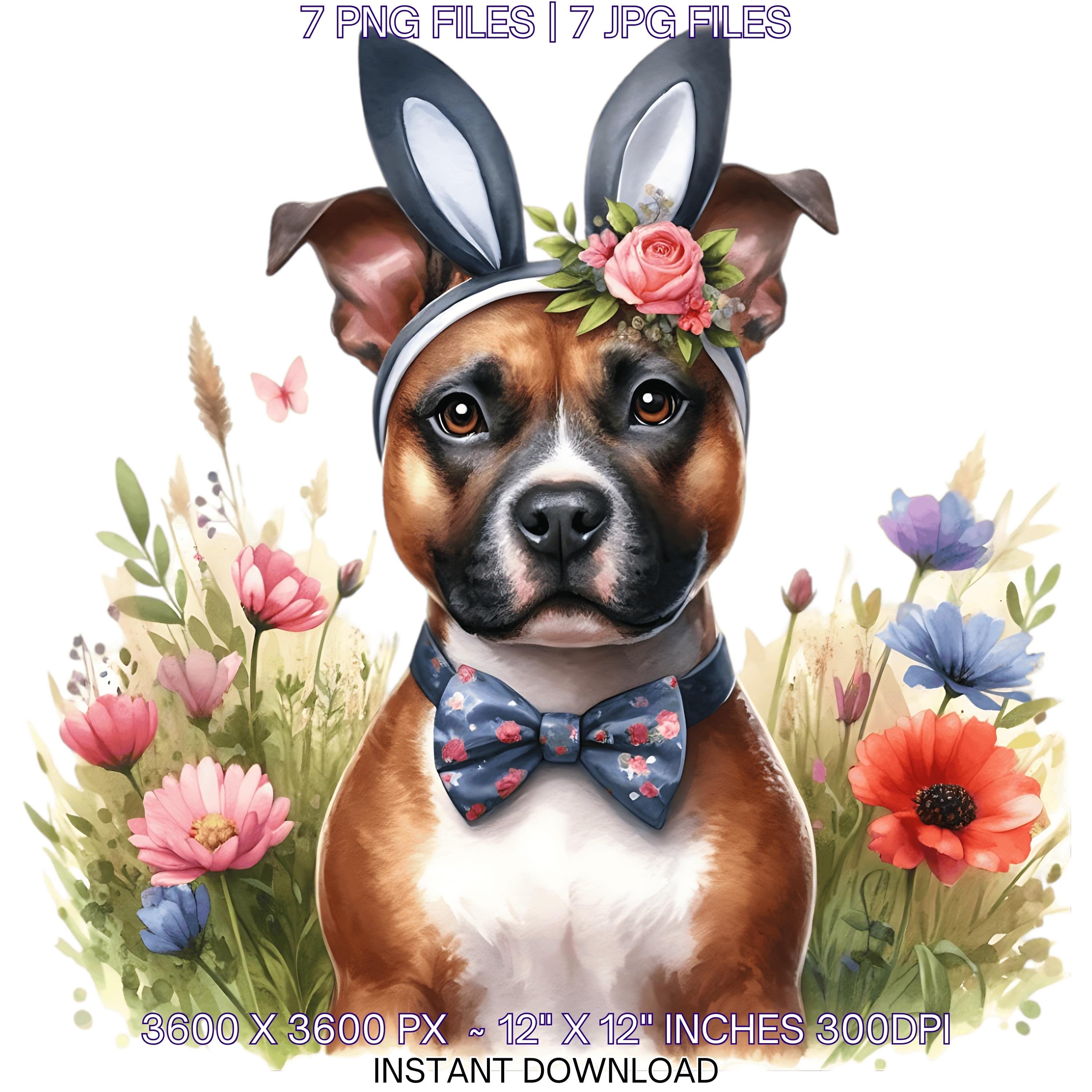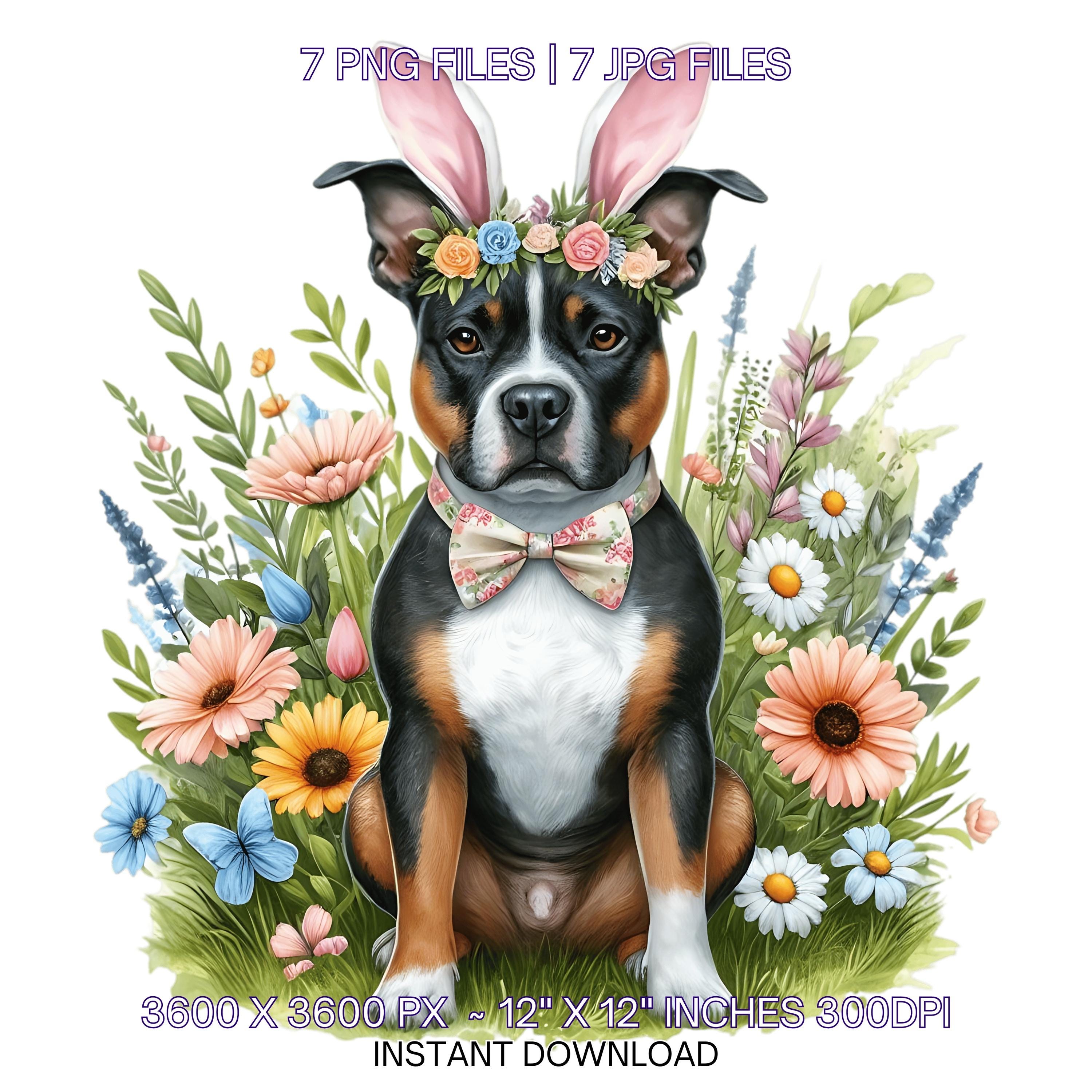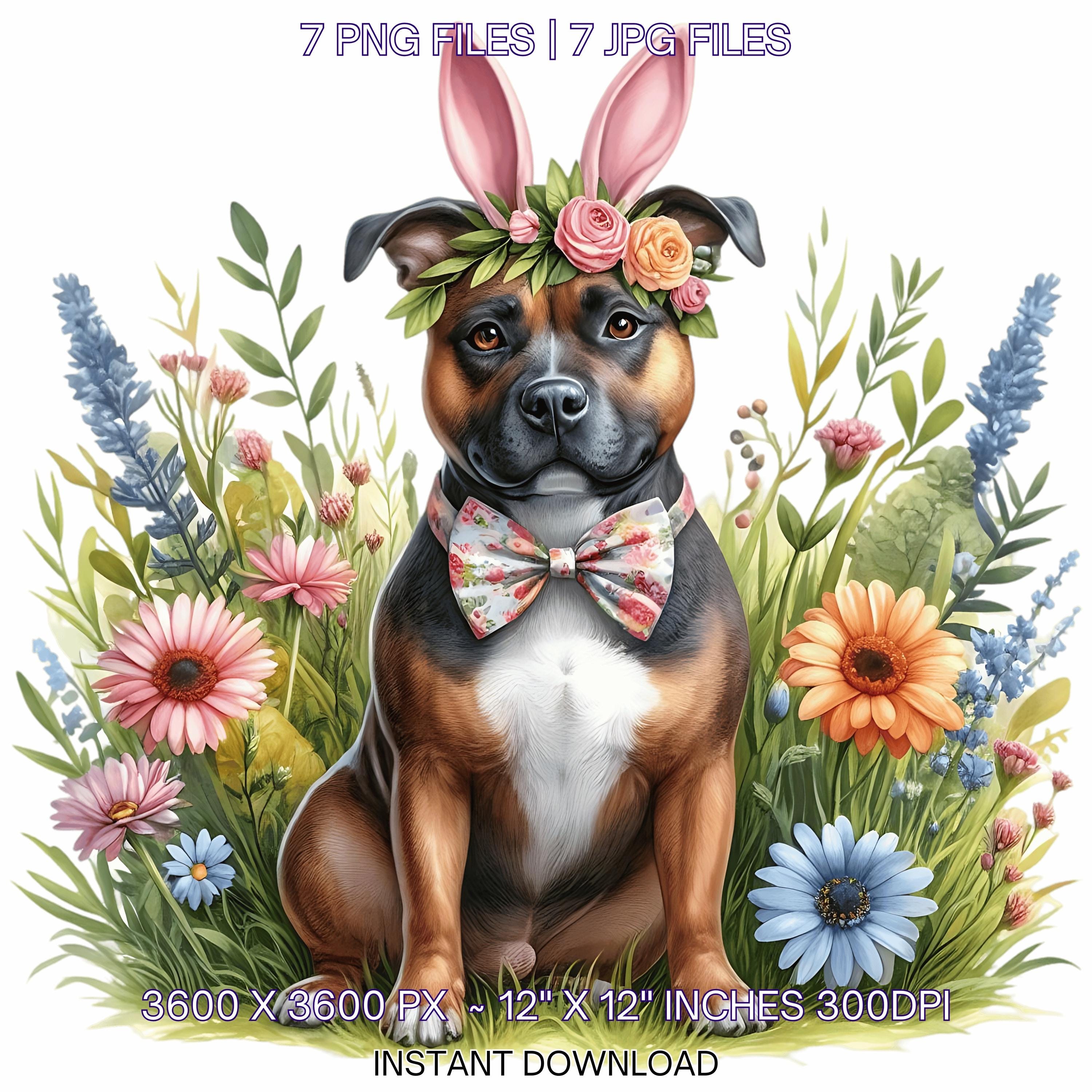 Easter Staffordshire Bull Terrier Dog Wearing Floral Bow & Bunny Ear Handband Ready for Easter Egg Hunting Clip Art PNG | 7 Clip Art | Dog Lover Sublimation Commercial Use