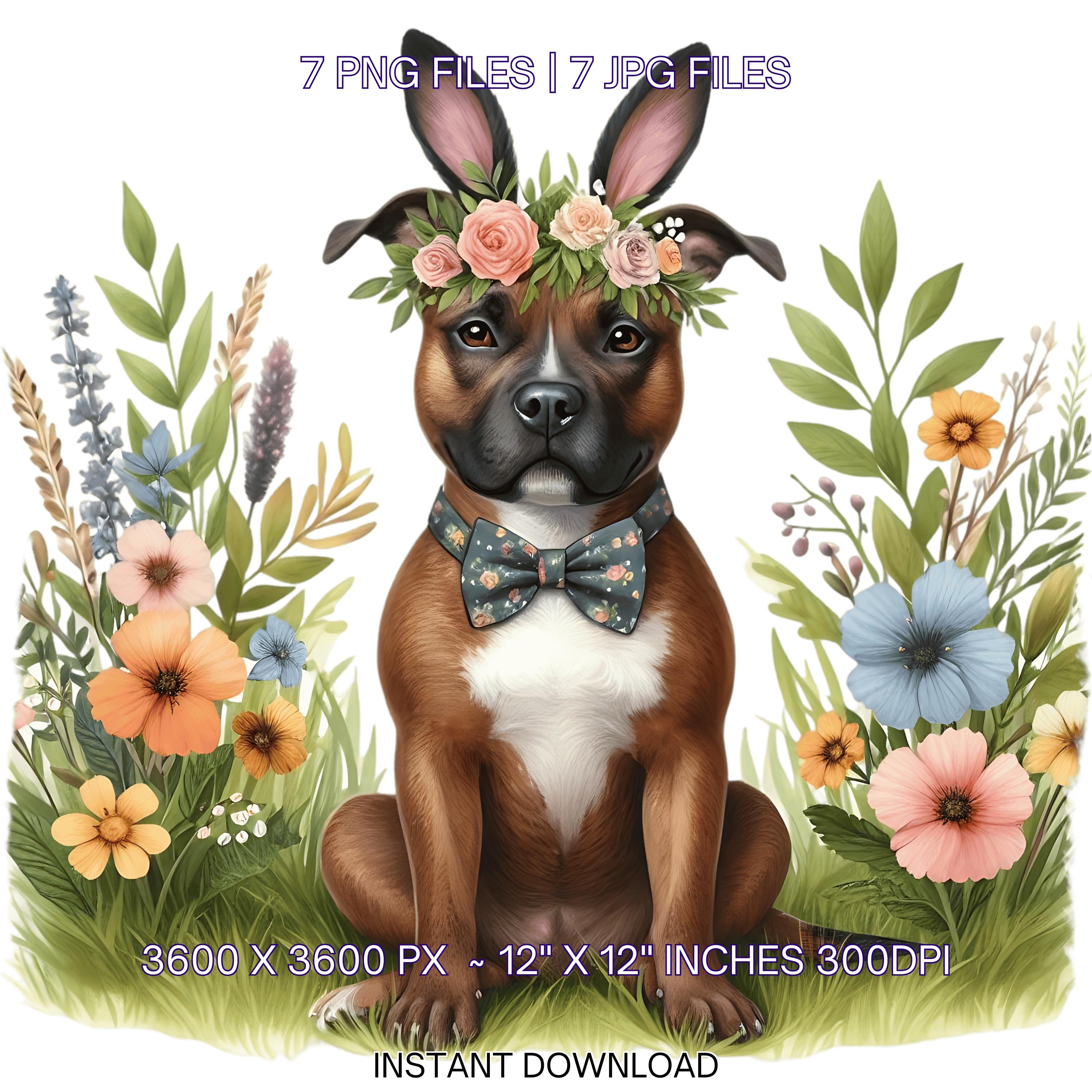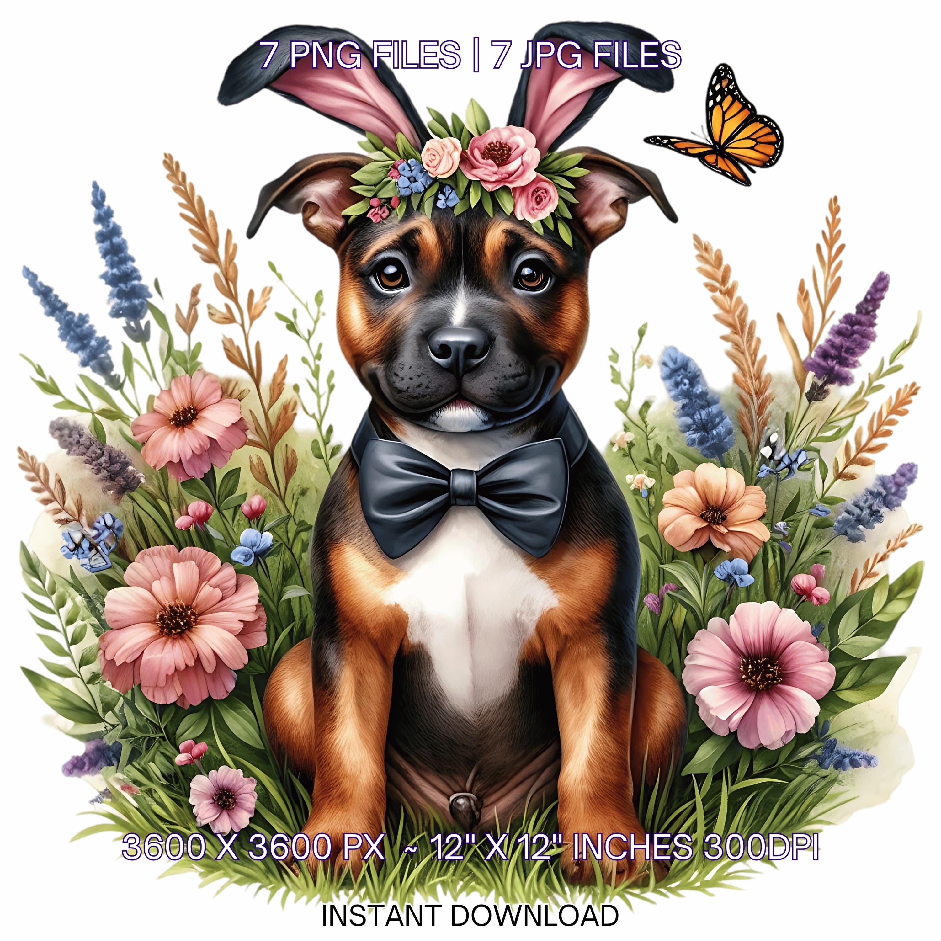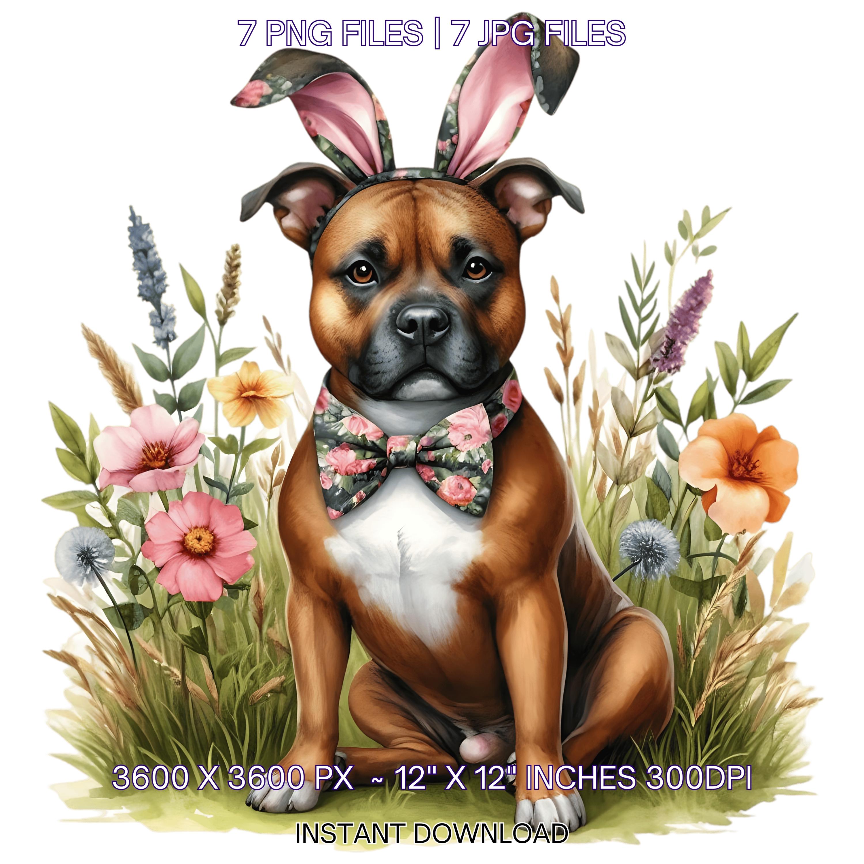 Easter Staffordshire Bull Terrier Dog Wearing Floral Bow & Bunny Ear Handband Ready for Easter Egg Hunting Clip Art PNG | 7 Clip Art | Dog Lover Sublimation Commercial Use