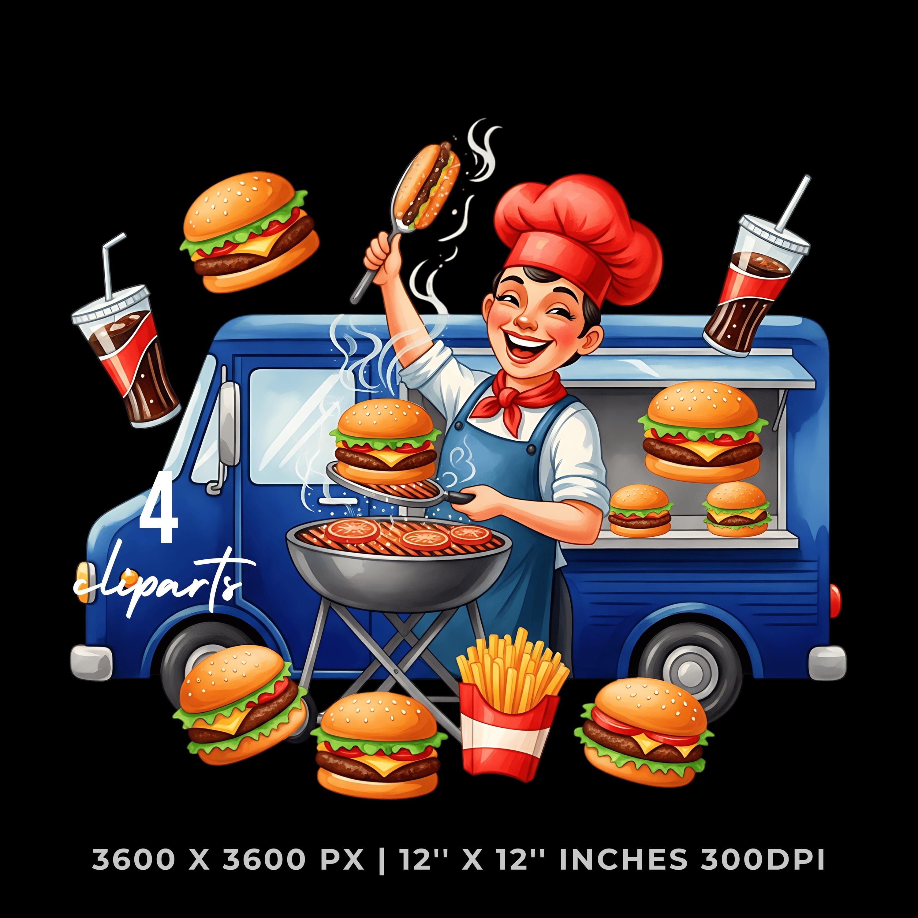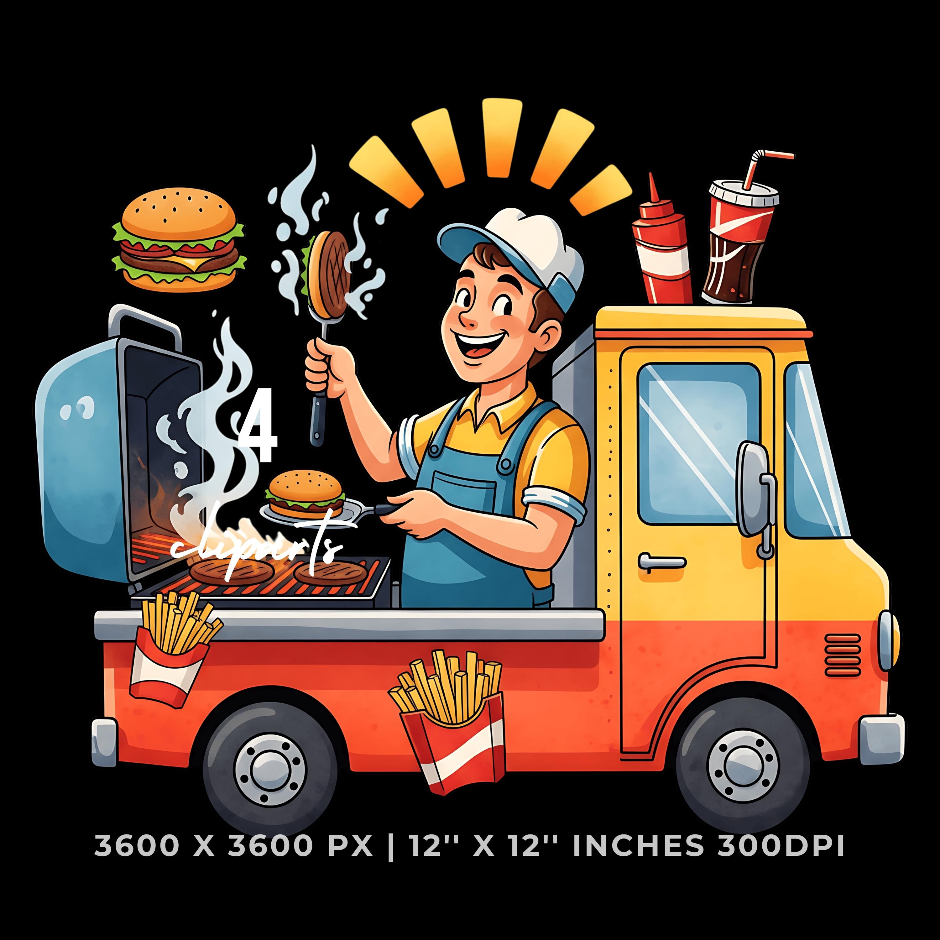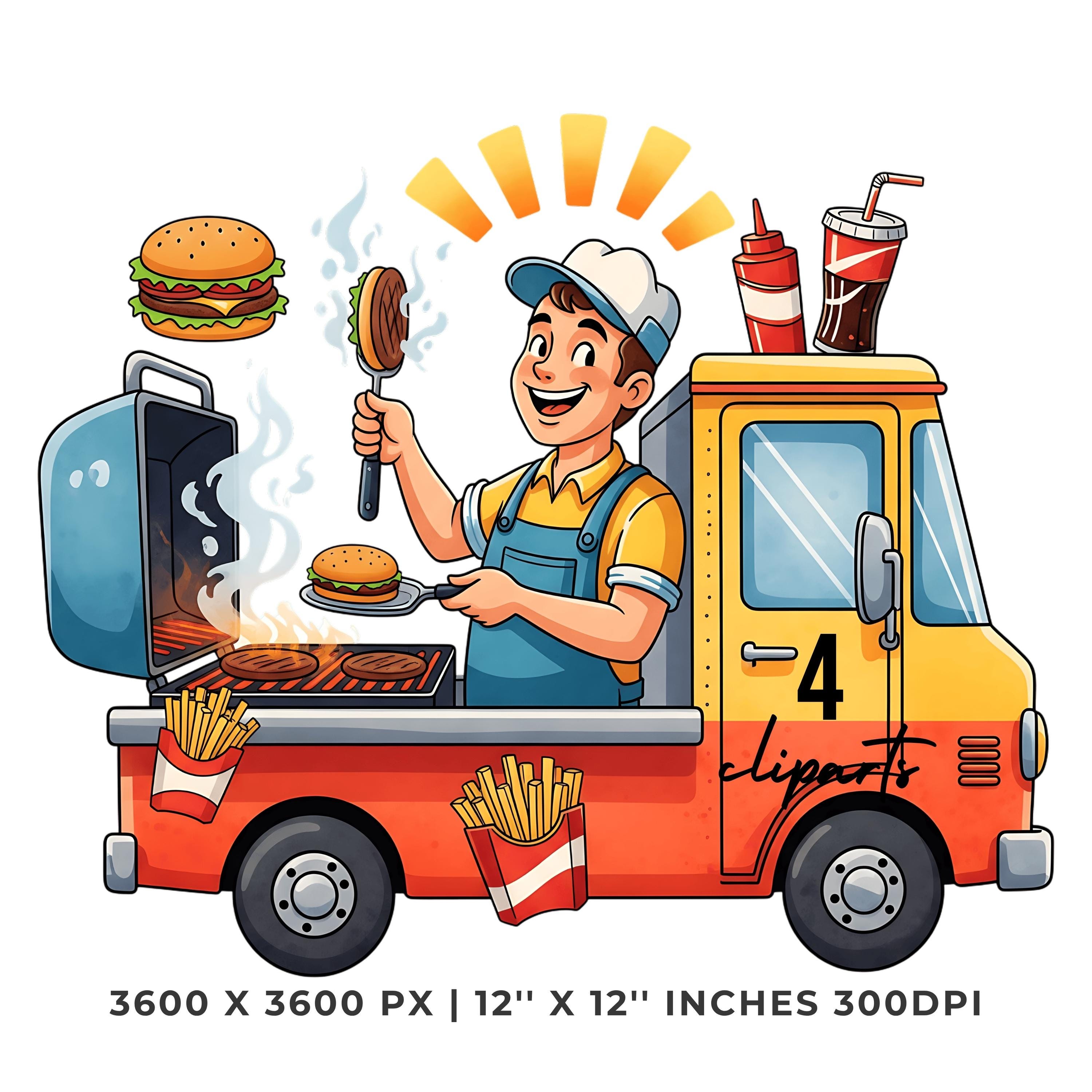 Street Food Worker PNG Clipart | Watercolor Fast Food Truck Worker surrounded by burger, fries & soda | 4 PNG – 4 JPG Graphic Commercial Use is an eye-catching, high-resolution digital asset designed for creators, crafters, teachers, and small business owners looking to elevate their visuals.