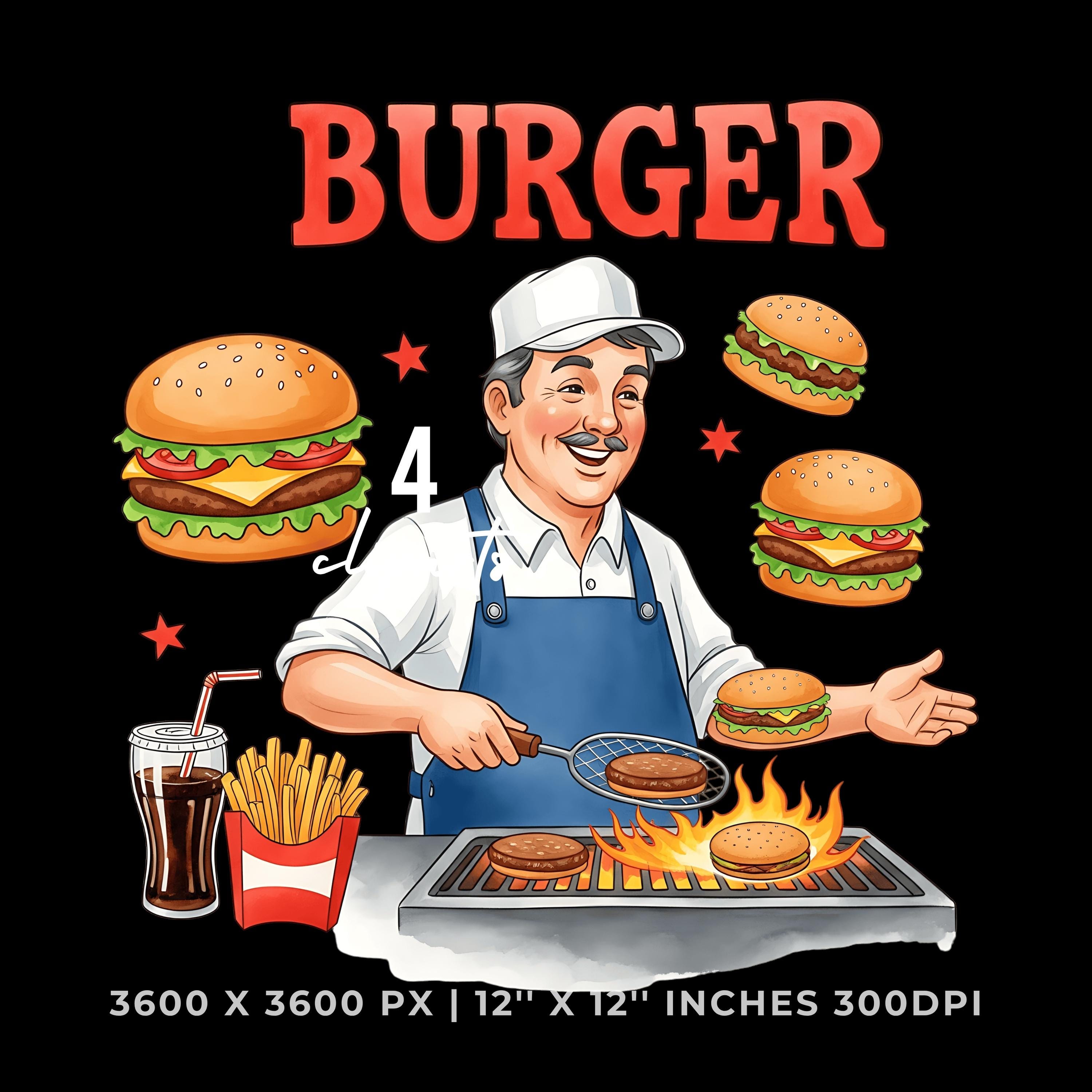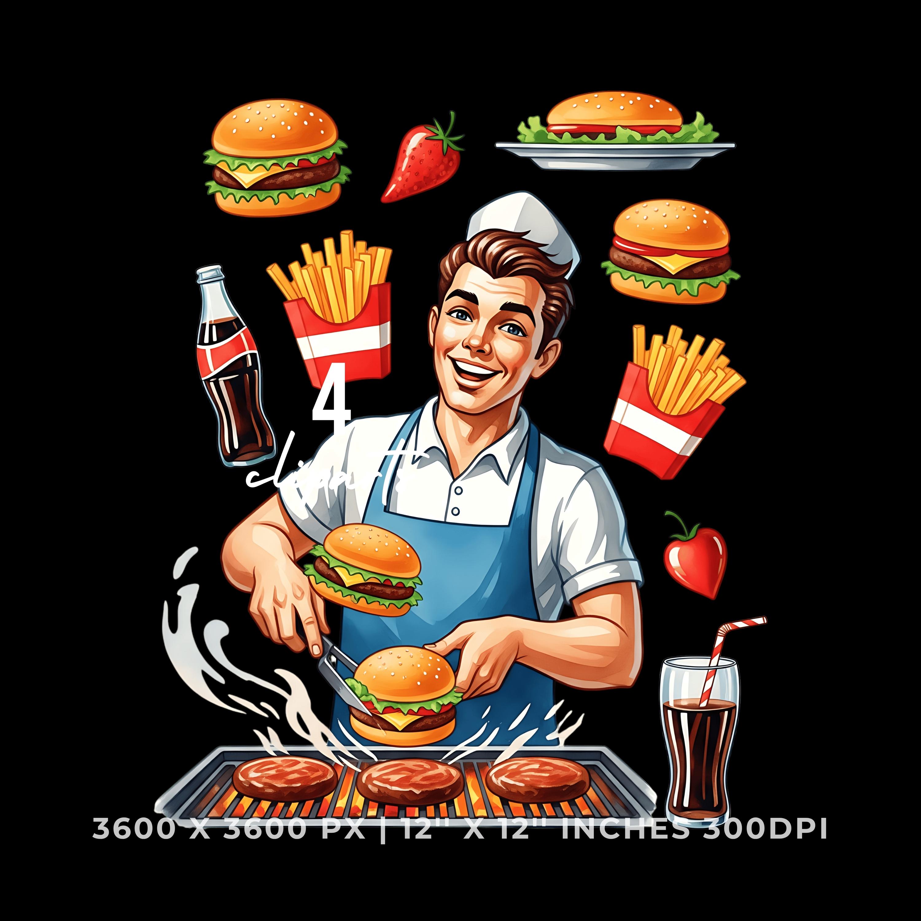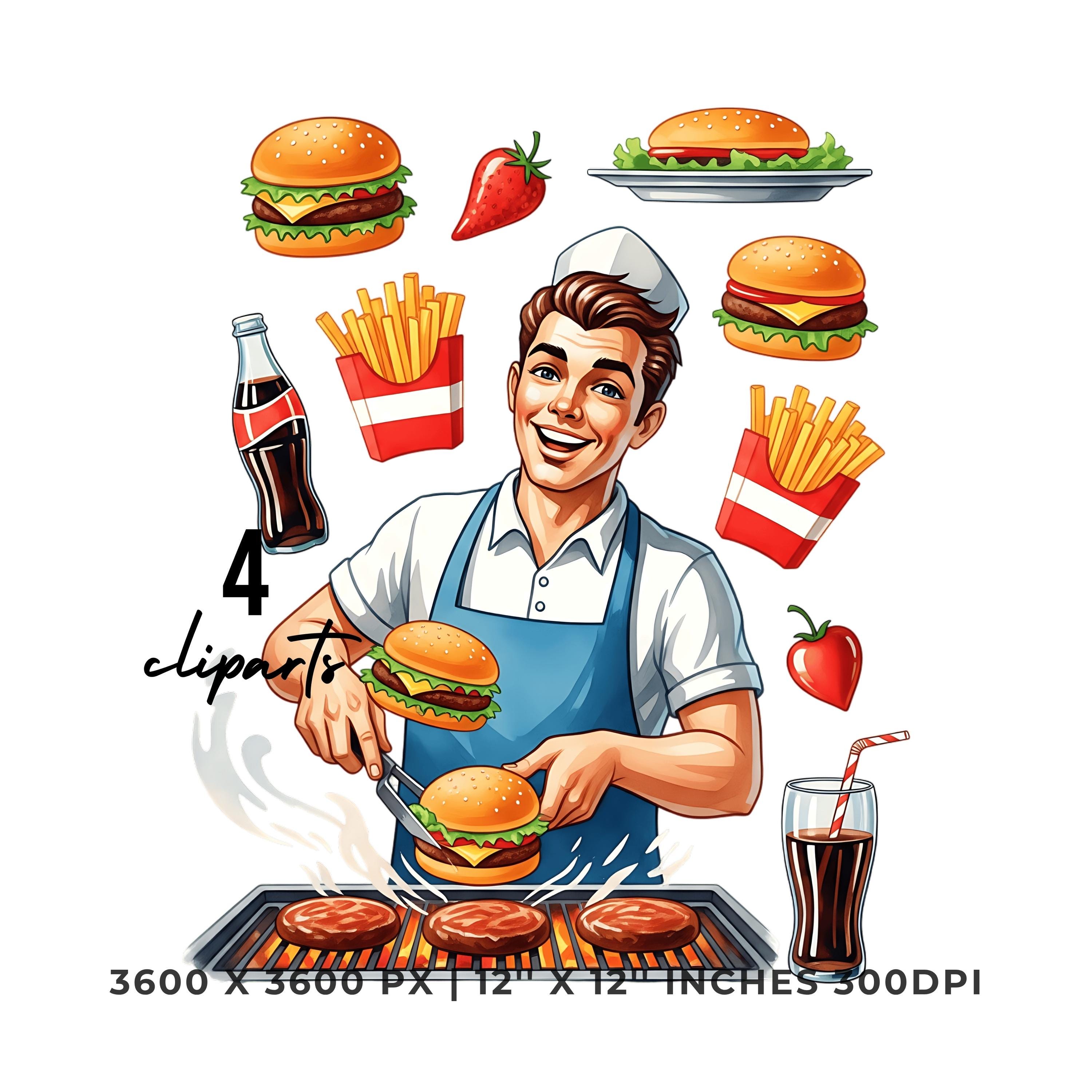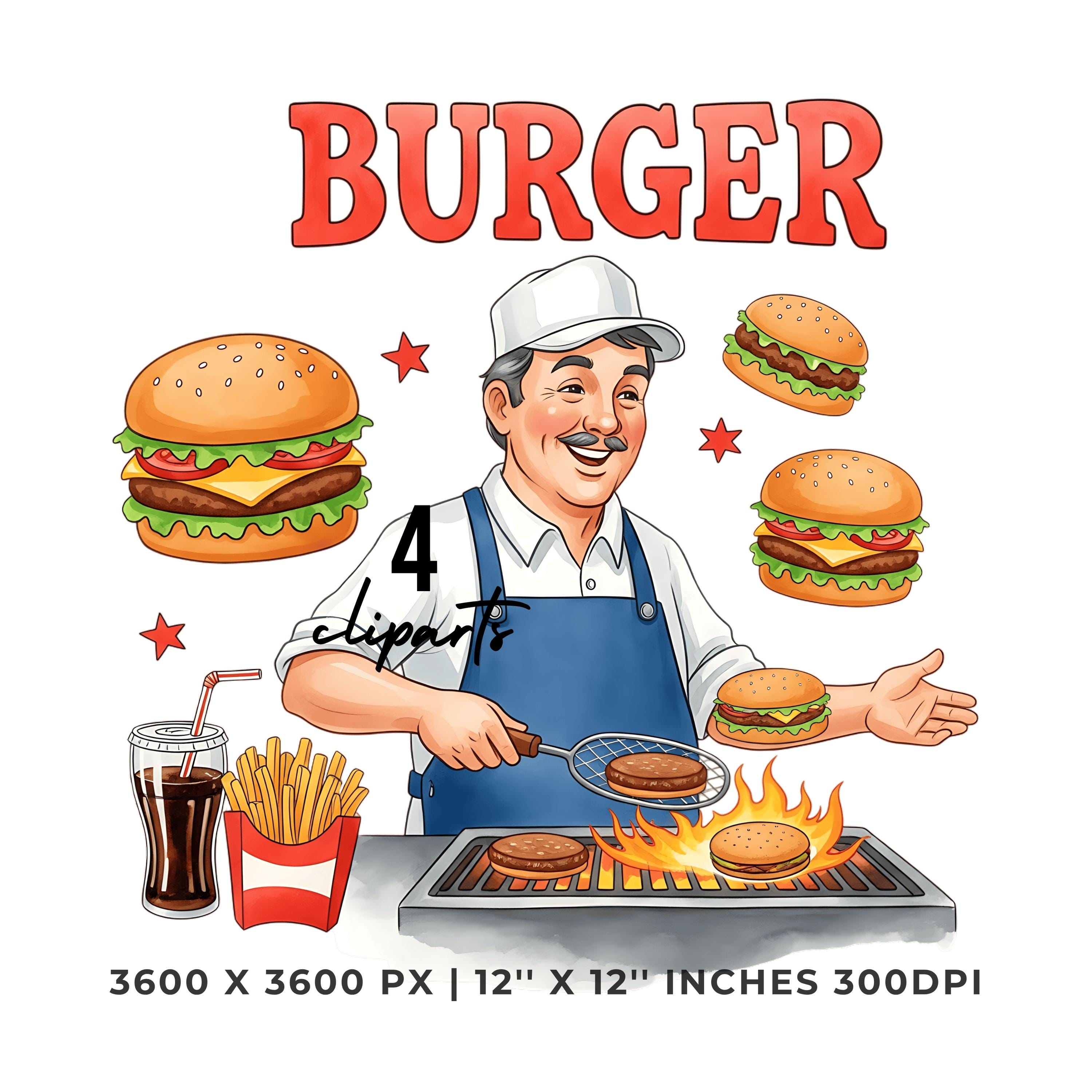 Street Food Worker PNG Clipart | Watercolor Food Truck Worker flipping burgers on a grill smiling, surrounded by burger, fries, and soda | fast food worker | 4 PNG – 4 JPG Graphic Commercial Use