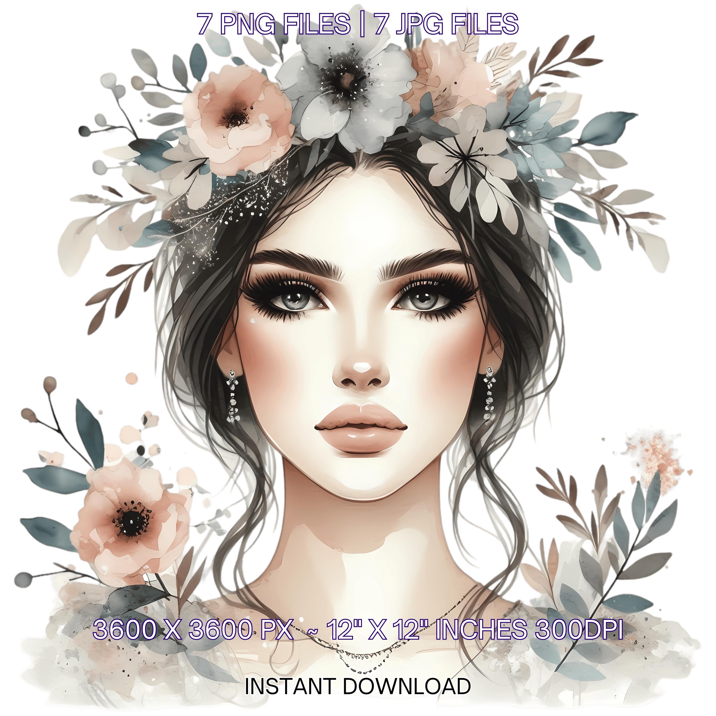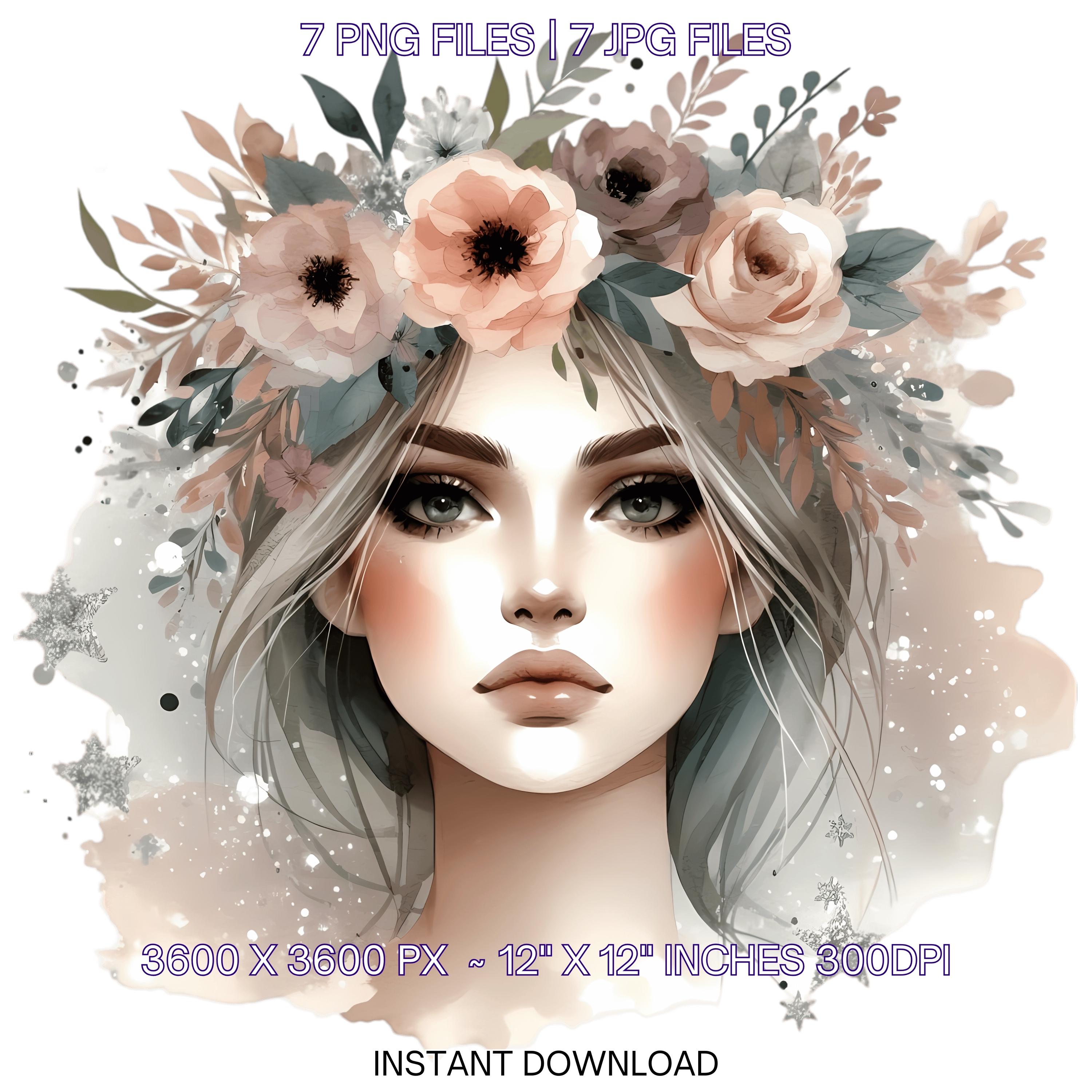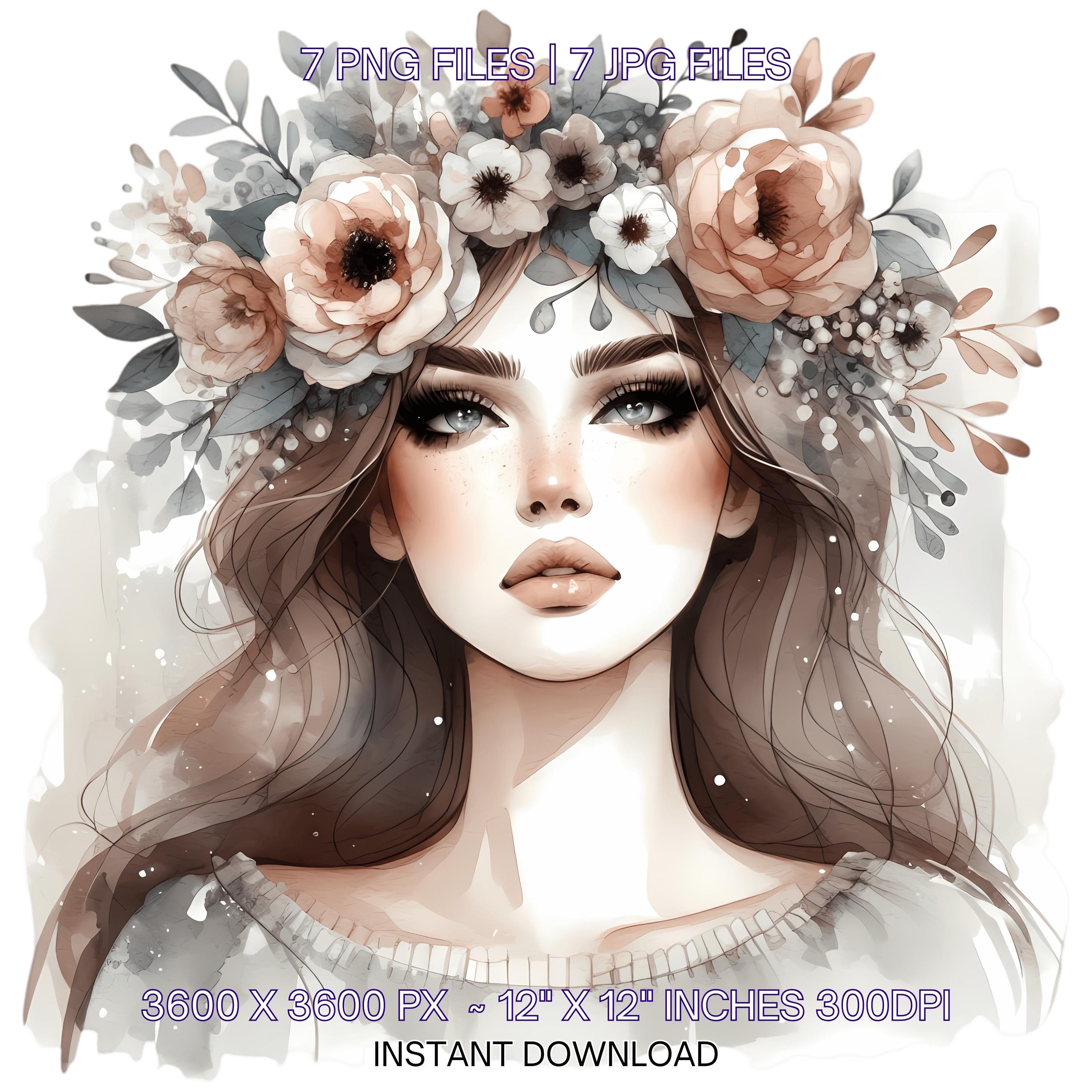 Stylized Fashion Portrait PNG Clipart | Stylized Fashion Portrait with Floral Crown | Watercolor Fashion Portrait with Floral Crown Illustration Clipart | 7 JPG – 7 PNG Sublimation Commercial Use