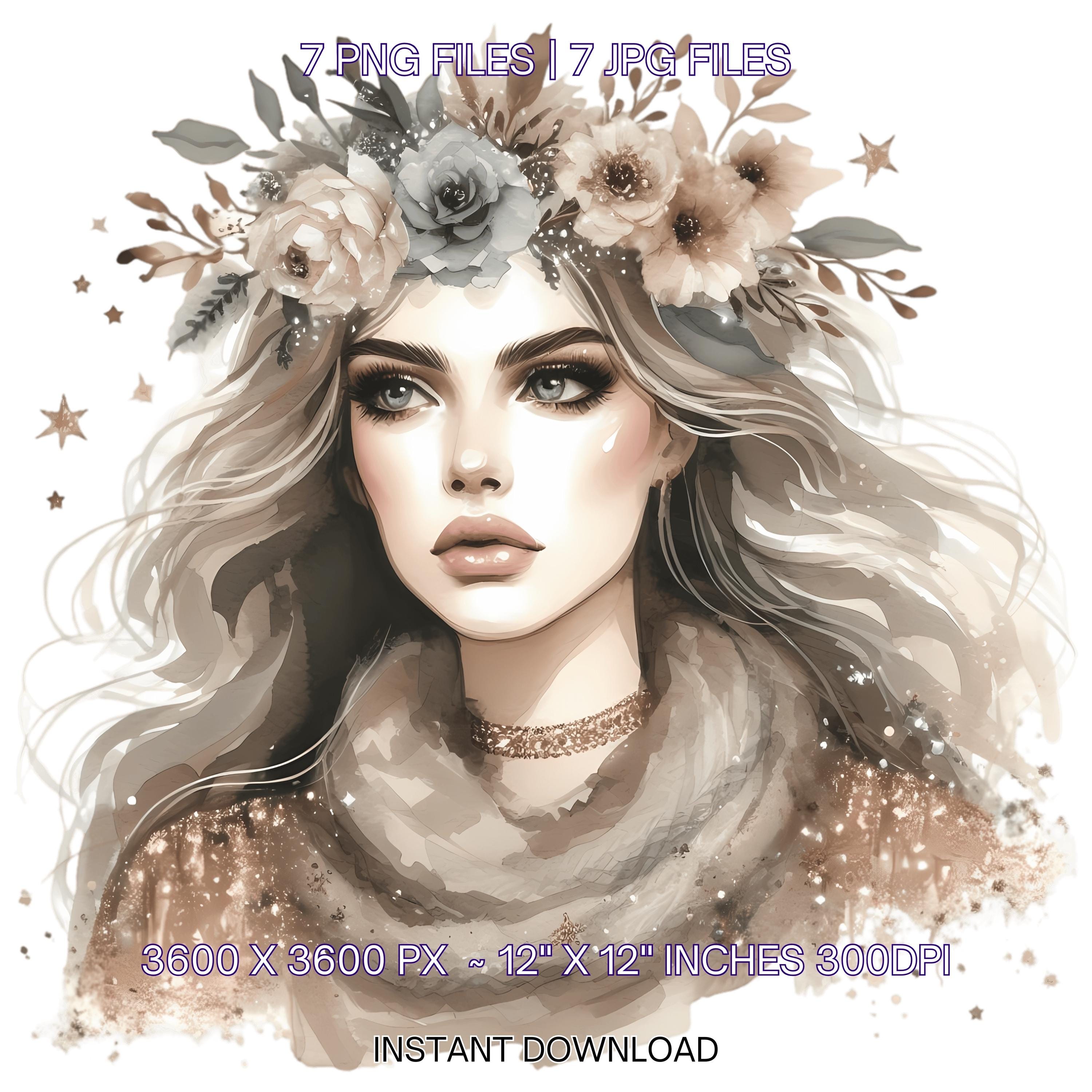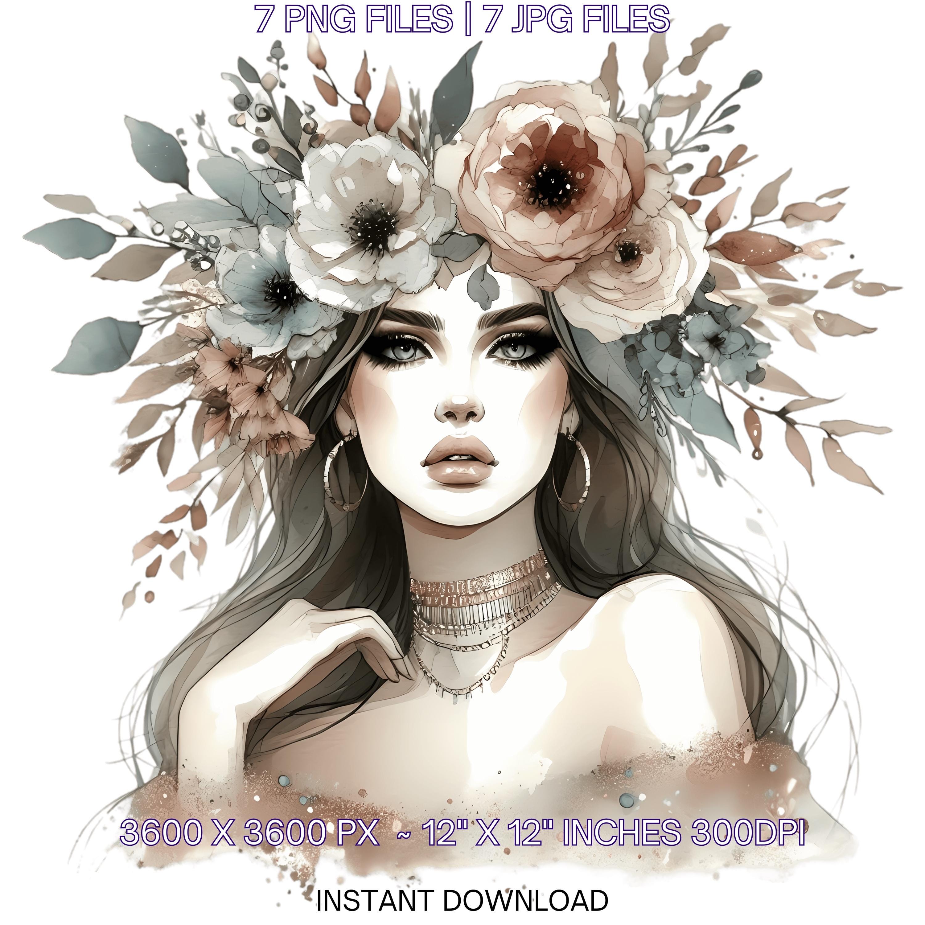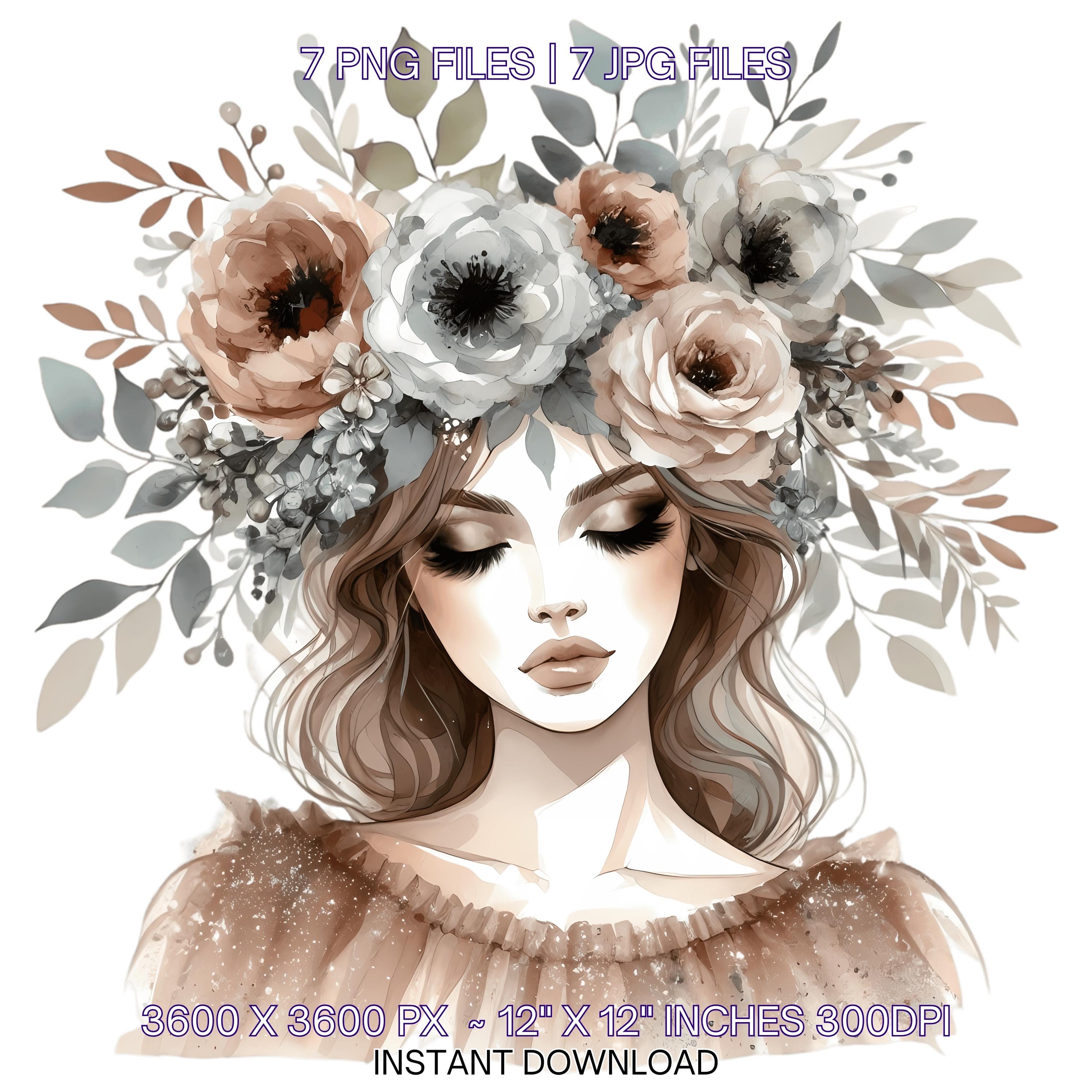 Stylized Fashion Portrait PNG Clipart | Stylized Fashion Portrait with Floral Crown | Watercolor Fashion Portrait with Floral Crown Illustration Clipart | 7 JPG – 7 PNG Sublimation Commercial Use