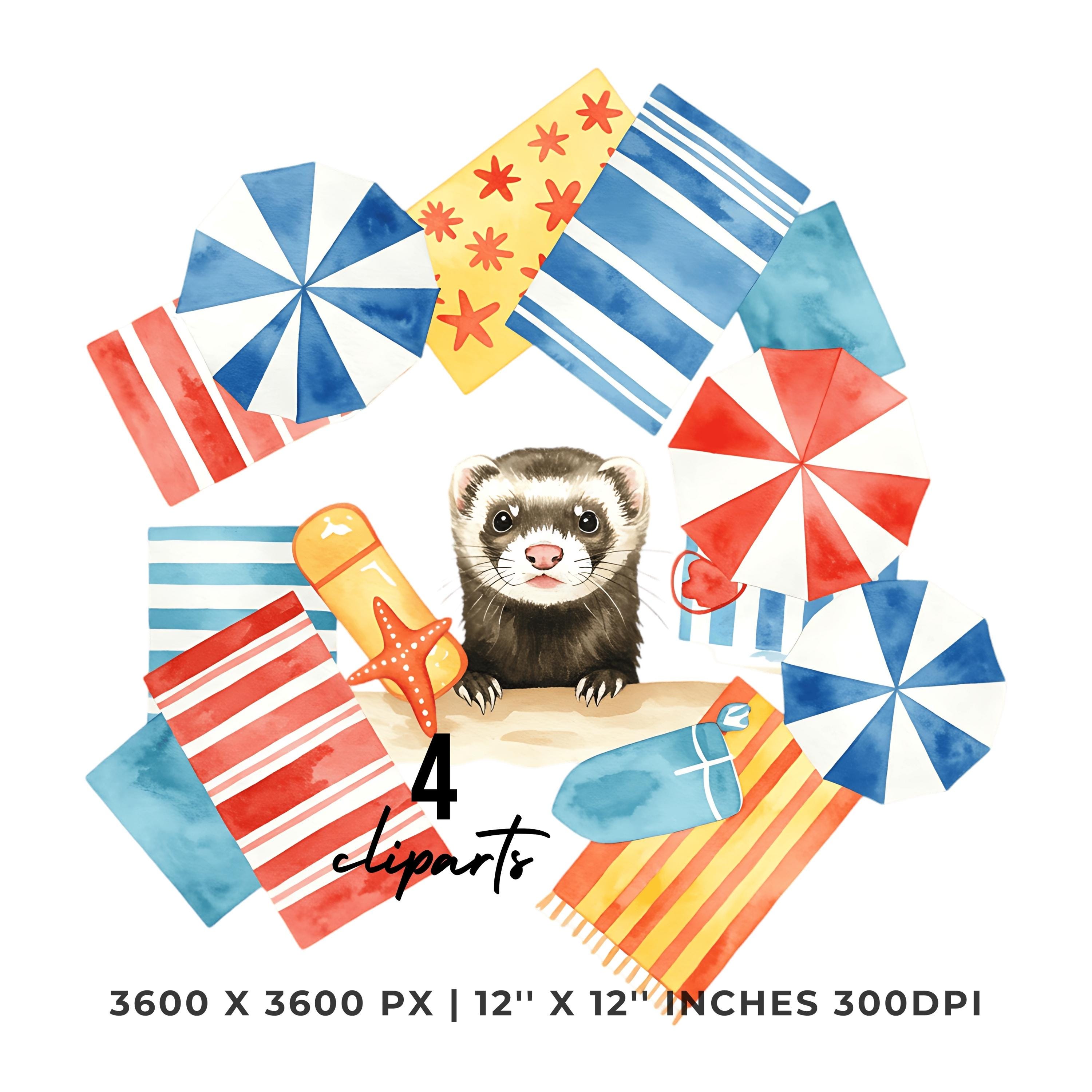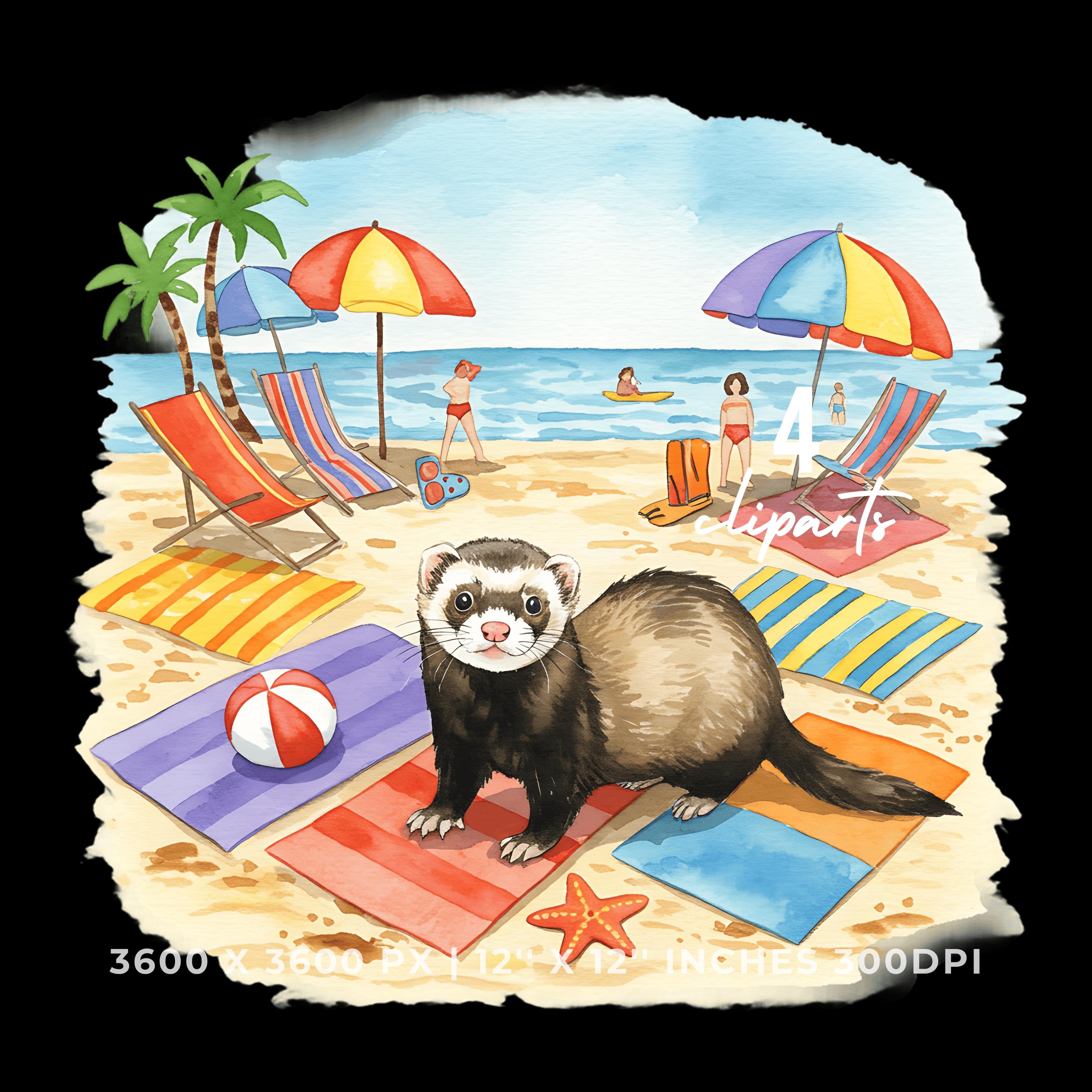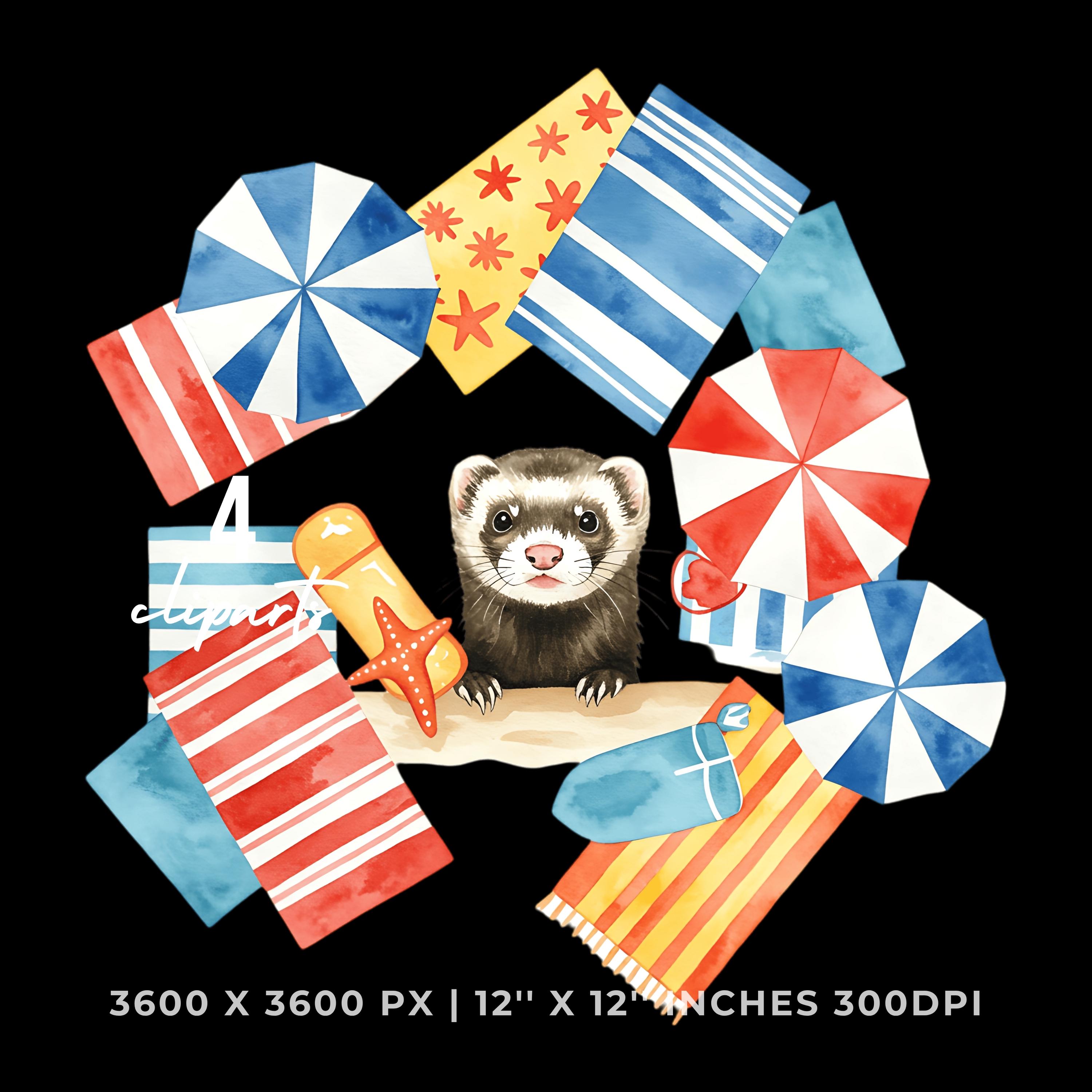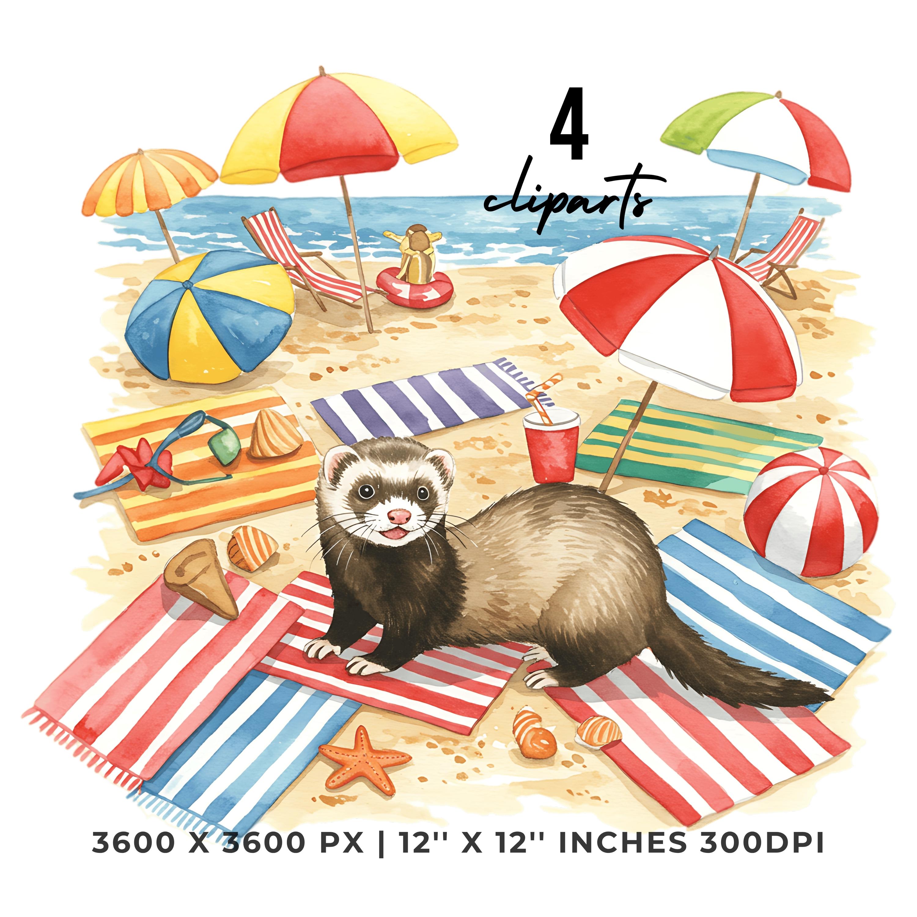 Summer Ferret Clipart PNG | 4 Watercolor Ferret playing among beach towels & umbrellas on a crowded sunny beach | Sublimation Commercial Use is an eye-catching, high-resolution digital asset designed for creators, crafters, teachers, and small business owners looking to elevate their visuals.