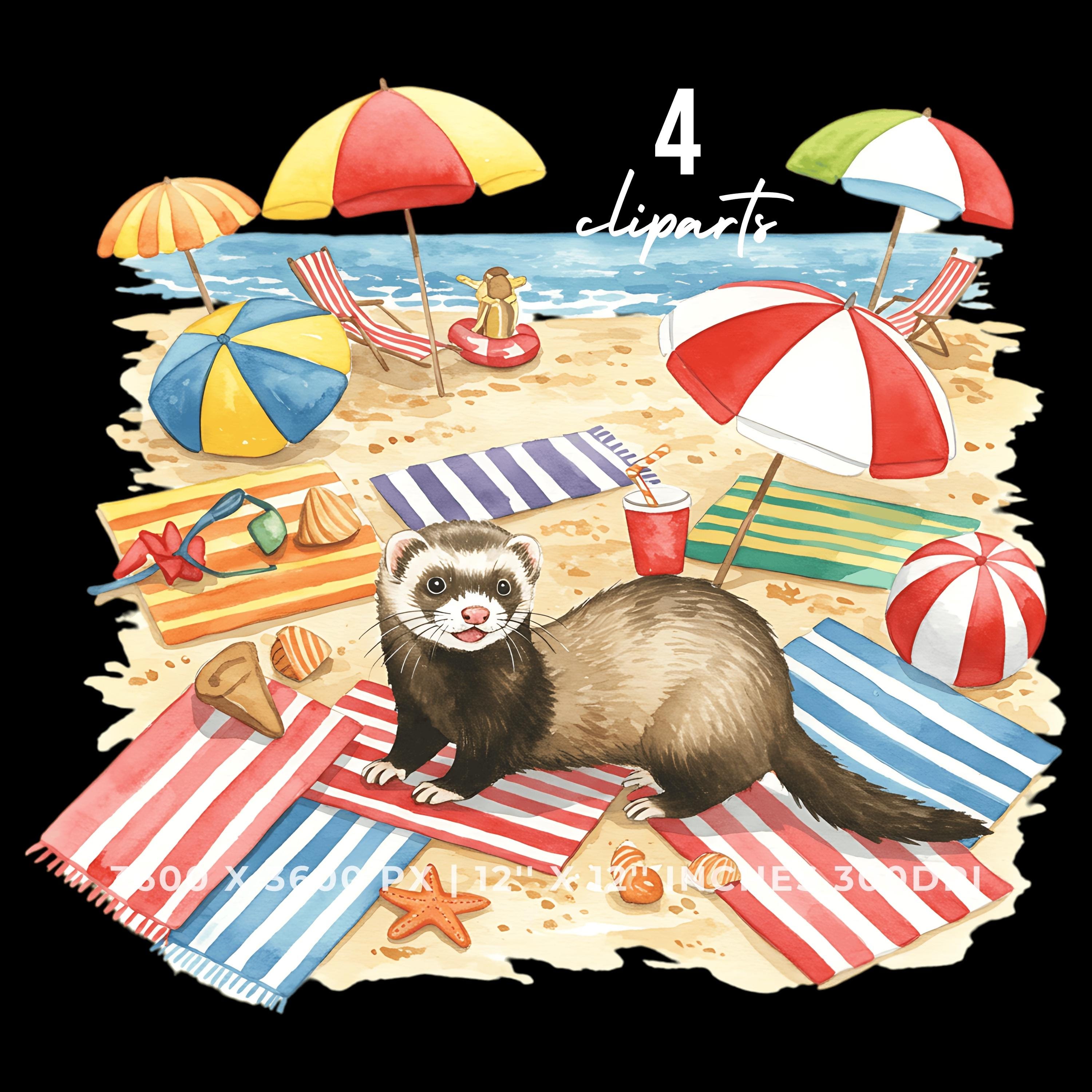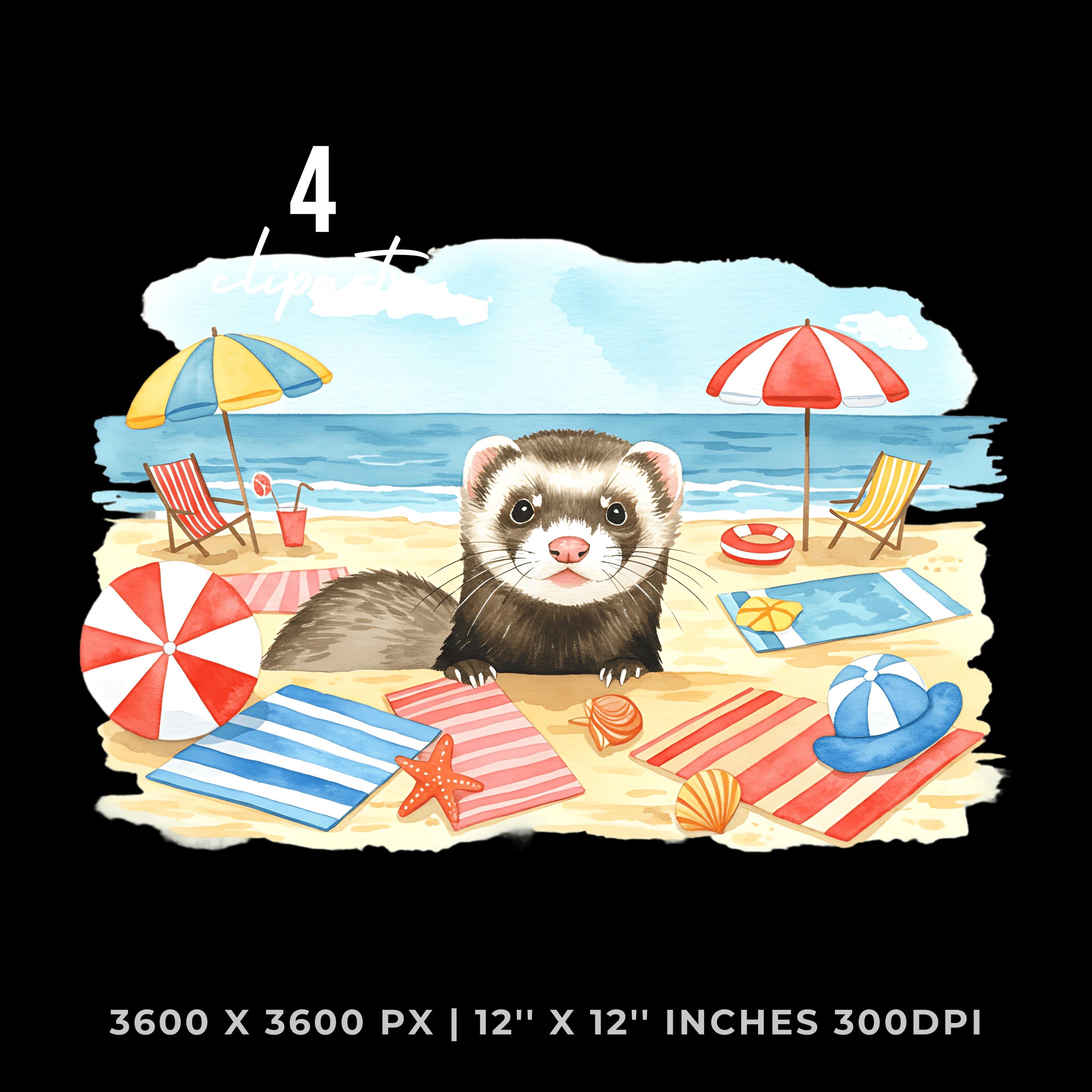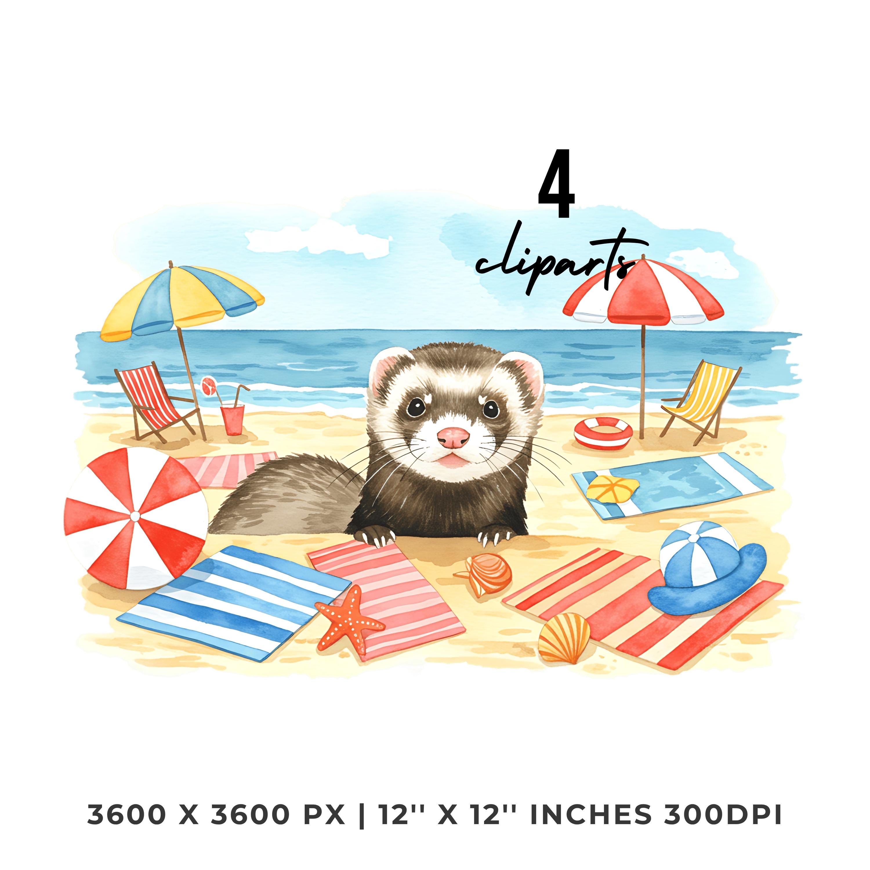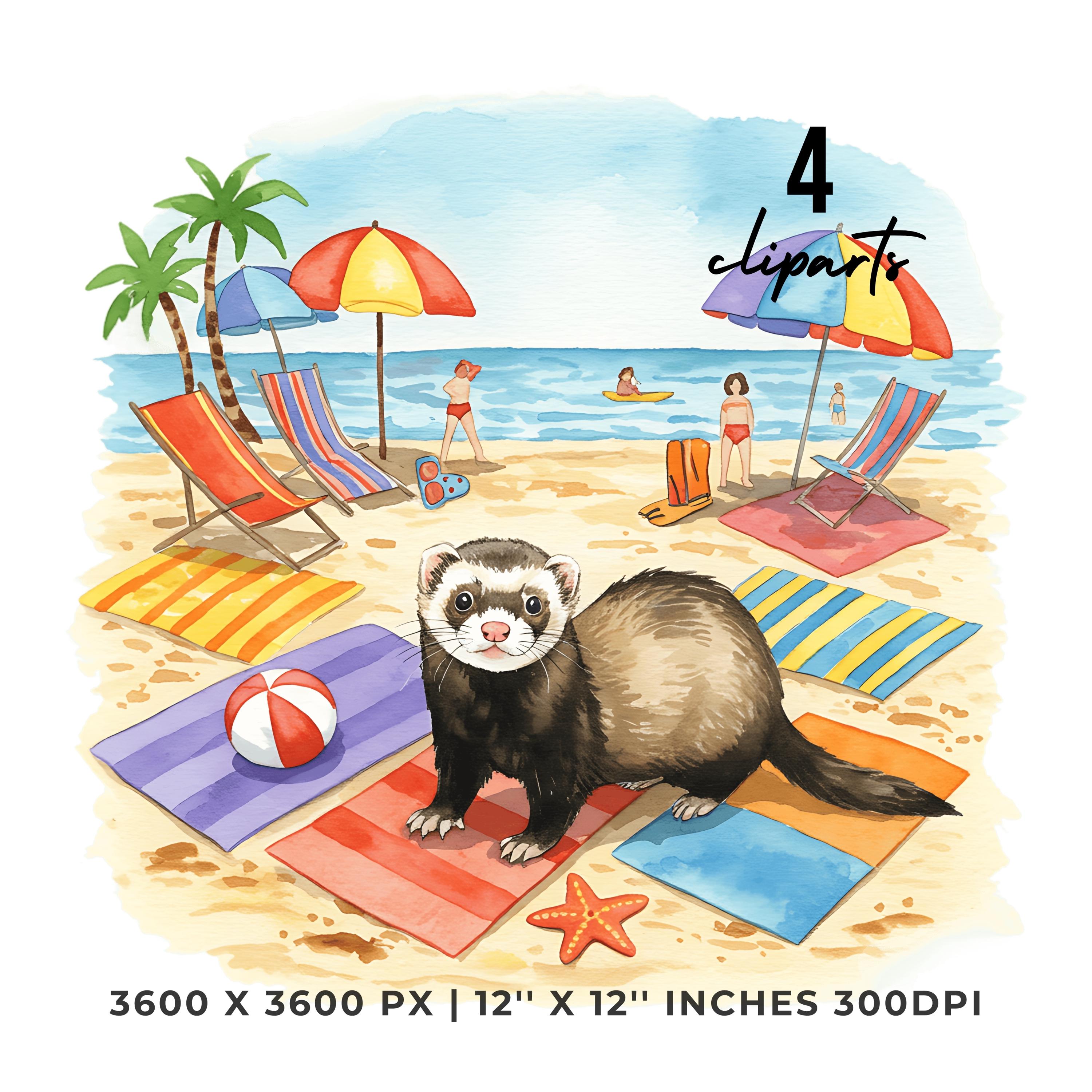 Summer Ferret Clipart PNG | 4 Watercolor Ferret playing among beach towels & umbrellas on a crowded sunny beach | Sublimation Commercial Use is an eye-catching, high-resolution digital asset designed for creators, crafters, teachers, and small business owners looking to elevate their visuals.