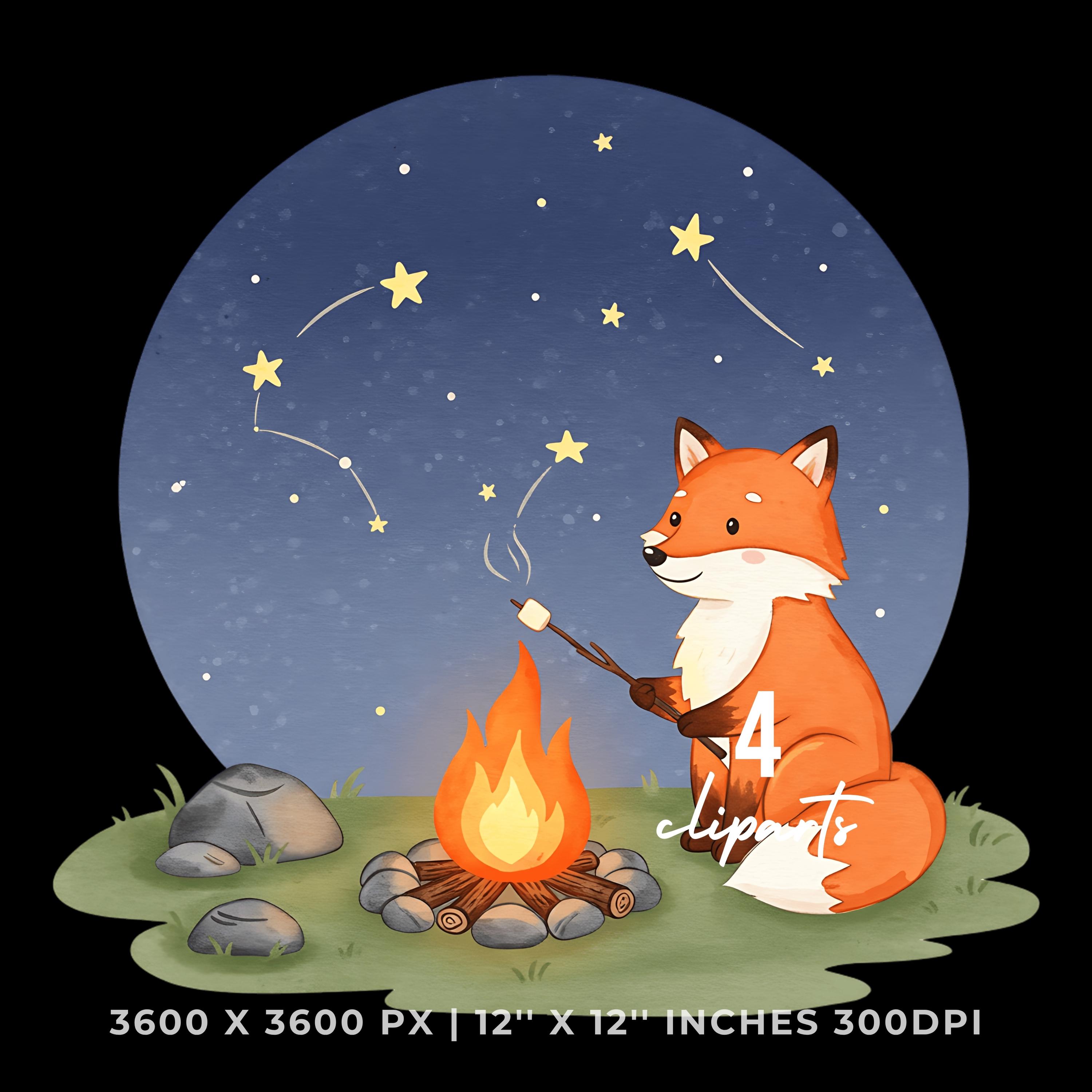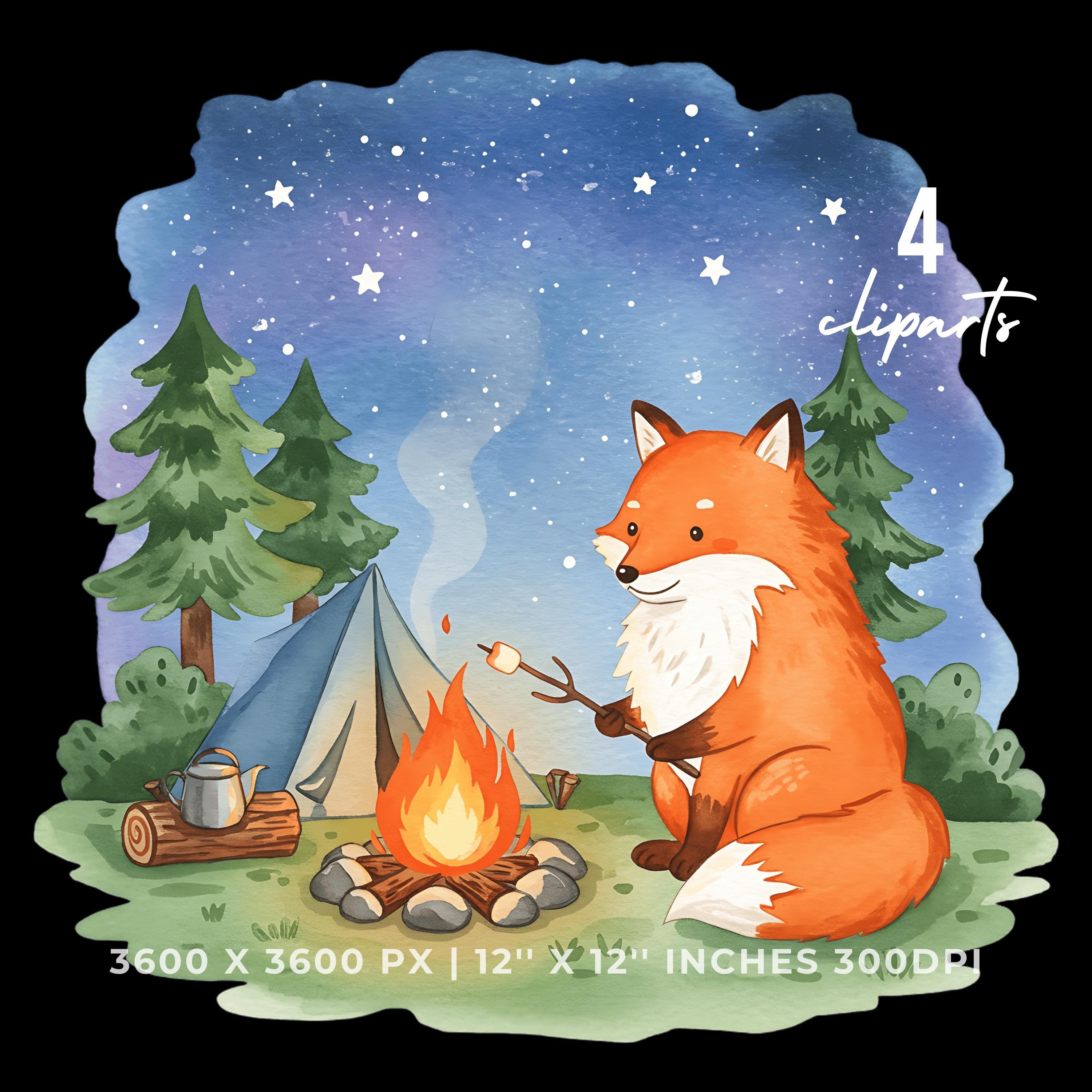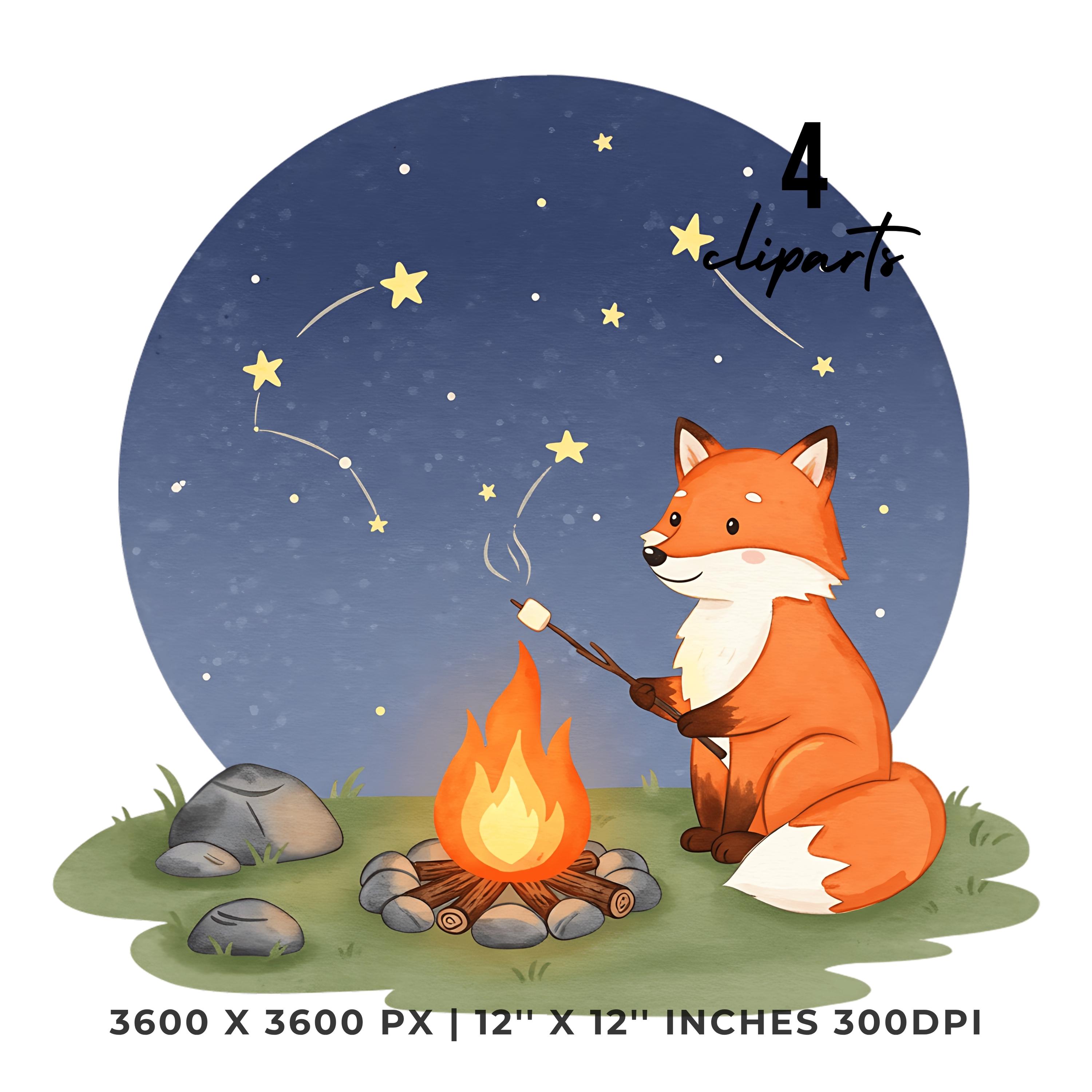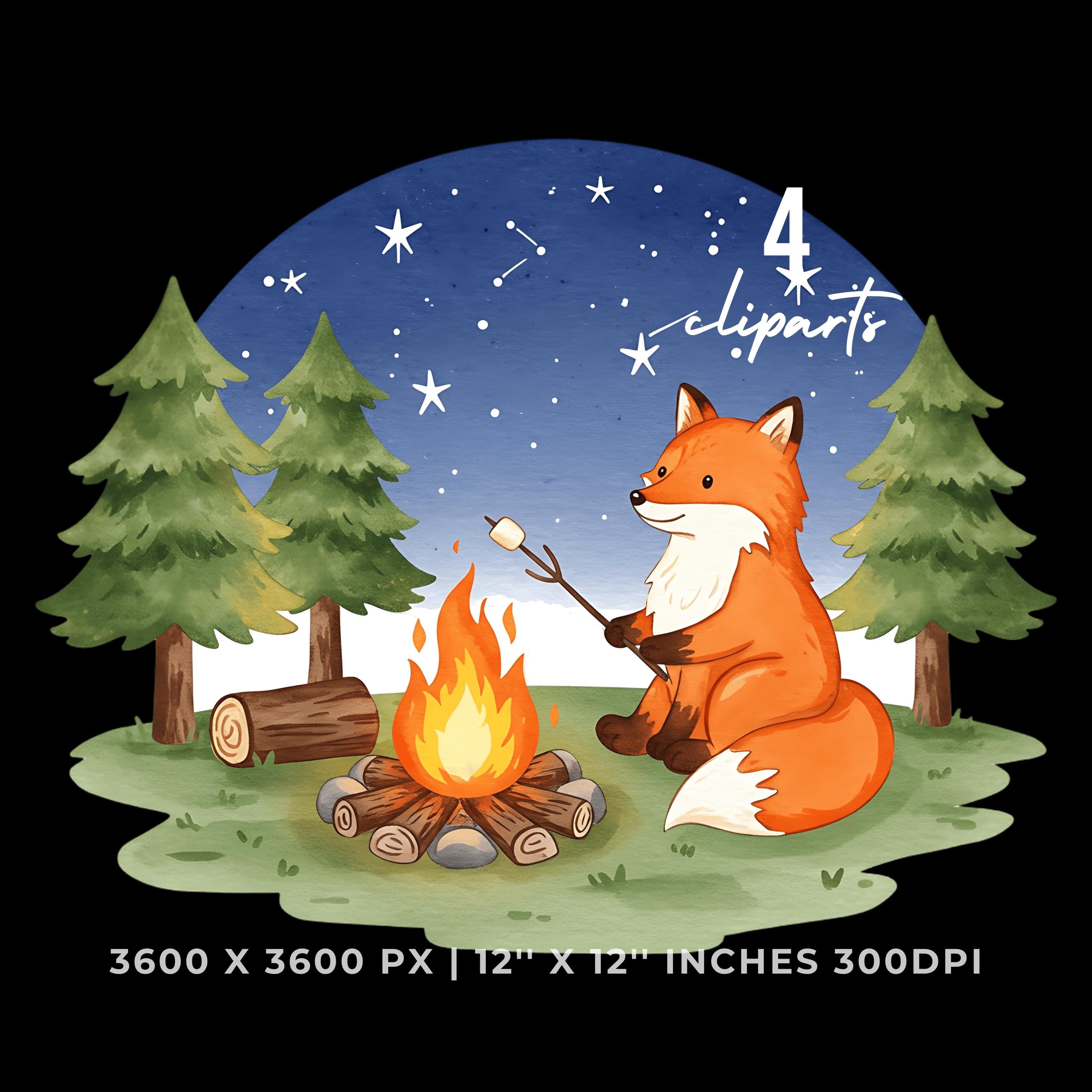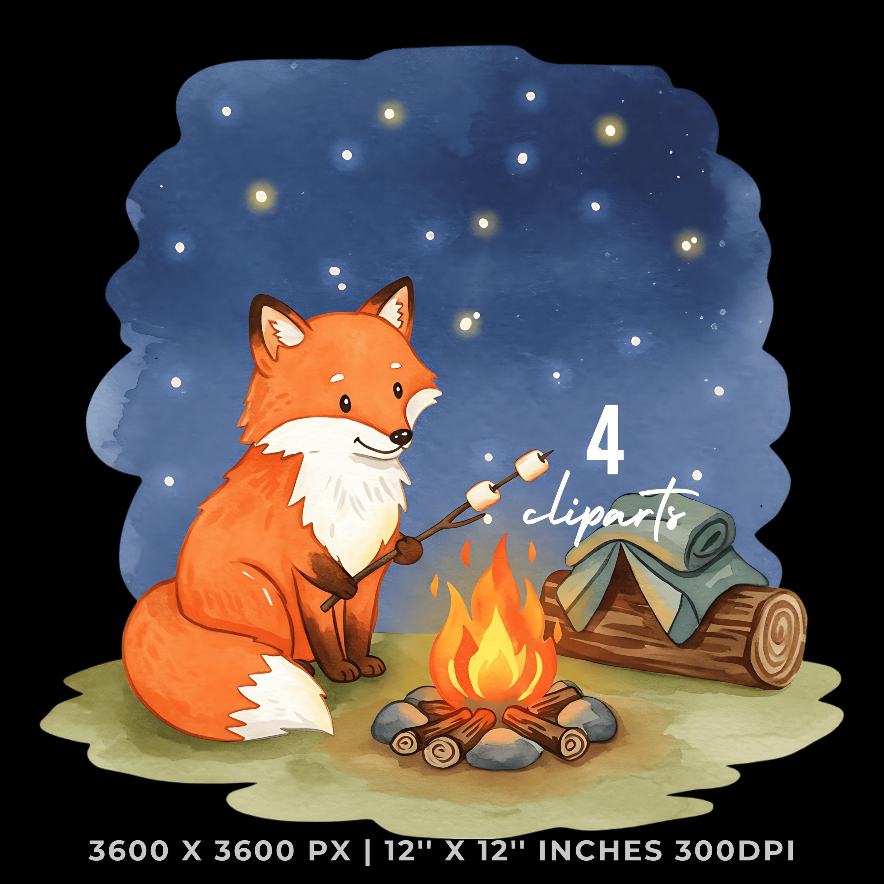 Summer Fox Clipart PNG | 4 Watercolor Fox roasting marshmallows over a small campfire under the star | Sublimation Transparent Commercial Use