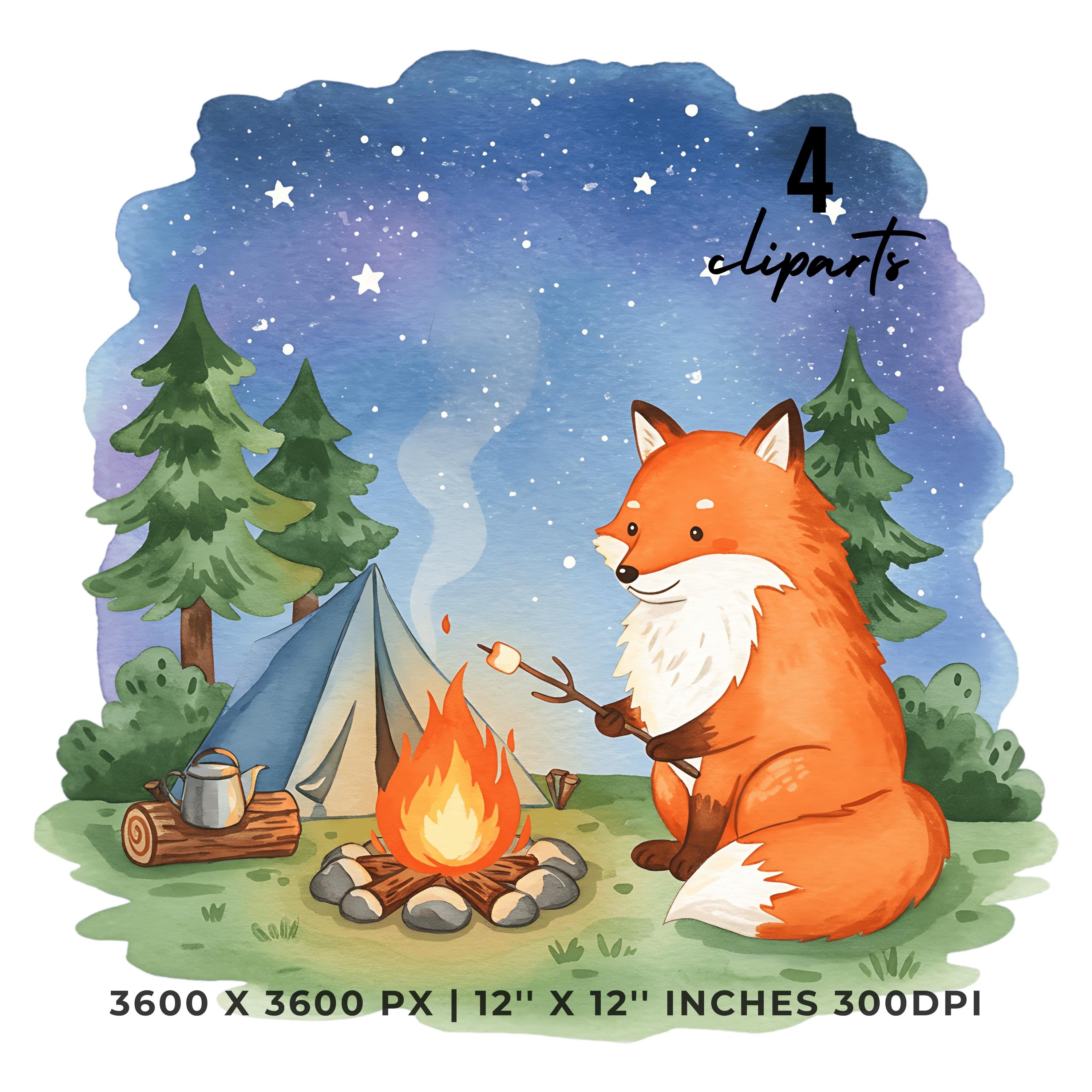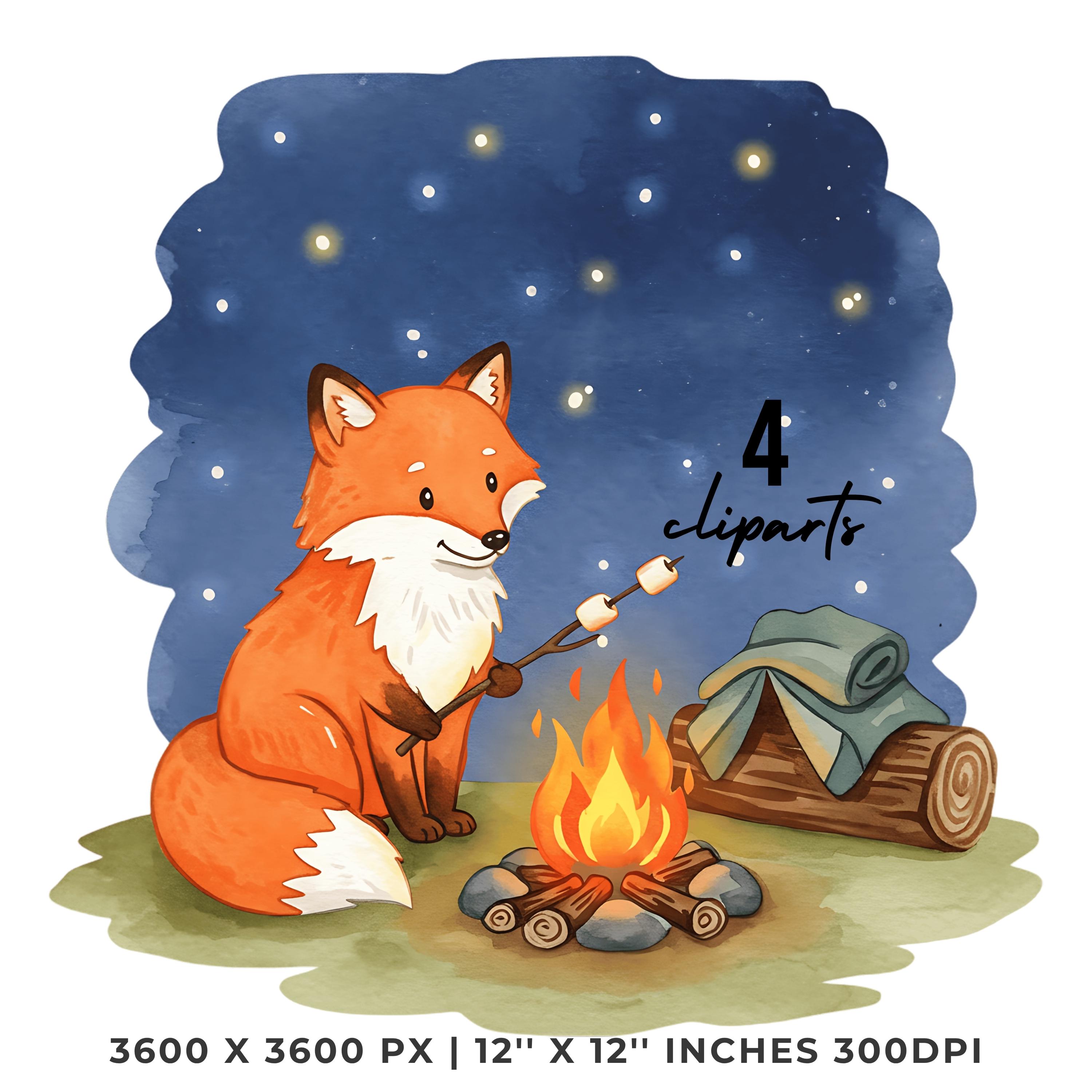 Summer Fox Clipart PNG | 4 Watercolor Fox roasting marshmallows over a small campfire under the star, Sublimation Transparent Commercial Use is an eye-catching, high-resolution digital asset designed for creators, crafters, teachers, and small business owners looking to elevate their visuals.