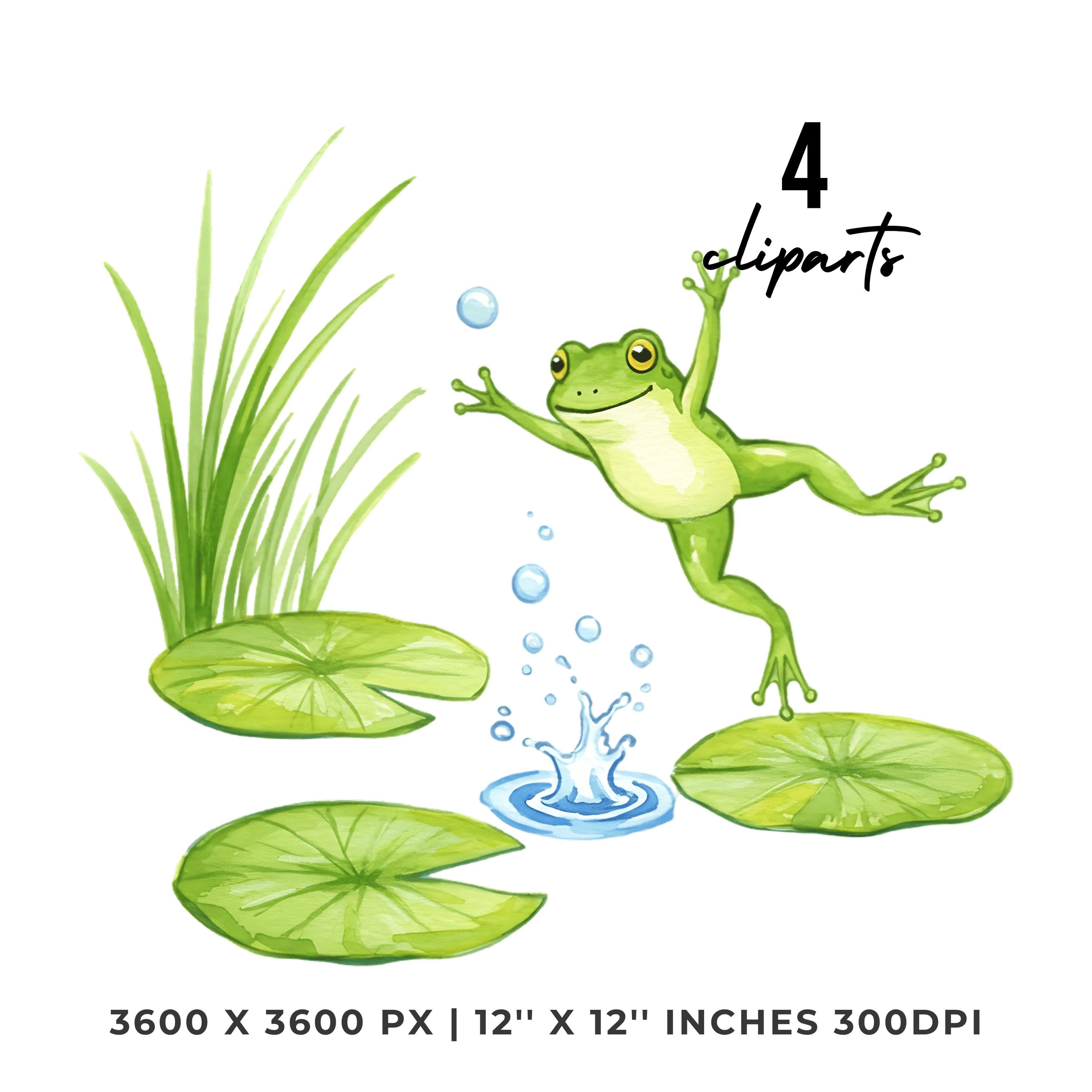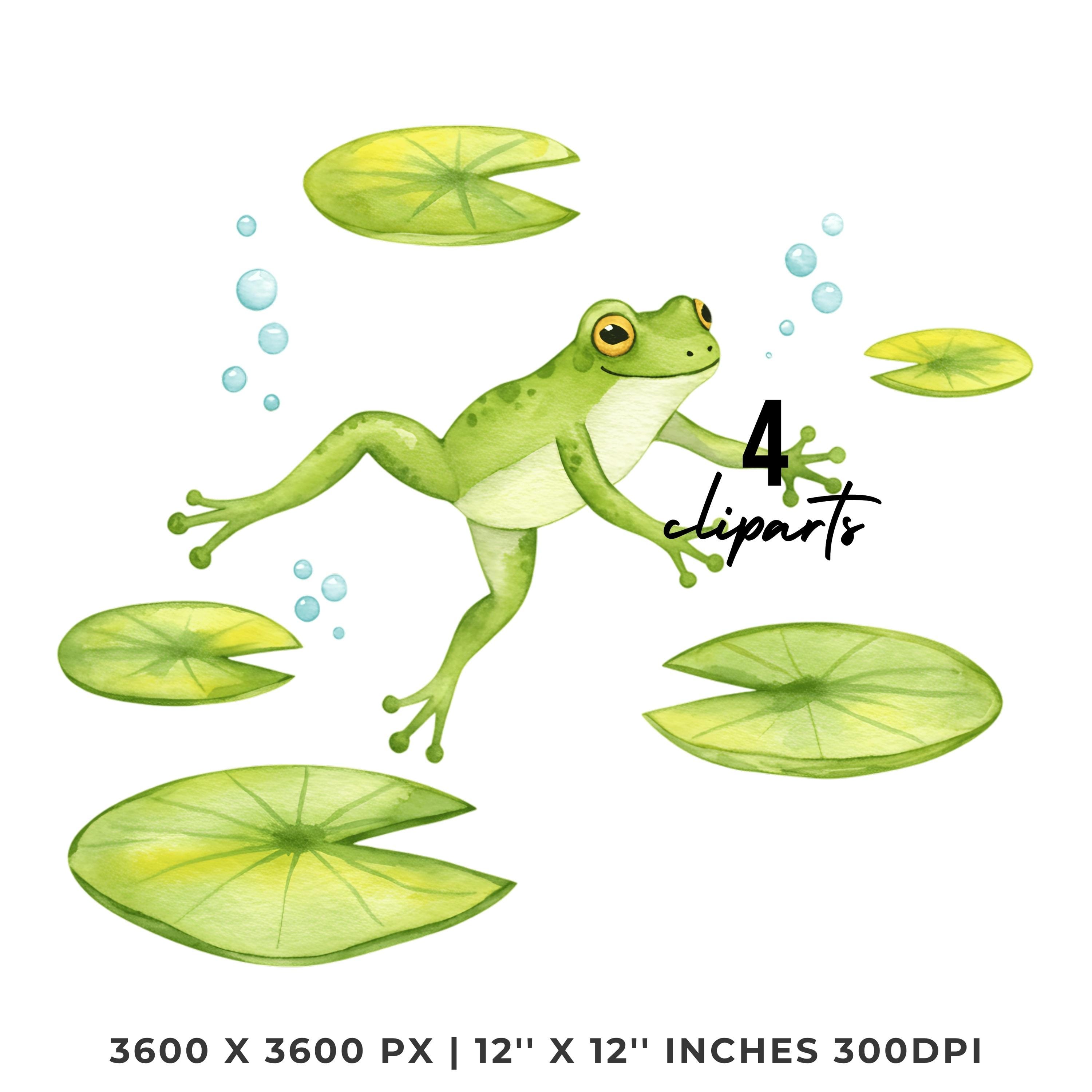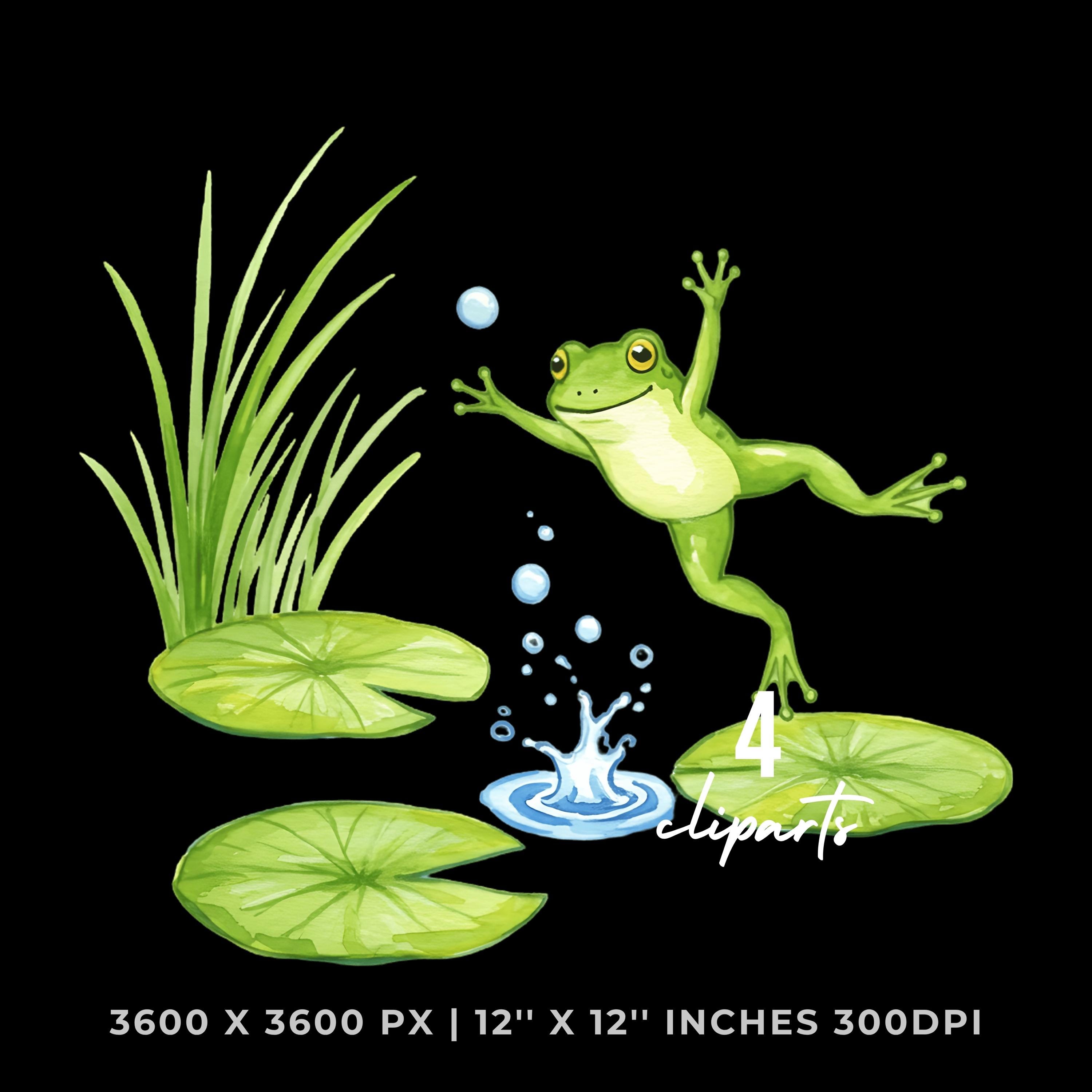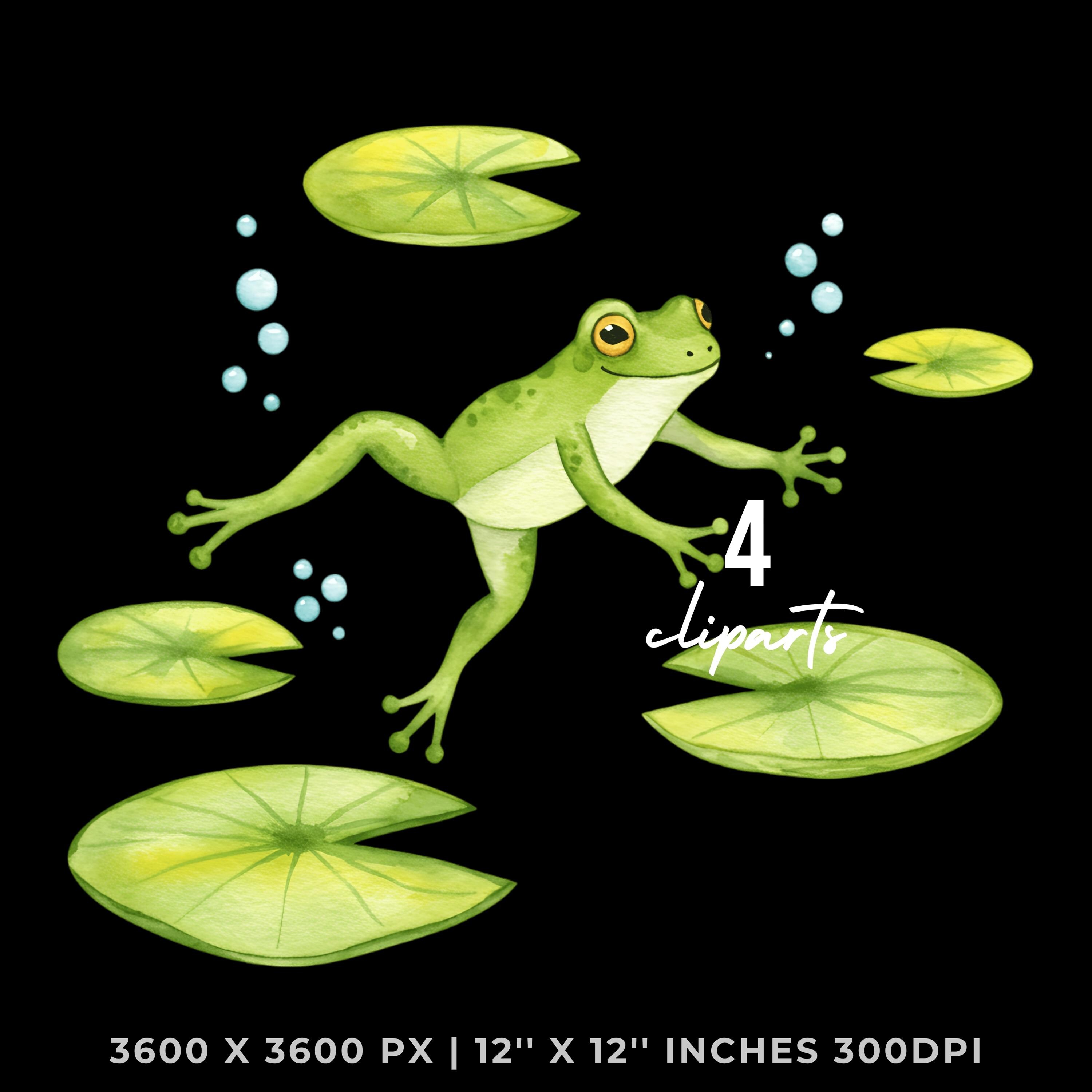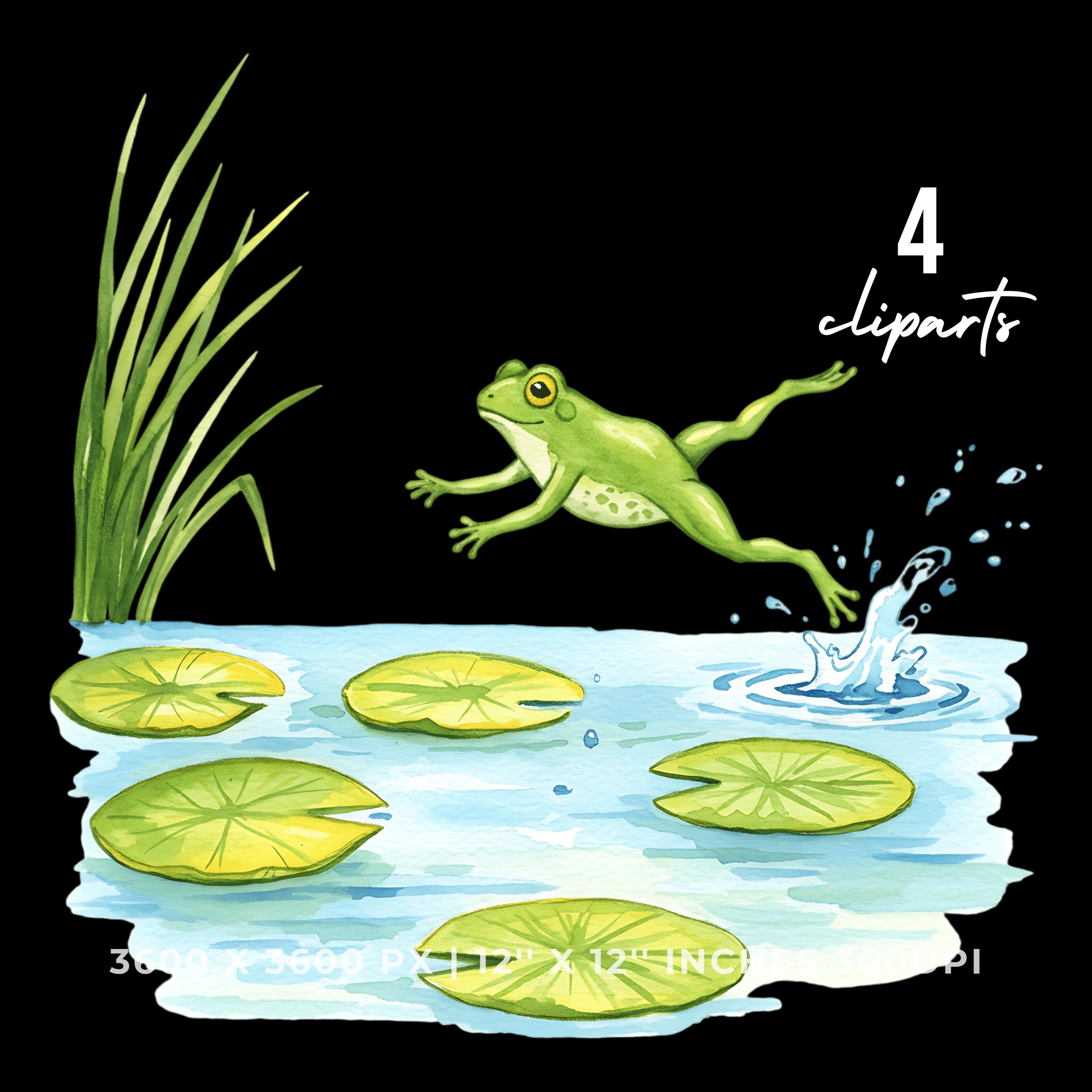 Summer Frog Clipart PNG | 4 Watercolor Frog jumping between lily pads in a sunny pond | Sublimation Transparent Commercial Use