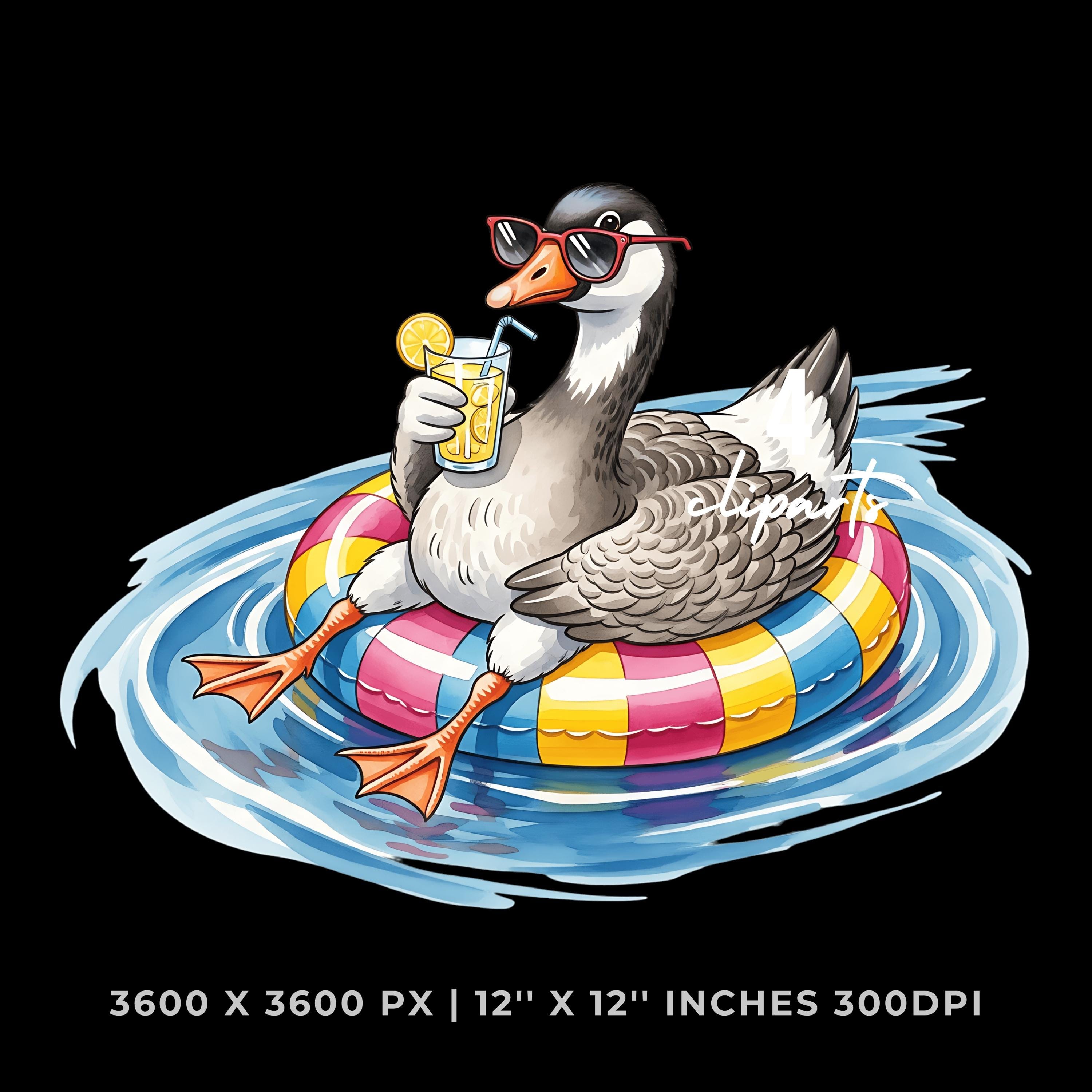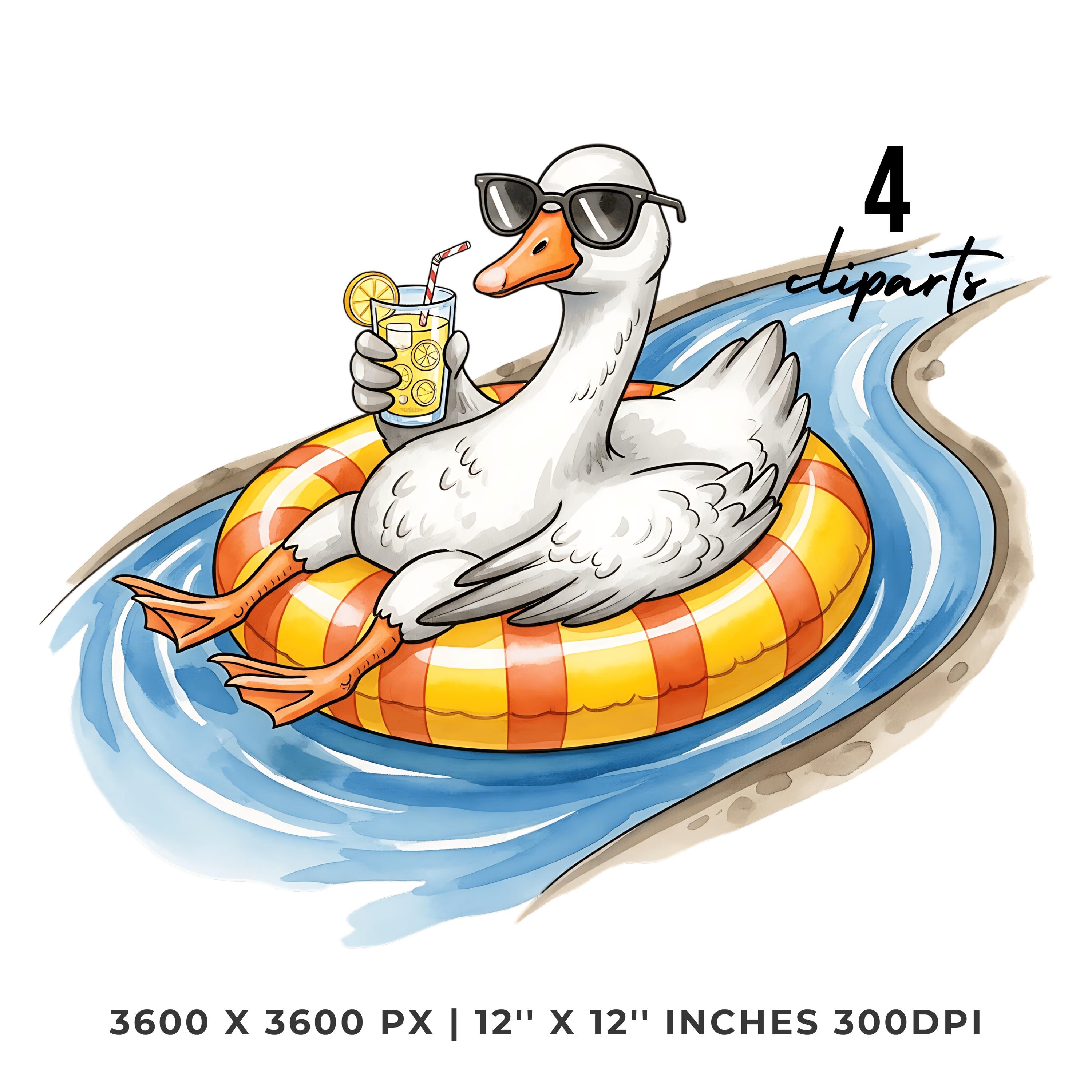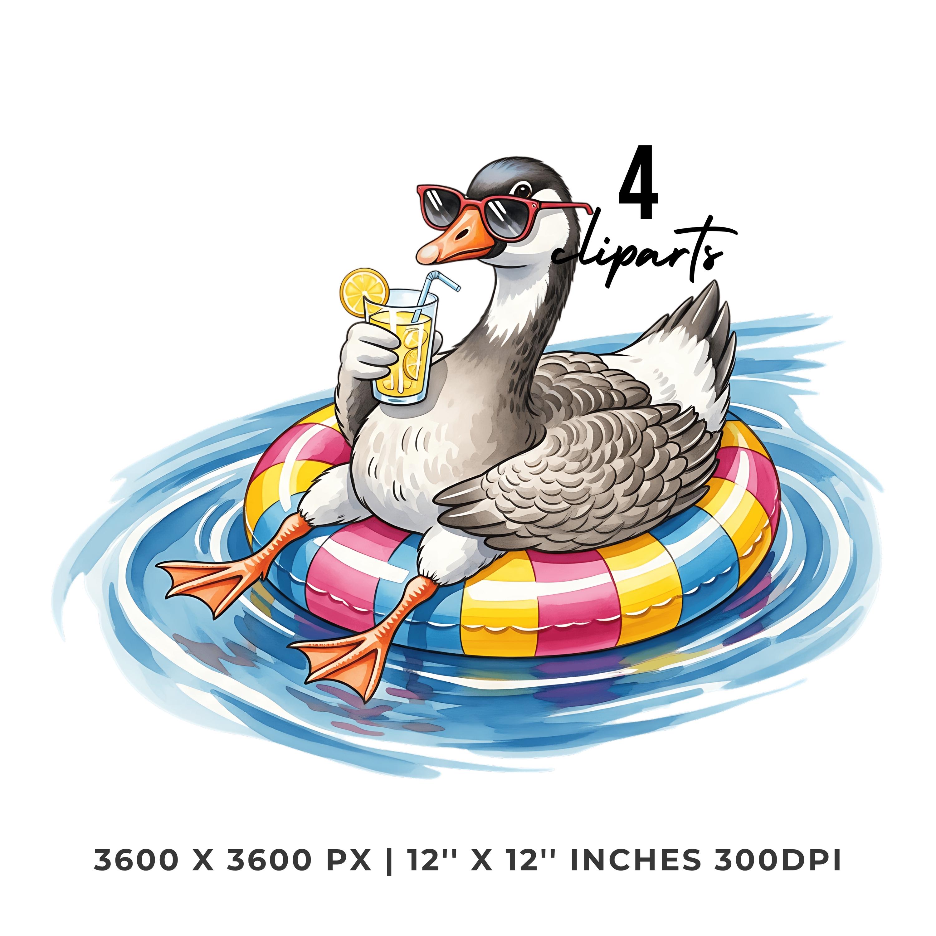 Summer Goose Clipart PNG | 4 Watercolor Goose floating down a lazy river on an inflatable tube with sunglasses and lemonade | Commercial Use is an eye-catching, high-resolution digital asset designed for creators, crafters, teachers, and small business owners looking to elevate their visuals.
