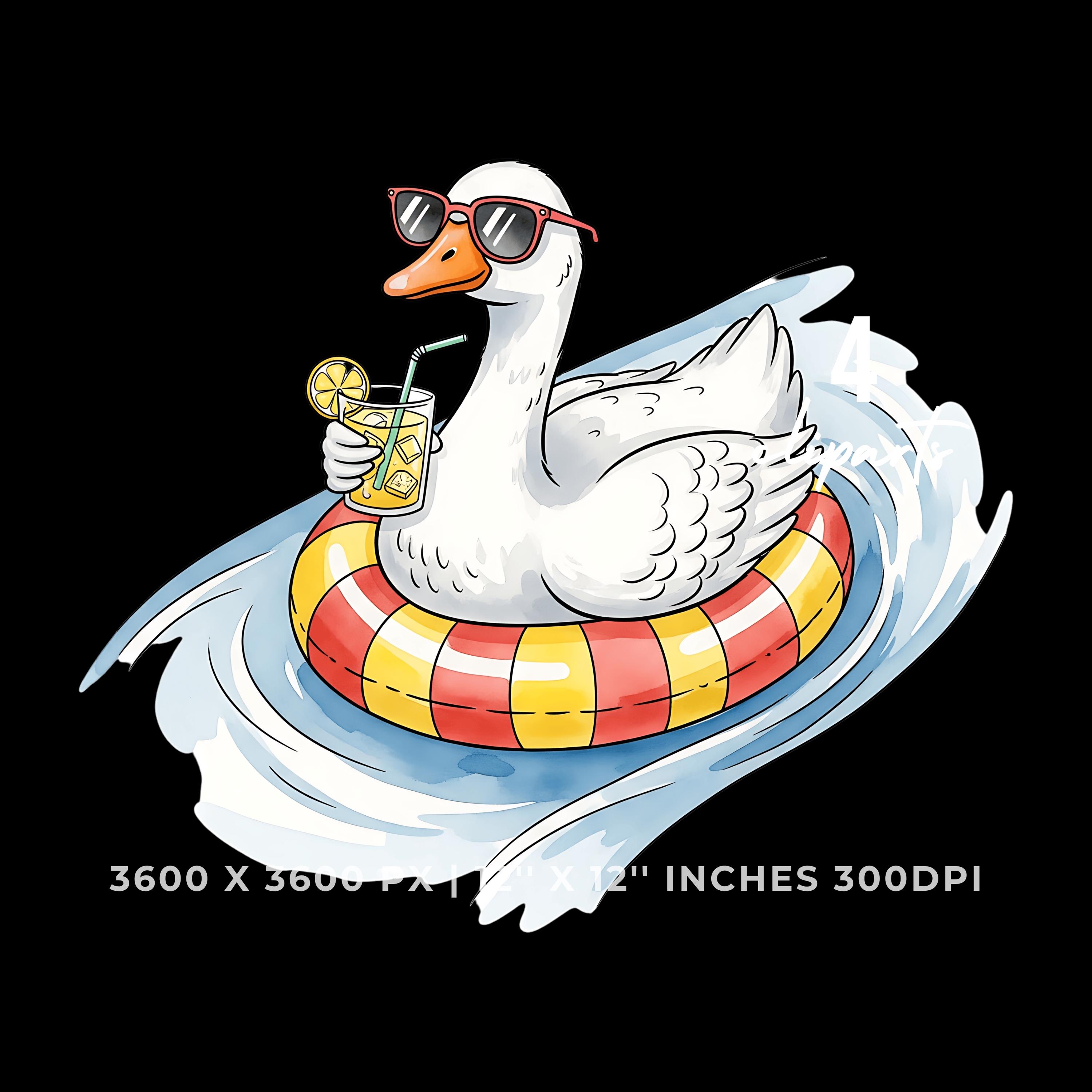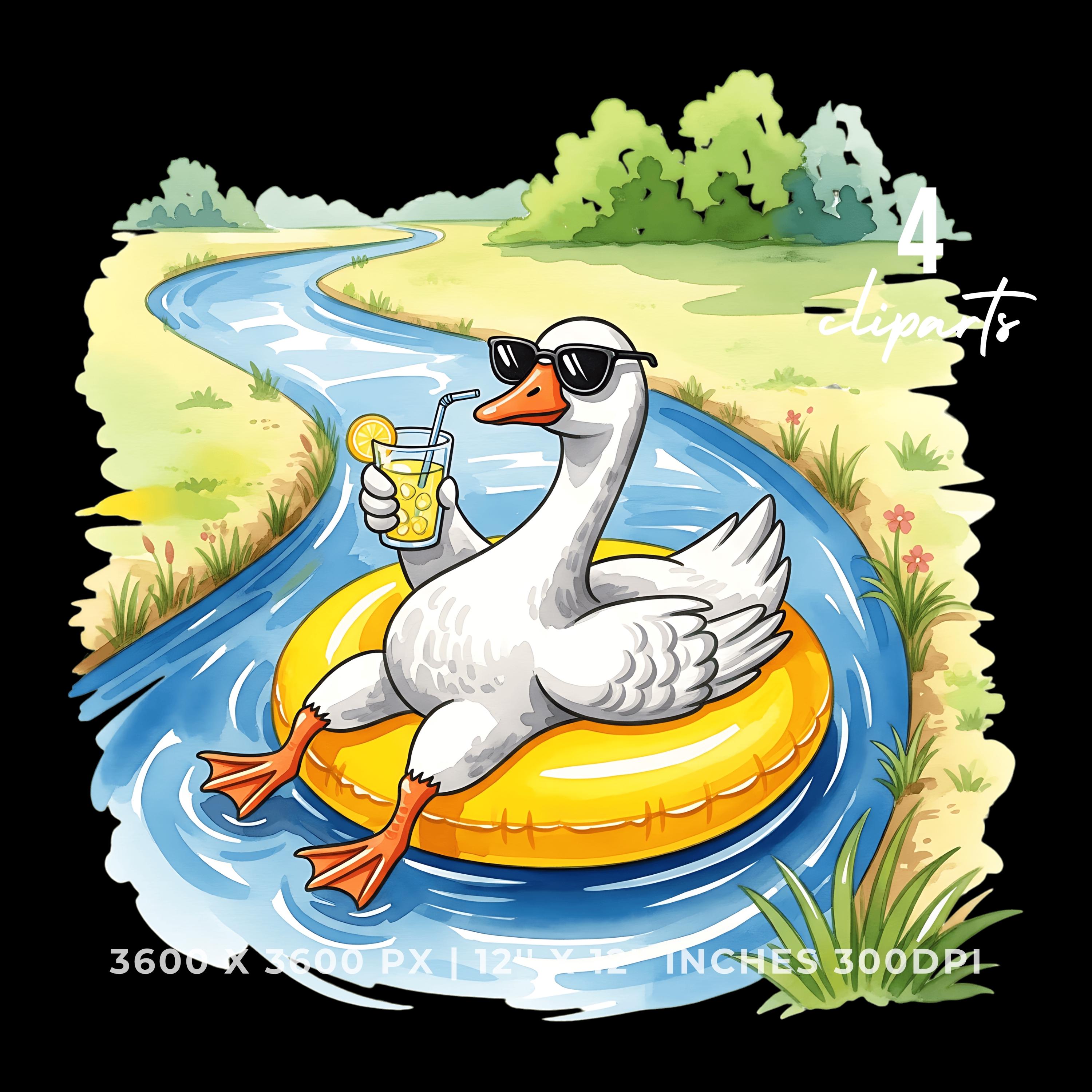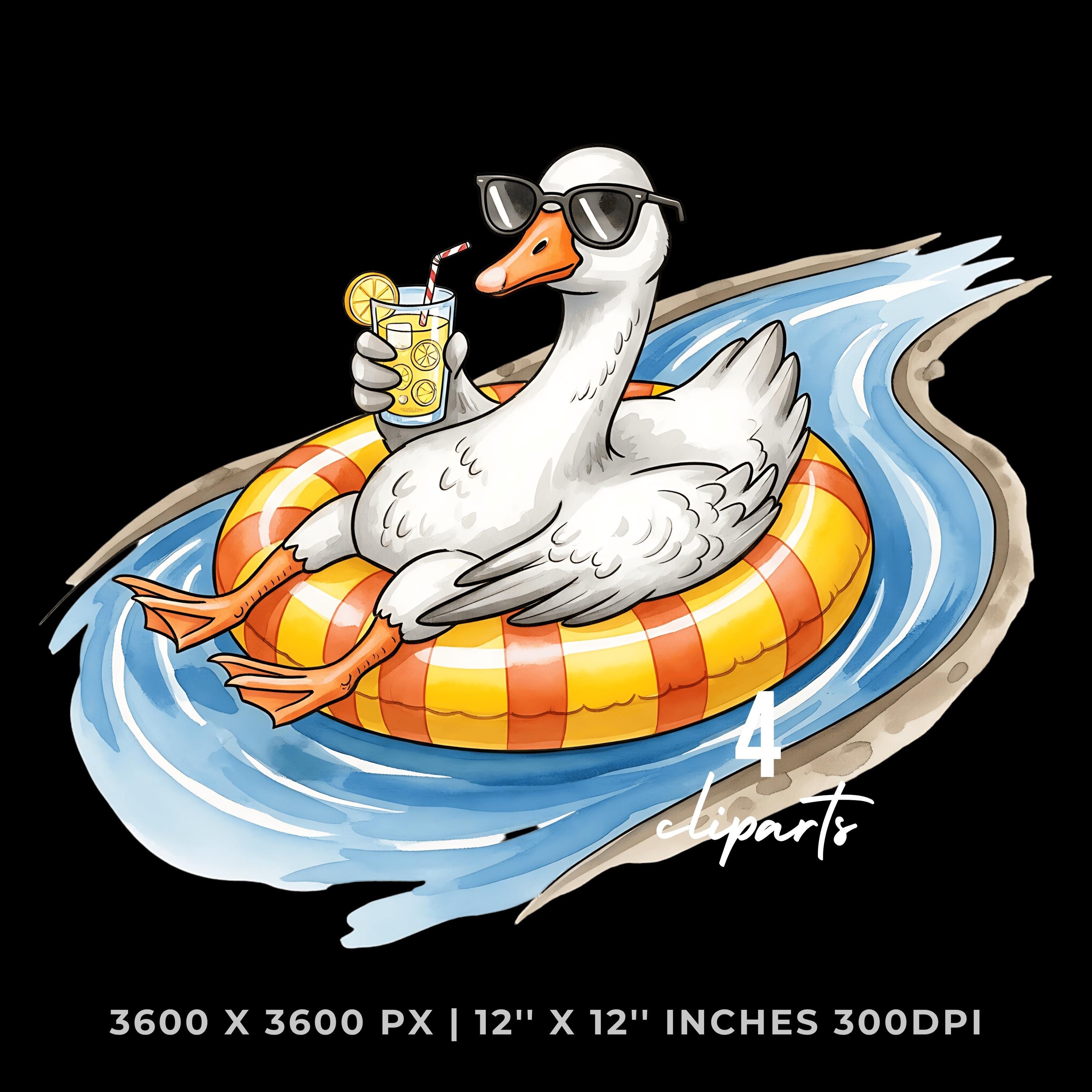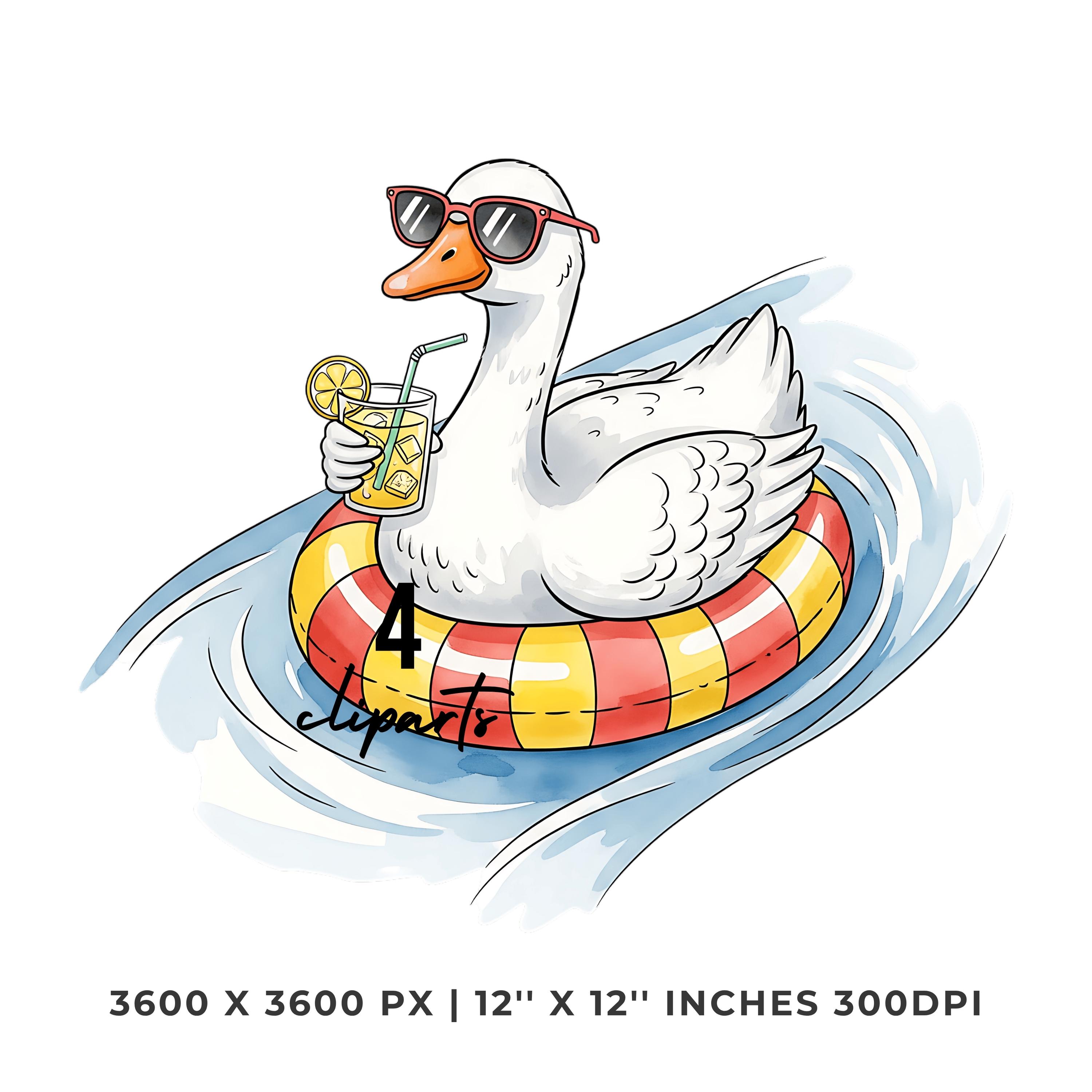 Summer Goose Clipart PNG | 4 Watercolor Goose floating down a lazy river on an inflatable tube with sunglasses and lemonade | Commercial Use is an eye-catching, high-resolution digital asset designed for creators, crafters, teachers, and small business owners looking to elevate their visuals.