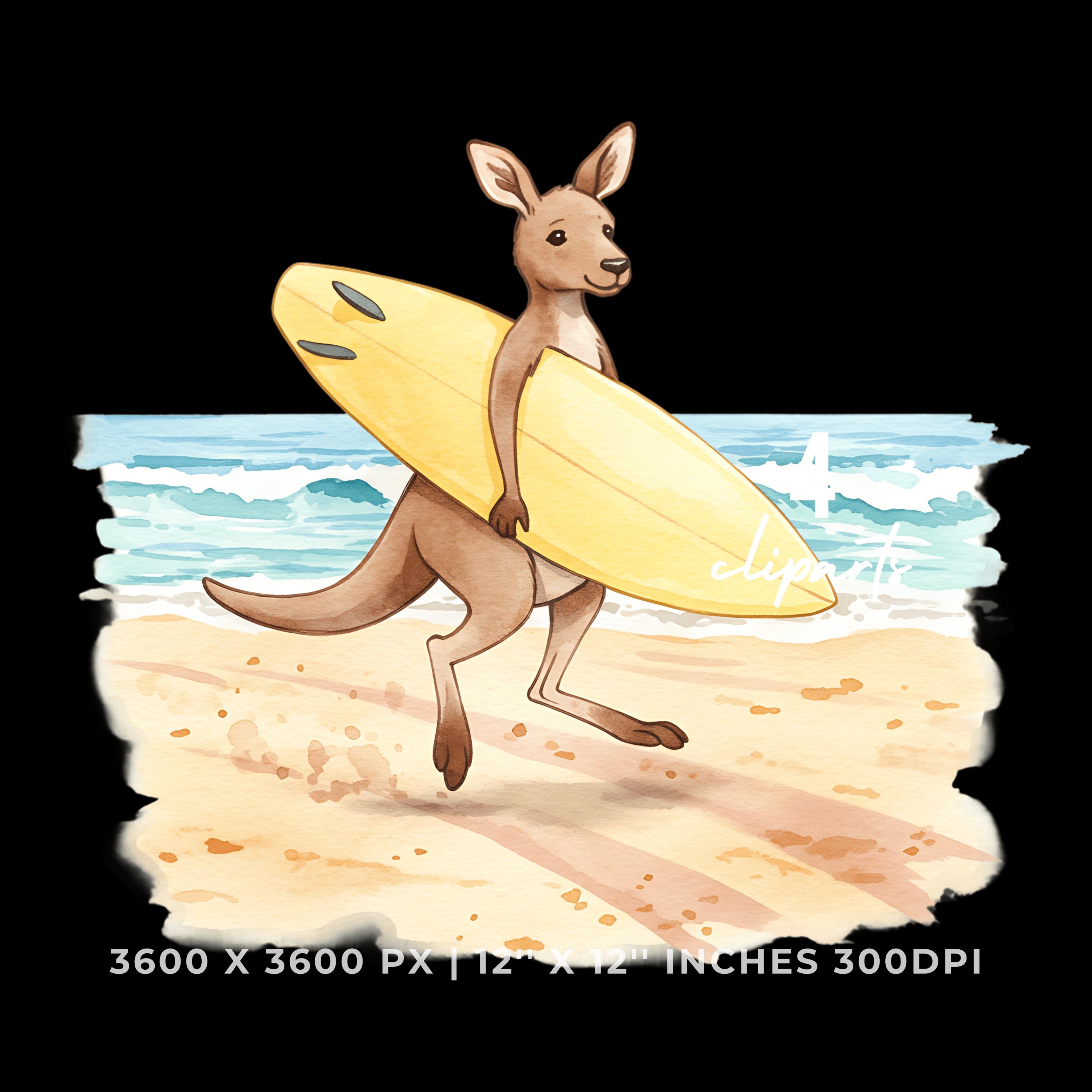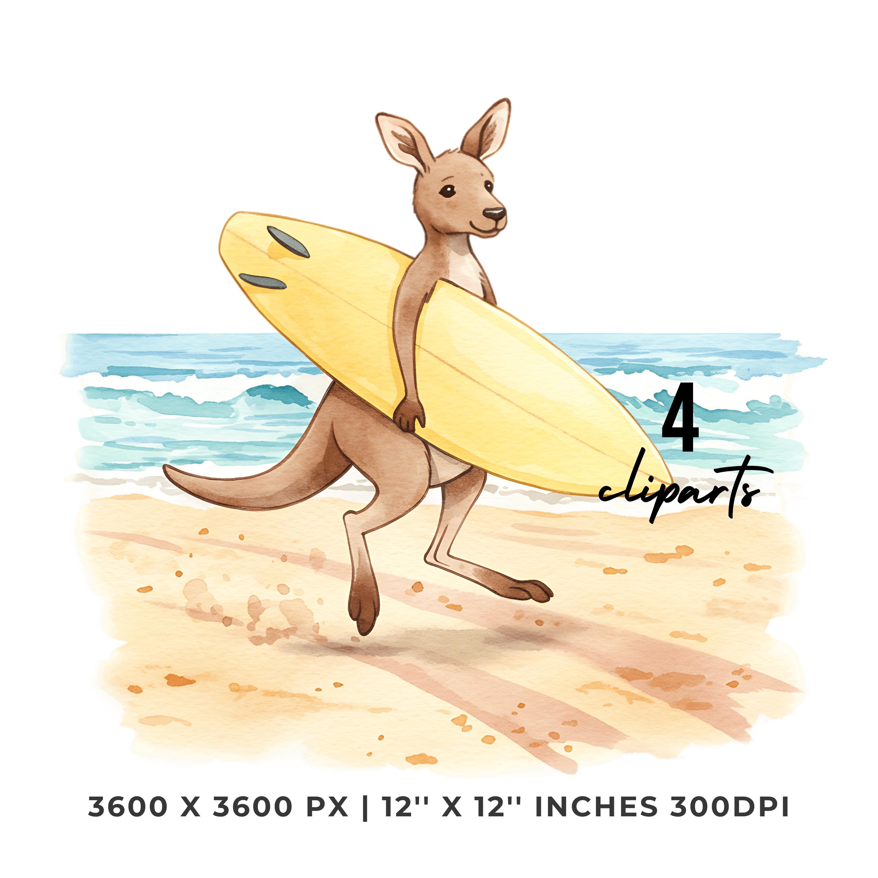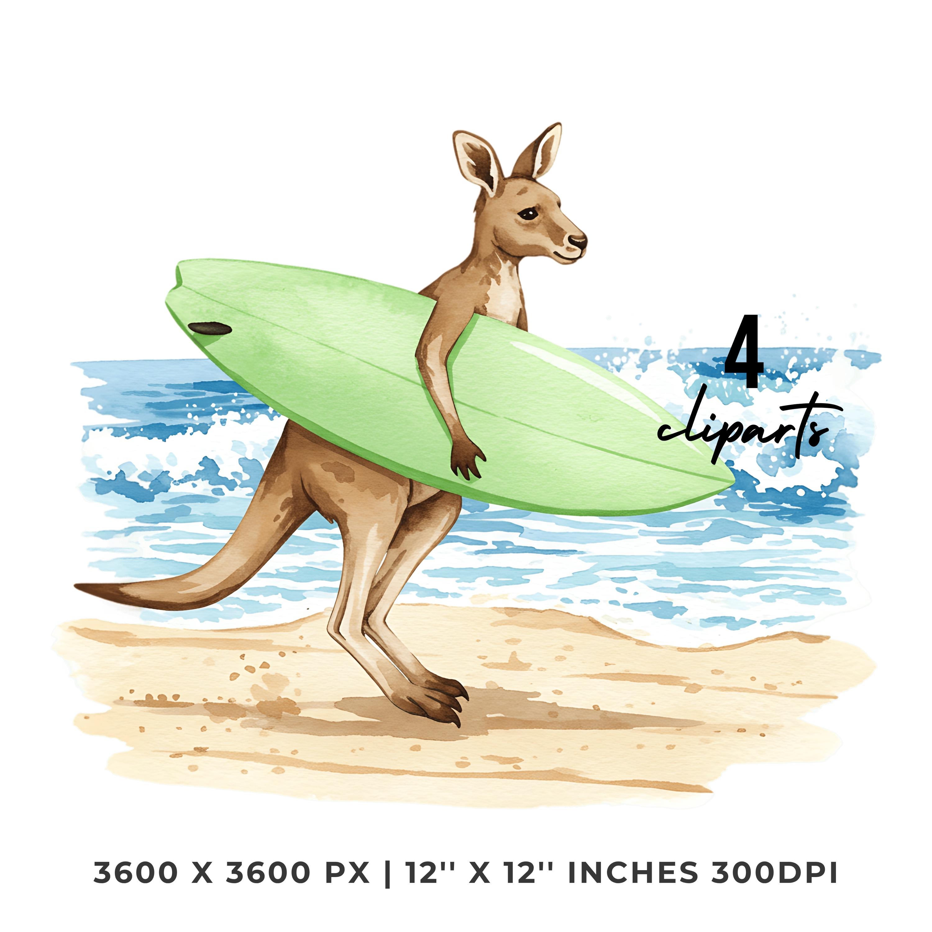 Summer Kangaroo Clipart PNG | 4 Watercolor Kangaroo Bouncing on Dusty Trail Carrying a Surfboard toward Waves | Sublimation Commercial Use is an eye-catching, high-resolution digital asset designed for creators, crafters, teachers, and small business owners looking to elevate their visuals.