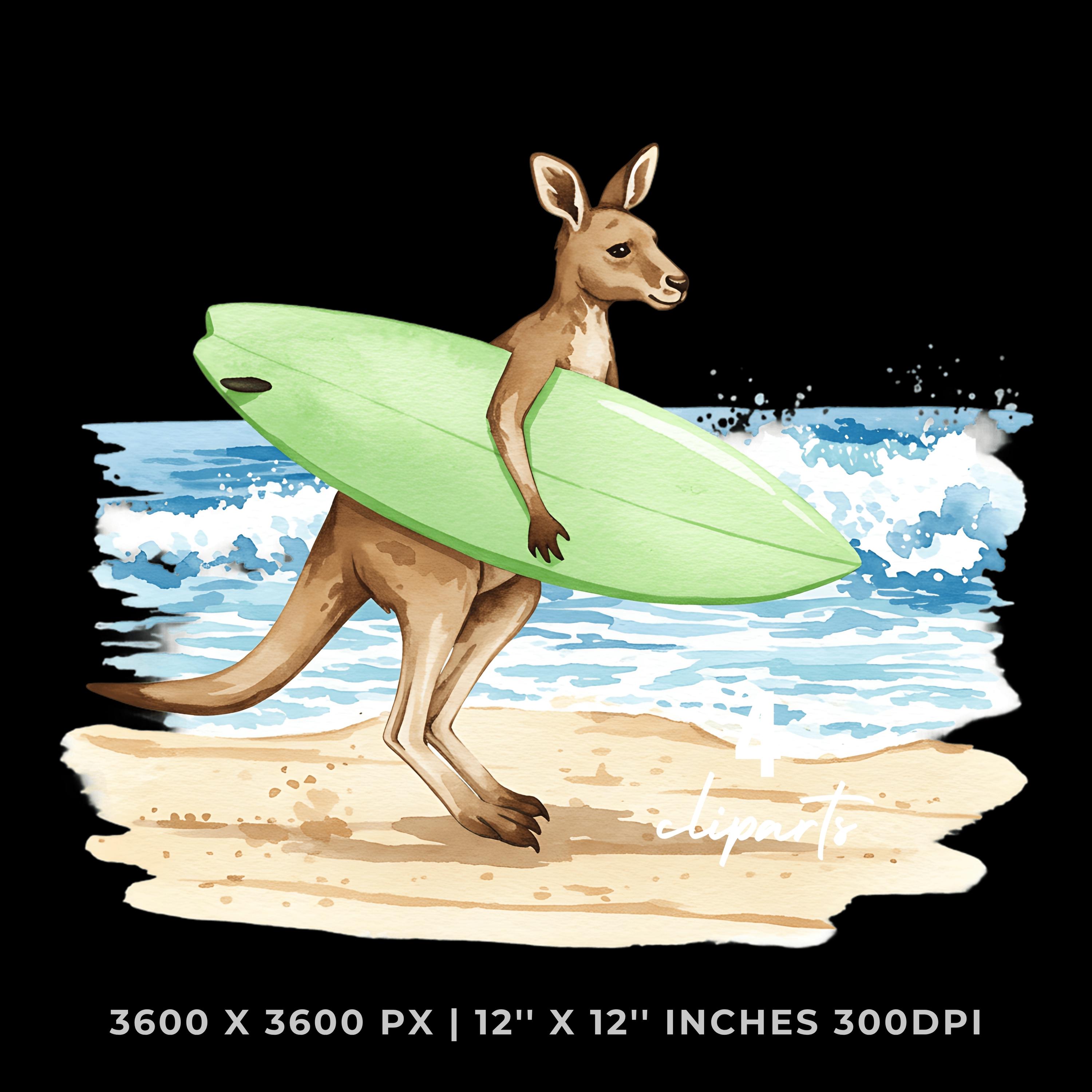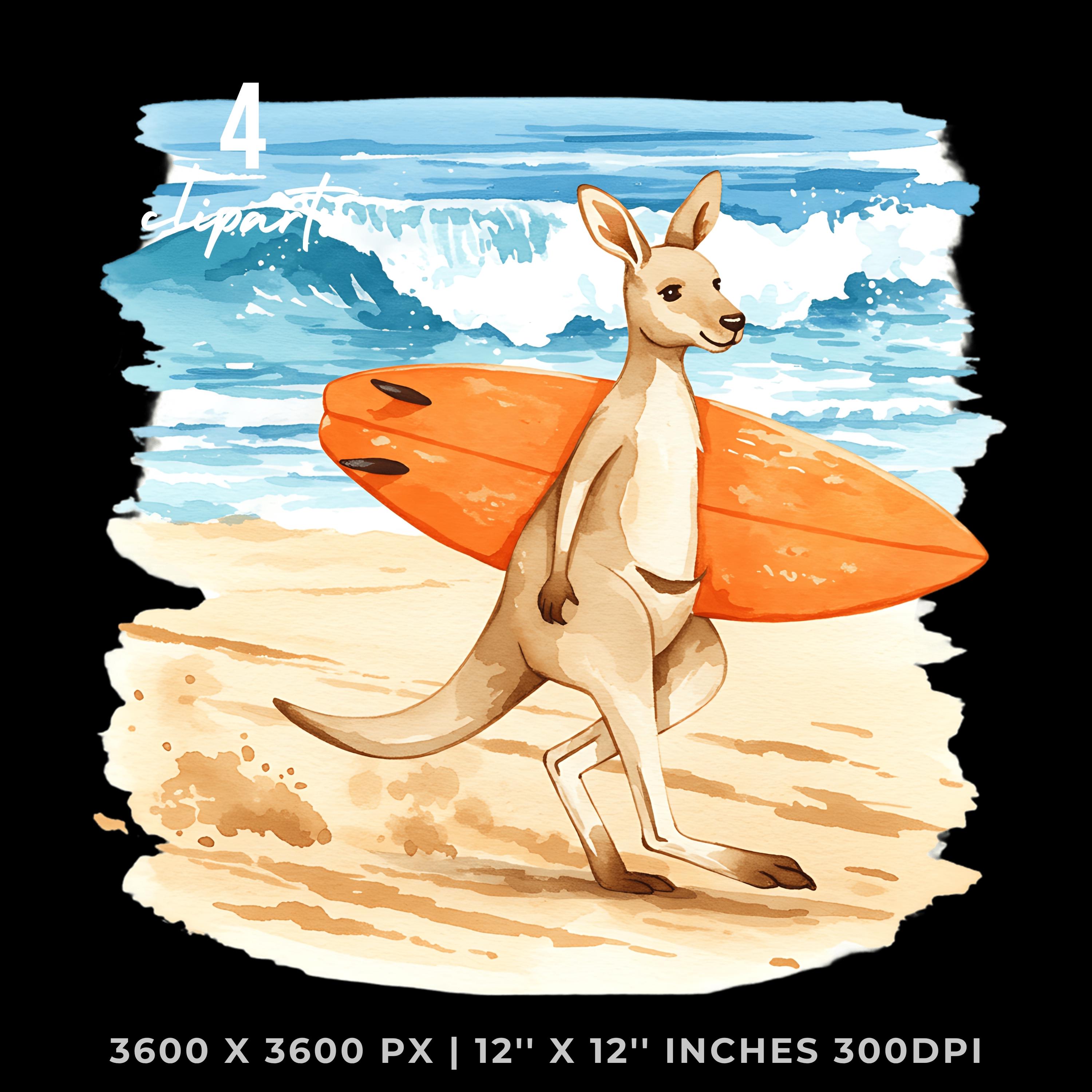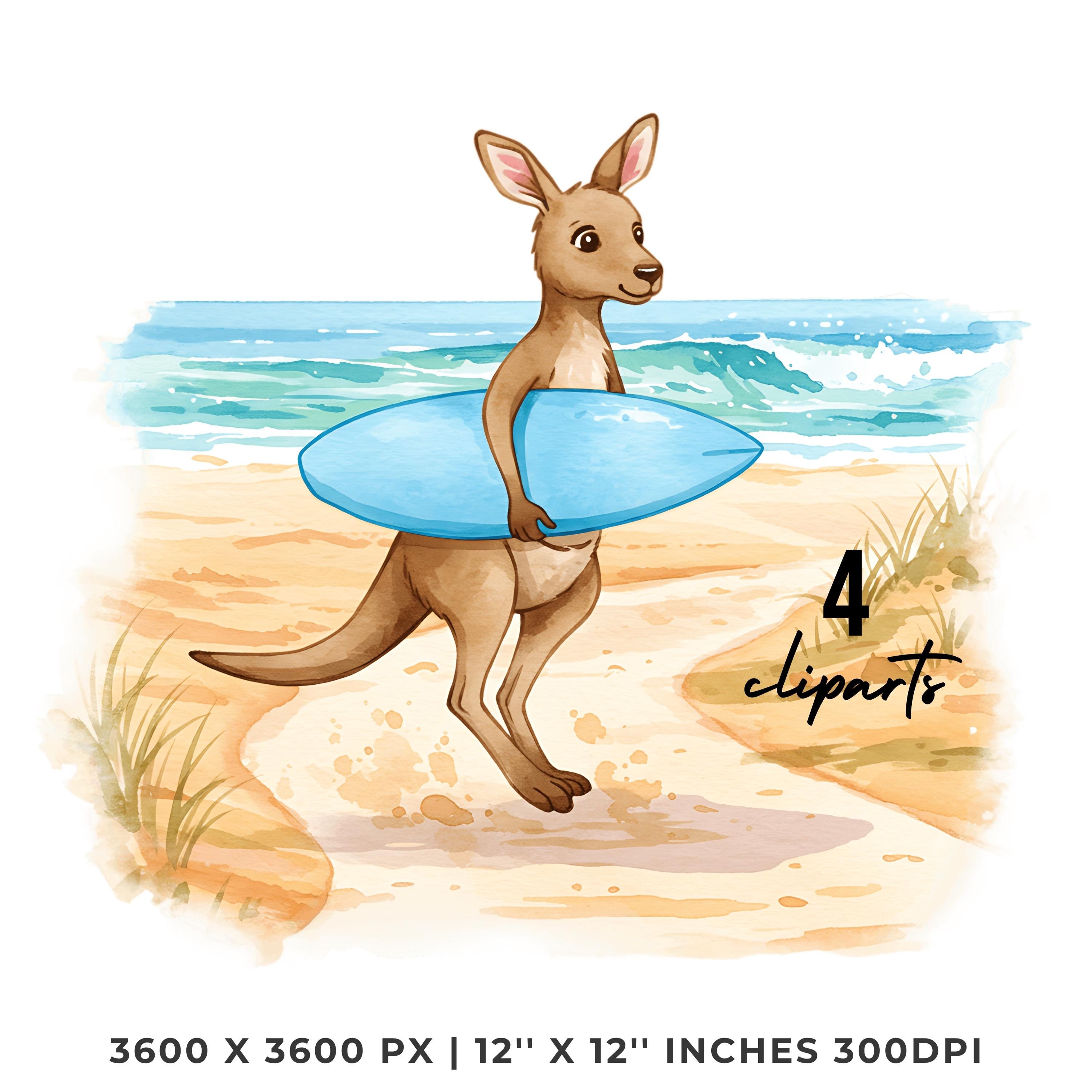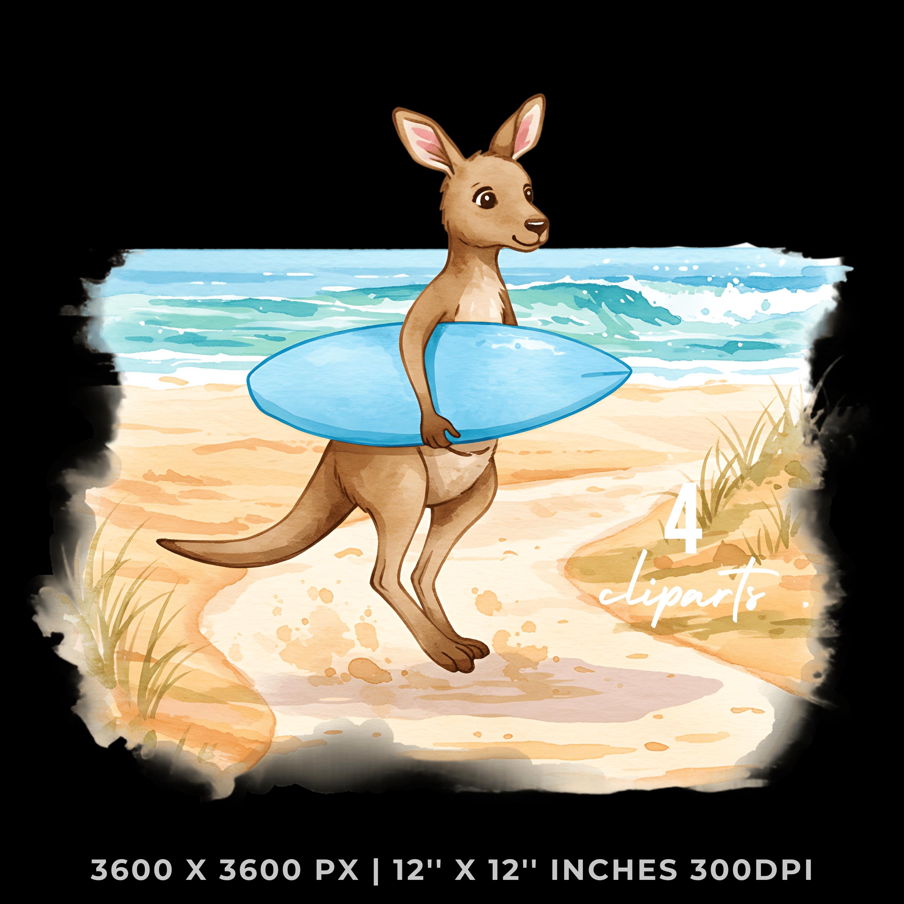Summer Kangaroo Clipart PNG | 4 Watercolor Kangaroo Bouncing on Dusty Trail Carrying a Surfboard toward Waves | Sublimation Commercial Use is an eye-catching, high-resolution digital asset designed for creators, crafters, teachers, and small business owners looking to elevate their visuals.
