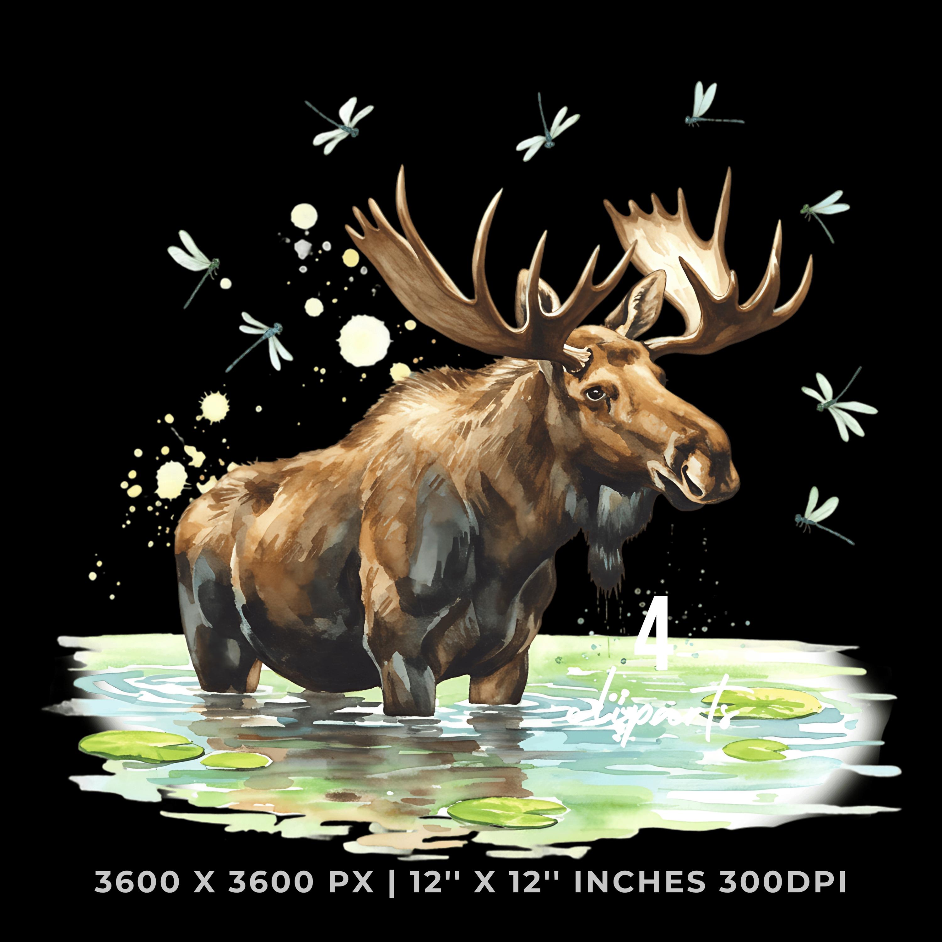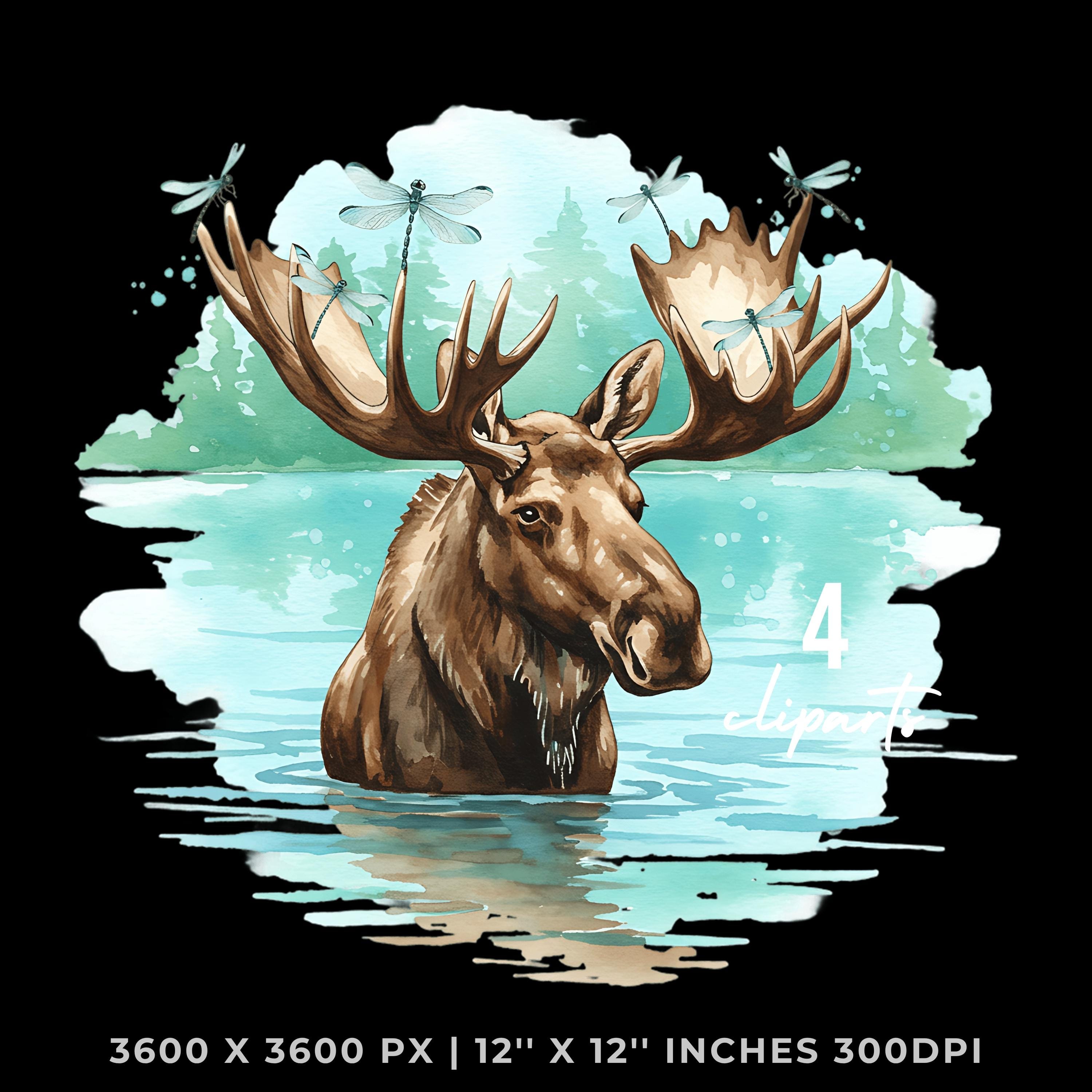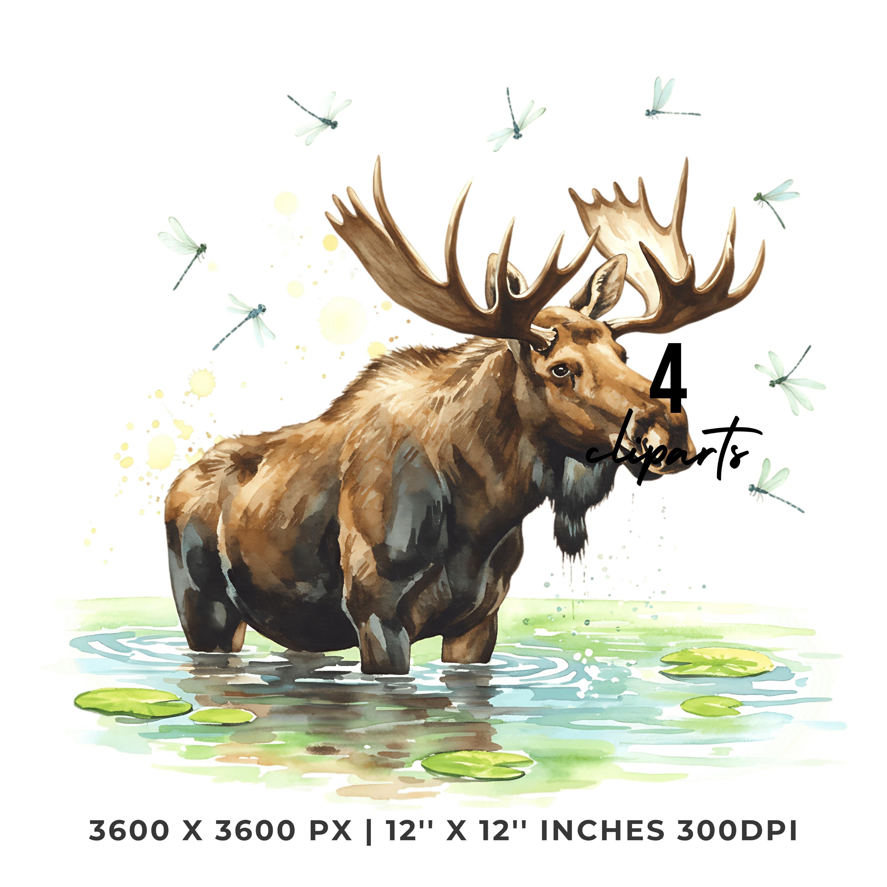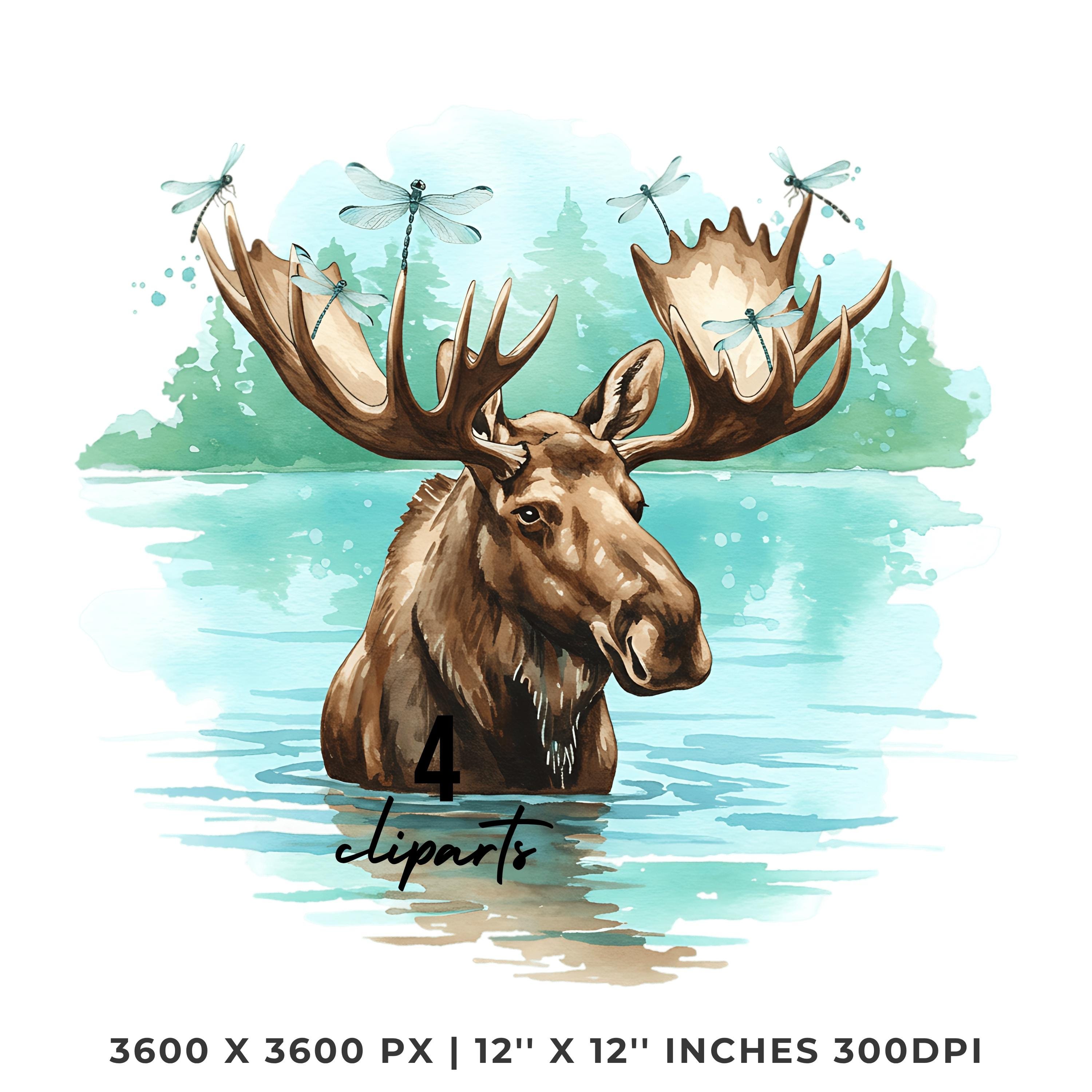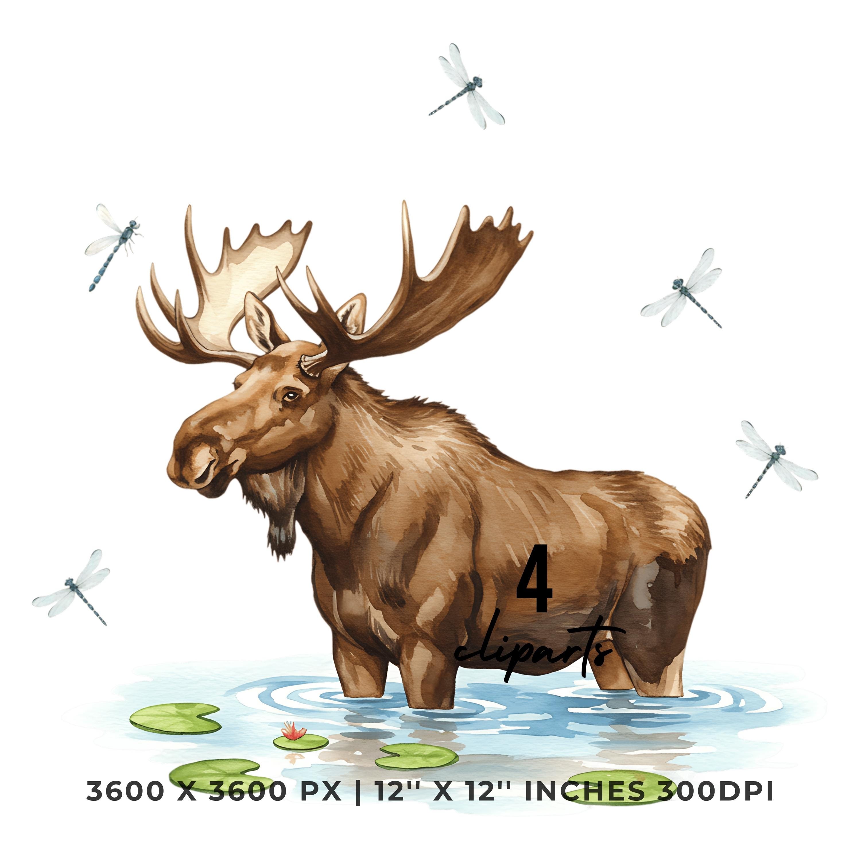 Summer Moose Clipart PNG | 4 Watercolor Moose wading through a summer lake while dragonflies buzz around | Sublimation Commercial Use is an eye-catching, high-resolution digital asset designed for creators, crafters, teachers, and small business owners looking to elevate their visuals.