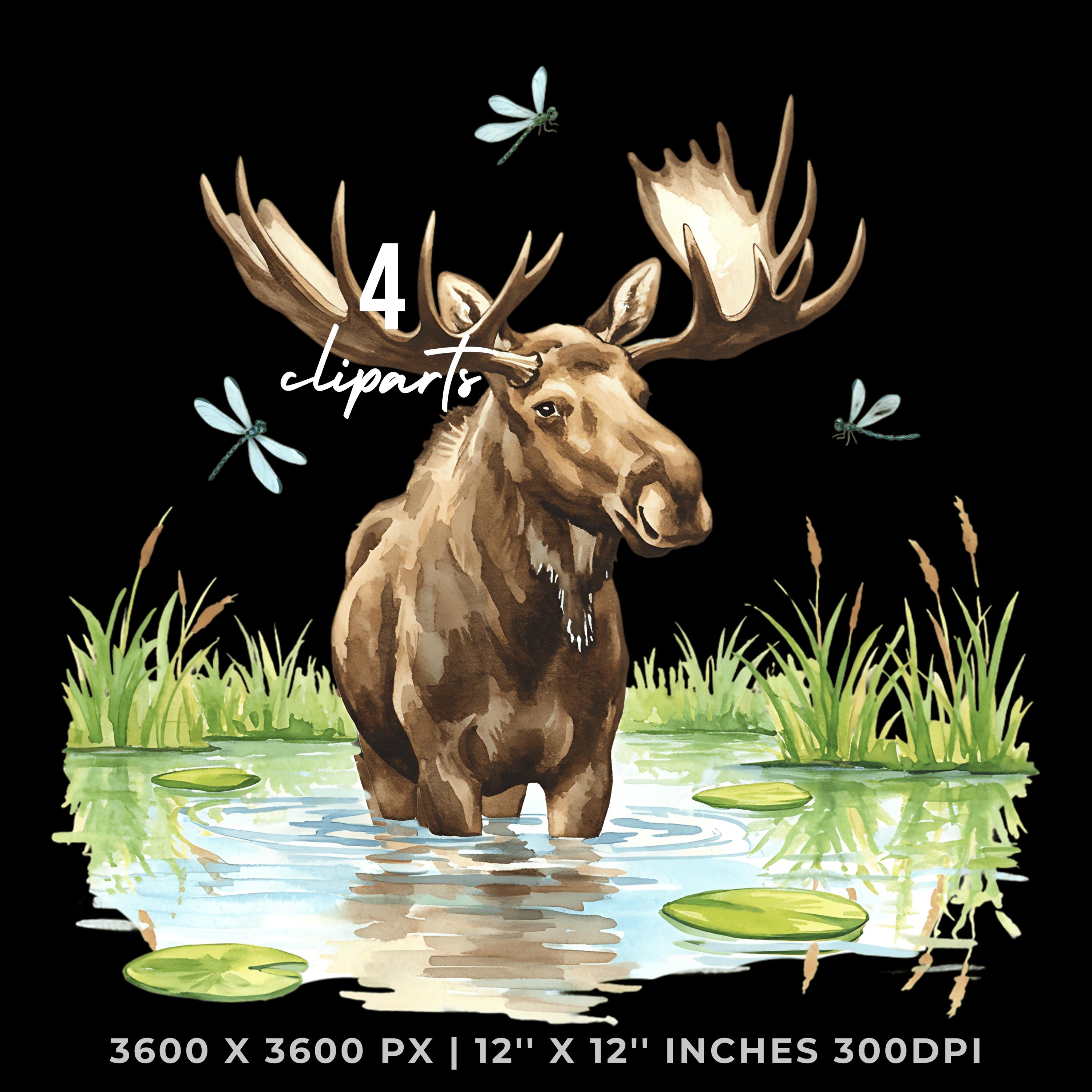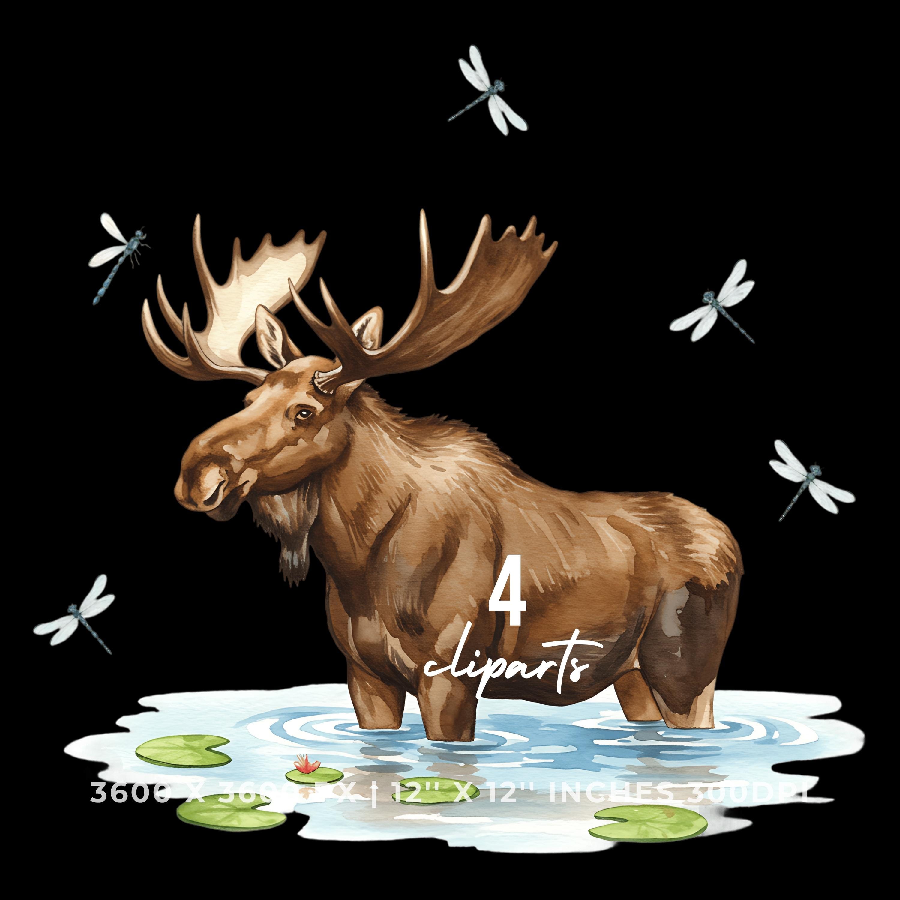 Summer Moose Clipart PNG | 4 Watercolor Moose wading through a summer lake while dragonflies buzz around | Sublimation Transparent Commercial Use