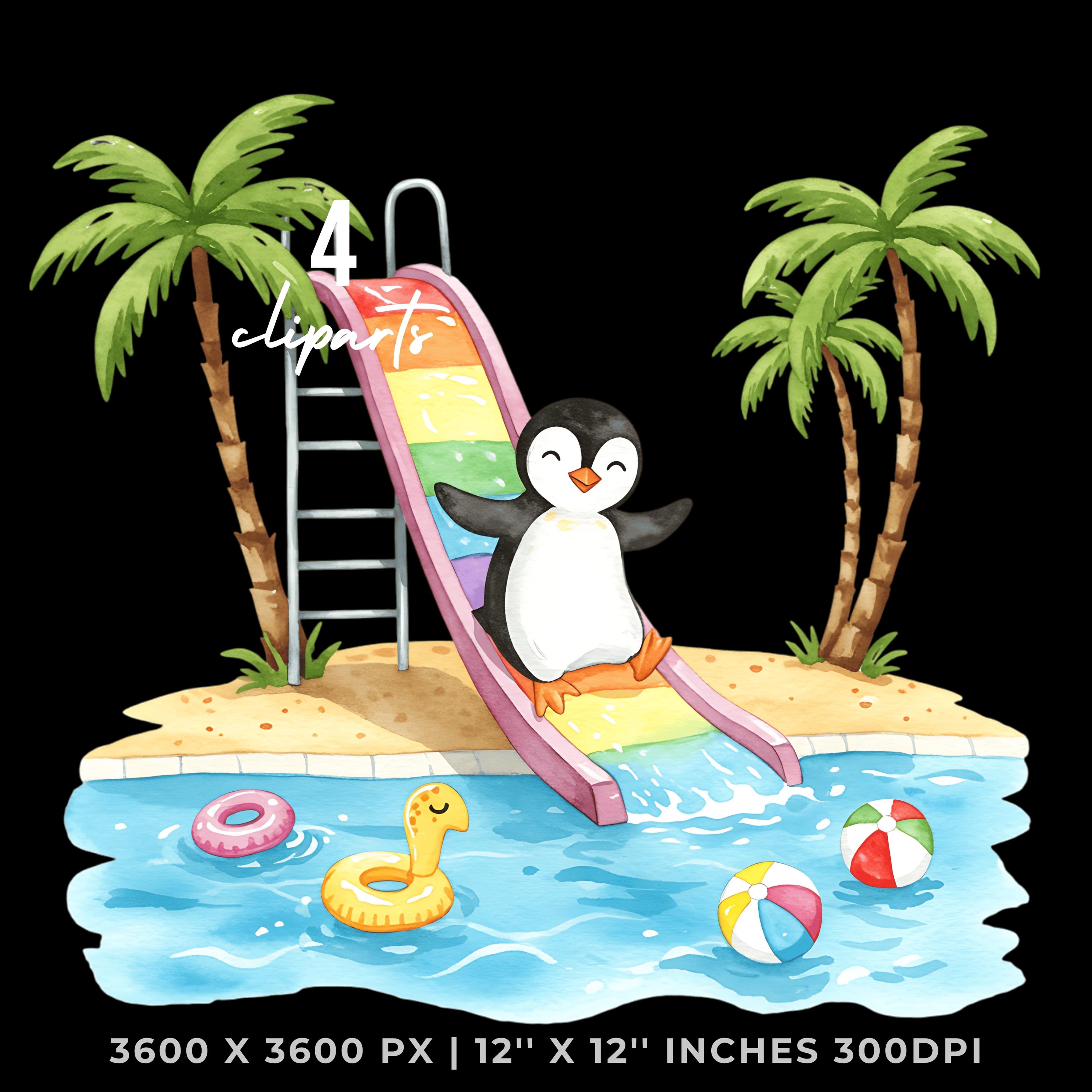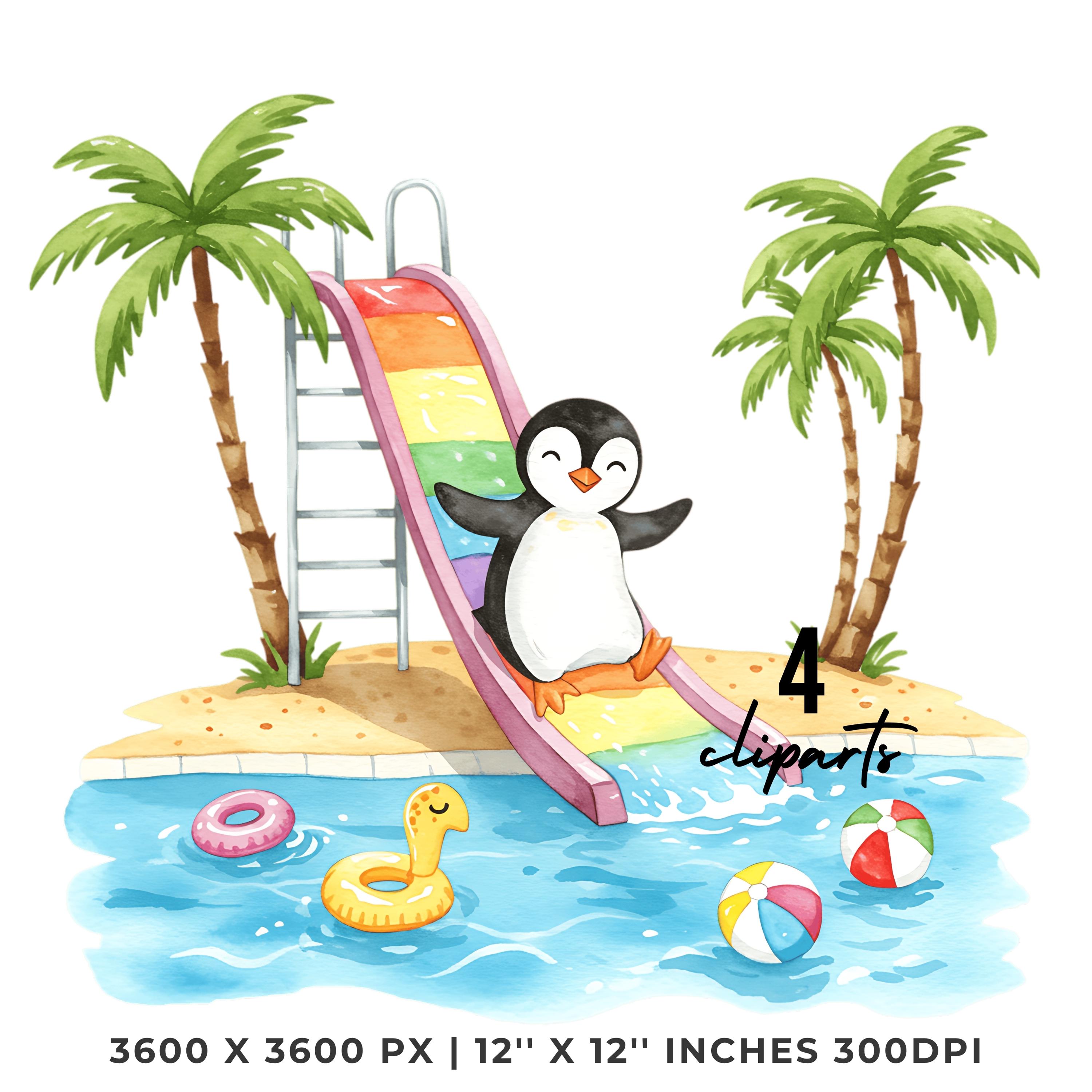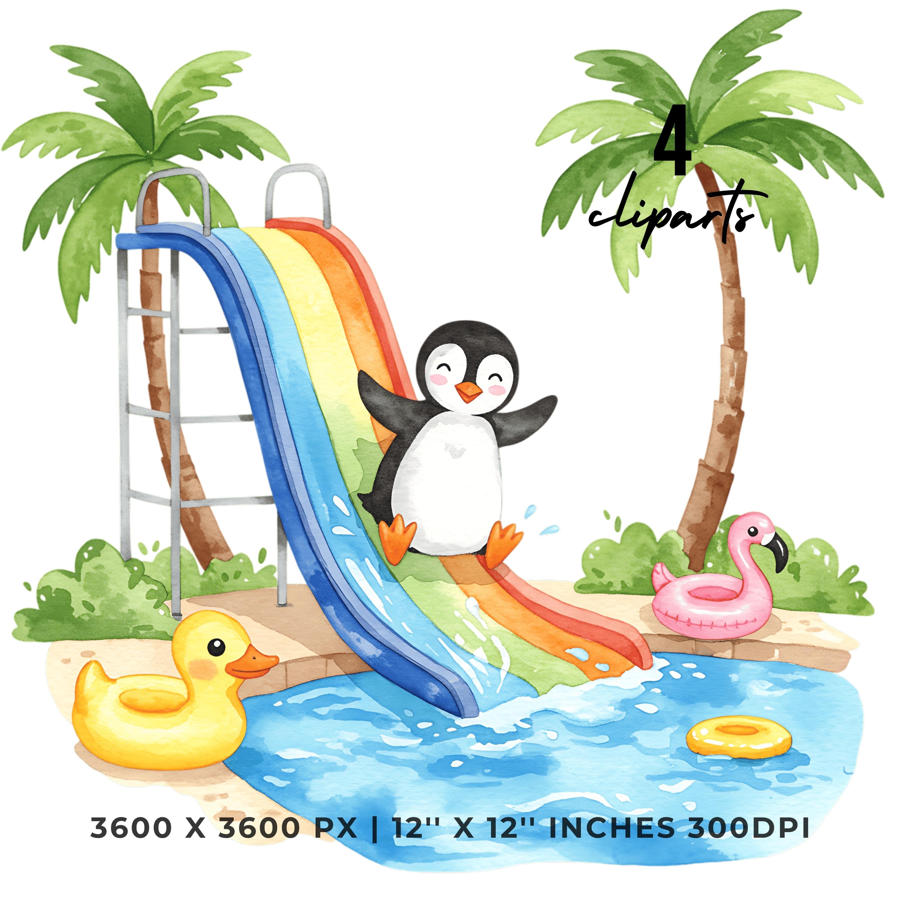 Summer Penguin Clipart PNG | 4 Watercolor Penguin sliding down a water slide into a pool | Sublimation Commercial Use is an eye-catching, high-resolution digital asset designed for creators, crafters, teachers, and small business owners looking to elevate their visuals.