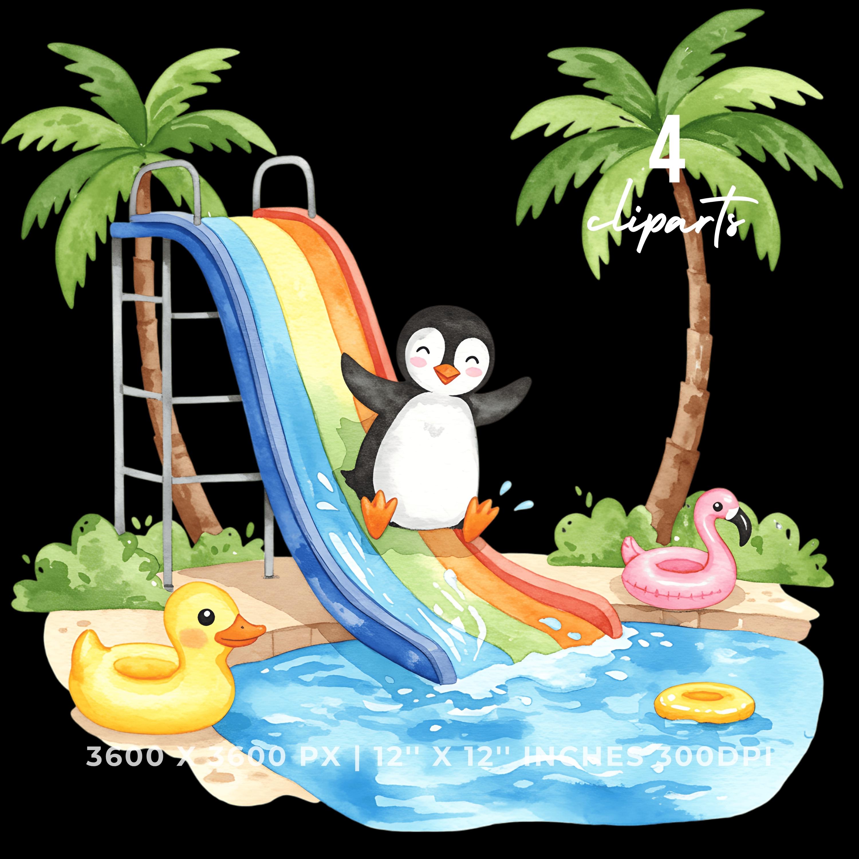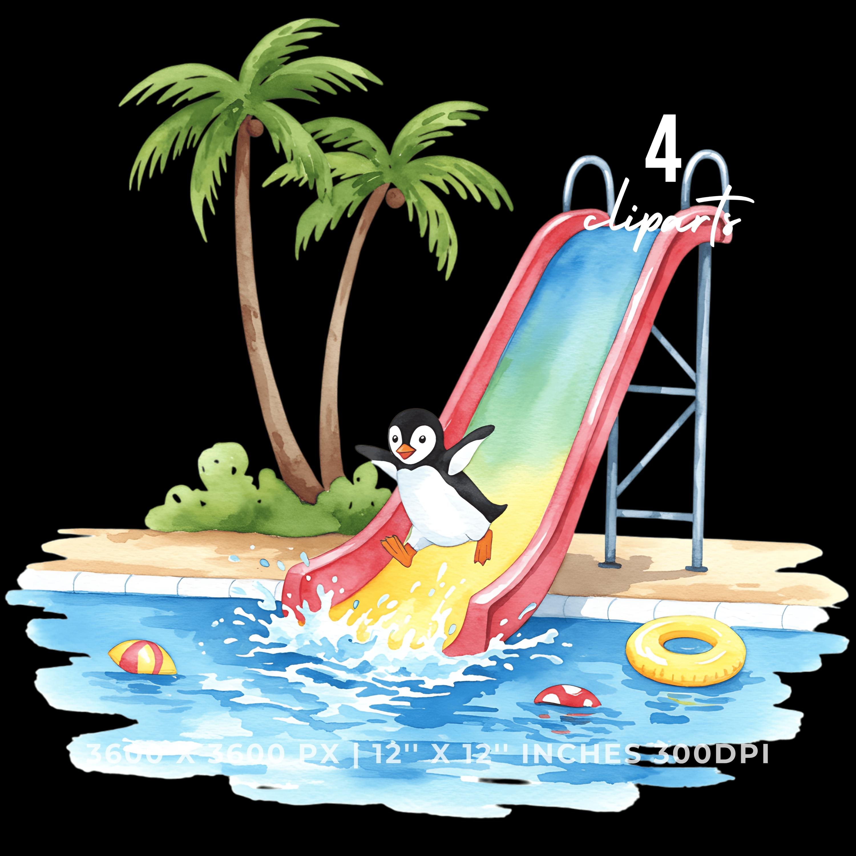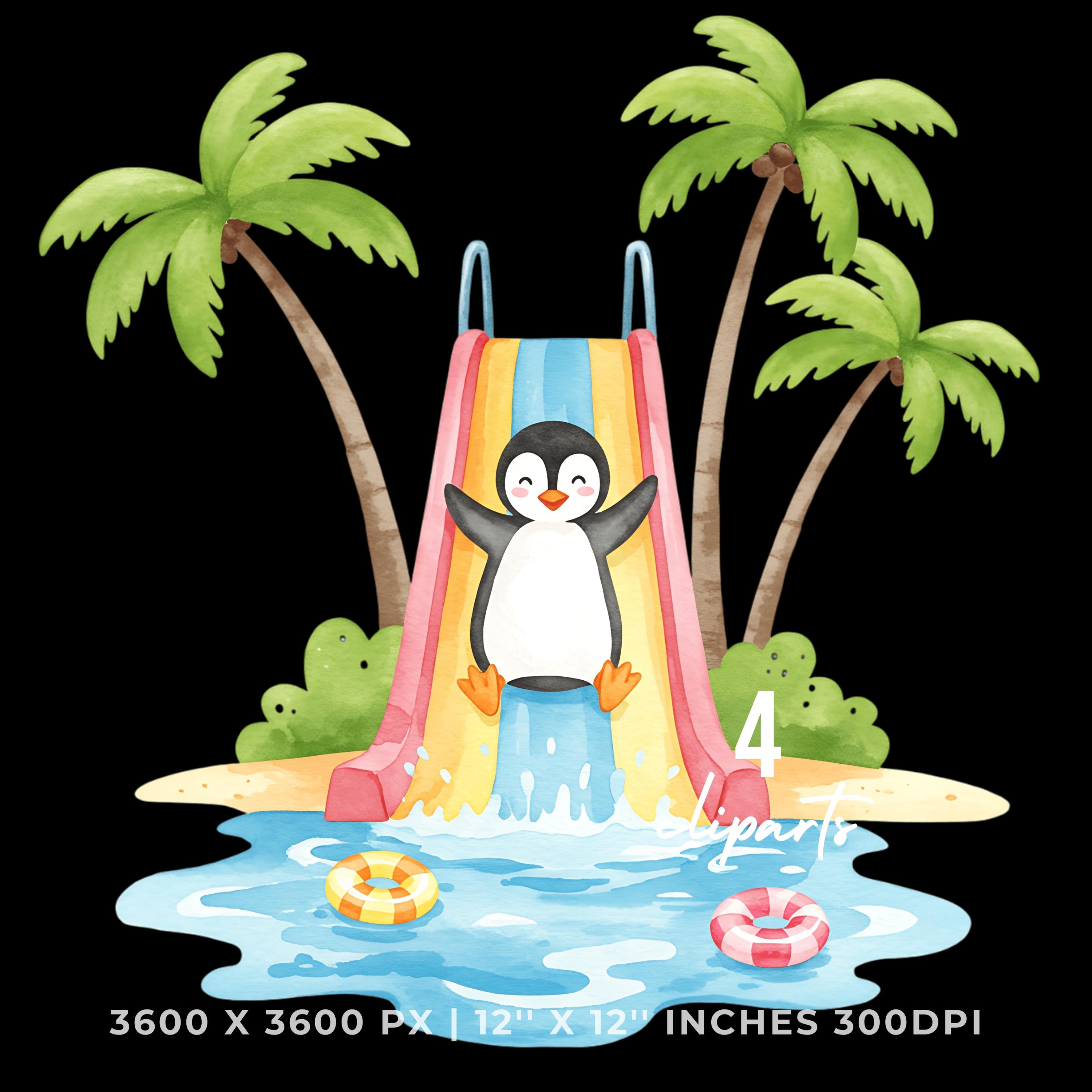 Summer Penguin Clipart PNG | 4 Watercolor Penguin sliding down a water slide into a pool | Sublimation Commercial Use is an eye-catching, high-resolution digital asset designed for creators, crafters, teachers, and small business owners looking to elevate their visuals.