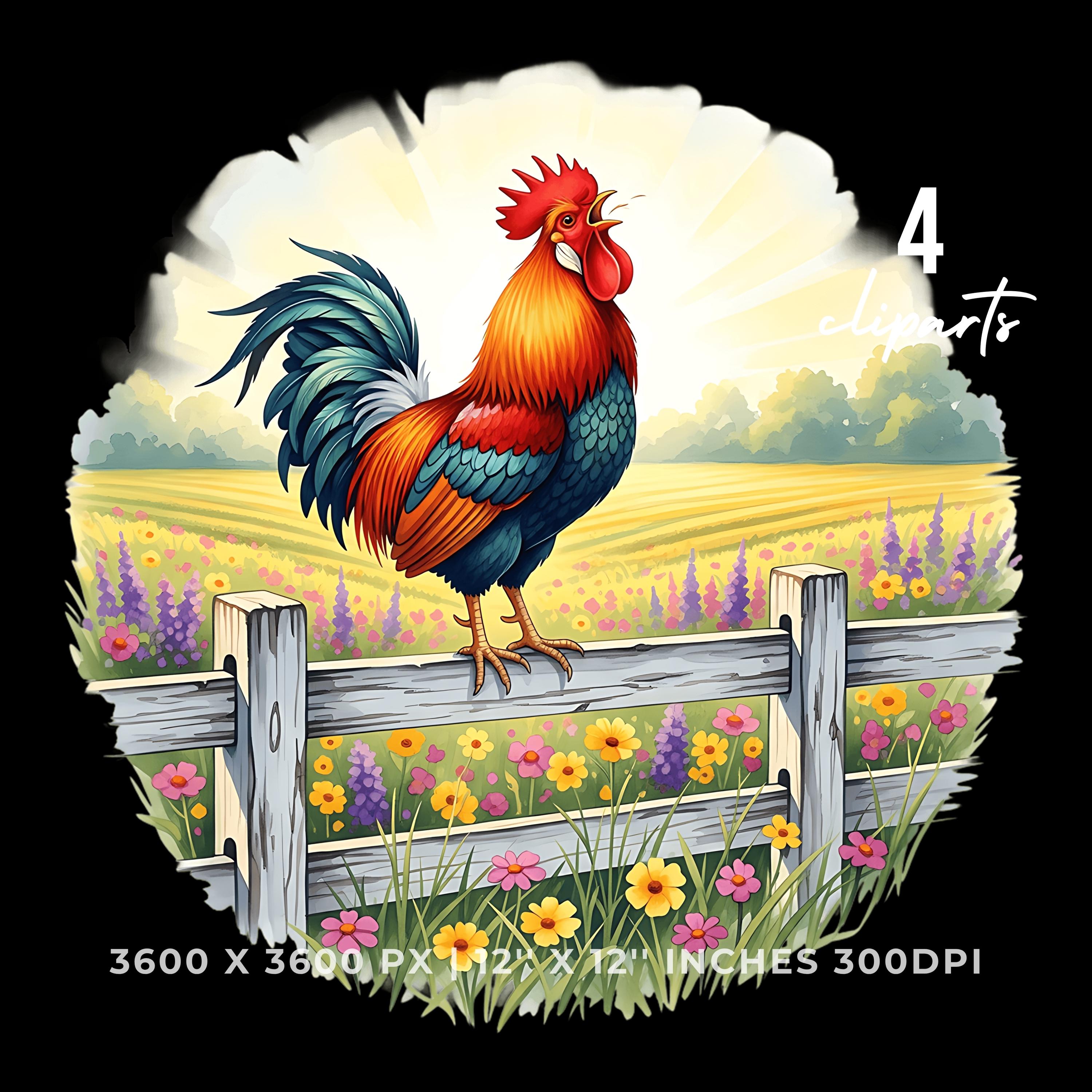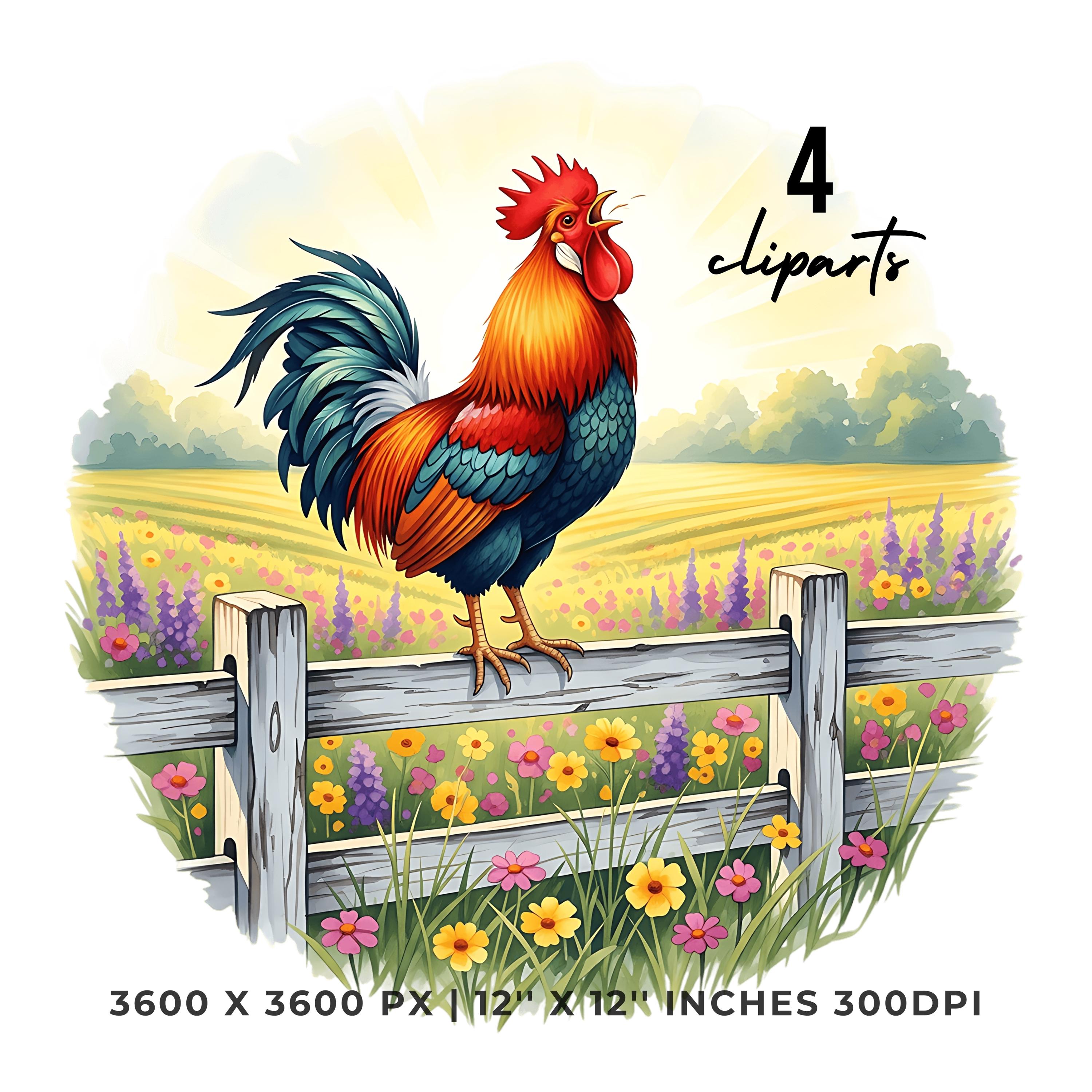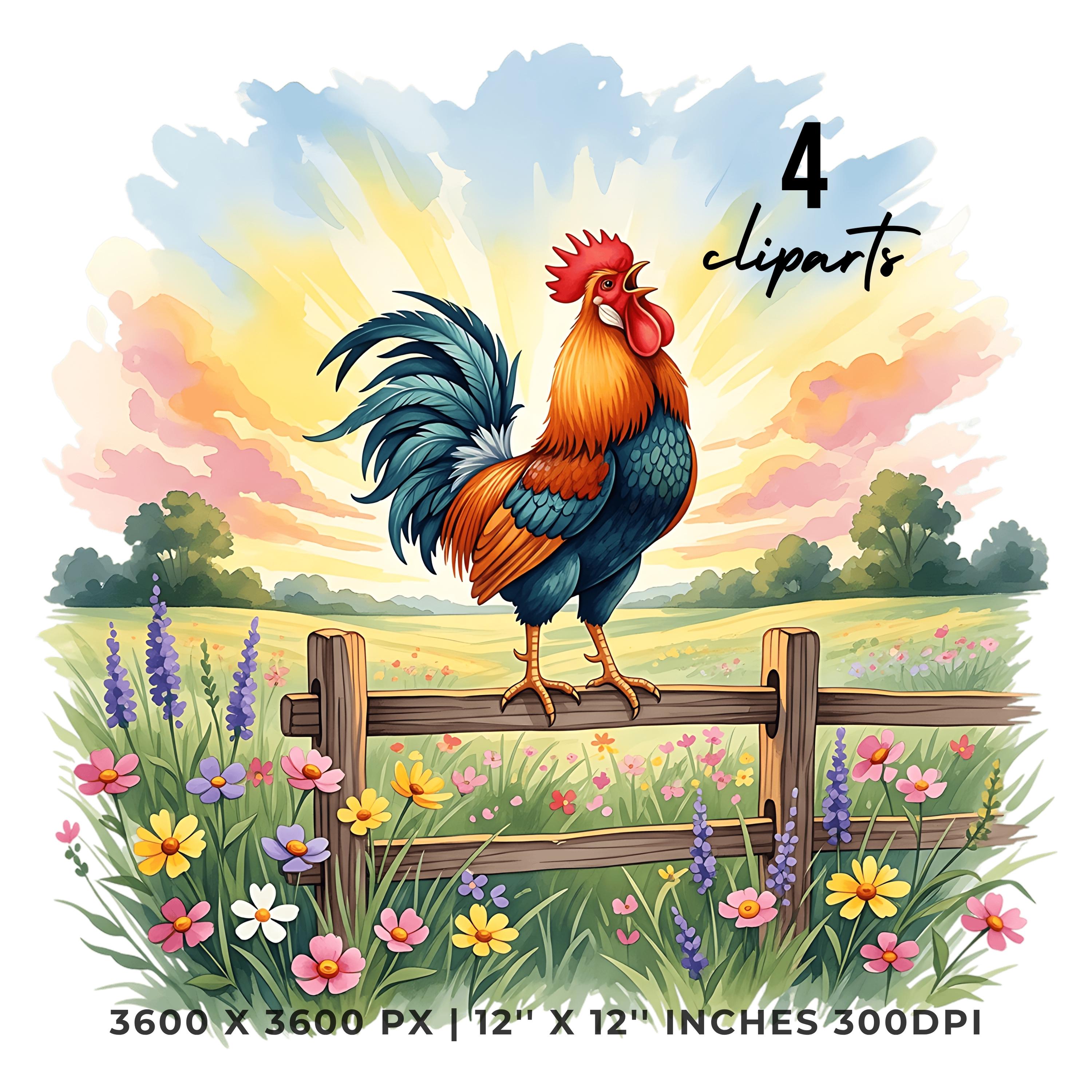 Summer Rooster Clipart PNG | 4 Watercolor Rooster Crowing at Sunrise on a Farmhouse Fence, in Summer Fields | Sublimation Commercial Use is an eye-catching, high-resolution digital asset designed for creators, crafters, teachers, and small business owners looking to elevate their visuals.