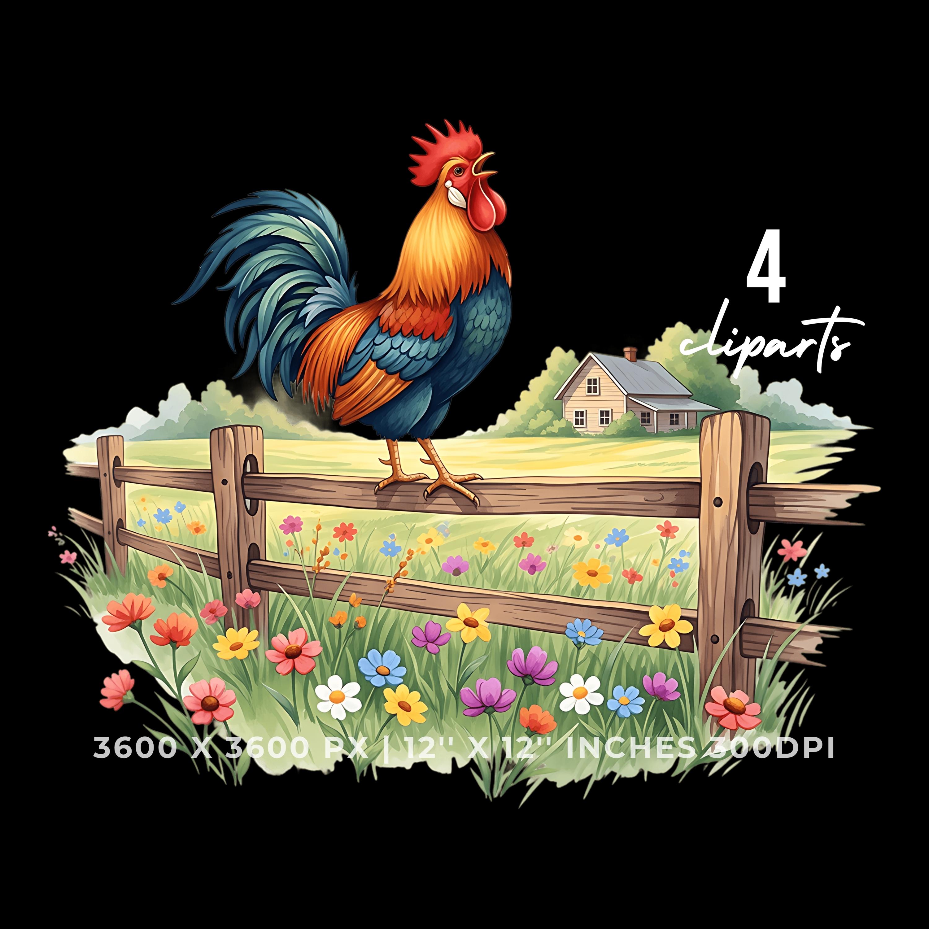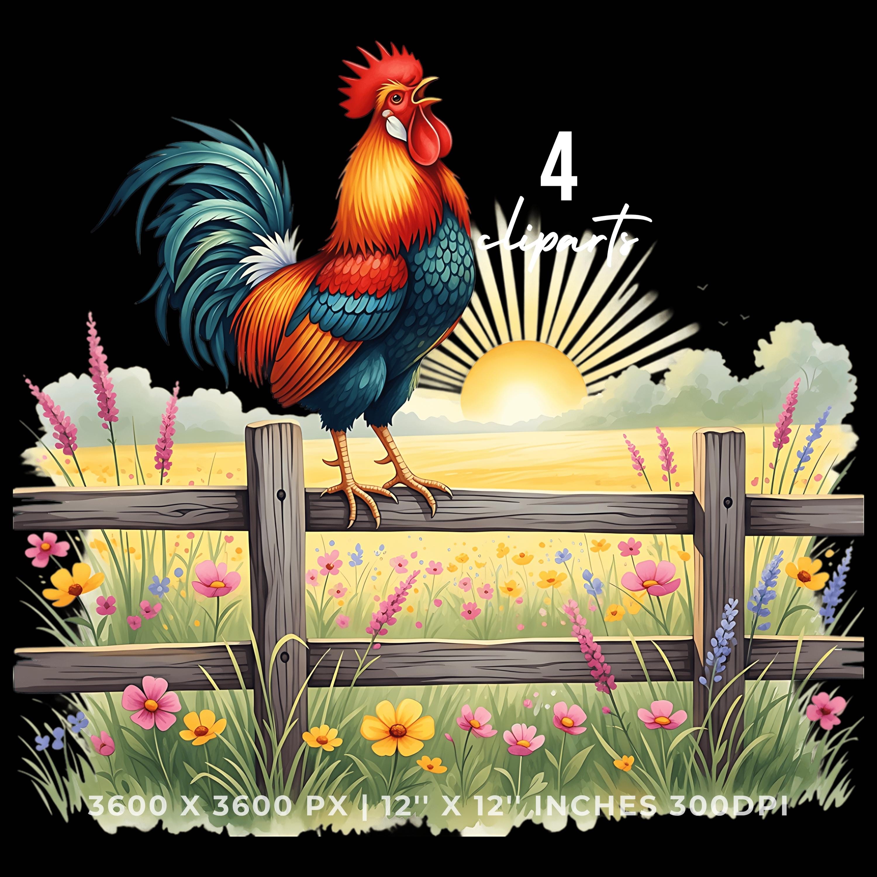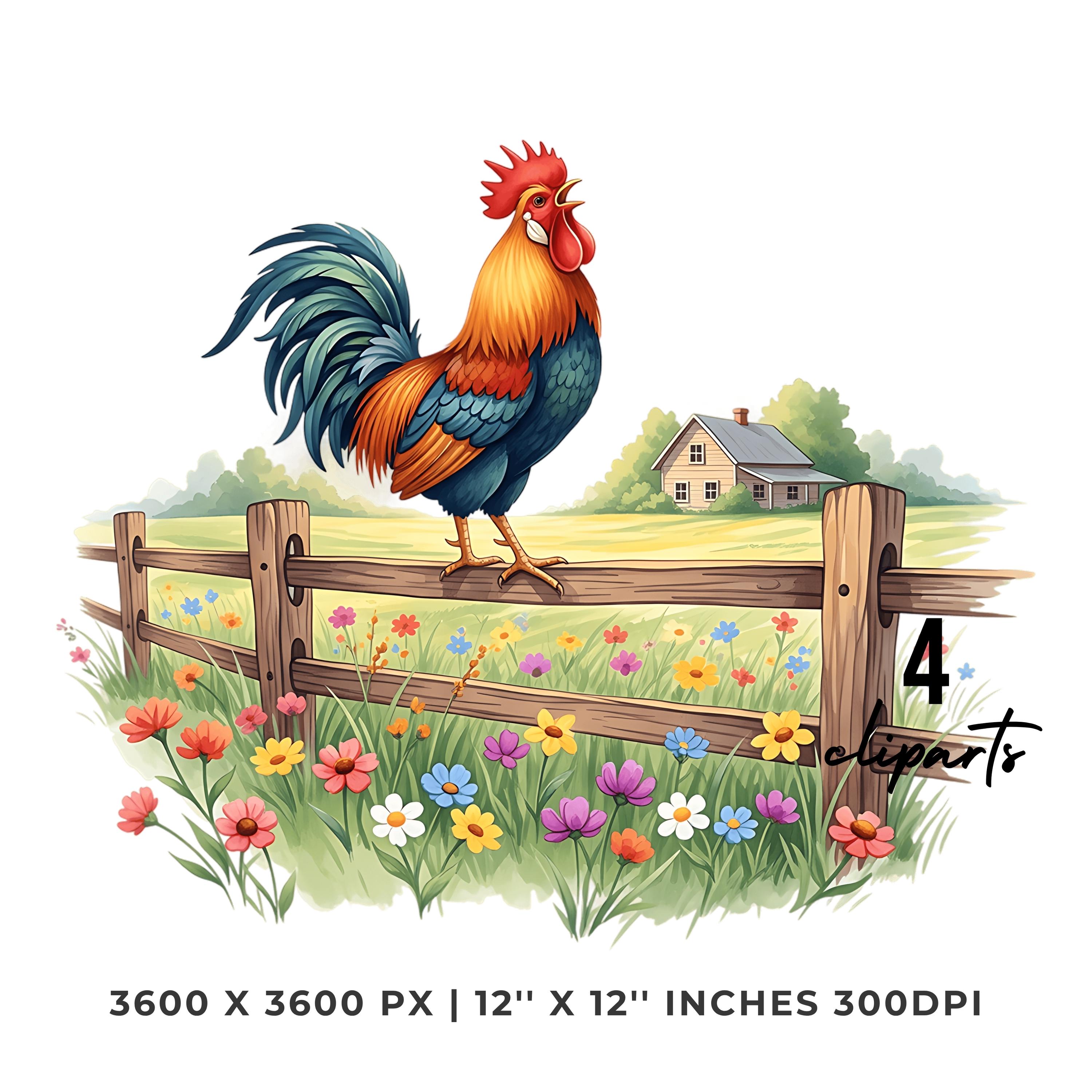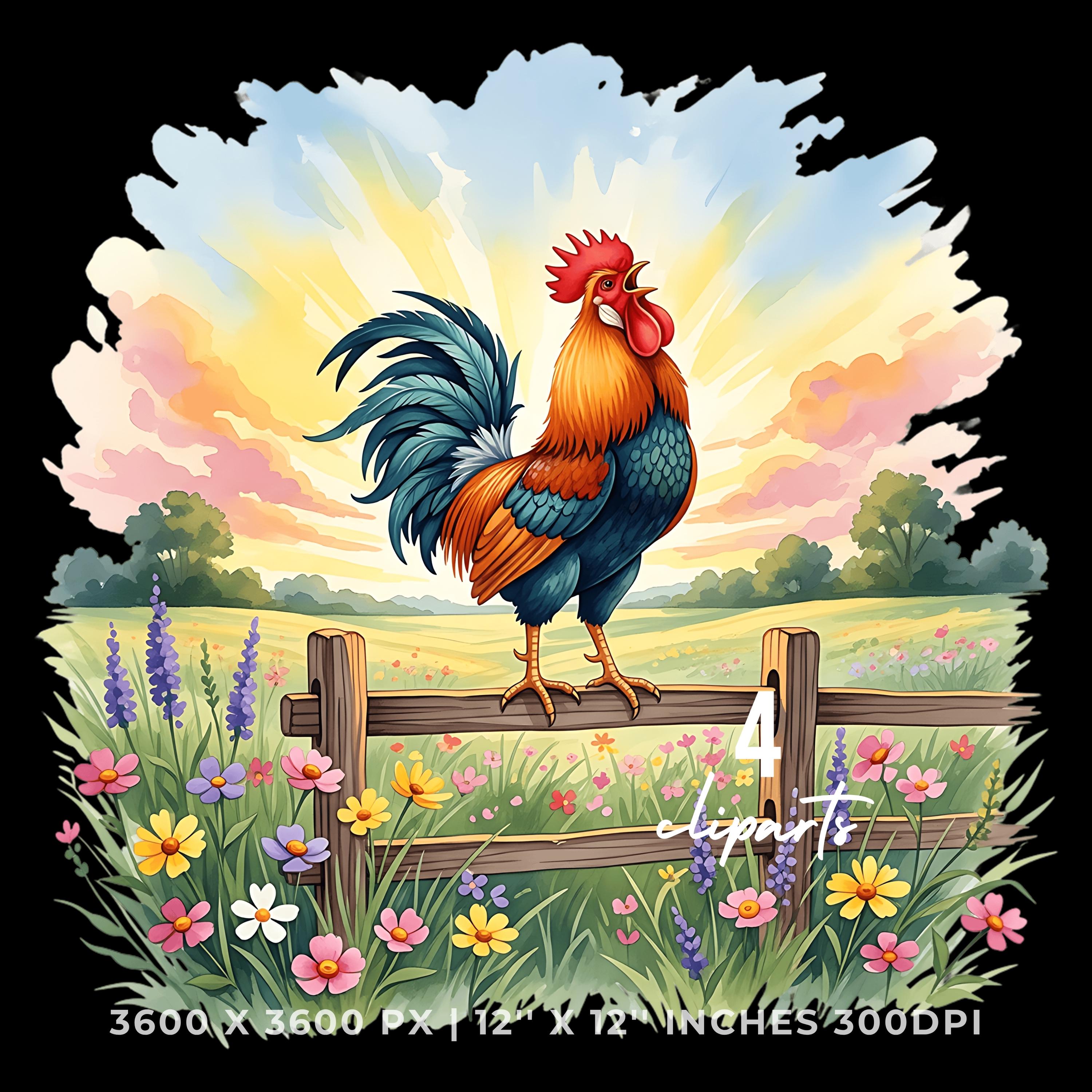 Summer Rooster Clipart PNG | 4 Watercolor Rooster Crowing at Sunrise on a Farmhouse Fence, in Summer Fields | Sublimation Commercial Use is an eye-catching, high-resolution digital asset designed for creators, crafters, teachers, and small business owners looking to elevate their visuals.