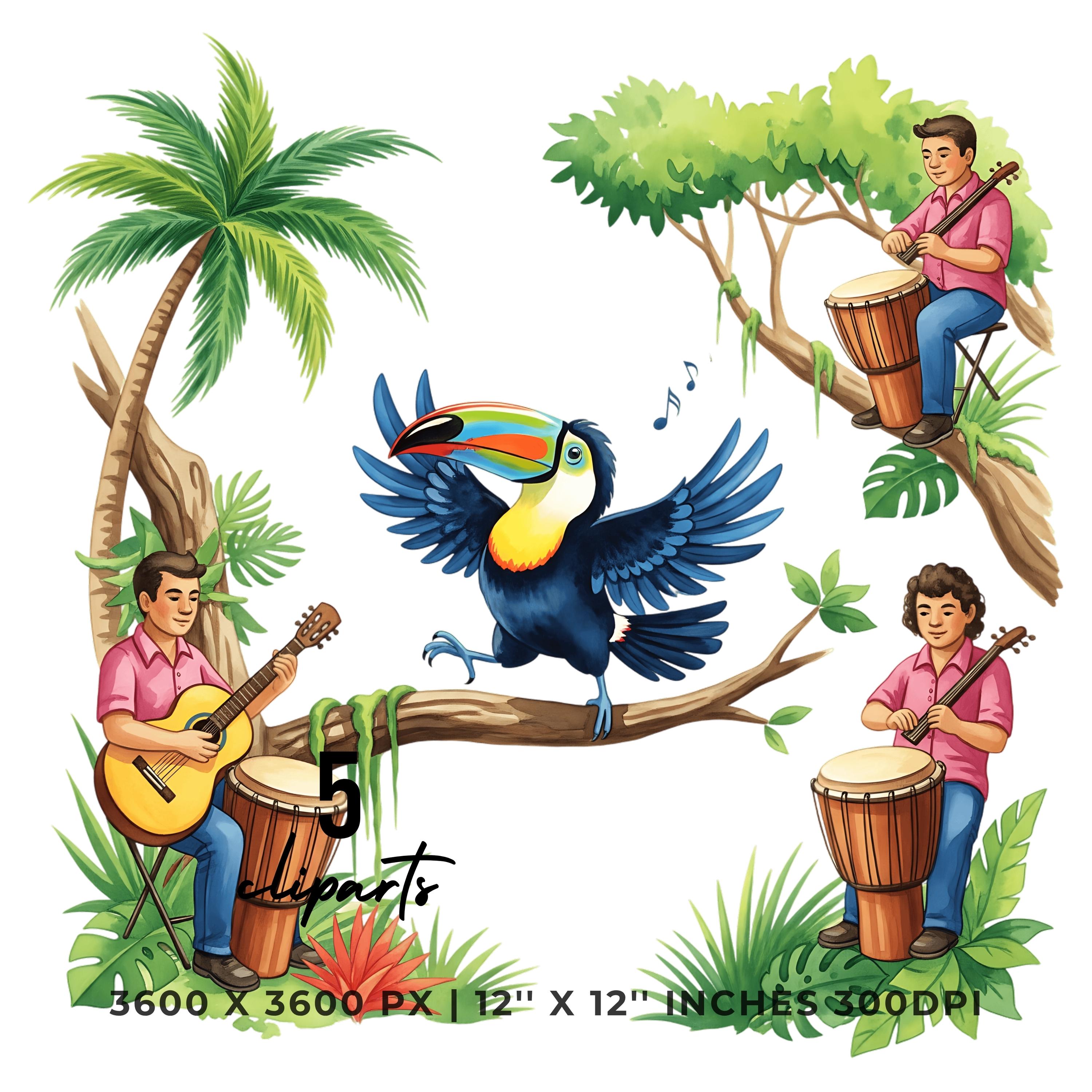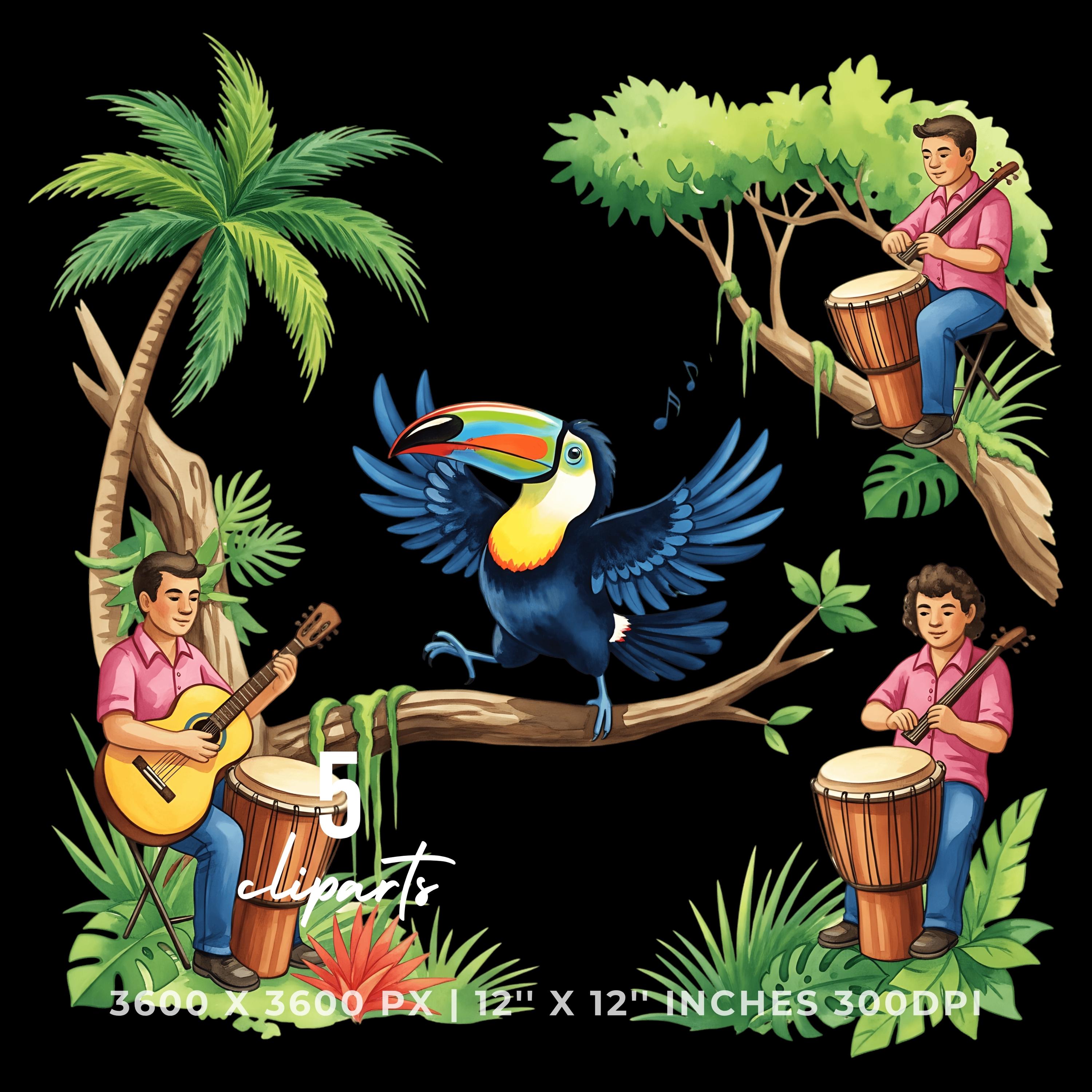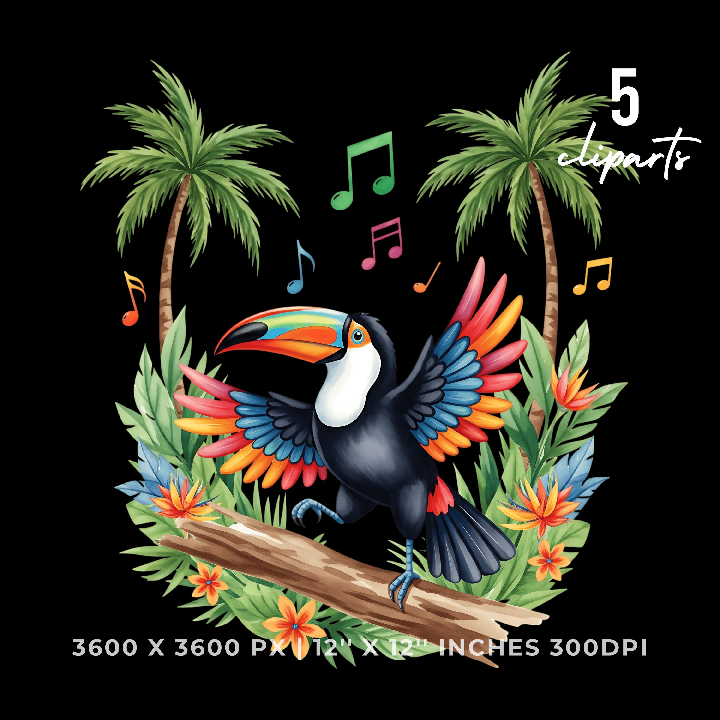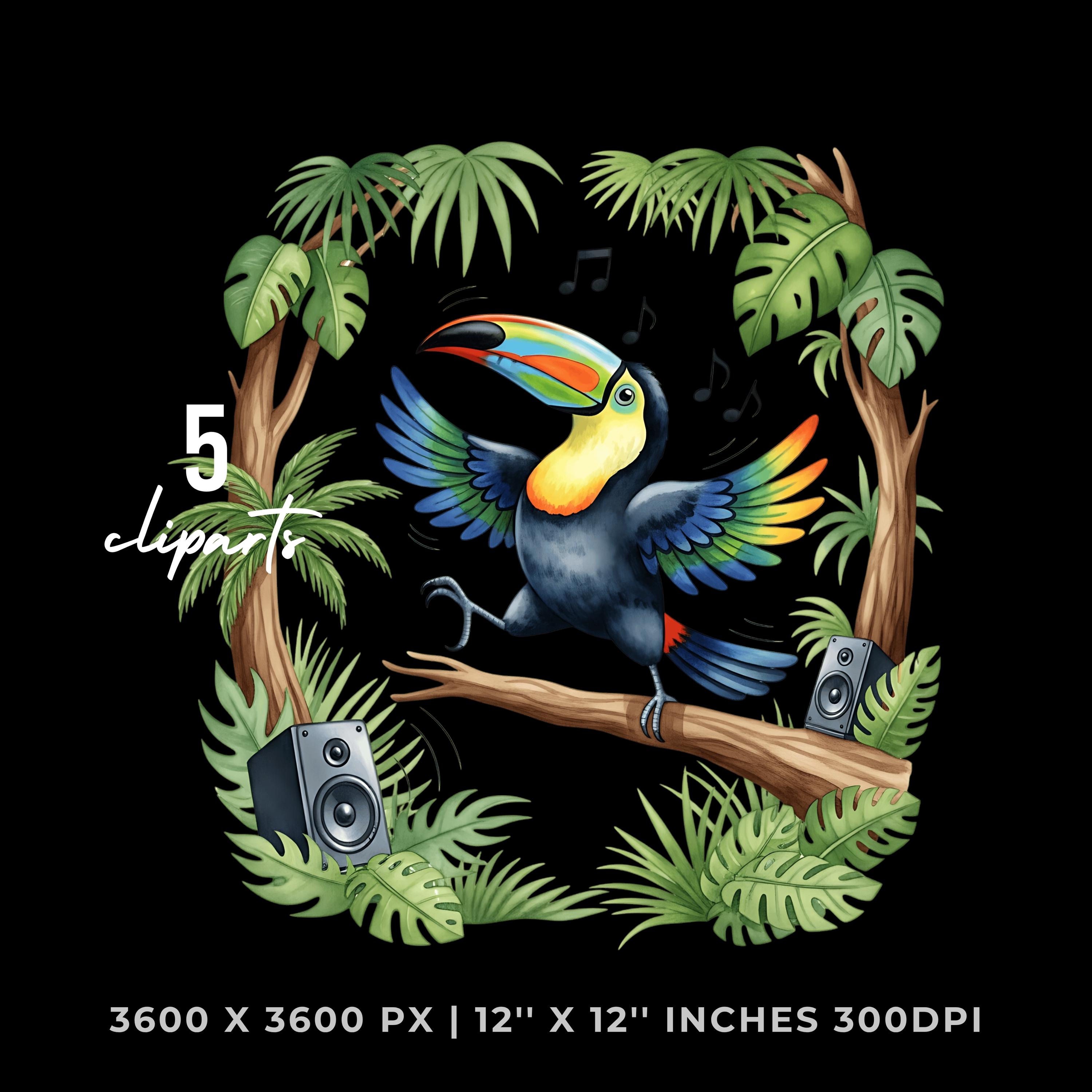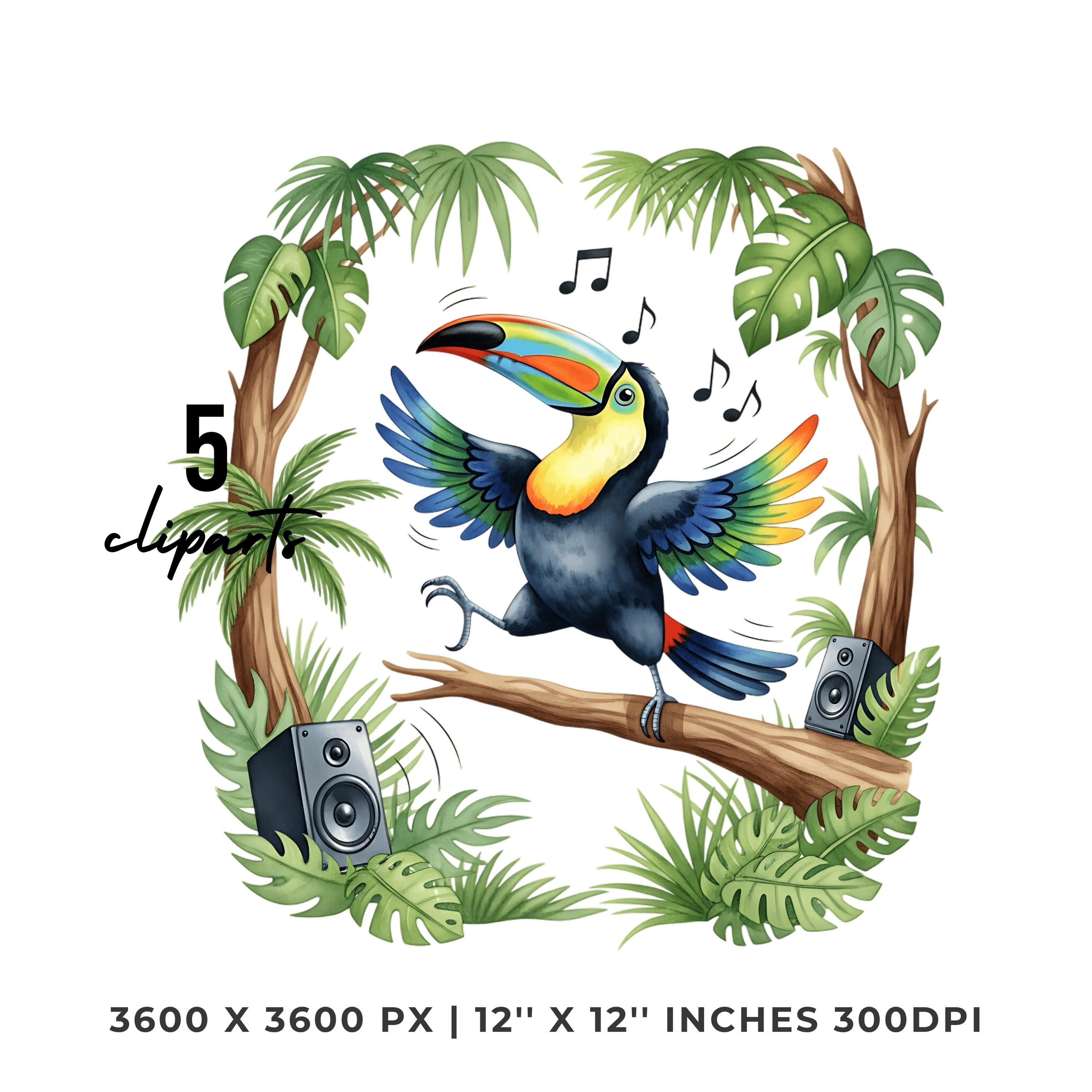 Summer Toucan Clipart PNG | 4 Watercolor Toucan dancing on a Tree Branch in the Jungle | Sublimation Transparent Commercial Use