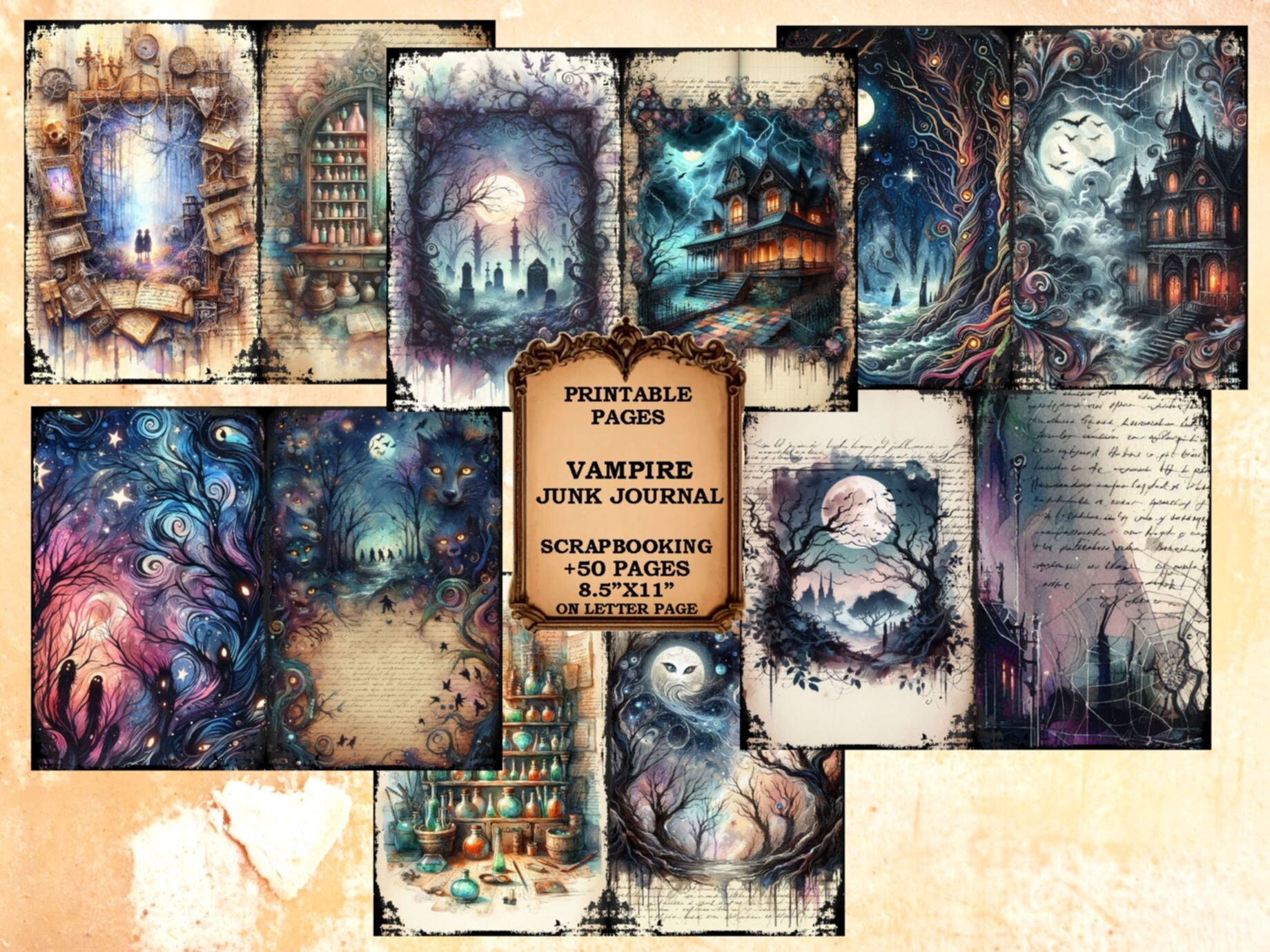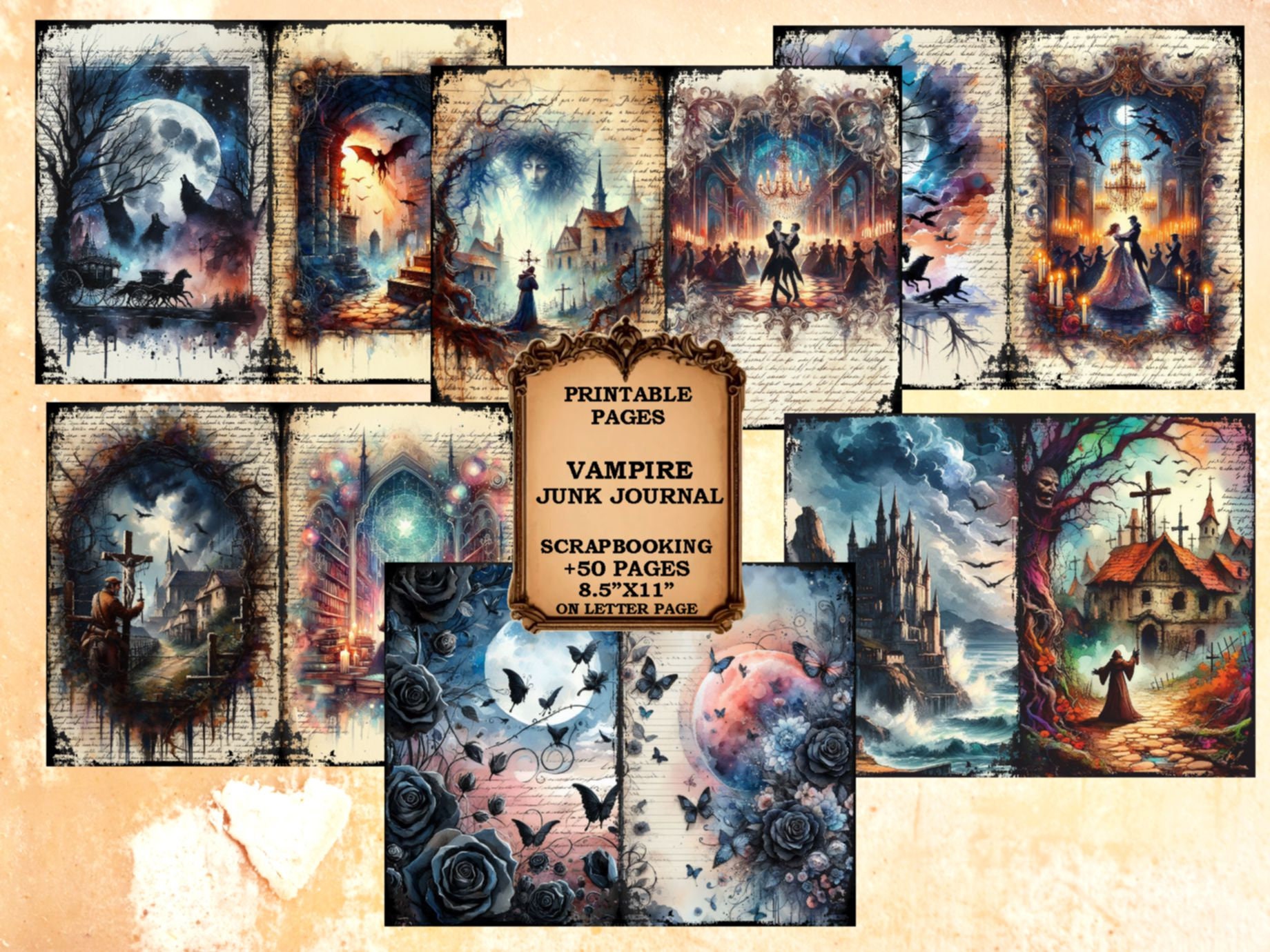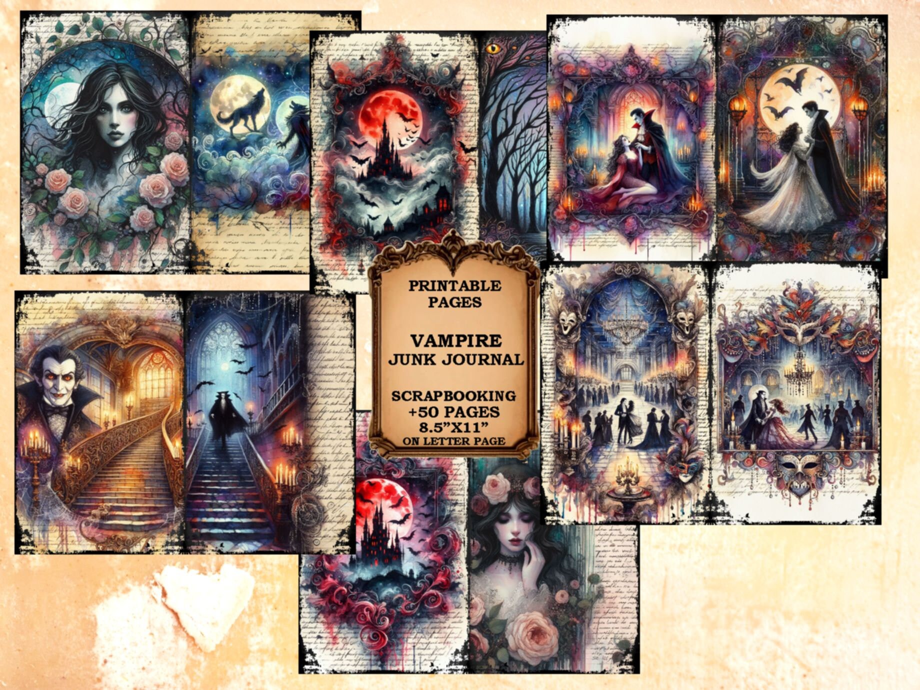 Embrace the dark and mysterious world of vampires with our Printable Vampire Scrapbook Pages. Perfect for adding a chilling touch to your junk journal or creating a gothic-themed scrapbook, this digital download offers over 50 beautifully designed pages.