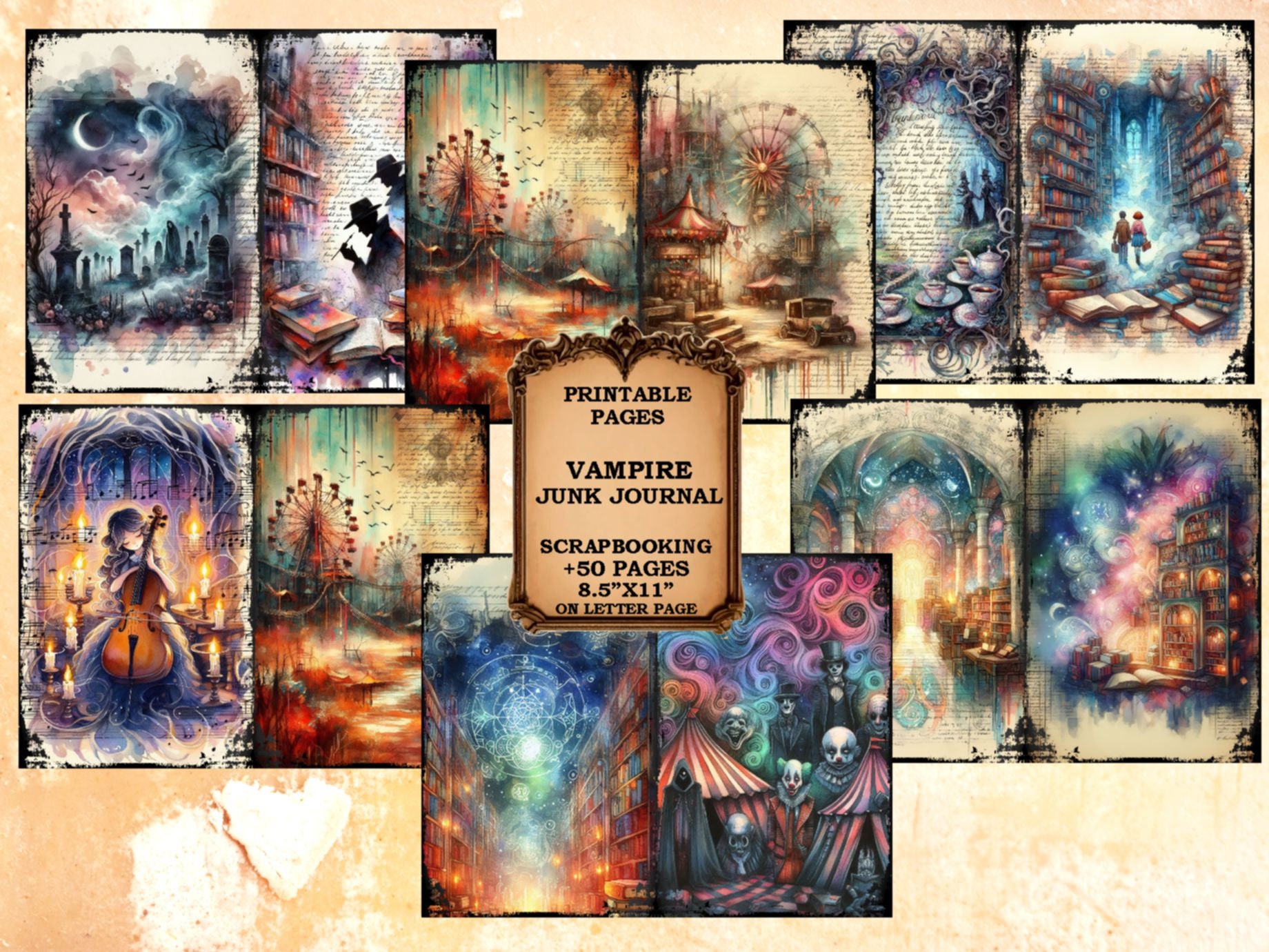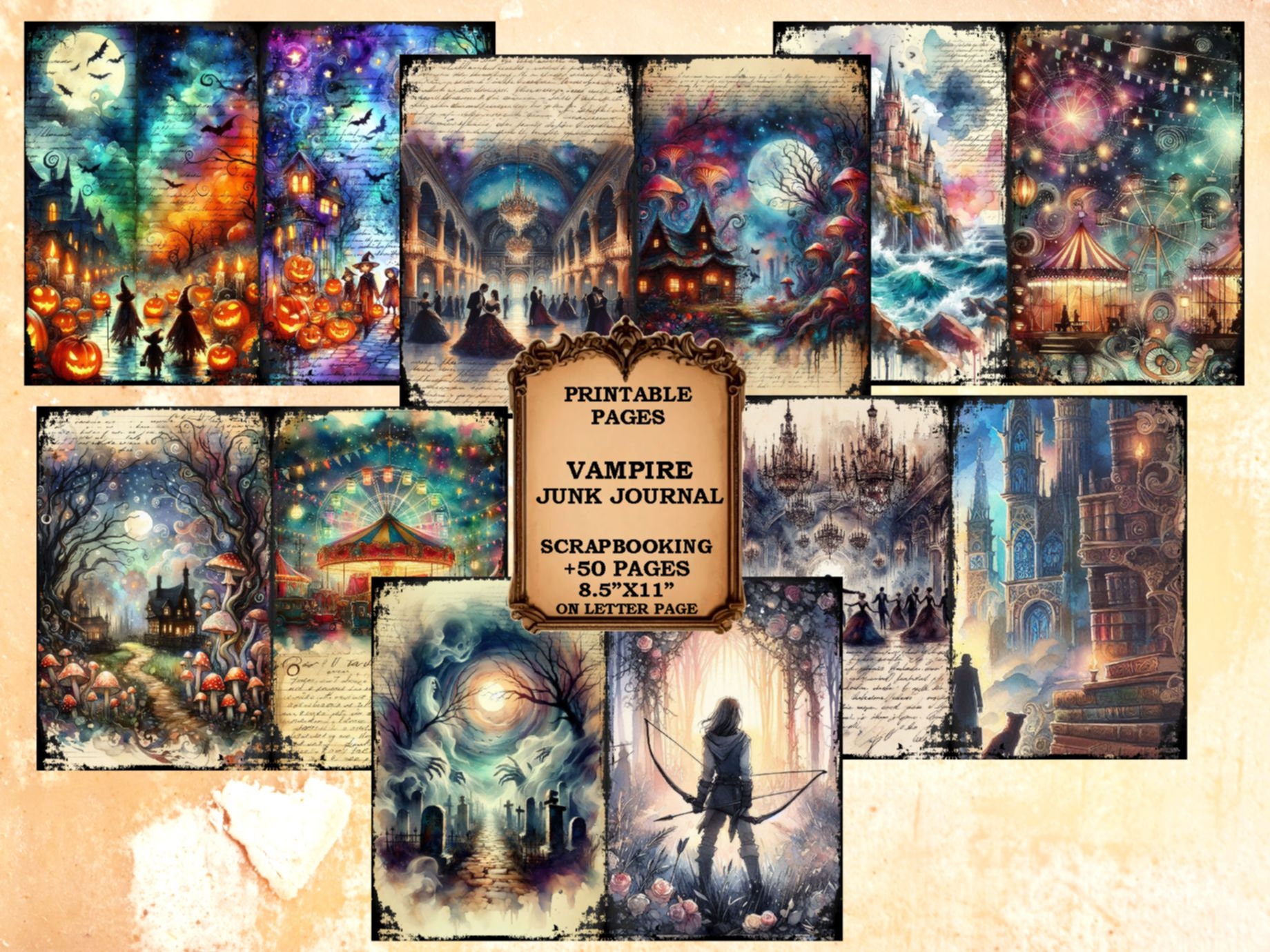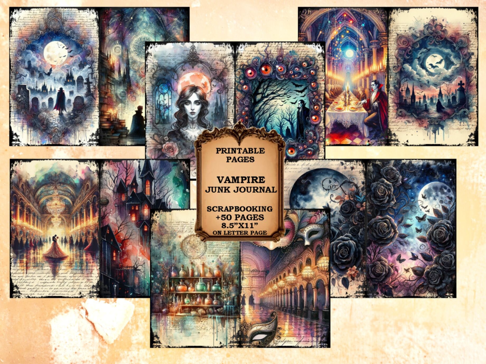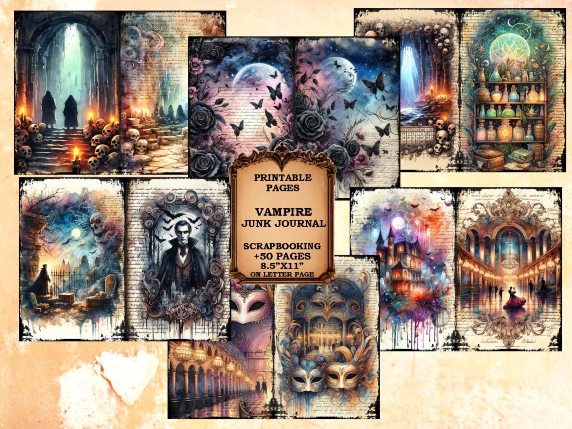 Embrace the dark and mysterious world of vampires with our Printable Vampire Scrapbook Pages. Perfect for adding a chilling touch to your junk journal or creating a gothic-themed scrapbook, this digital download offers over 50 beautifully designed pages.