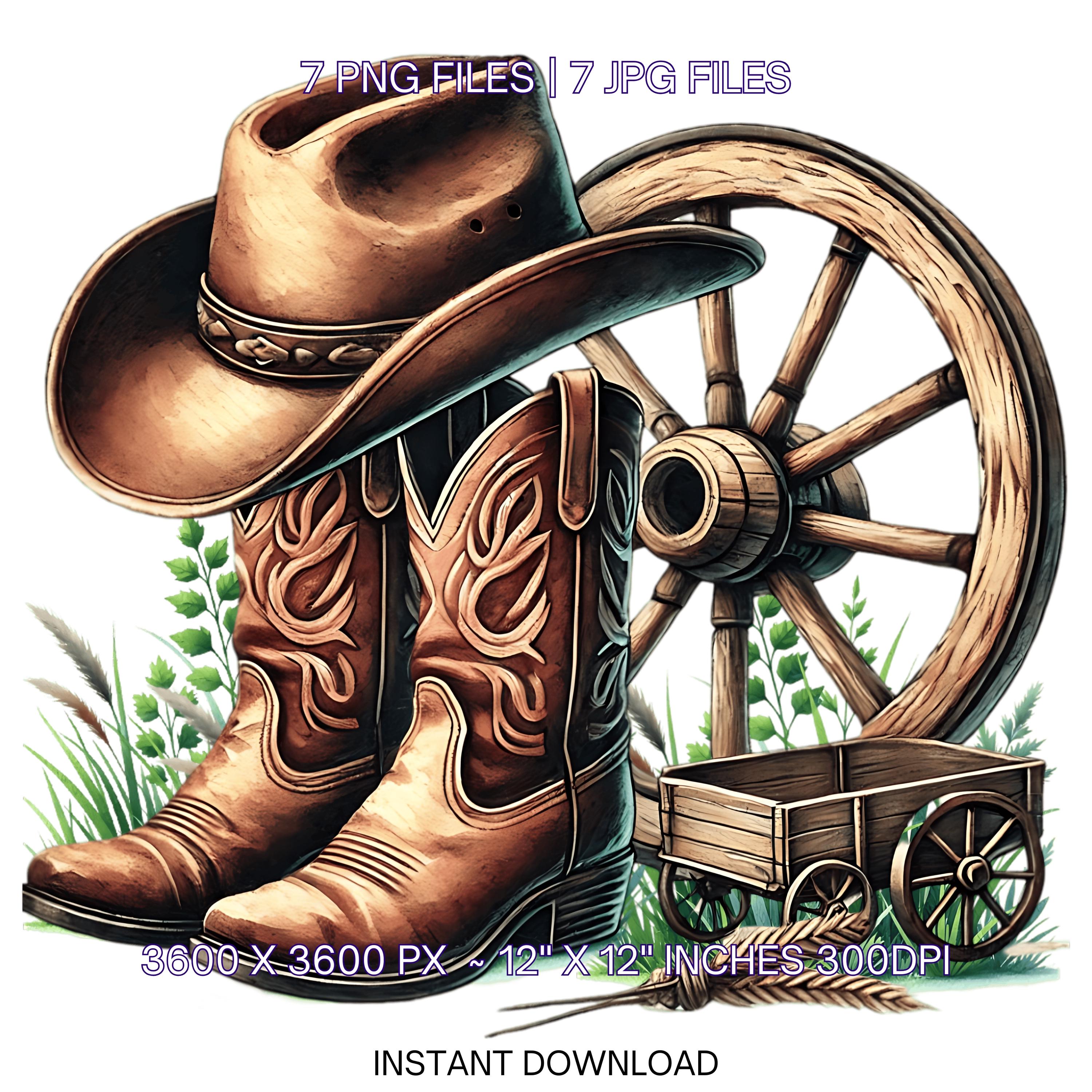 Watercolor Cowboy Boots Hat Old Wagon Wheel | 7 Country Cowboy Clipart Sublimation Designs | Country Boy Illustration PNG Commercial use is an eye-catching, high-resolution digital asset designed for creators, crafters, teachers, and small business owners looking to elevate their visuals.