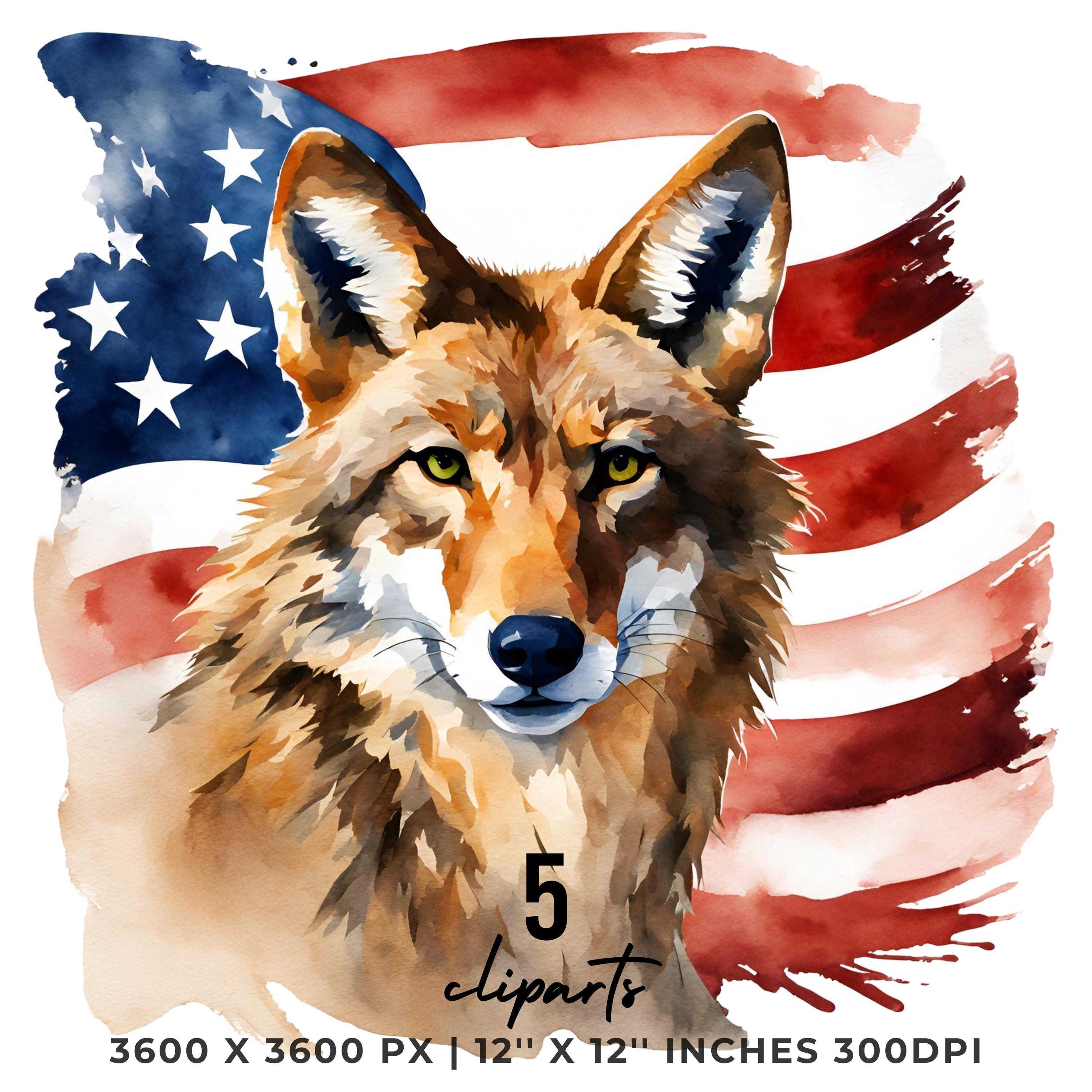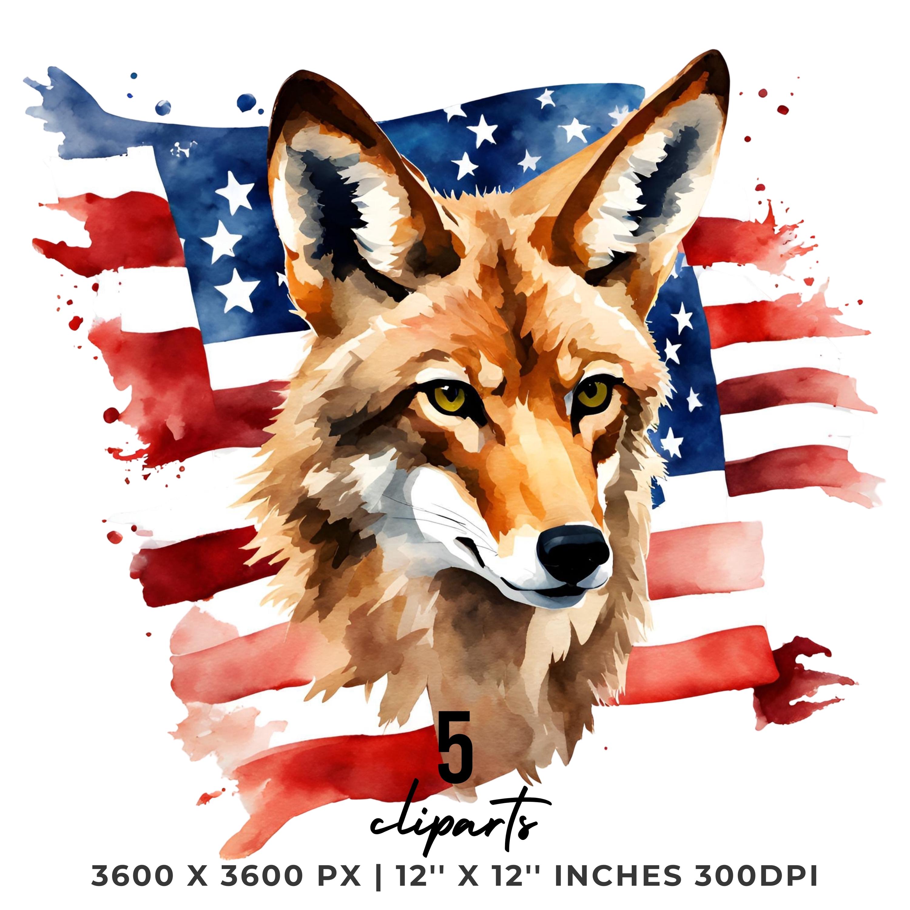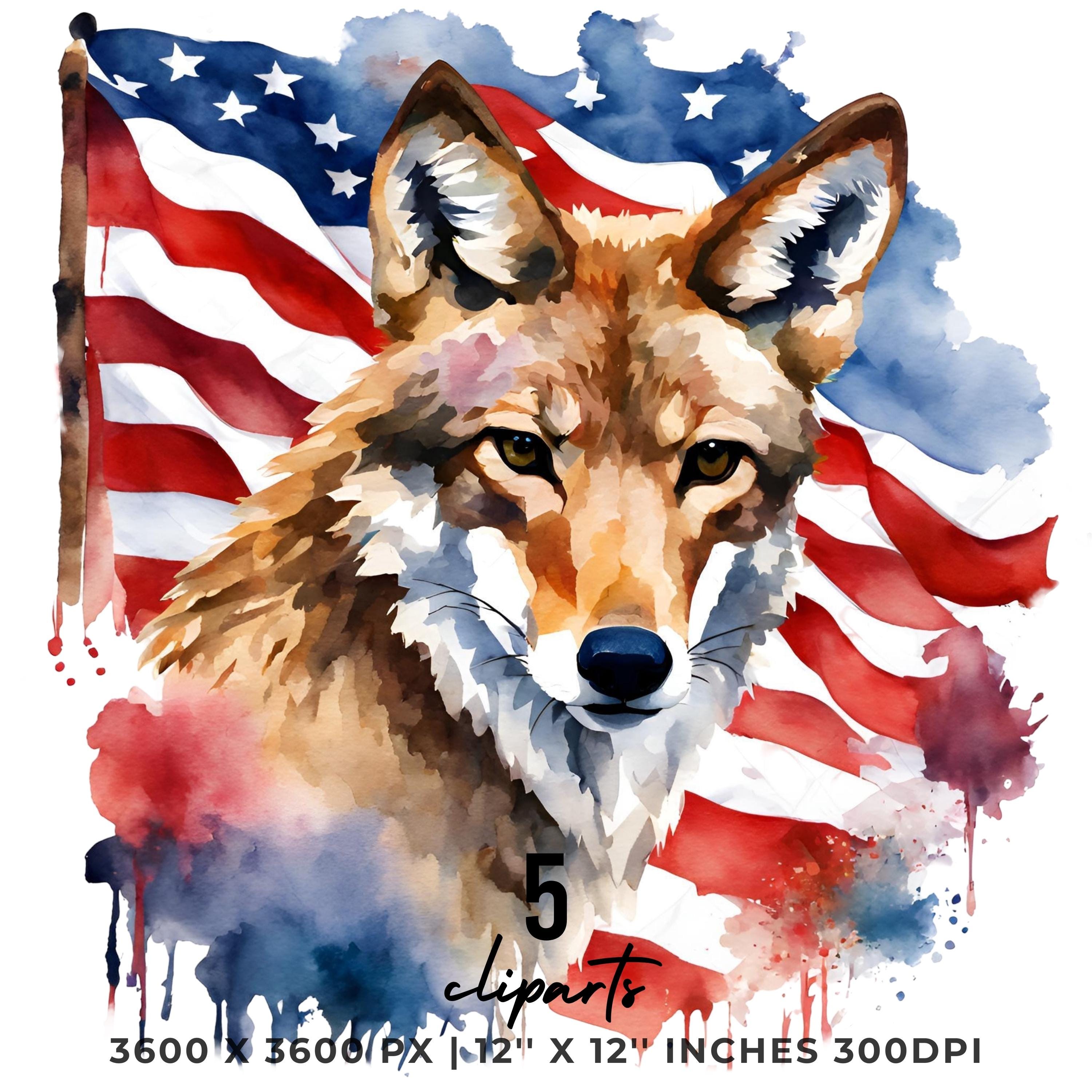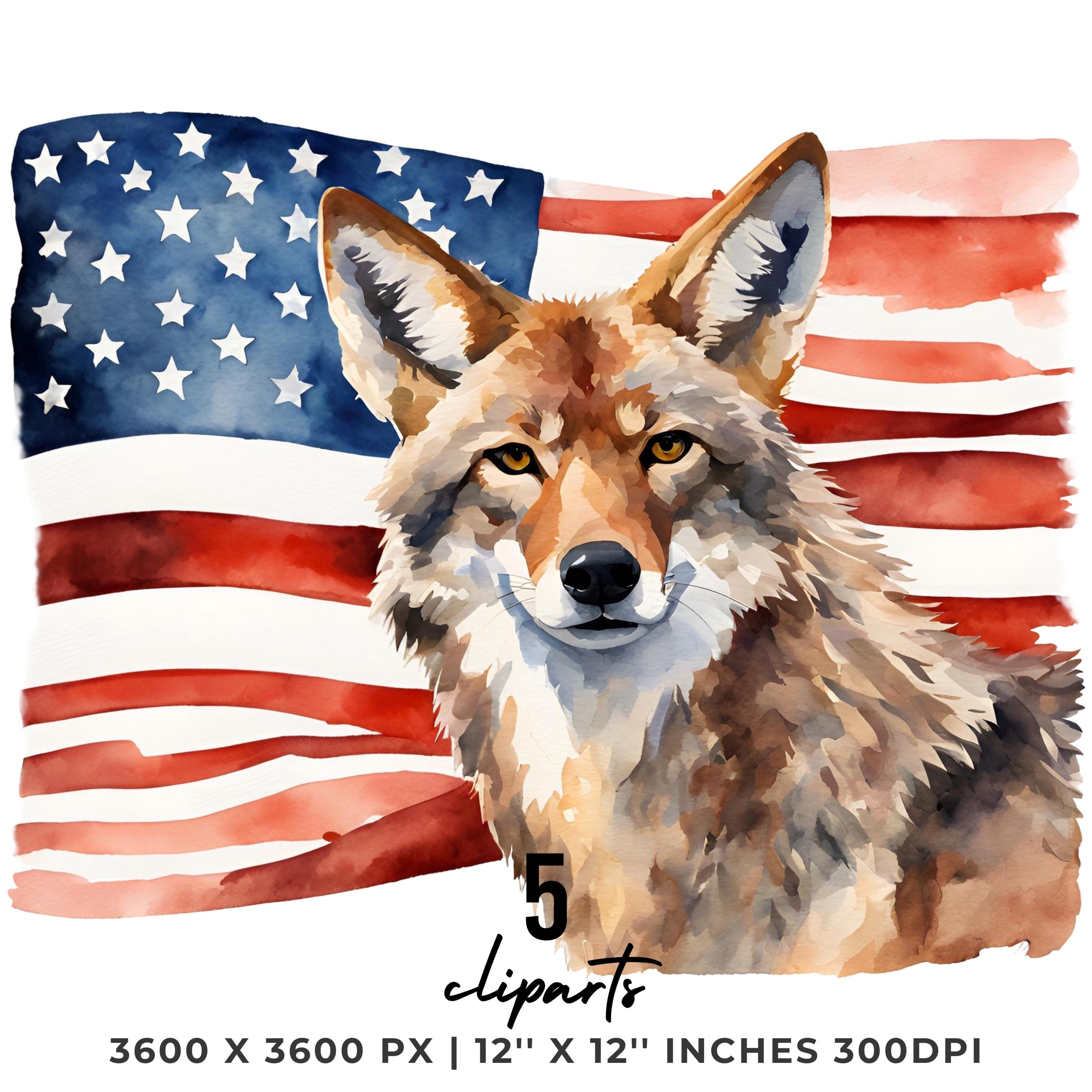 Watercolor COYOTE Flag PNG | 5 Patriotic USA Coyote Flag Clipart | United States Coyote Flag Sublimation Transparent Commercial Use