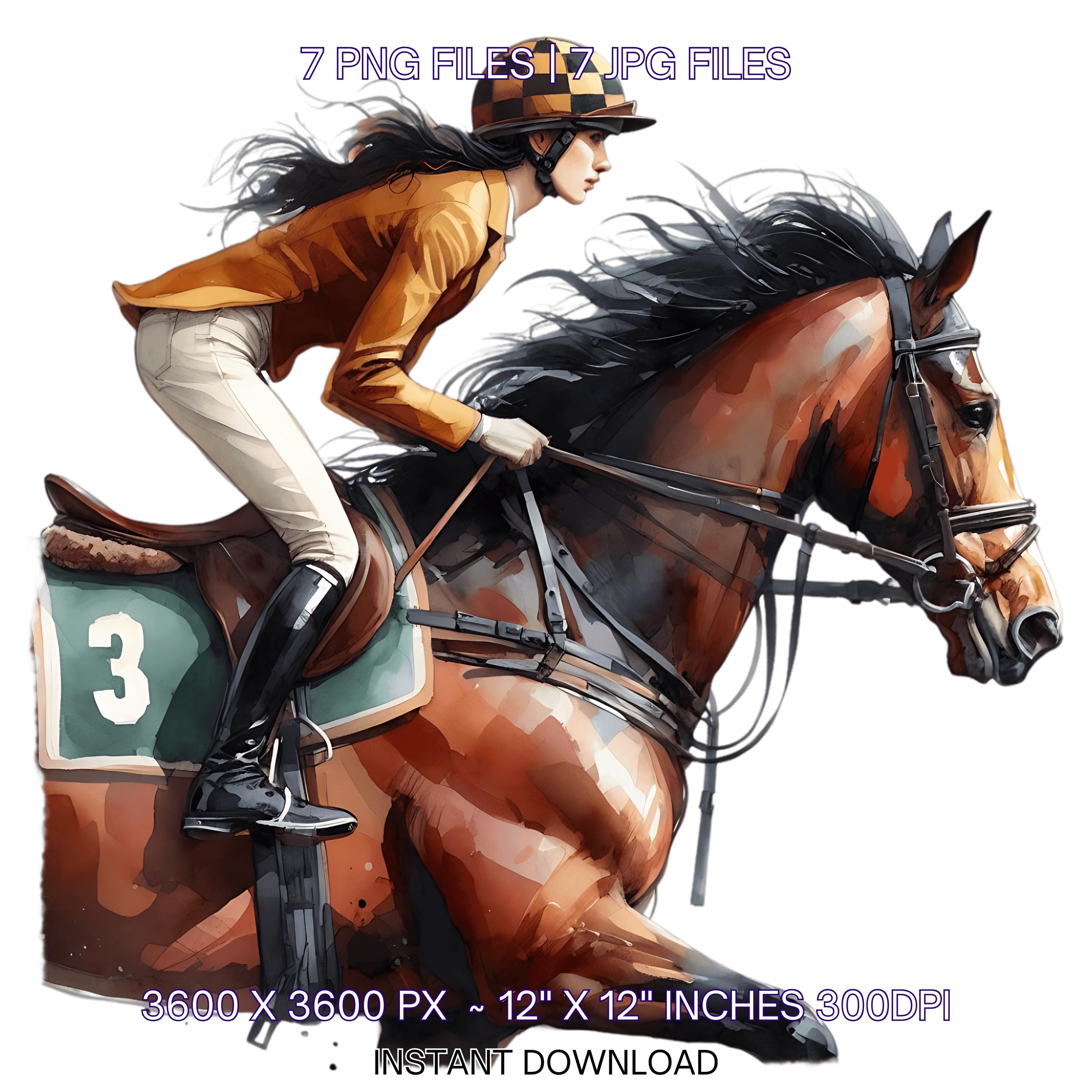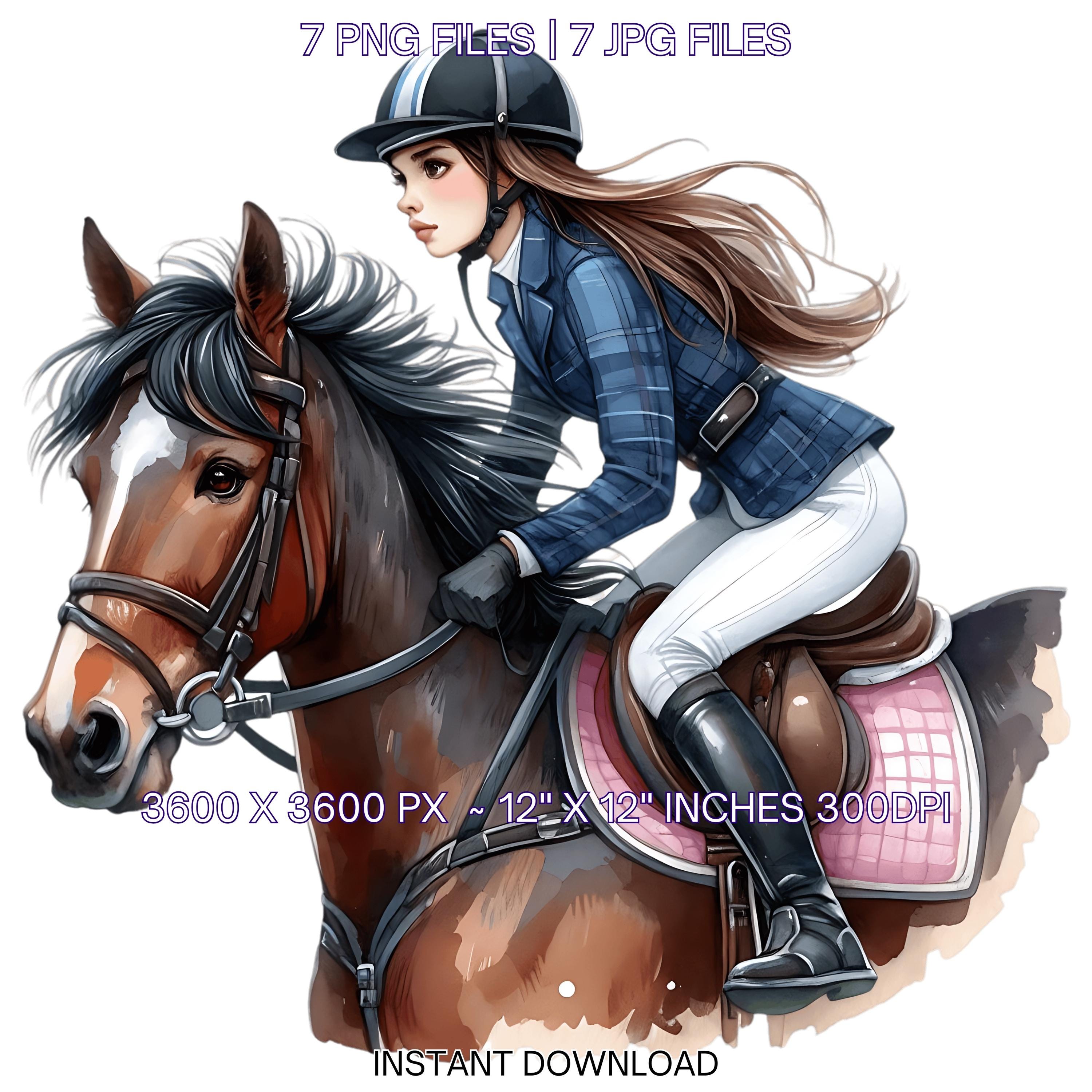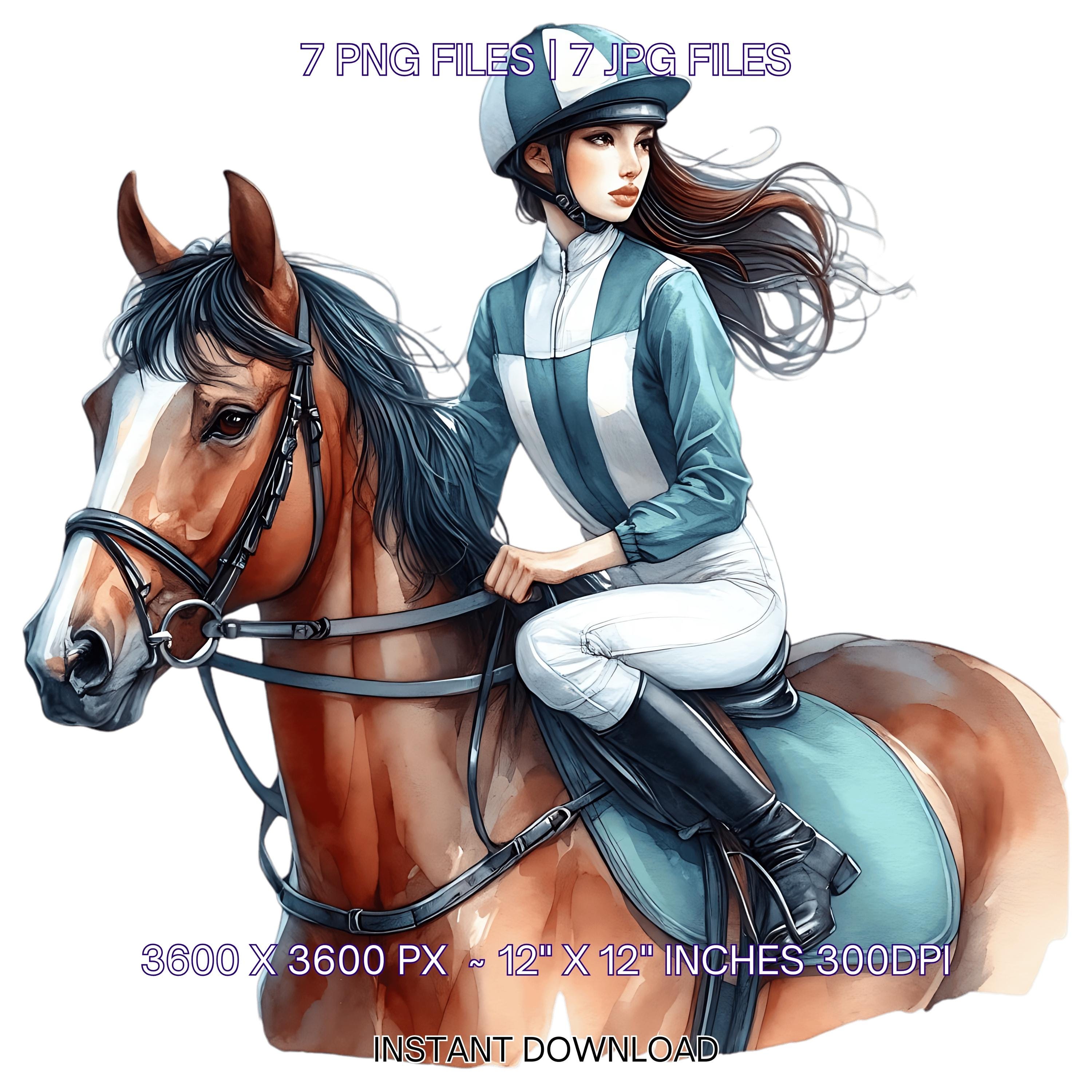Watercolor Jockey Girl Horseback Riding Clipart PNG | 7 Equestrian Sport Female Jockey | Sublimation Illustration Design | Commercial use is an eye-catching, high-resolution digital asset designed for creators, crafters, teachers, and small business owners looking to elevate their visuals.