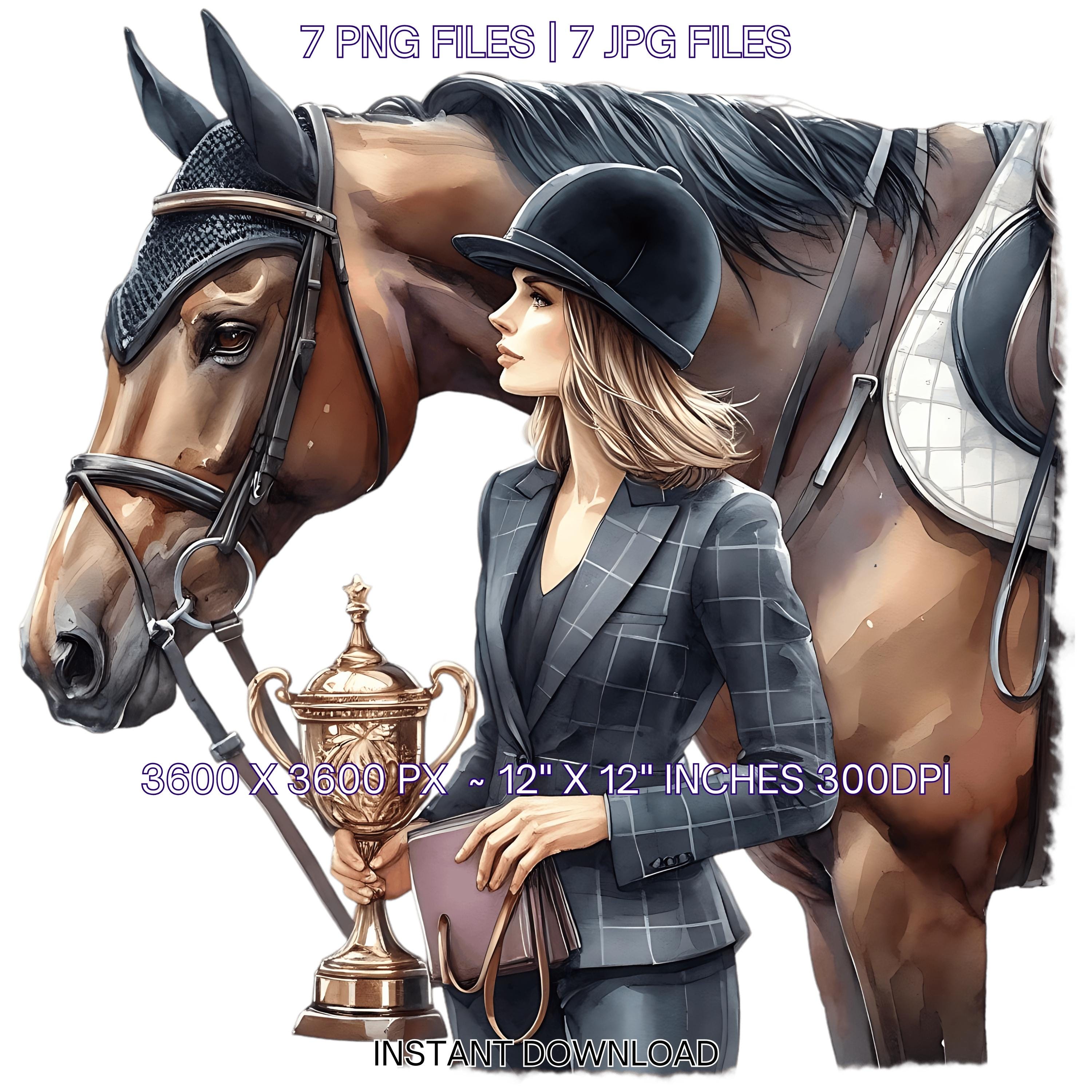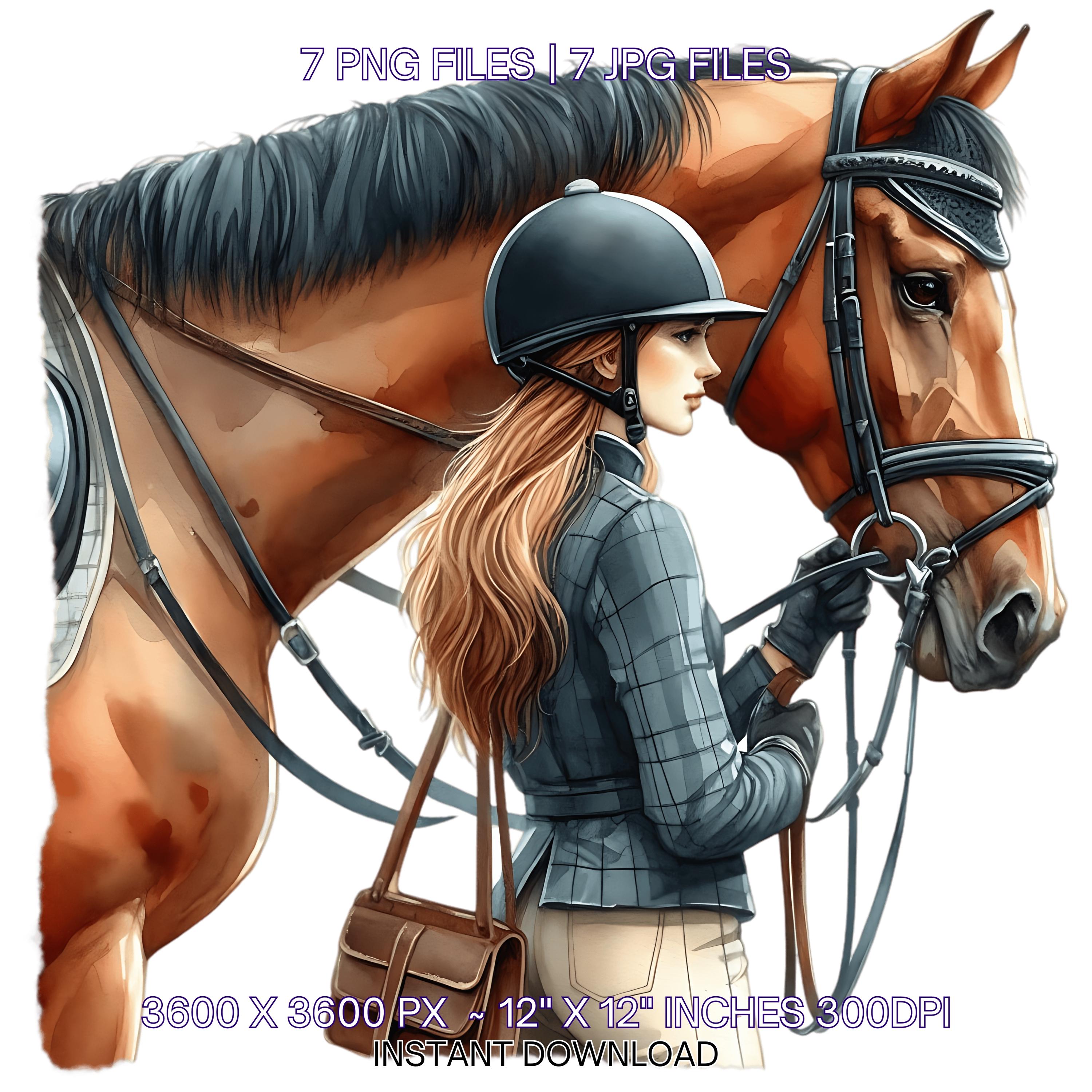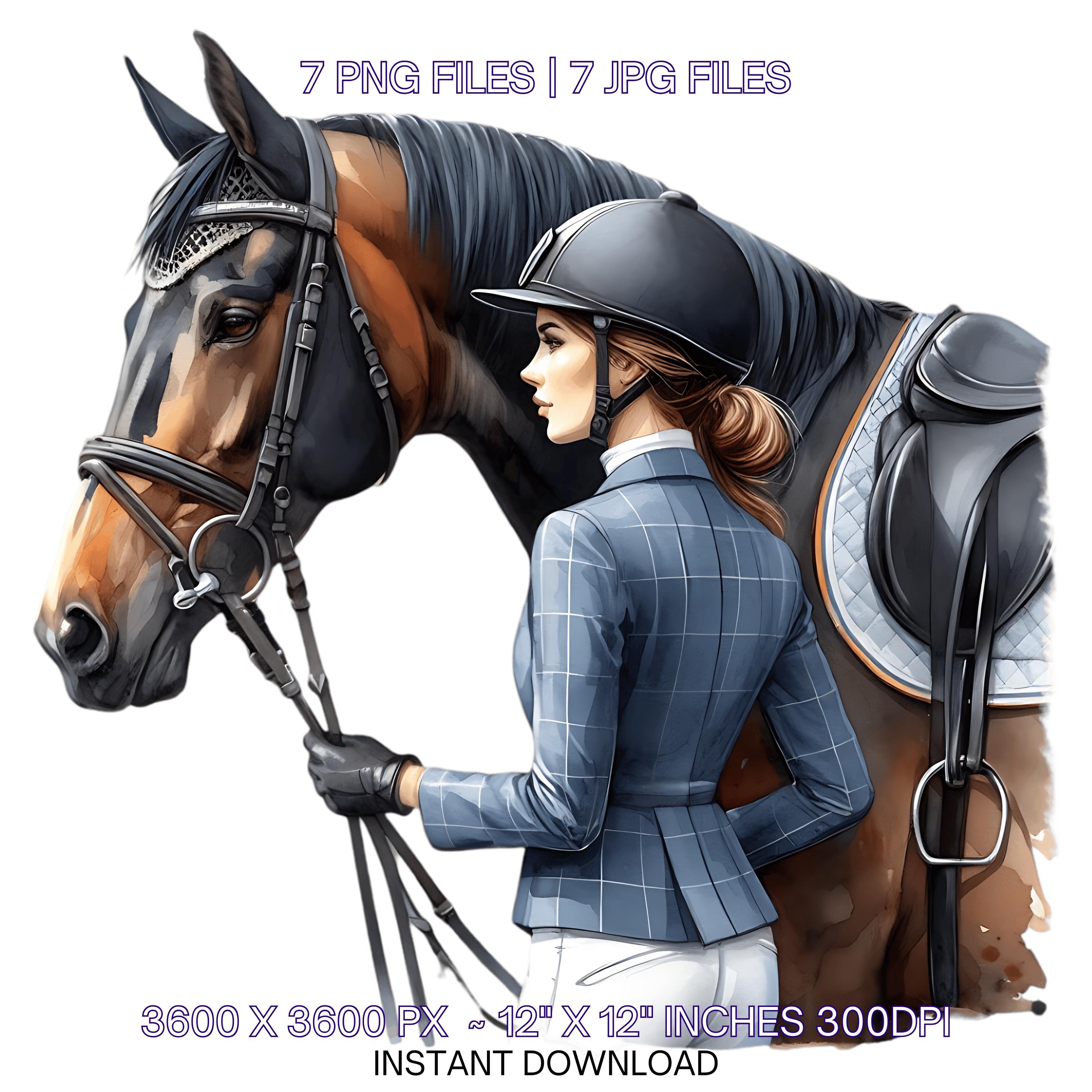 Watercolor Jockey Girl Horseback Riding Clipart PNG | 7 Equestrian Sport Female Jockey | Sublimation Illustration Design | Commercial use is an eye-catching, high-resolution digital asset designed for creators, crafters, teachers, and small business owners looking to elevate their visuals.
