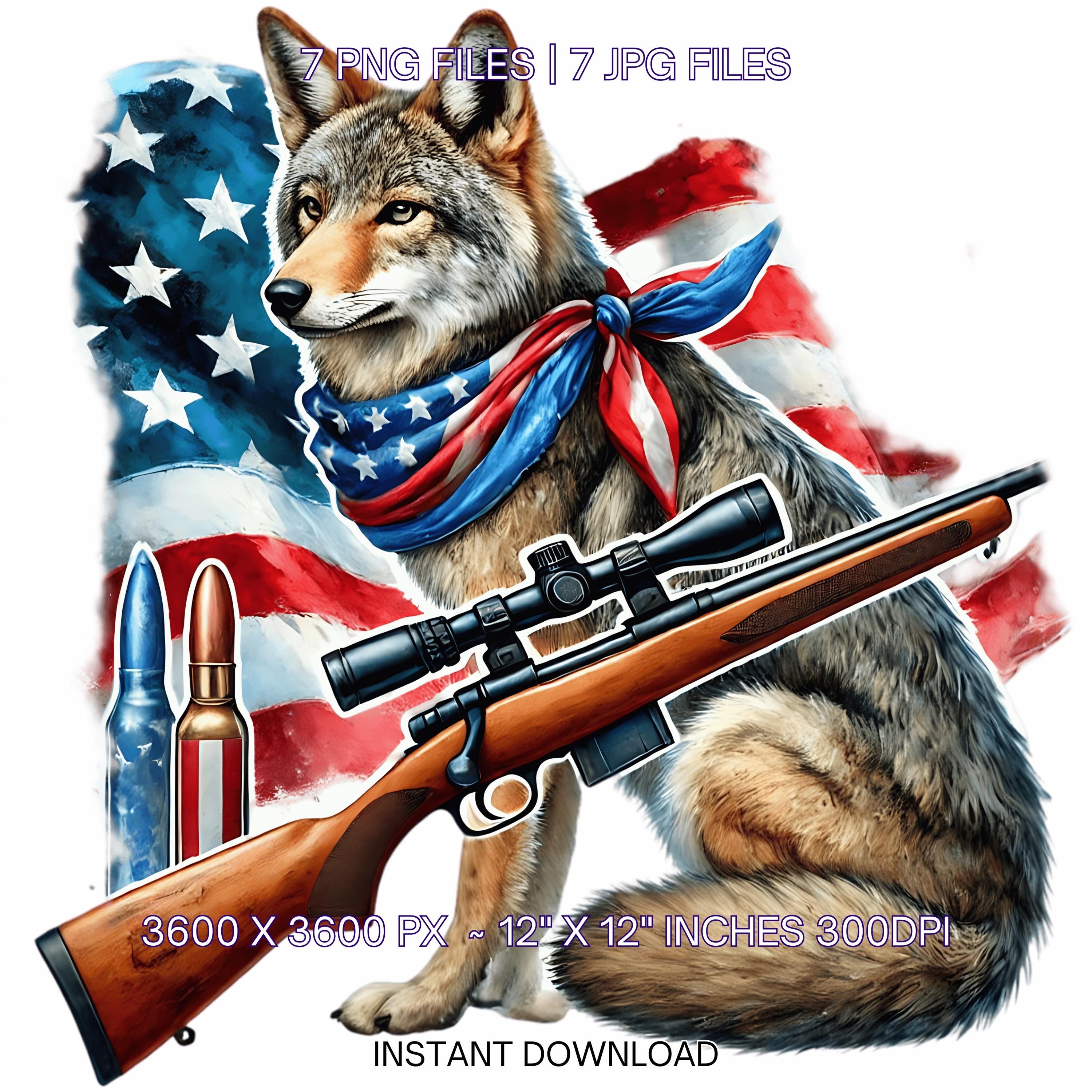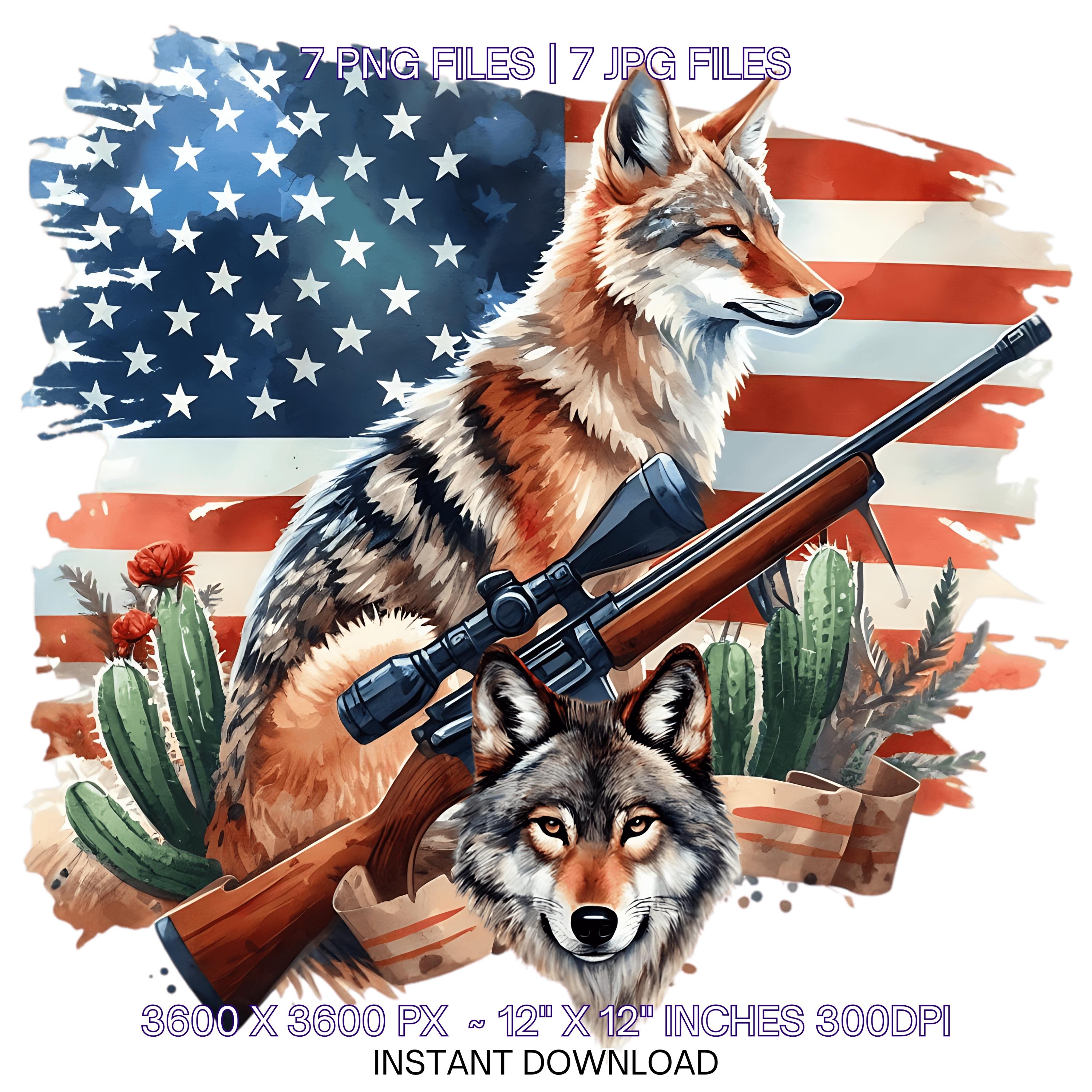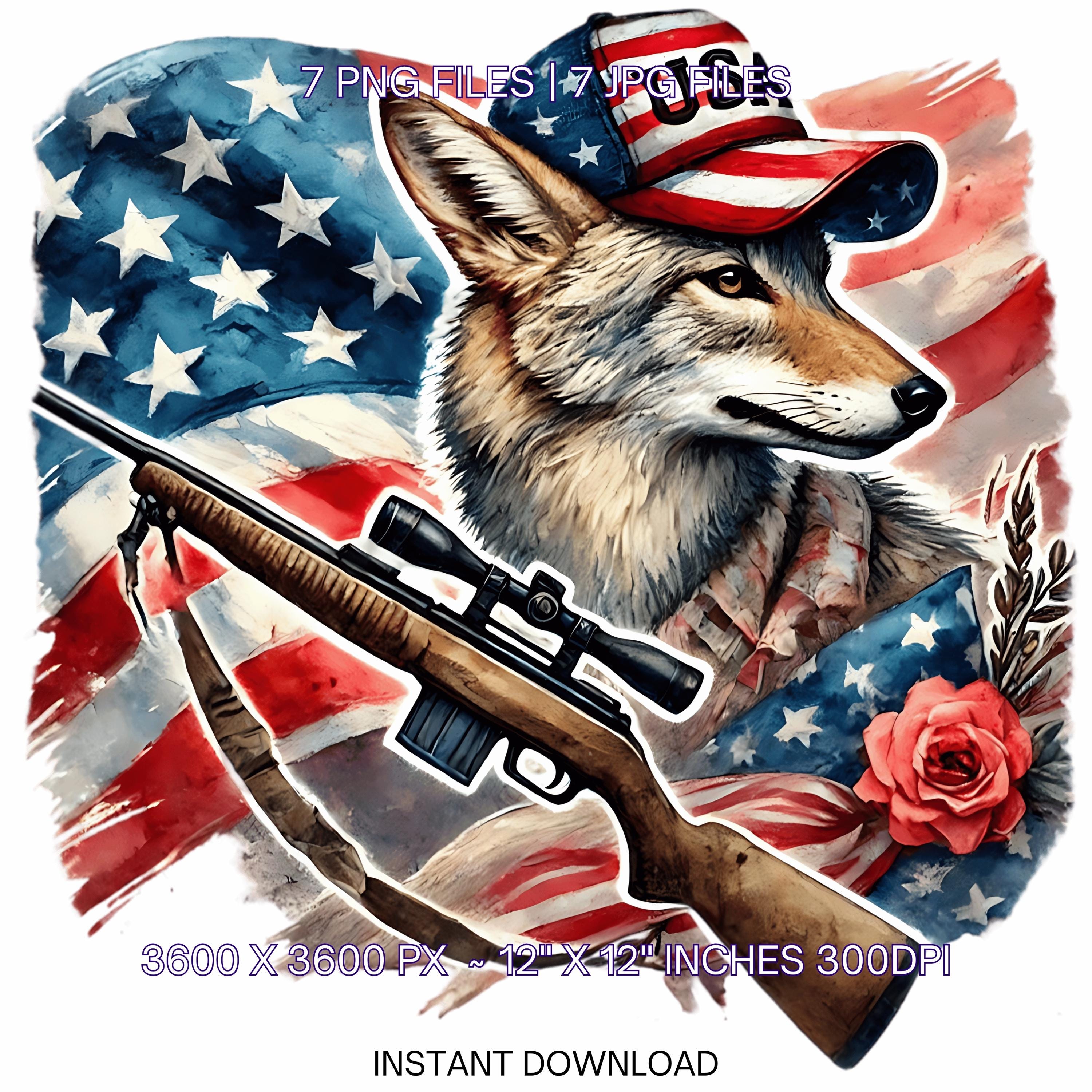 Watercolor Coyote Flag PNG | 7 Patriotic USA Flag Coyote Hunting Clipart | United States Flag Coyote Hunting Sublimation Transparent Commercial Use