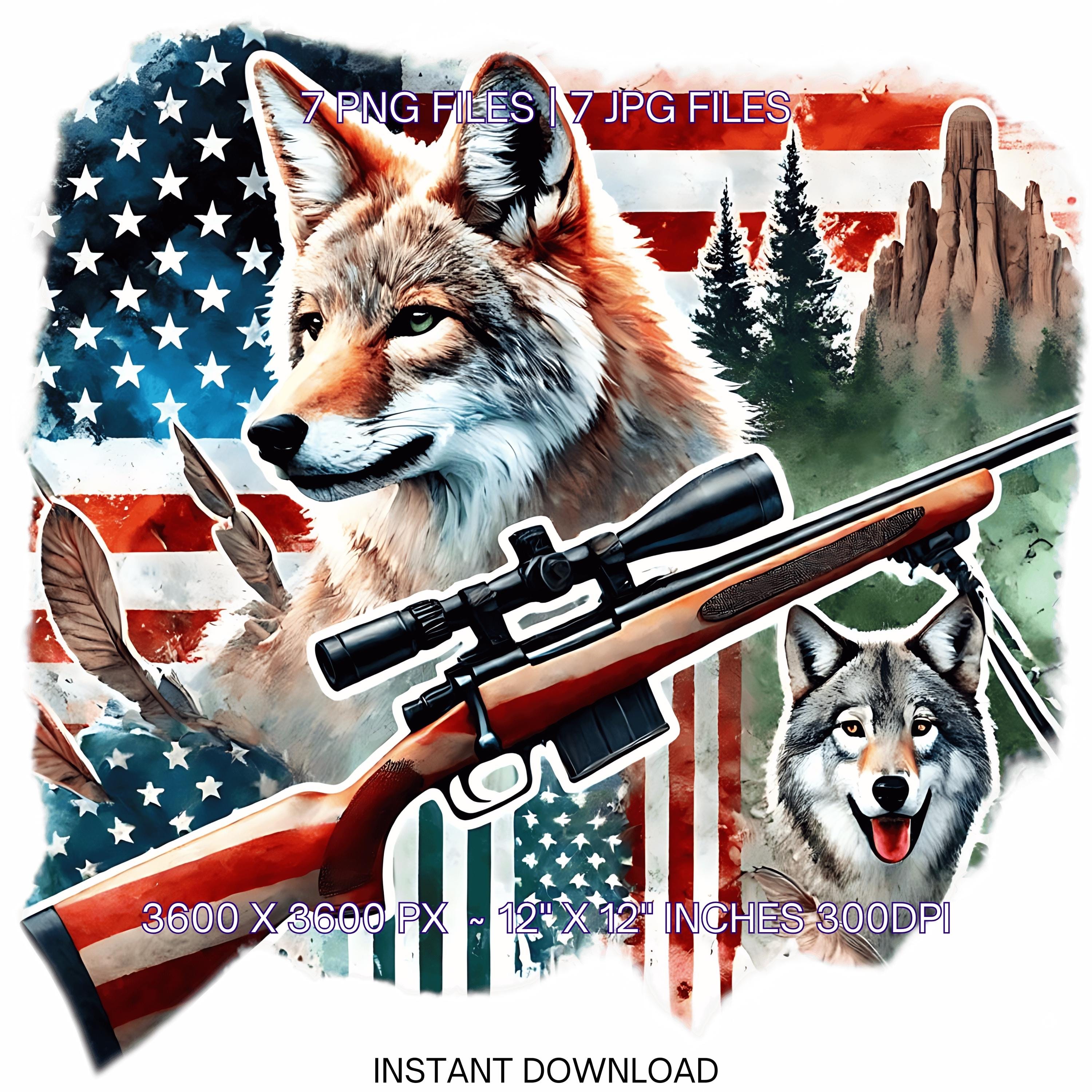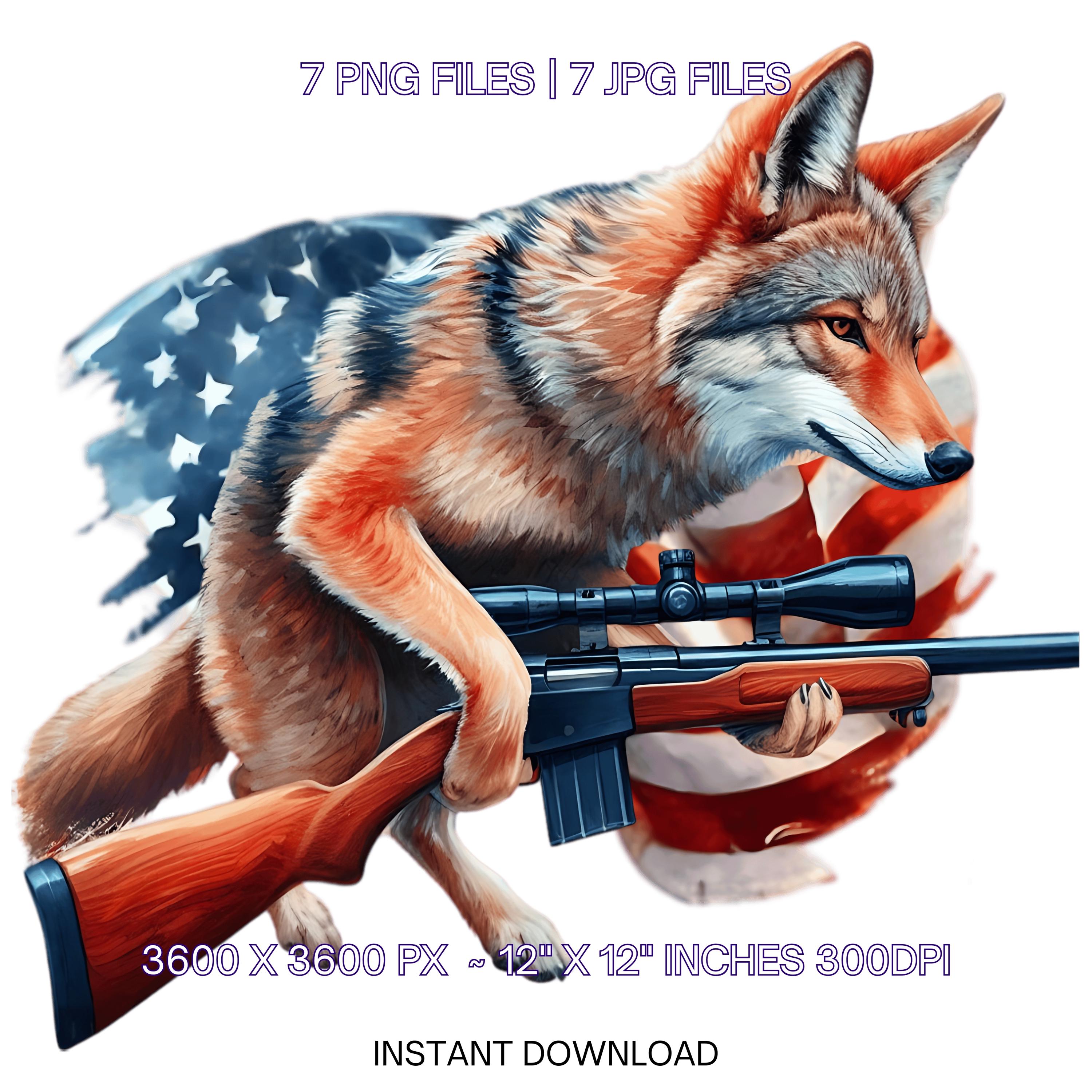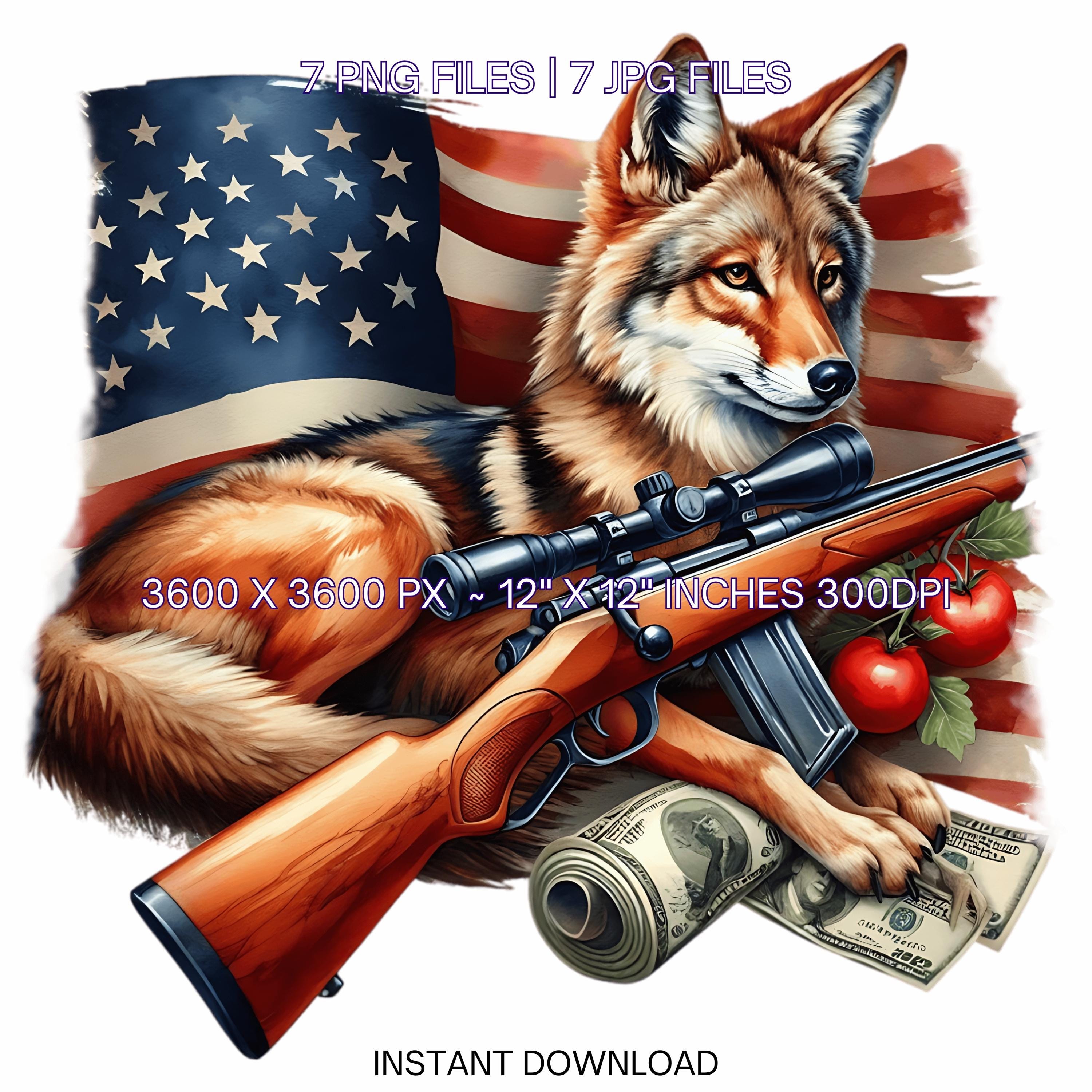 Watercolor Coyote Flag PNG | 7 Patriotic USA Flag Coyote Hunting Clipart | United States Flag Coyote Hunting Sublimation Transparent Commercial Use