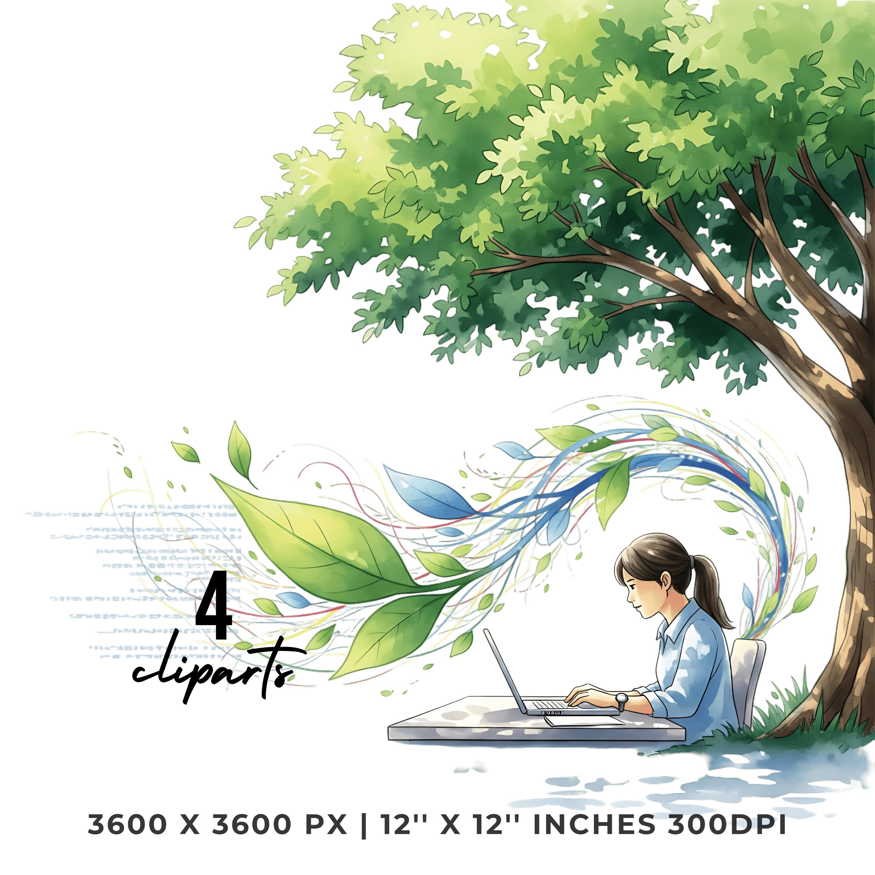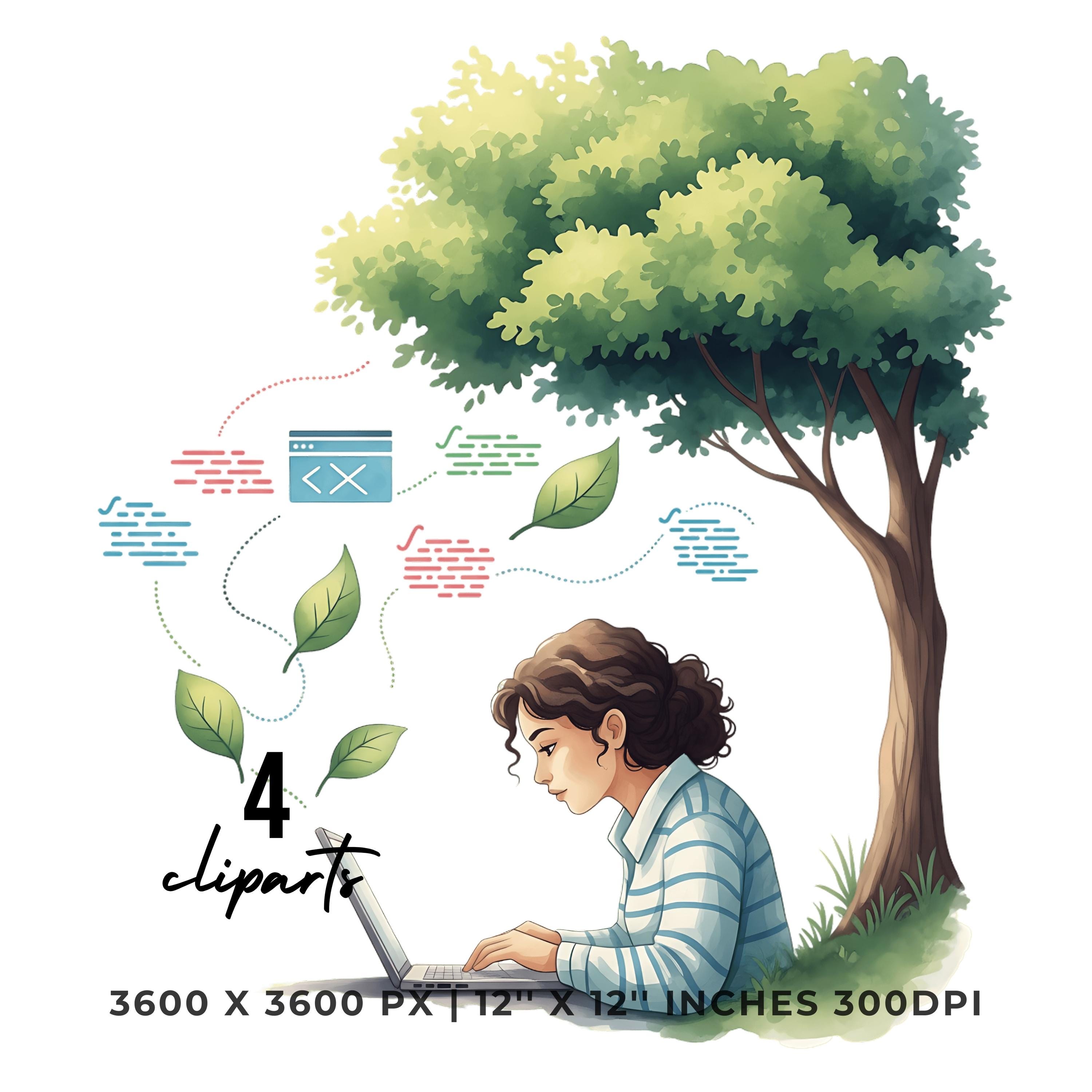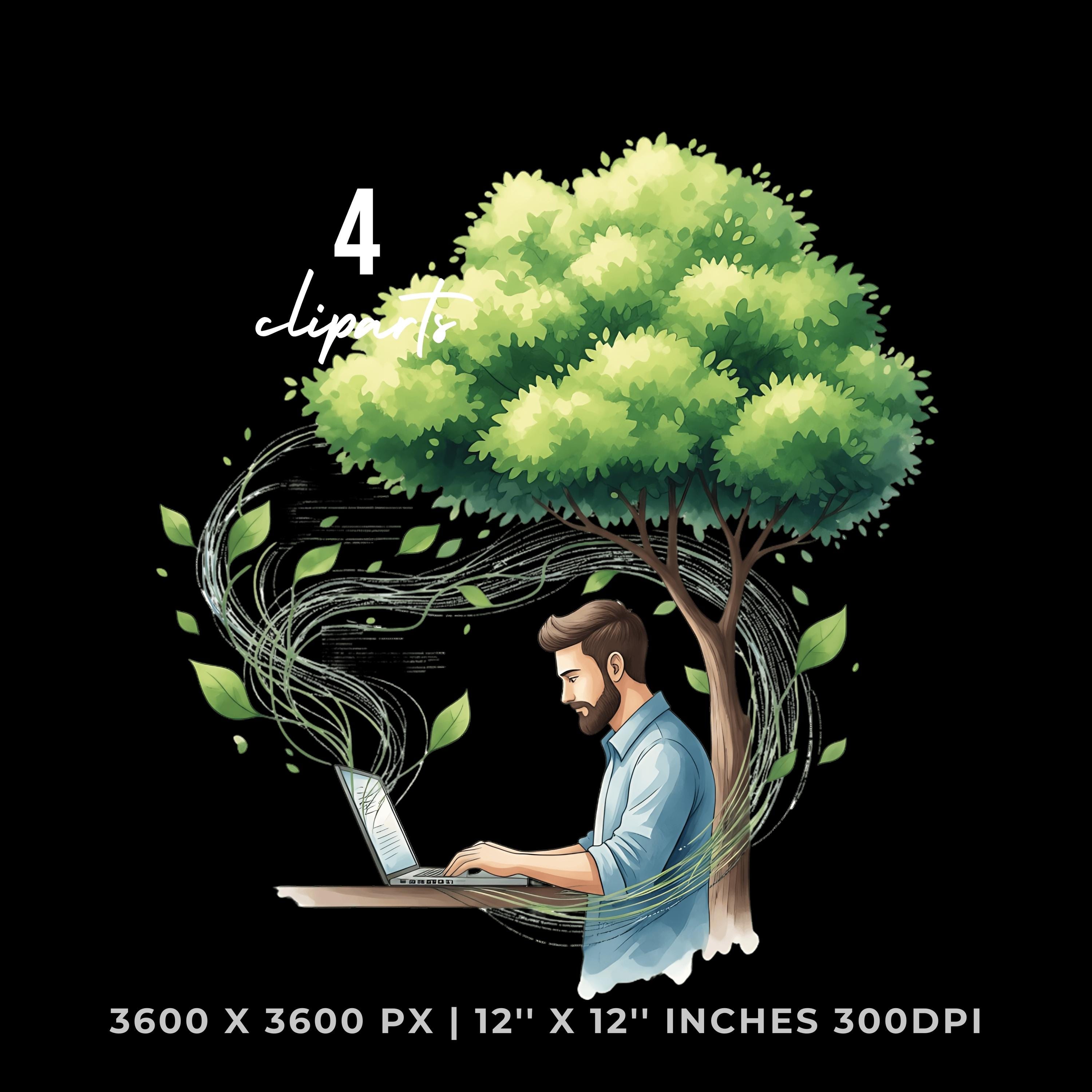 Web Designer Under Tree Working on Laptop – Eco Tech Digital Nomad Clipart Bundle | 12″x12″ 300 DPI | 4 JPG – 4 PNG Sublimation Commercial Use