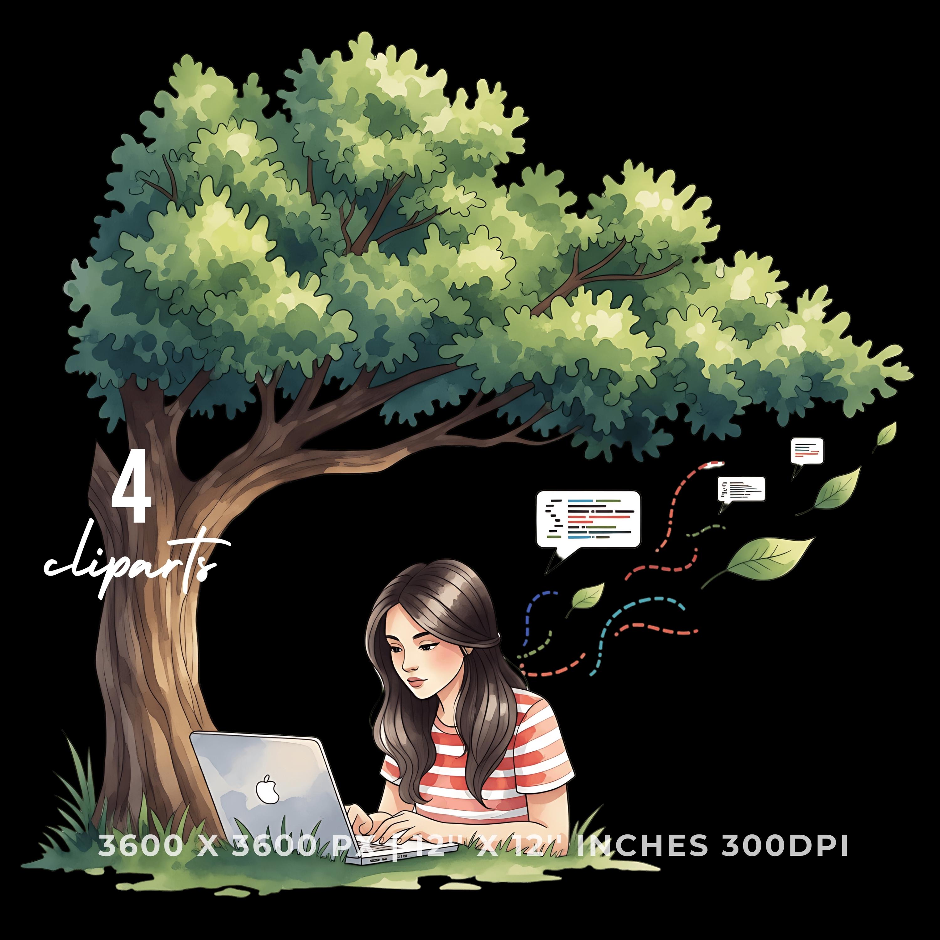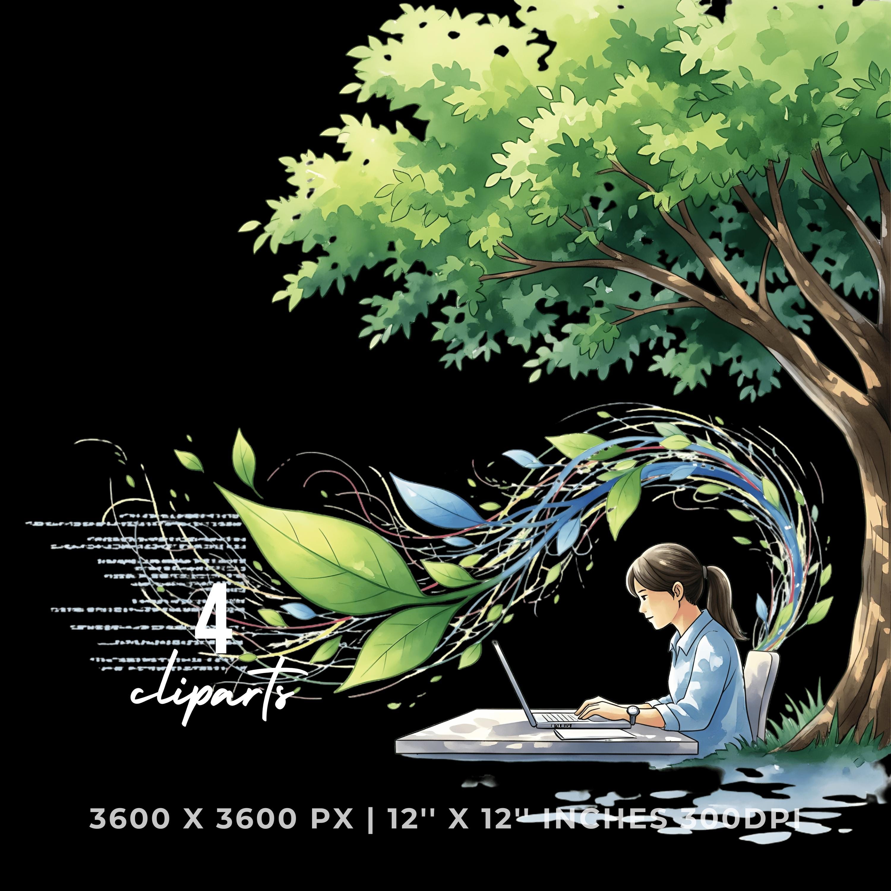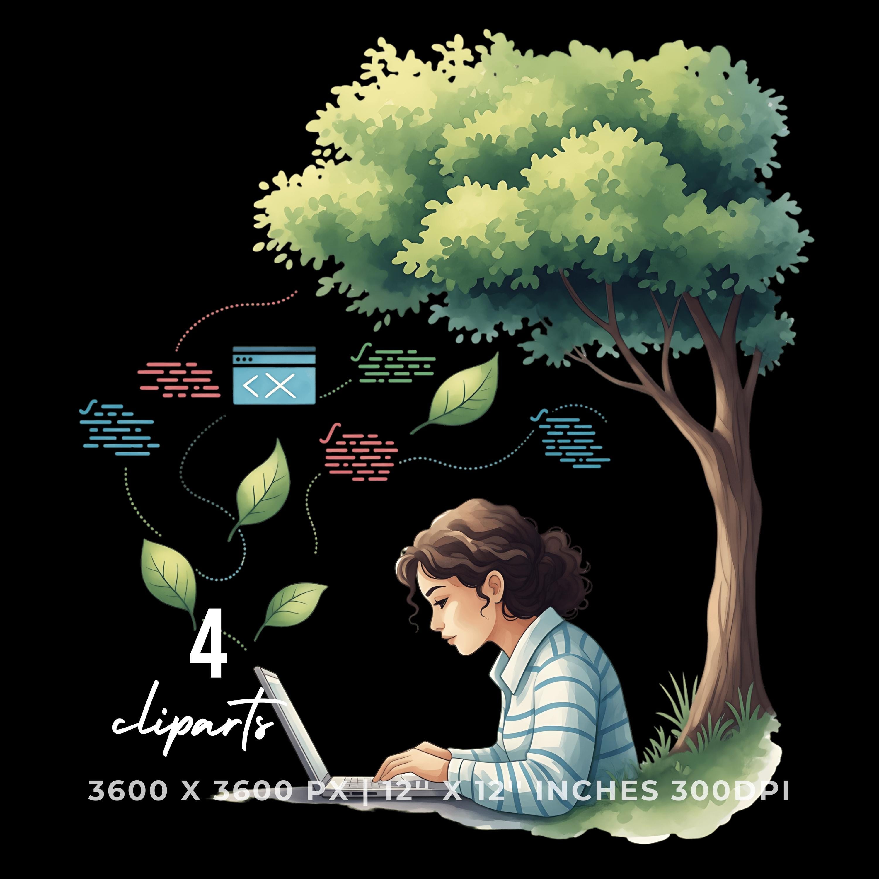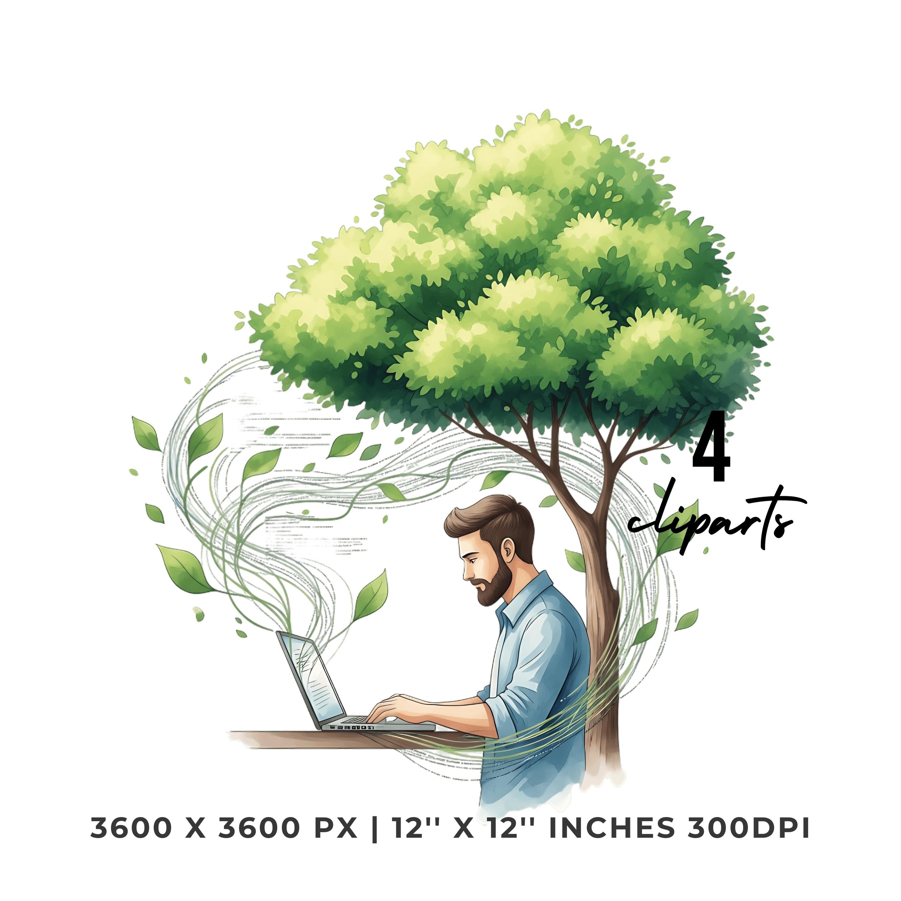 Web Designer Under Tree Working on Laptop – Eco Tech Digital Nomad Clipart Bundle | 12″x12″ 300 DPI | 4 JPG – 4 PNG Sublimation Commercial Use