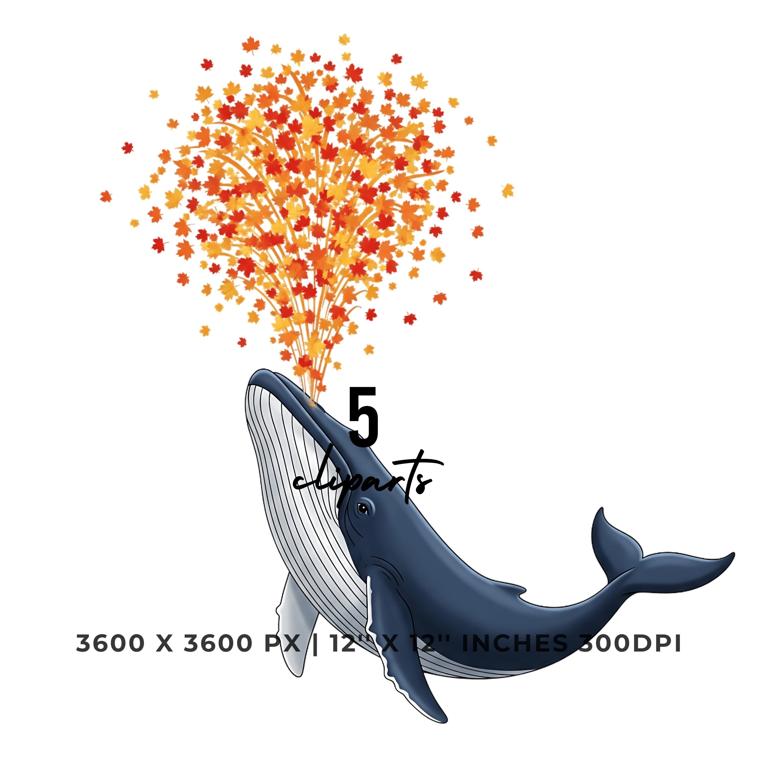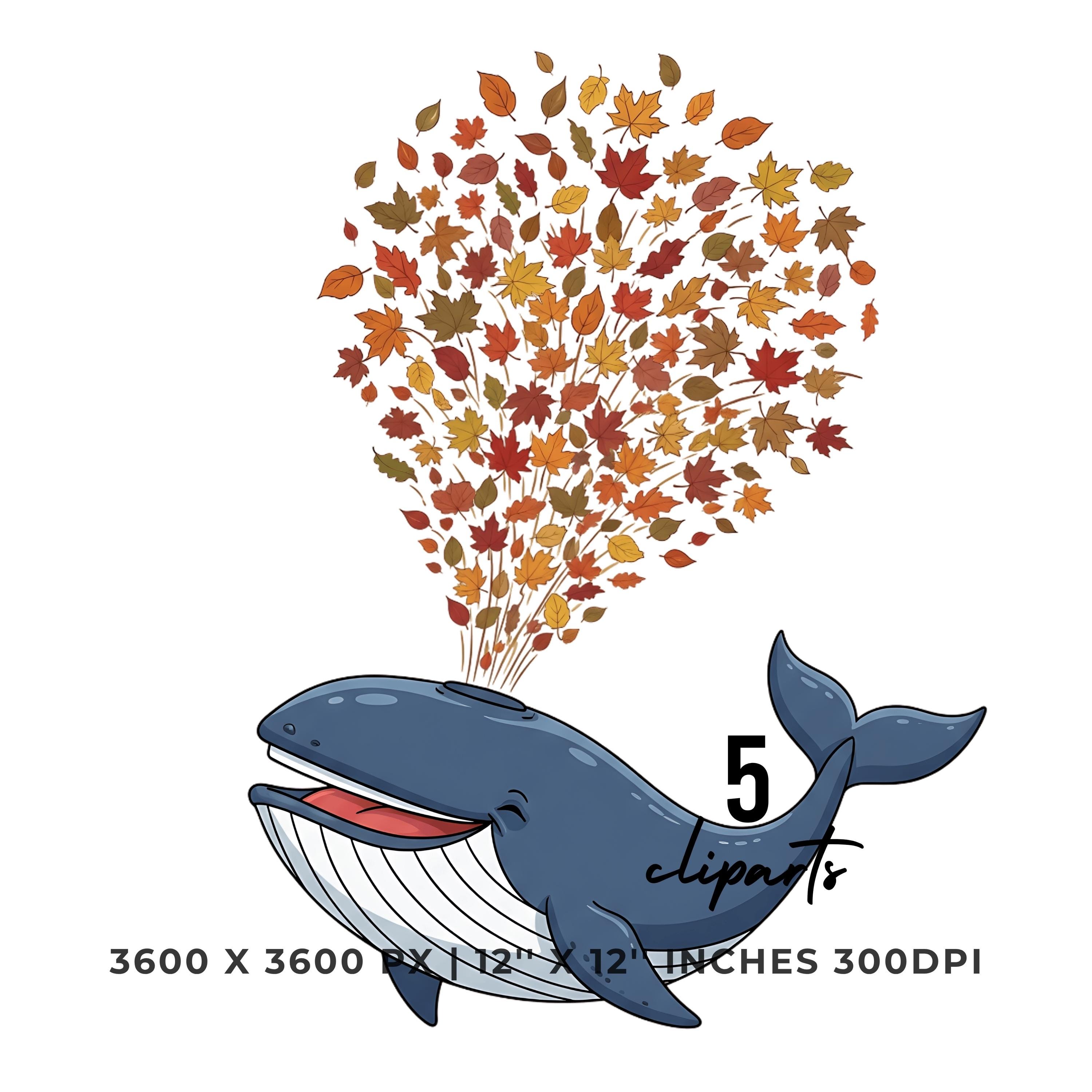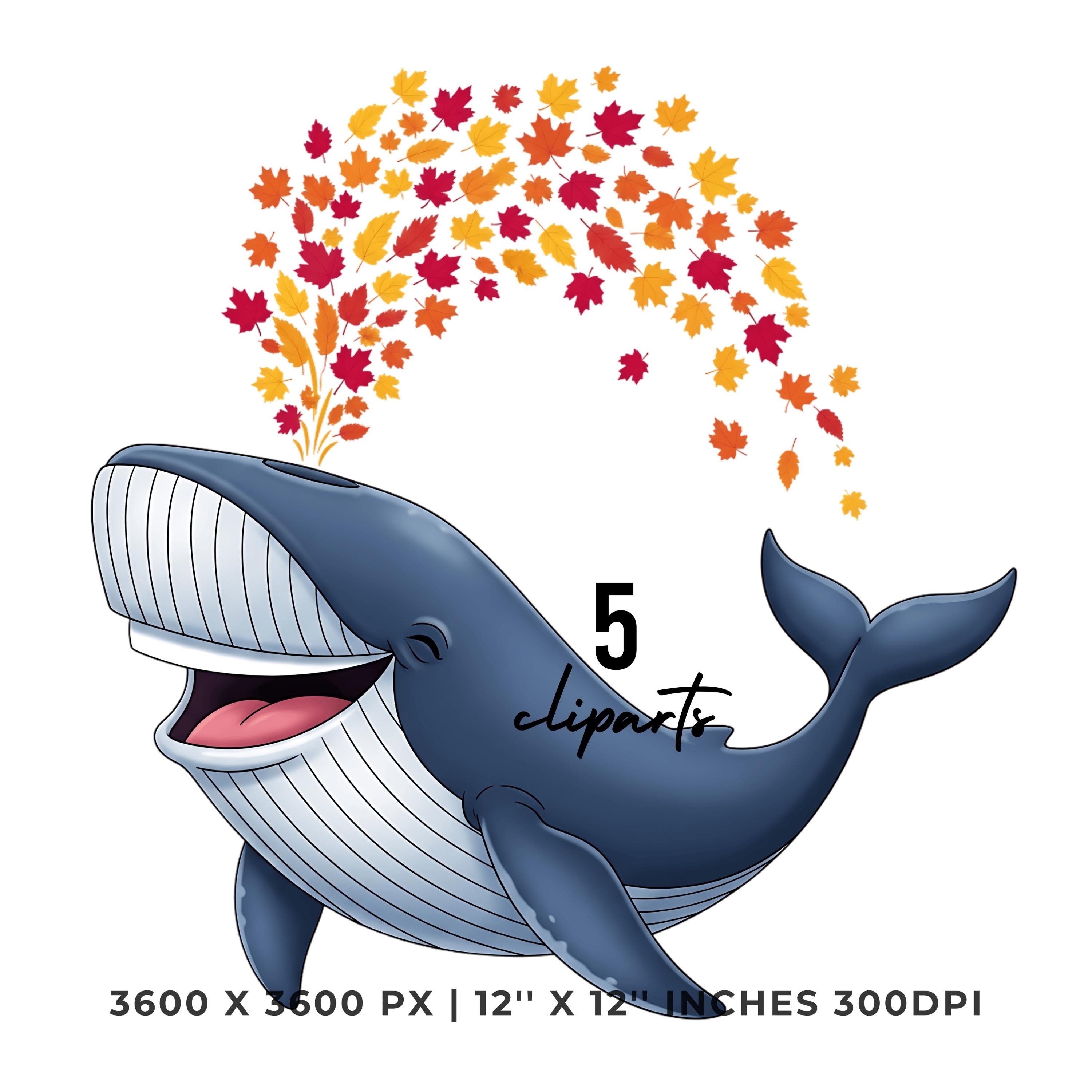 Whale Spraying Autumn Leaves Clipart PNG | 5 PNG 5 JPG Watercolor Whale Illustrations | Fall Ocean Animal Sublimation | Commercial Use is an eye-catching, high-resolution digital asset designed for creators, crafters, teachers, and small business owners looking to elevate their visuals.