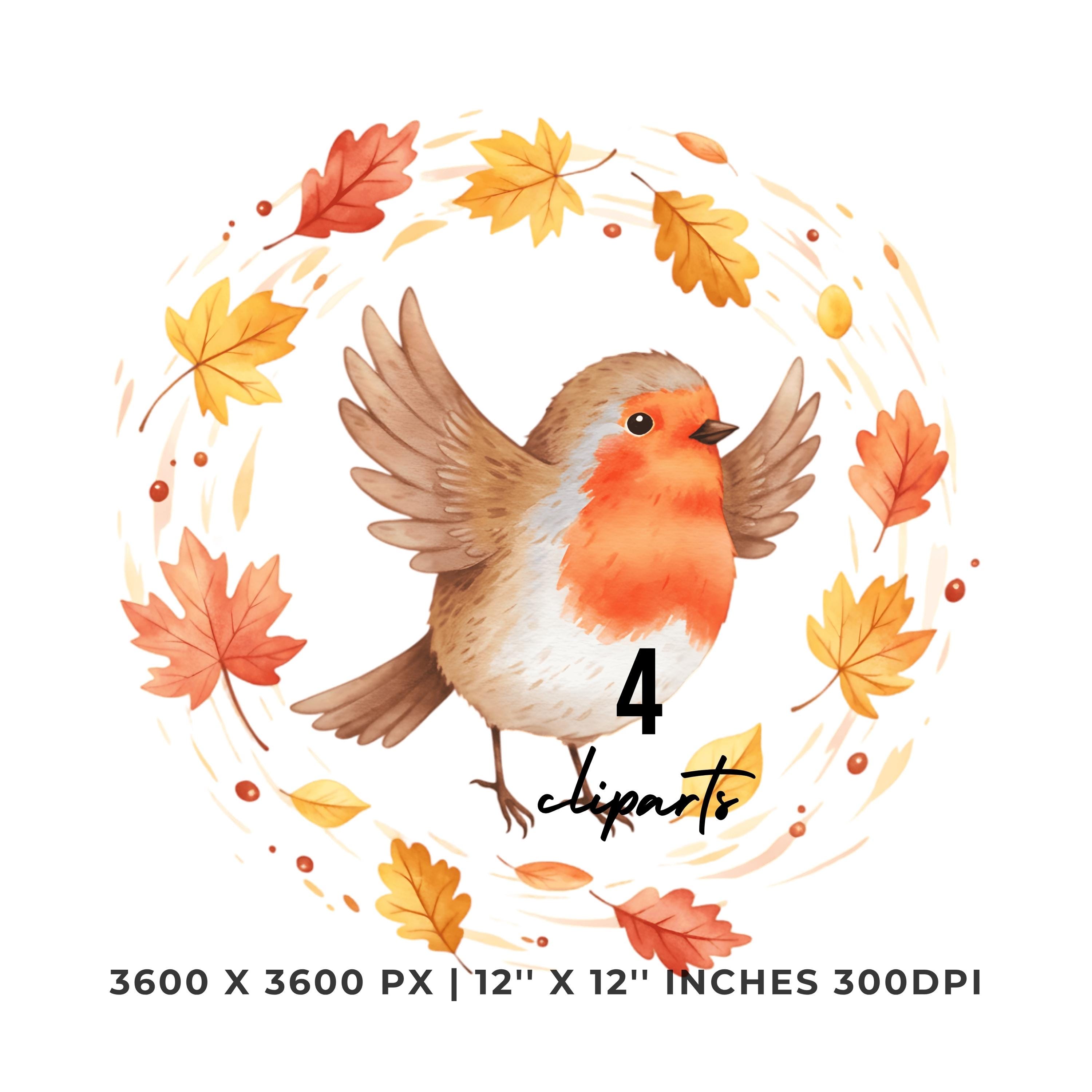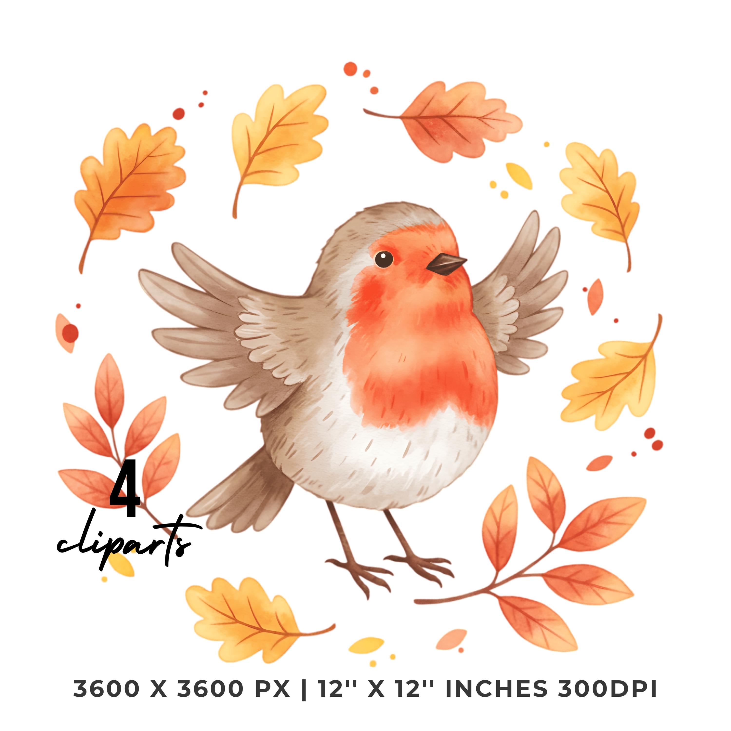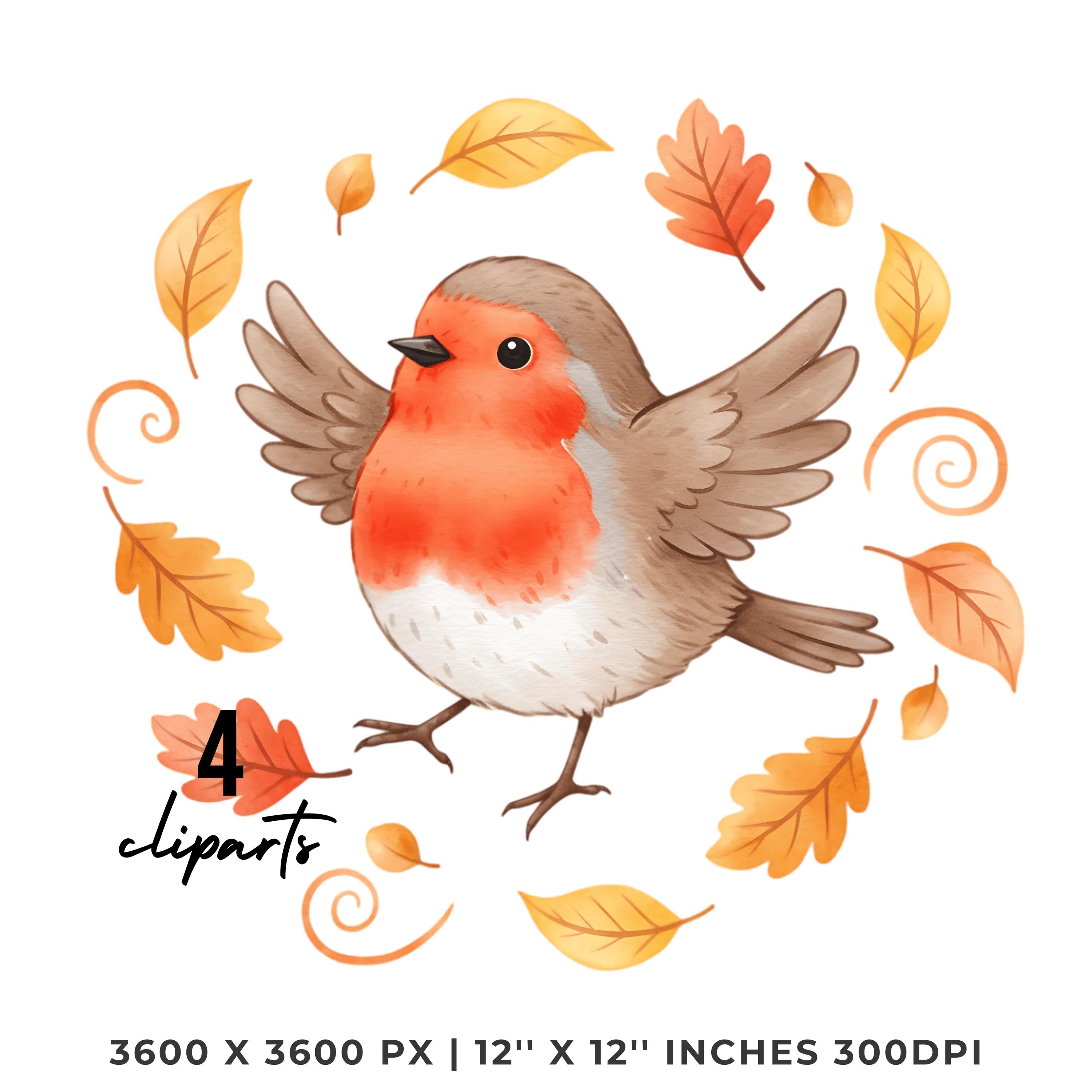 Whimsical Robin Autumn Clipart | 4 Cute Red-Breast Birds with Fall Leaves for Sublimation, Scrapbook | 4 PNG & 4 JPG | Commercial Use is an eye-catching, high-resolution digital asset designed for creators, crafters, teachers, and small business owners looking to elevate their visuals.