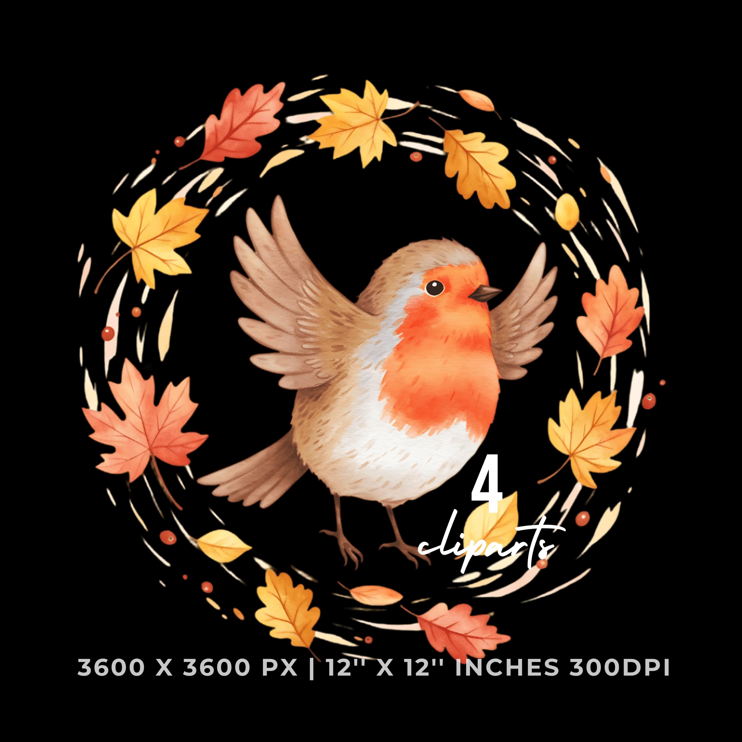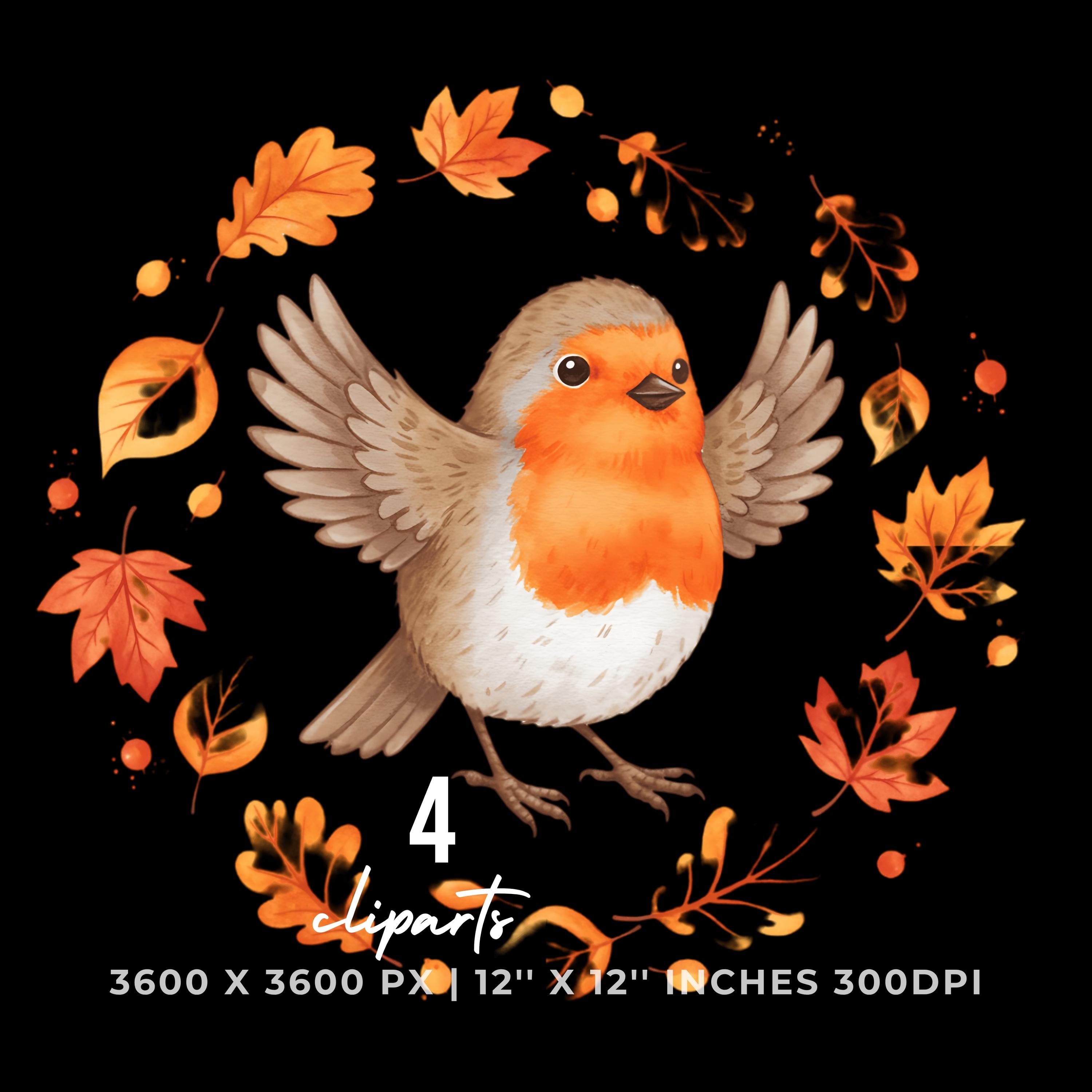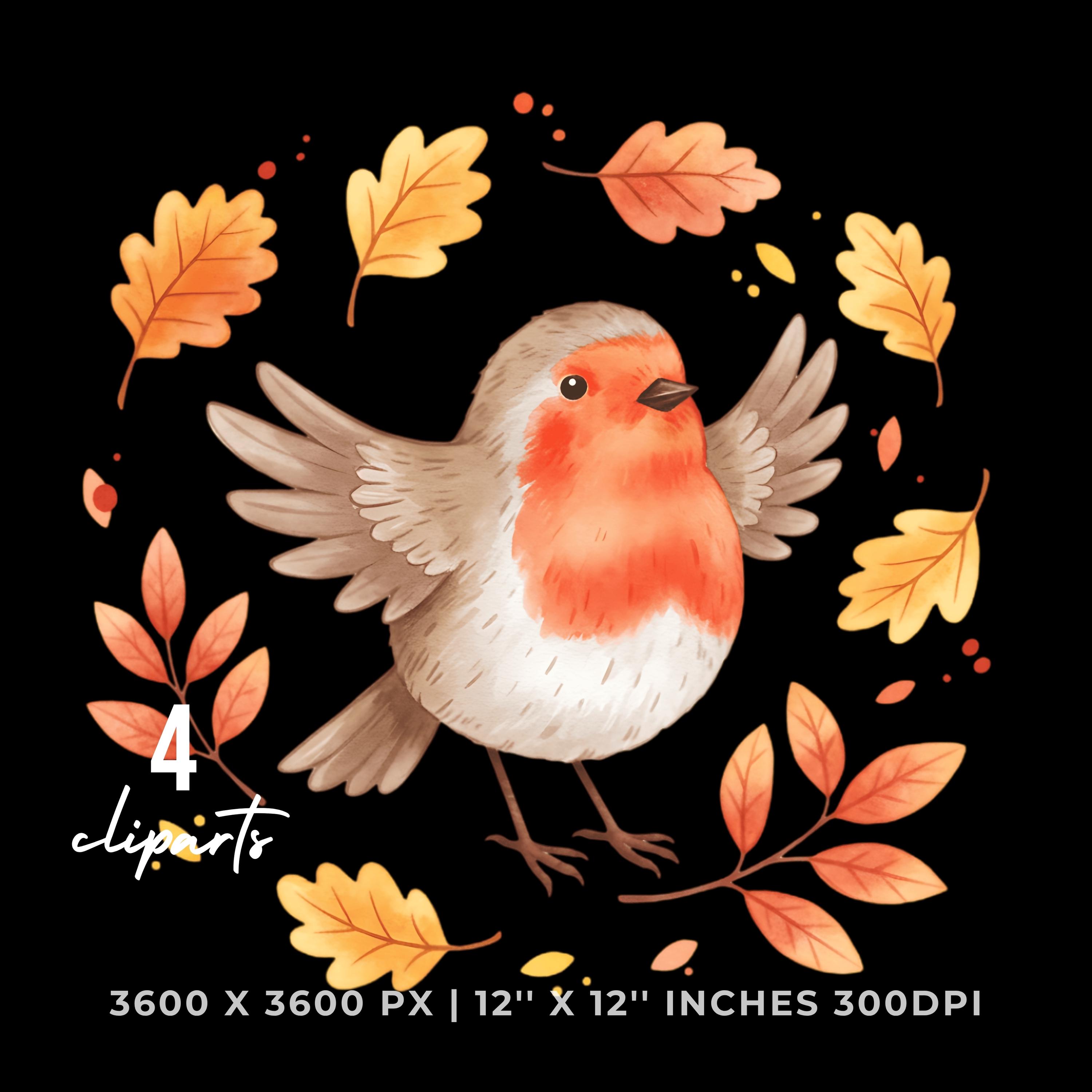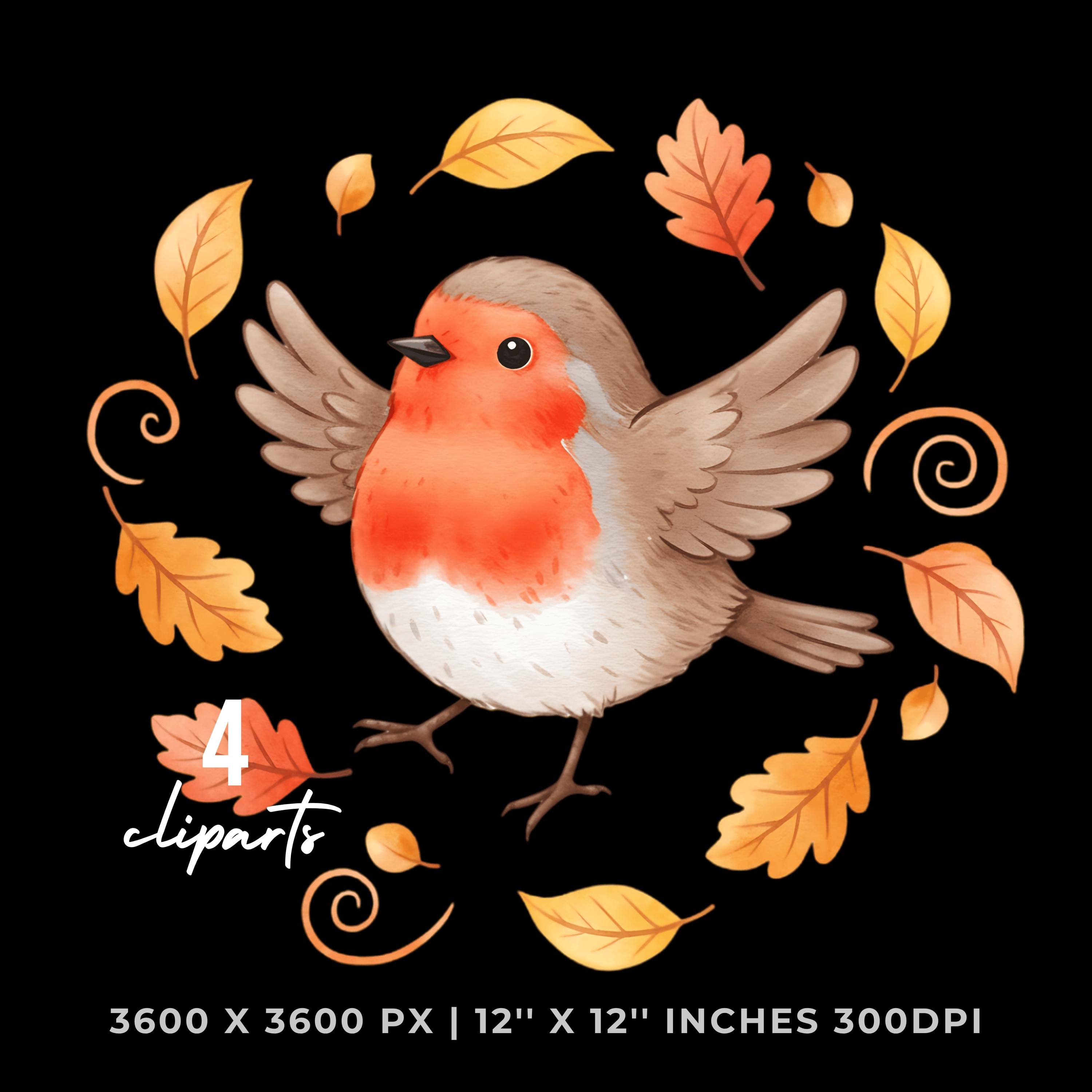 Whimsical Robin Autumn Clipart | 4 Cute Red-Breast Birds with Fall Leaves for Sublimation, Scrapbook | 4 PNG & 4 JPG | Commercial Use is an eye-catching, high-resolution digital asset designed for creators, crafters, teachers, and small business owners looking to elevate their visuals.