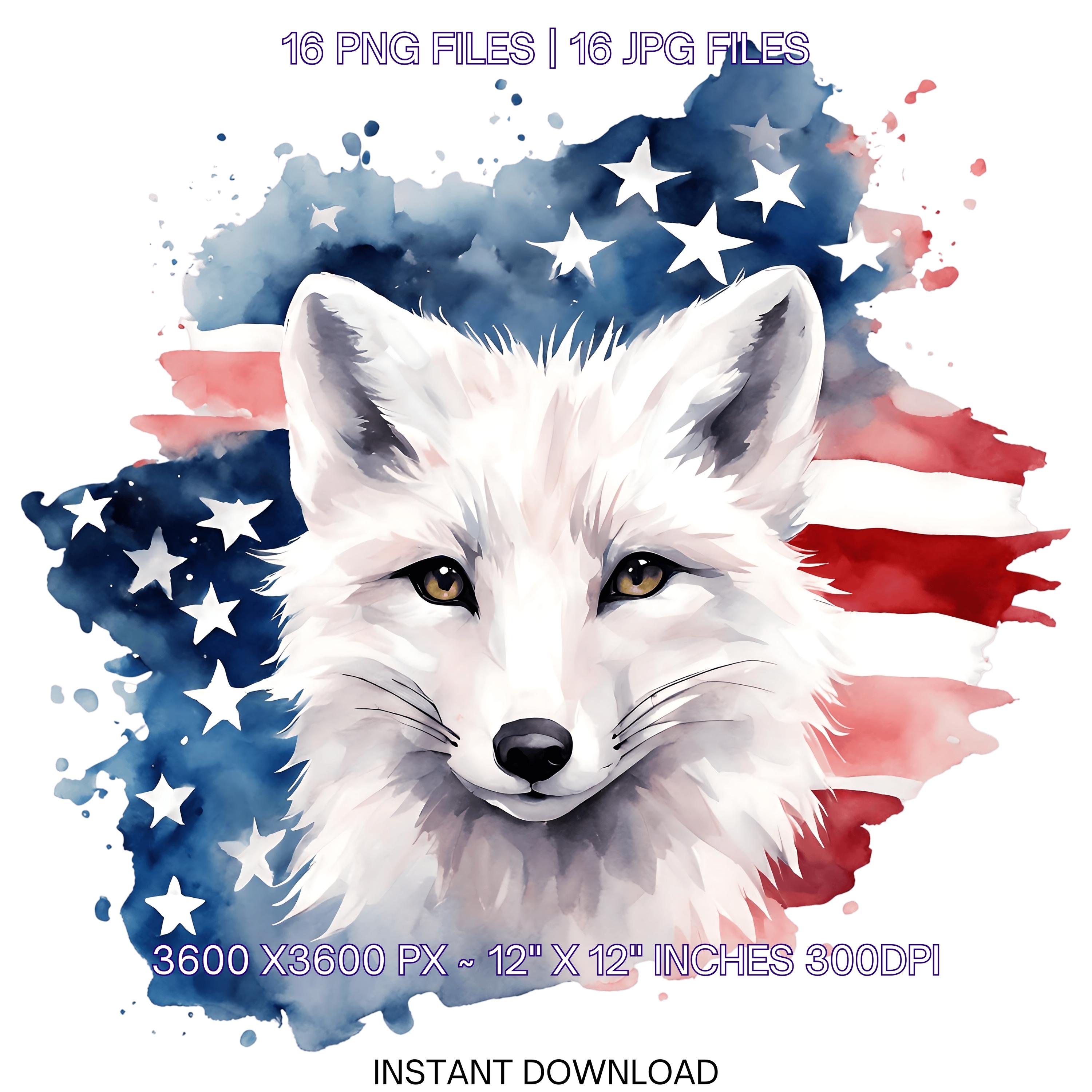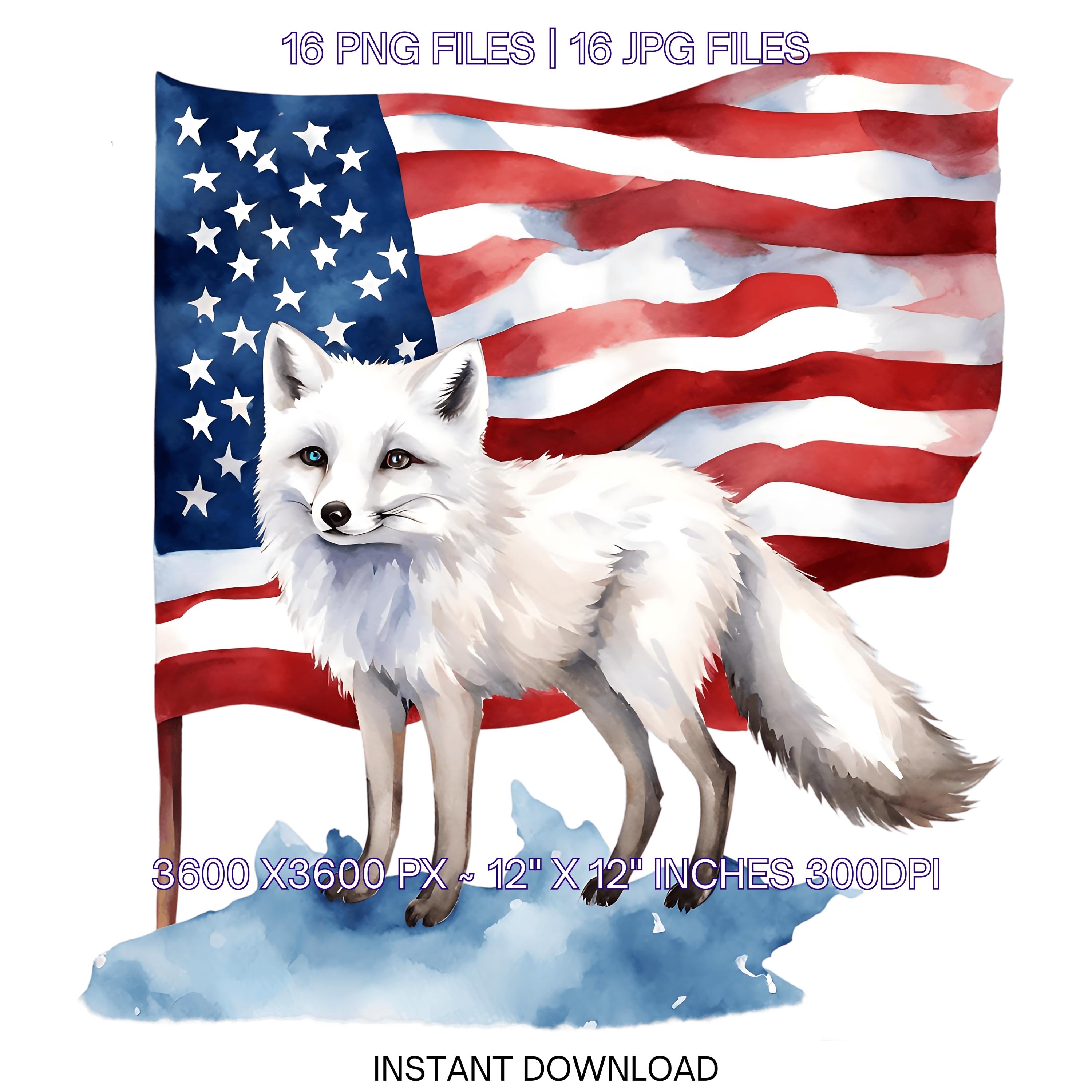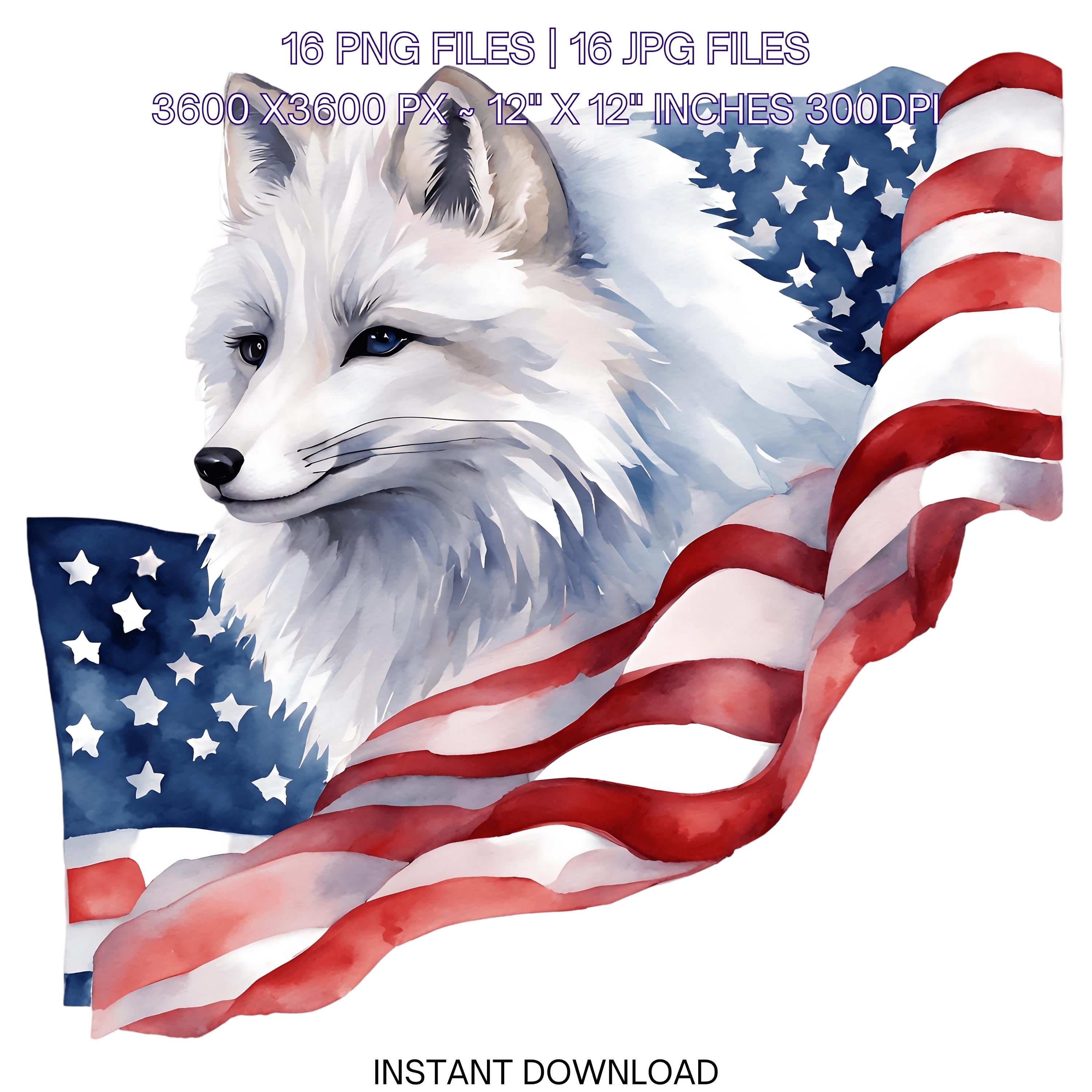 White FOX Flag PNG | 16 Patriotic USA Arctic Fox Flag Clipart | Wildland Fox Transparent | United States Fox Flag Sublimation Commercial Use is an eye-catching, high-resolution digital asset designed for creators, crafters, teachers, and small business owners looking to elevate their visuals.
