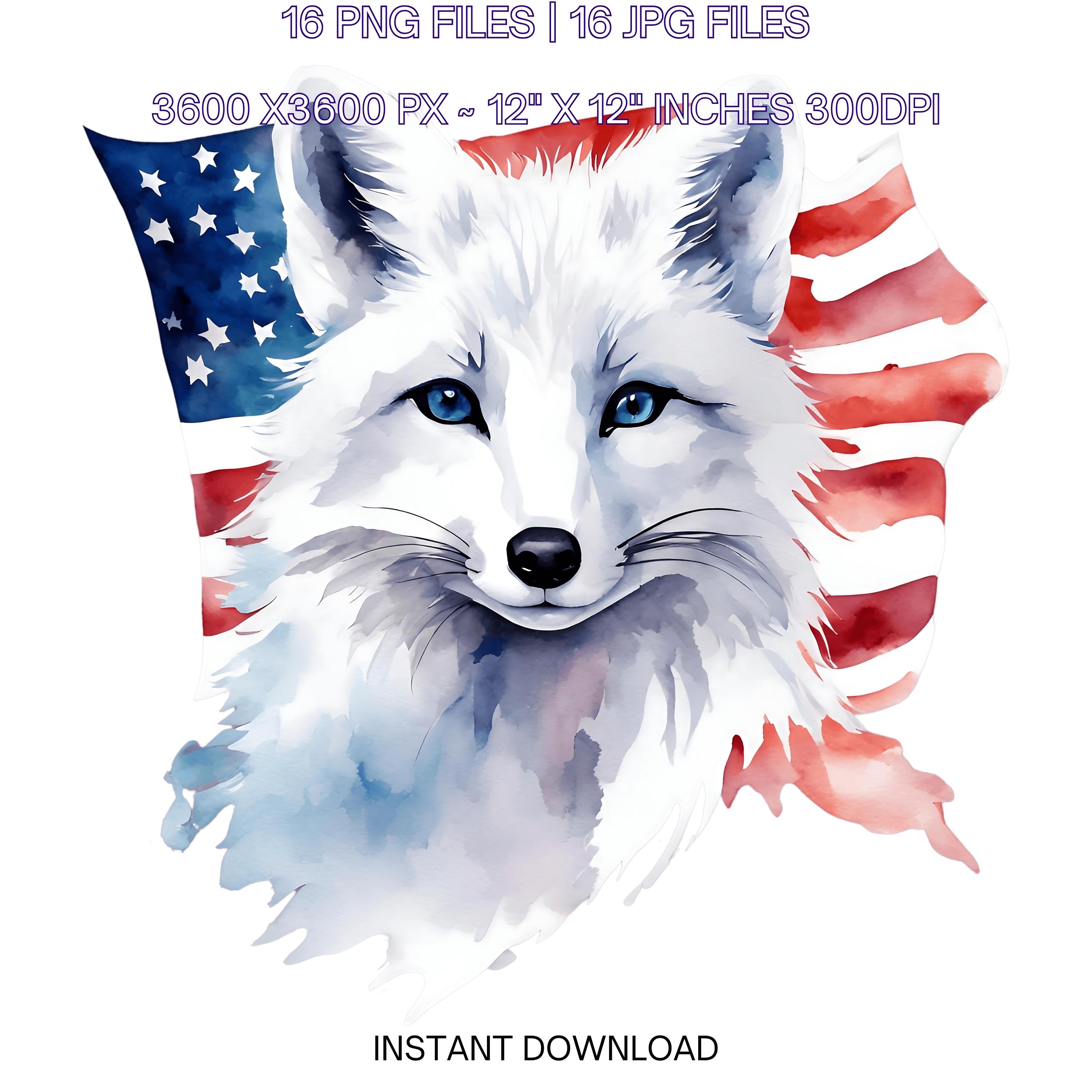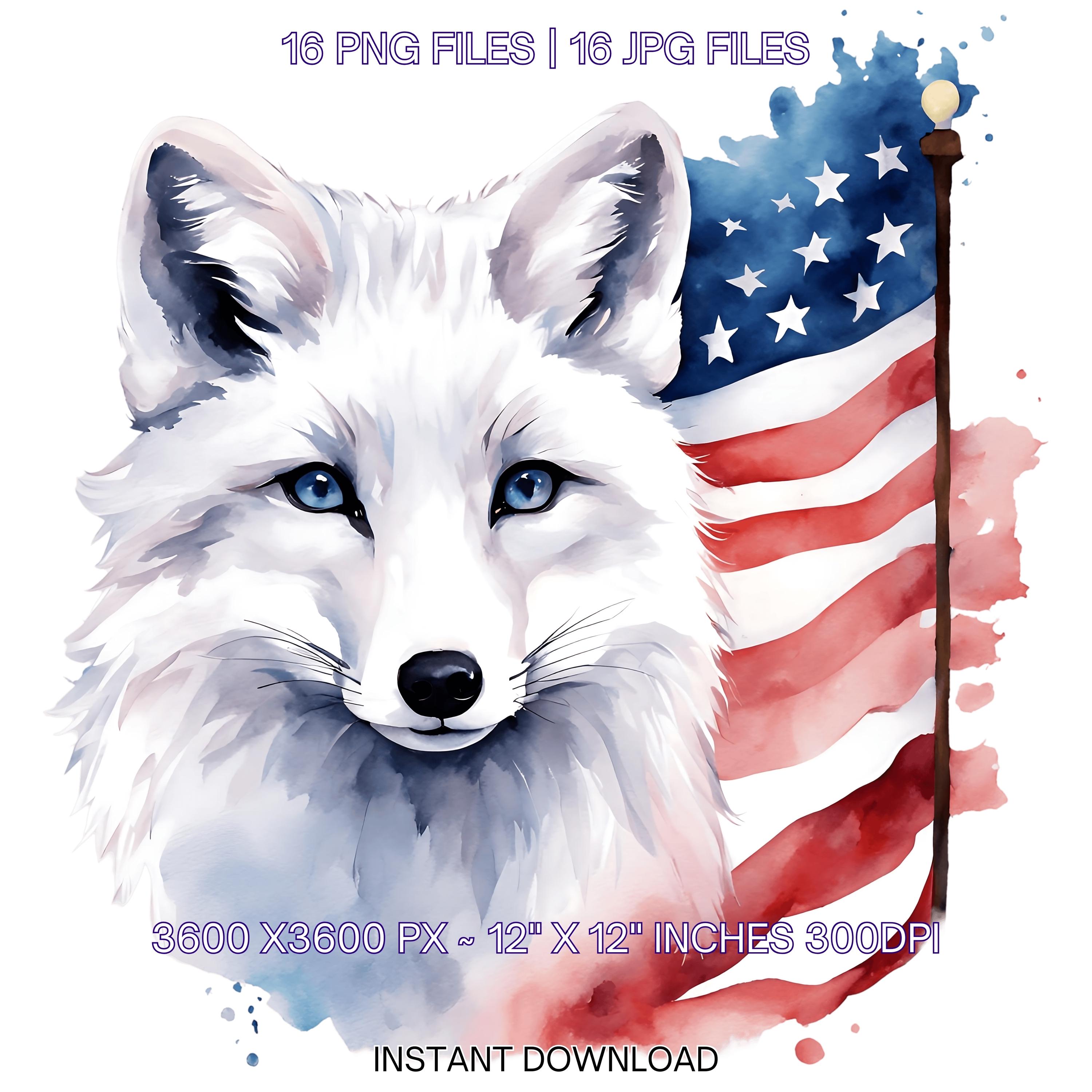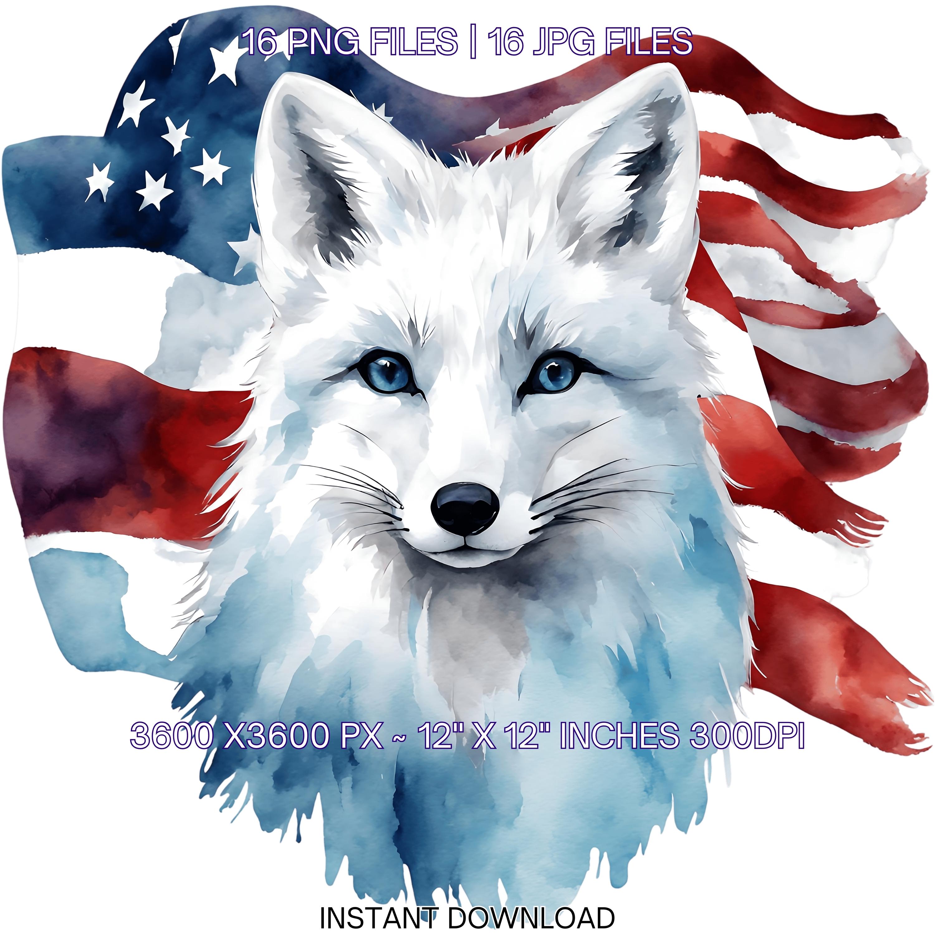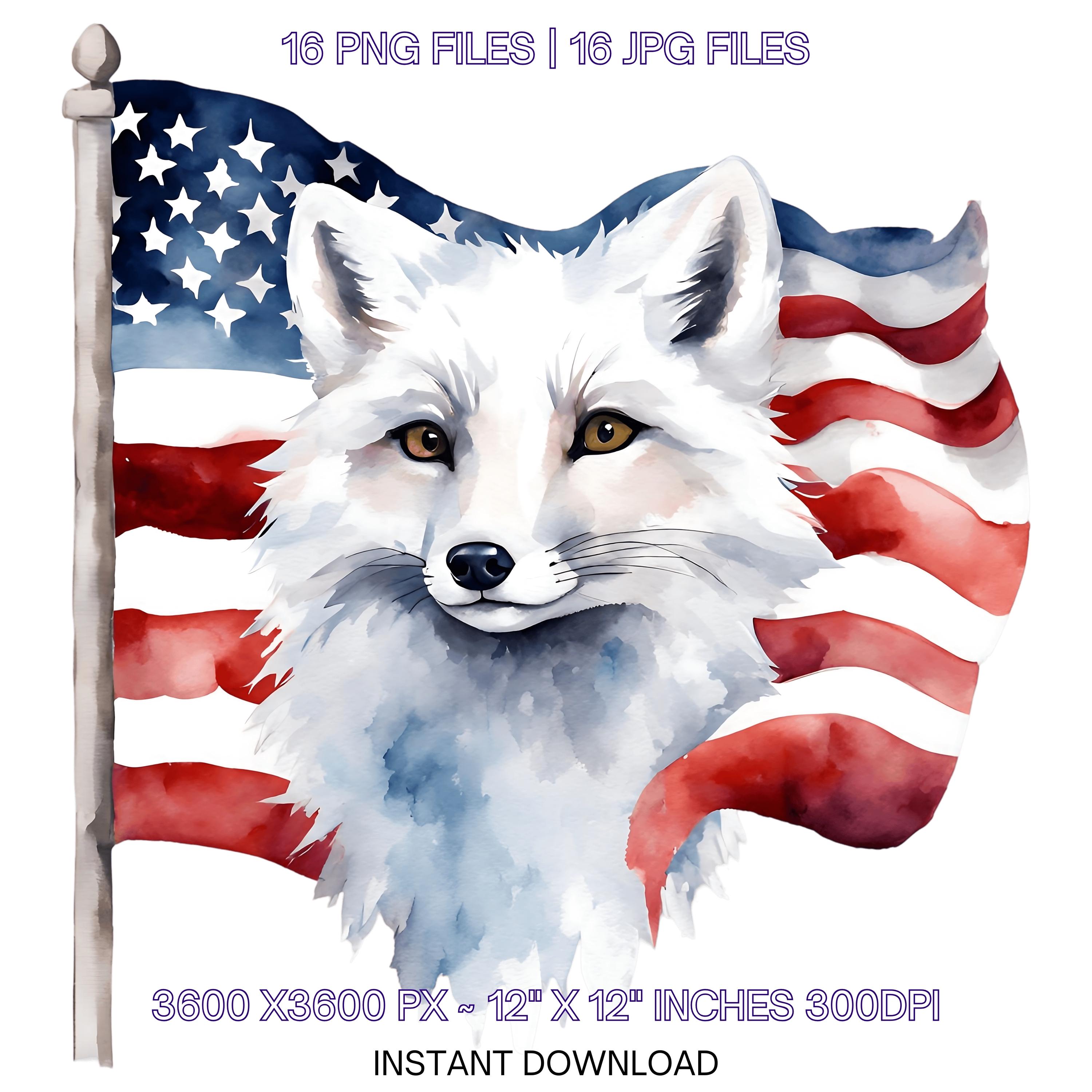 White FOX Flag PNG | 16 Patriotic USA Arctic Fox Flag Clipart | Wildland Fox Transparent | United States Fox Flag Sublimation Commercial Use is an eye-catching, high-resolution digital asset designed for creators, crafters, teachers, and small business owners looking to elevate their visuals.