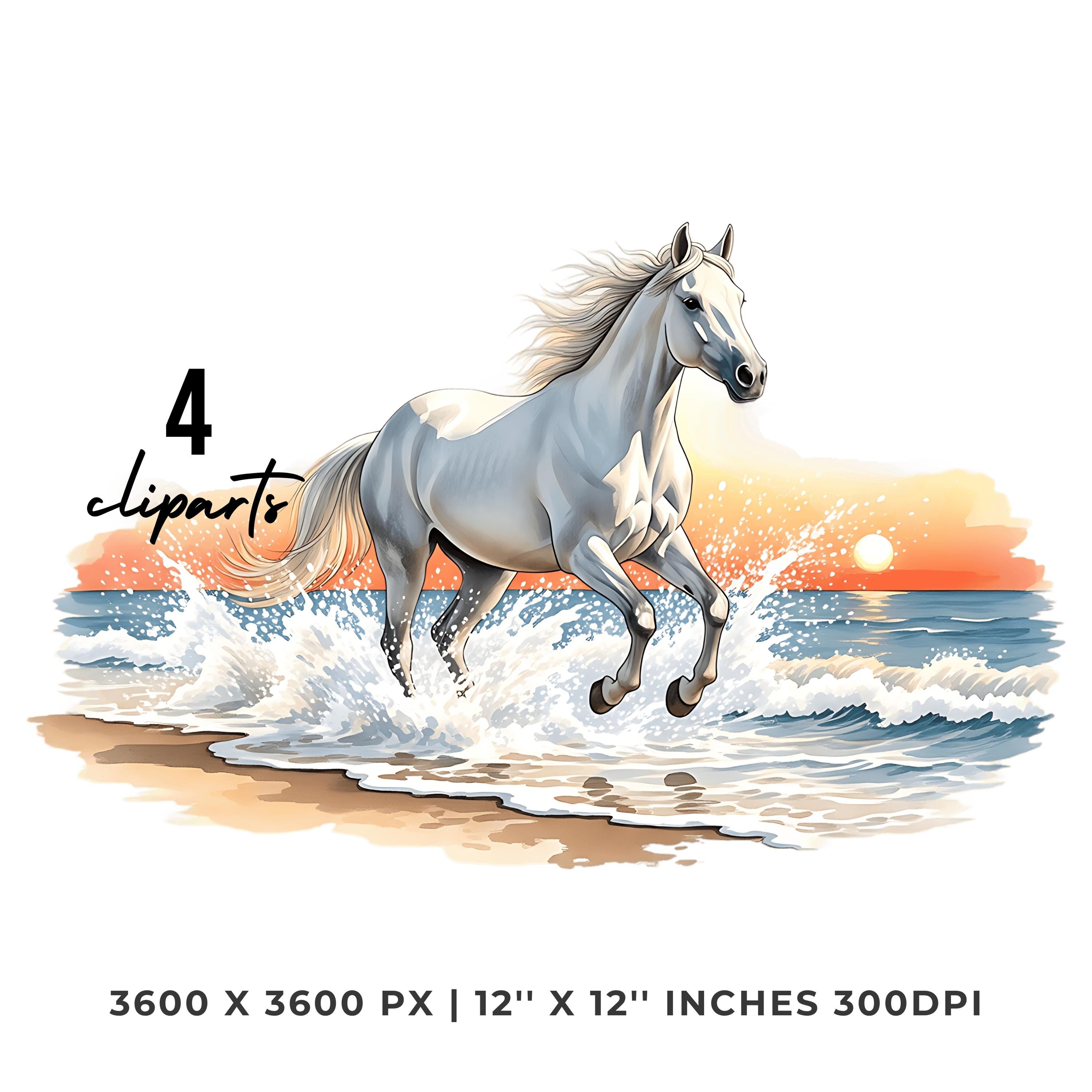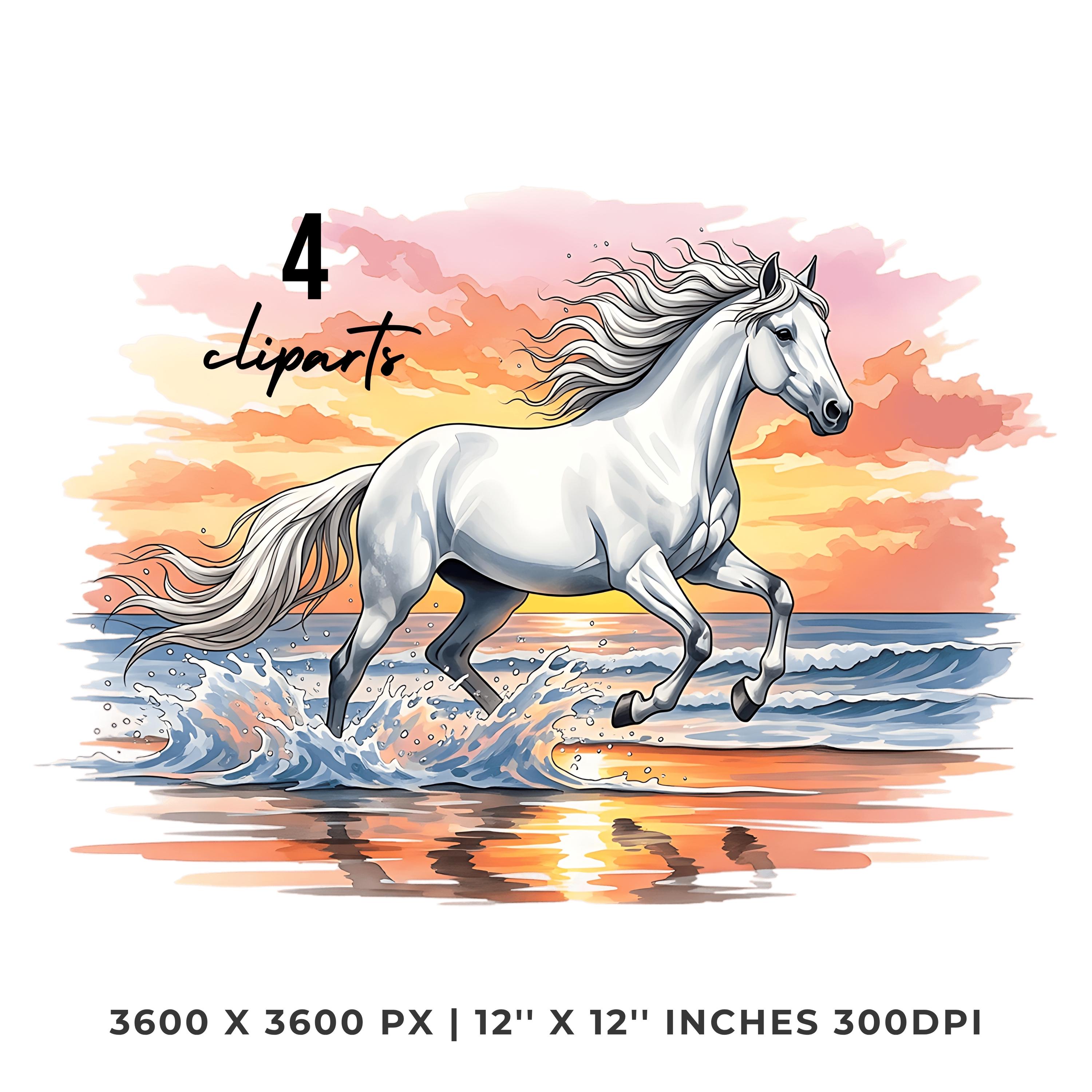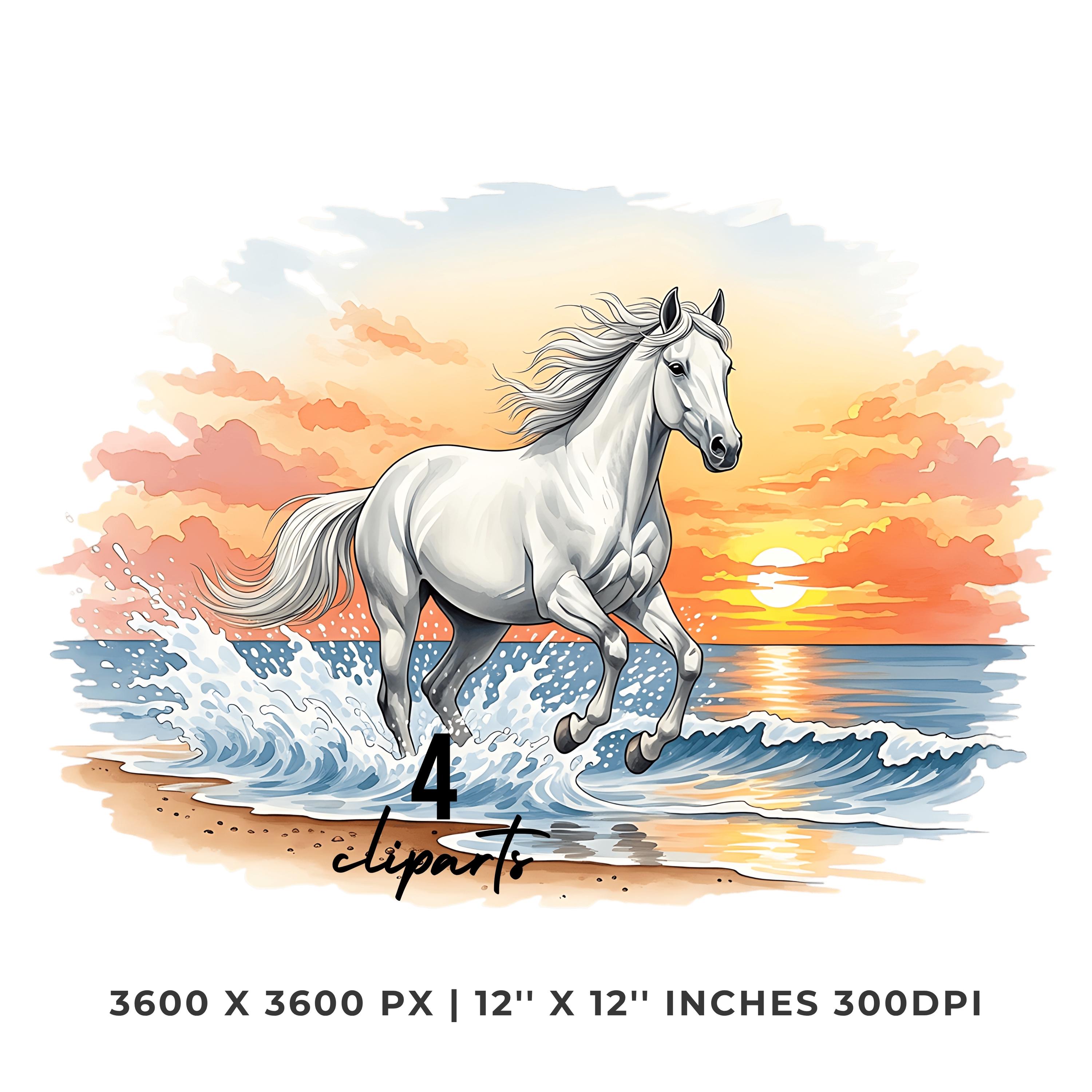White Horse in Summer Clipart PNG | 4 Watercolor horse galloping along the shoreline at sunset, water splashing | Commercial Use is an eye-catching, high-resolution digital asset designed for creators, crafters, teachers, and small business owners looking to elevate their visuals.