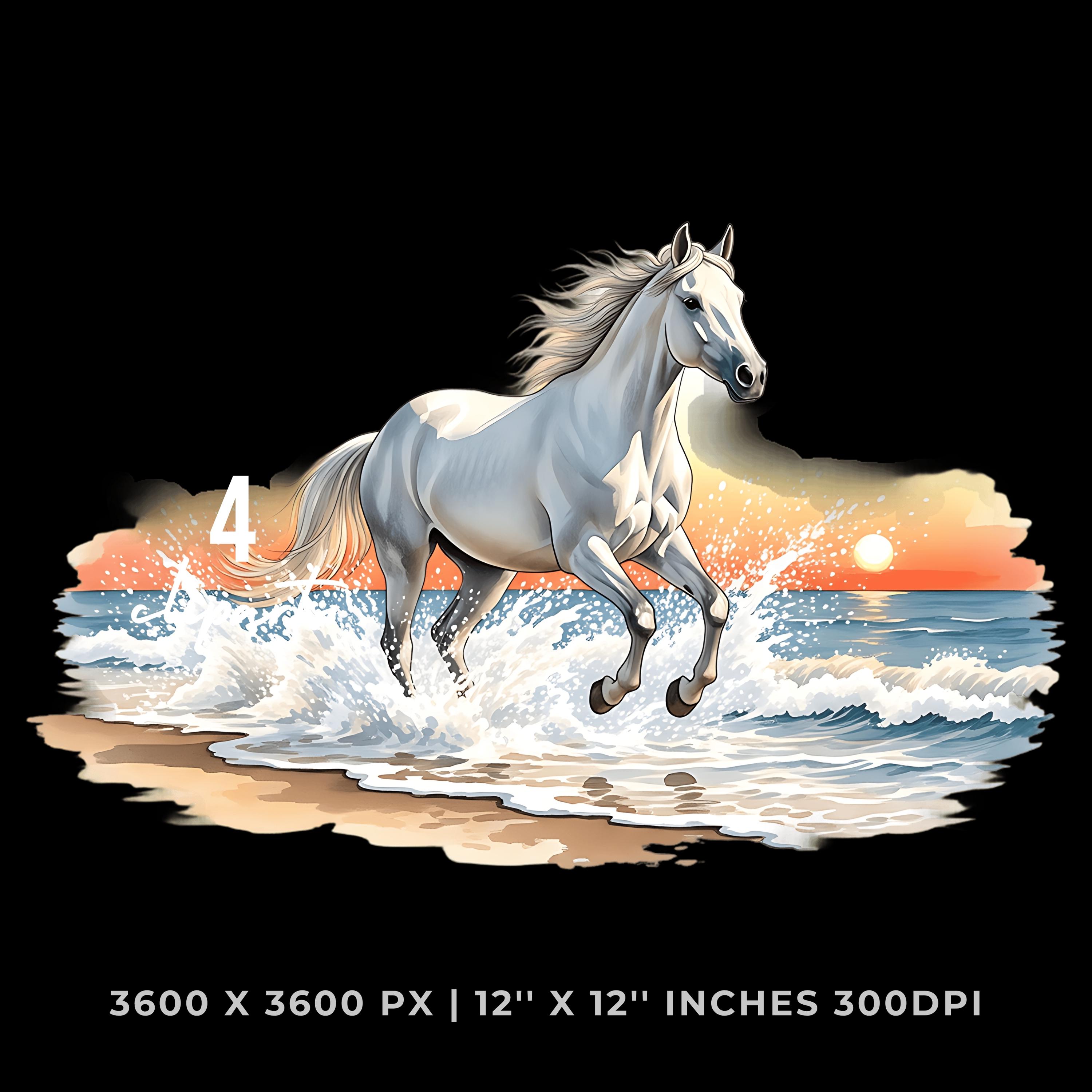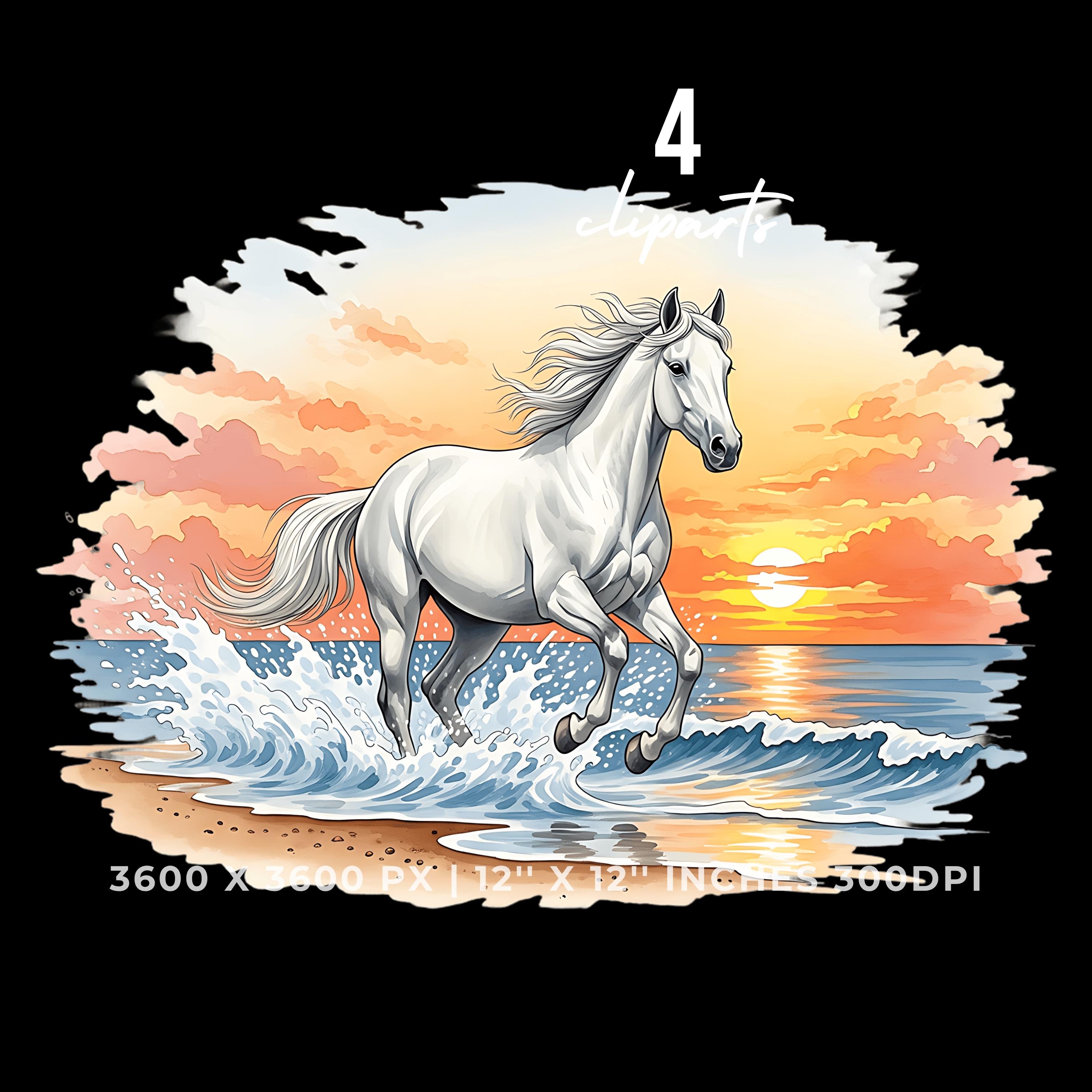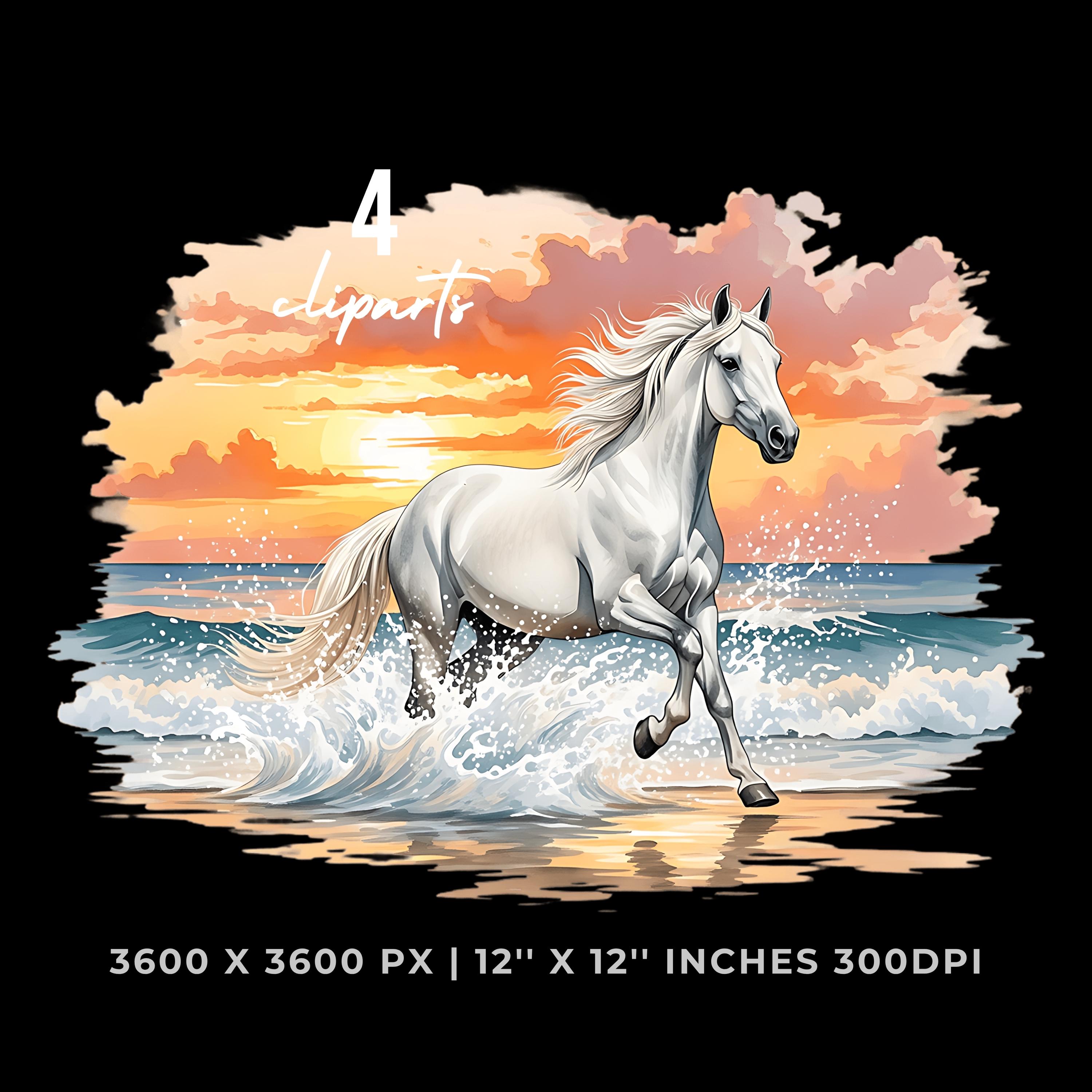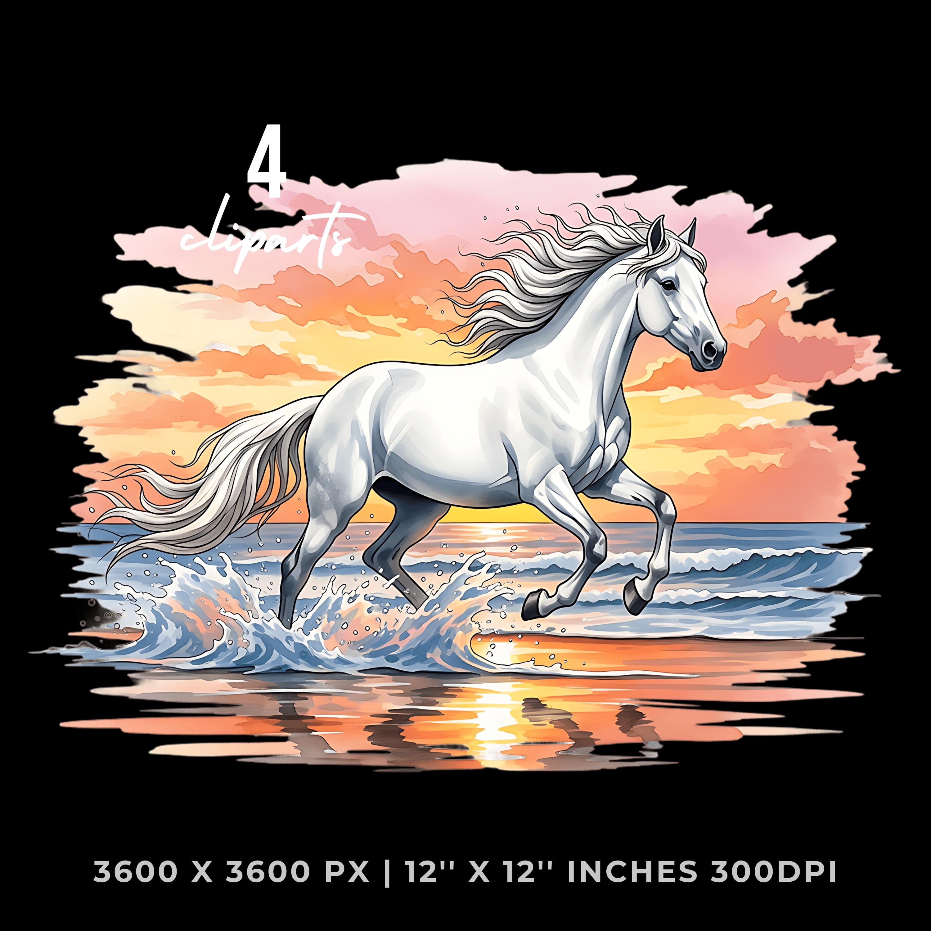 White Horse in Summer Clipart PNG | 4 Watercolor horse galloping along the shoreline at sunset, water splashing | Commercial Use is an eye-catching, high-resolution digital asset designed for creators, crafters, teachers, and small business owners looking to elevate their visuals.
